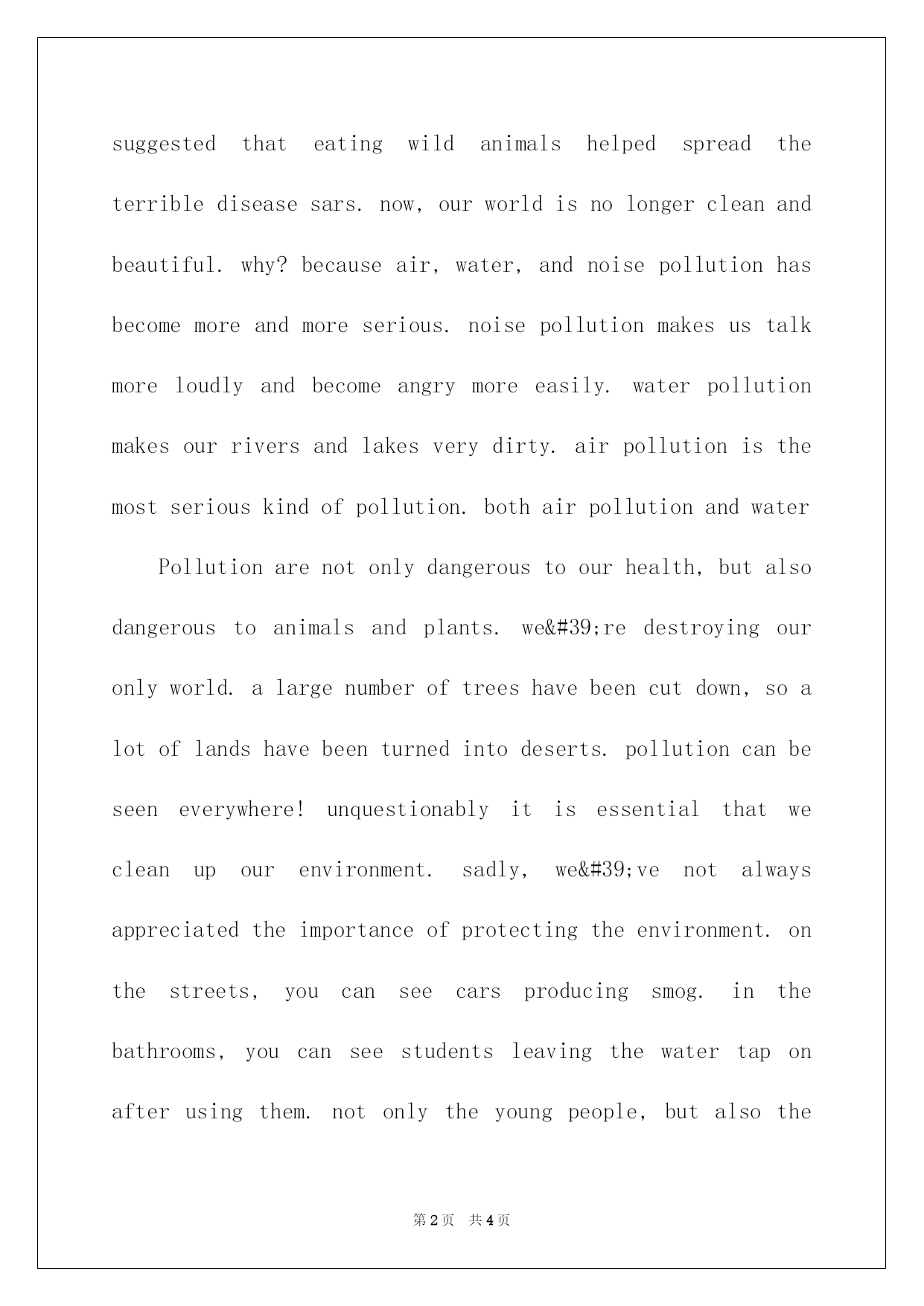 第PAGE\*Arabic\*MERGEFORMAT4页共NUMPAGES\*Arabic\*MERGEFORMAT4页第PAGE\*MERGEFORMAT4页共NUMPAGES\*MERGEFORMAT4页第PAGE\*MERGEFORMAT4页共NUMPAGES\*MERGEFORMAT4页第PAGE\*MERGEFORMAT4页共NUMPAGES\*MERGEFORMAT4页第PAGE\*MERGEFORMAT4页共NUMPAGES\*MERGEFORMAT4页第PAGE\*MERGEFORMAT4页共NUMPAGES\*MERGEFORMAT4页第PAGE\*MERGEFORMAT4页共NUMPAGES\*MERGEFORMAT4页第PAGE\*MERGEFORMAT4页共NUMPAGES\*MERGEFORMAT4页第PAGE\*MERGEFORMAT4页共NUMPAGES\*MERGEFORMAT4页第PAGE\*MERGEFORMAT4页共NUMPAGES\*MERGEFORMAT4页第PAGE\*MERGEFORMAT4页共NUMPAGES\*MERGEFORMAT4页2022英语环保的演讲稿英语环保的演讲稿Improvingbeijing'senvironmentfortheolympicsLadiesandgentlemen:goodmorning!today,thetitleofmyspeechisimprovingbeijing'senvironmentfortheolympics.haveyoueverseenanimalscry?doyouknowwhatmakesthemcry?it'sthepollutedworld,adirtyworld,causedbyourirresponsiblebehaviors,thatmakesthoselovelyanimalscry.manyofusaresmartenoughtoknowhowterribleitistohaveaworldwithoutanimalsandplants.butsomepeoplestillpersistinma-ki-ngthesameerrorsandharmingtheenvironment.What'sworseisthatpeopleareeatingwildanimals.thosepeopledon'tknow,andmoreimportantly,theydon'twanttoknow.thiskindofbehaviorhascausedsomespecificproblems.forexample,medicalexpertshavesuggestedthateatingwildanimalshelpedspreadtheterriblediseasesars.now,ourworldisnolongercleanandbeautiful.why?becauseair,water,andnoisepollutionhasbecomemoreandmoreserious.noisepollutionmakesustalkmoreloudlyandbecomeangrymoreeasily.waterpollutionmakesourriversandlakesverydirty.airpollutionisthemostseriouskindofpollution.bothairpollutionandwaterPollutionarenotonlydangeroustoourhealth,butalsodangeroustoanimalsandplants.we'redestroyingouronlyworld.alargenumberoftreeshavebeencutdown,soalotoflandshavebeenturnedintodeserts.pollutioncanbeseeneverywhere!unquestionablyitisessentialthatwecleanupourenvironment.sadly,we'venotalwaysappreciatedtheimportanceofprotectingtheenvironment.onthestreets,youcanseecarsproducingsmog.inthebathrooms,youcansees
