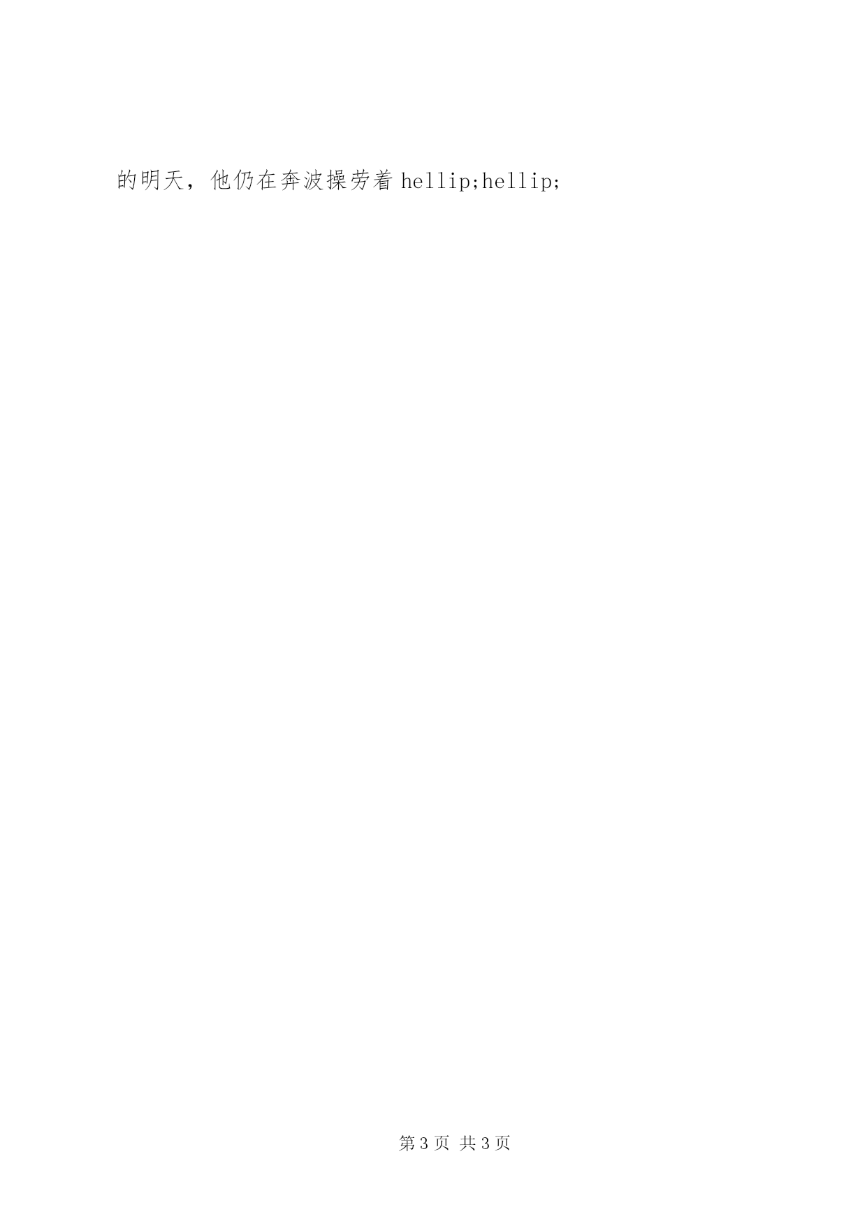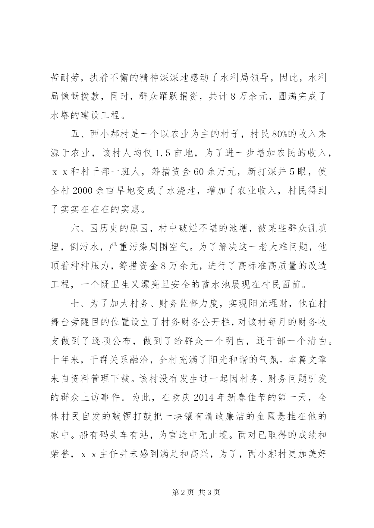 第PAGE\*Arabic\*MERGEFORMAT3页共NUMPAGES\*MERGEFORMAT3页劳动模范公务员事迹材料一、任职期间,他率先实施校安工程。在村里资金非常紧缺的情况下,他筹集资金3万余元,改造学校危房10间,为在校学生的学习创造了安全温馨的良好环境。本篇文章来自资料管理下载。同时关爱老人,组织70岁以上老人外出旅游,欣赏观光本县的美好风景,使老年人颇感党和政府的温暖。二、为了丰富村民的精神文化生活,他带领村委一班人,集思广议,四处奔波,筹集资金30余万元,新建一座高标准多功能的文化活动中心及两委办公场所,并完善了图书室、健身器材,配套了电视、功放、音响等远程教育设备。同时,每年34月份,邀请剧团为村民上演一台大戏,彻底解决了老年人外出看戏难问题。三、为了改善村容村貌,彻底解决群众行路的问题,xx主任带领村干部不辞劳苦,上稷山,赴运城,到侯马,去河津,多次与本村在外工作人员洽谈集资修路事宜,又多次召开村民代表会议进行讨论。几经周折,筹措起动资金40余万元,实现全村街巷道硬化全覆盖,并栽植了塔松、国槐、黄金槐,共计1000余株,使该村呈现出了春有花,夏有荫,秋有果,冬有绿的美好风景。共计投资100余万元。四、为了解决群众用水安全、用水方便问题,xx主任马不停蹄,多次与水利局领导商谈拨款事宜,他苦口婆心的交谈,吃苦耐劳,执着不懈的精神深深地感动了水利局领导,因此,水利局慷慨拨款,同时,群众踊跃捐资,共计8万余元,圆满完成了水塔的建设工程。五、西小郝村是一个以农业为主的村子,村民80%的收入来源于农业,该村人均仅1.5亩地,为了进一步增加农民的收入,xx和村干部一班人,筹措资金60余万元,新打深井5眼,使全村2000余亩旱地变成了水浇地,增加了农业收入,村民得到了实实在在在的实惠。六、因历史的原因,村中破烂不堪的池塘,被某些群众乱填埋,倒污水,严重污染周围空气。为了解决这一老大难问题,他顶着种种压力,筹措资金8万余元,进行了高标准高质量的改造工程,一个既卫生又漂亮且安全的蓄水池展现在村民面前。七、为了加大村务、财务监督力度,实现阳光理财,他在村舞台旁醒目的位置设立了村务财务公开栏,对该村每月的财务收支做到了逐项公布,做到了给群众一个明白,还干部一个清白。十年来,干群关系融洽,全村充满了阳光和谐的气氛。本篇文章来自资料管理下载。该村没有发生过一起因村务、财务问题引发的群众上访事件。为此,在欢庆2014年新春佳节的第一天,全体村民自发的敲锣打鼓把一块镶有清政廉洁的金匾悬挂在他的家中。船有码头车有站,为官途中无止境。面对已取得的成绩和荣誉,xx主任并未感到满足和高兴,为了,西小郝村更加美好的明天,他仍在奔波操劳着hellip;hellip;