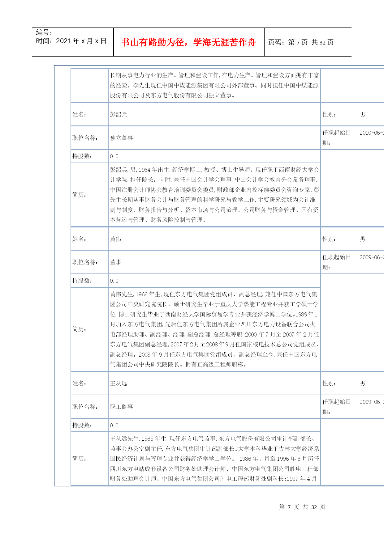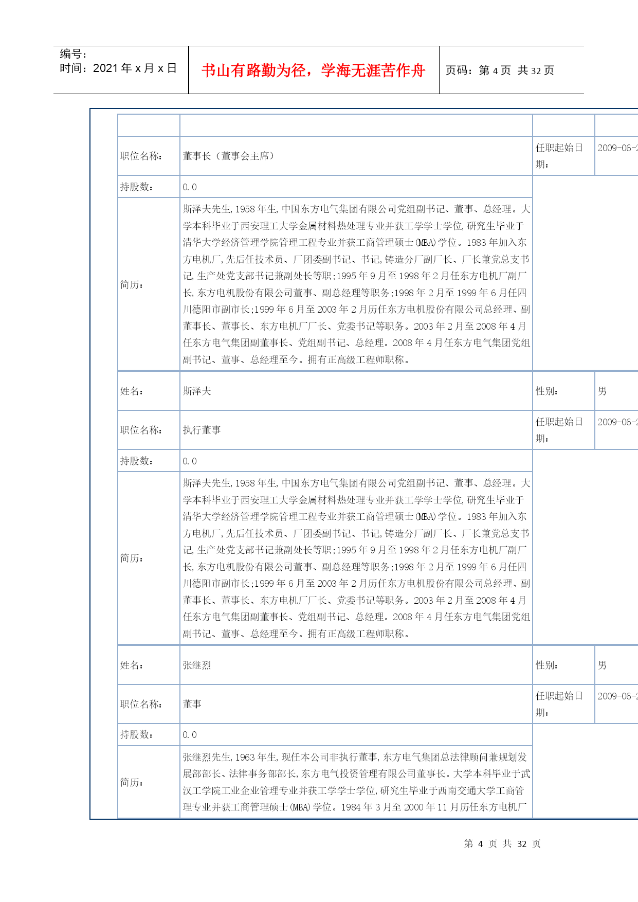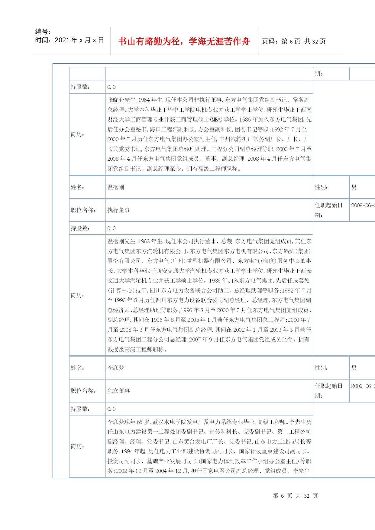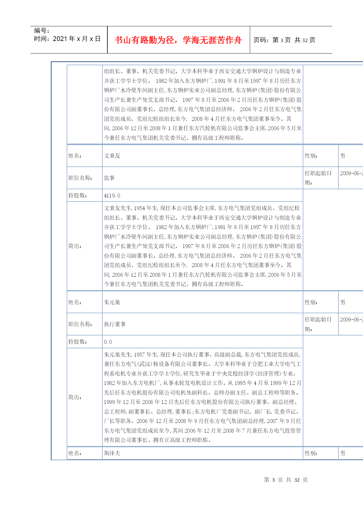 编号:时间:2021年x月x日书山有路勤为径,学海无涯苦作舟页码:第PAGE32页共NUMPAGES32页第PAGE\*MERGEFORMAT32页共NUMPAGES\*MERGEFORMAT32页东方电气[600875]高层治理1.董监事会人员姓名性别公司职务学历年薪(万)持股数(万股)任职日期文秉友男监事长(监事会主席,监事会召集人)学士不详0.4122009-06-29文秉友男监事学士不详0.4122009-06-25朱元巢男执行董事硕士不详02009-06-25斯泽夫男董事长(董事会主席)硕士不详02009-06-29斯泽夫男执行董事硕士不详02009-06-25张继烈男董事硕士不详02009-06-25赵纯均男独立董事学士不详02009-06-25文利民男监事学士不详02009-06-25张晓仑男董事硕士不详02009-06-25温枢刚男执行董事硕士不详02009-06-25李彦梦男独立董事学士不详02009-06-25彭韶兵男独立董事博士不详02010-06-18黄伟男董事博士不详02009-06-25王从远男职工监事学士不详02009-06-242.高管人员姓名性别公司职务学历年薪(万)持股数(万股)任职日期吴焕琪男副总裁学士不详02007-10-24韩志桥男副总裁不详不详0.1272007-10-24龚丹男董事会秘书(董秘)硕士不详0.1272001-02-16龚丹男总会计师硕士不详0.1272007-10-24温枢刚男总裁硕士不详02007-10-24张志英男副总裁学士不详02007-10-24陈焕男副总裁博士不详02009-06-293.高管兼职高管姓名任职单位名称任职职务任期情况是否领取报酬夏小强领取报酬陈新有中国东方电气集团公司副总经理无报酬李云军领取报酬温枢刚领取报酬张志英领取报酬韩志桥领取报酬朱元巢领取报酬周宏喜领取报酬刘辉领取报酬贺建华领取报酬张天德领取报酬龚丹领取报酬斯泽夫领取报酬秦泽浚领取报酬陈焕领取报酬陈卫建领取报酬钟树森领取报酬樊世英领取报酬陈明万领取报酬田武领取报酬高峰领取报酬佟承祥领取报酬吴焕琪领取报酬4.高管简介姓名:文秉友性别:男学历:学士职位名称:监事长(监事会主席,监事会召集人)任职起始日期:2009-06-29年薪:不详持股数:4119.0简历:文秉友先生,1954年生,现任本公司监事会主席,东方电气集团党组成员、党组纪检组组长、董事、机关党委书记。大学本科毕业于西安交通大学锅炉设计与制造专业并获工学学士学位。1982年加入东方锅炉厂,1991年8月至1997年8月历任东方锅炉厂水冷壁车间副主任,东方锅炉实业公司副总经理,东方锅炉(集团)股份有限公司生产长兼生产处党支部书记。1997年8月至2006年2月历任东方锅炉(集团)股份有限公司副董事长、总经理,东方电气集团总经济师。2006年2月任东方电气集团党组成员、党组纪检组组长至今,2008年4月任东方电气集团董事至今。其间,2006年12月至2008年1月兼任东方汽轮机有限公司监事会主席,2006年5月至今兼任东方电气集团机关党委书记。拥有高级工程师职称。姓名:文秉友性别:男学历:学士职位名称:监事任职起始日期:2009-06-25年薪:不详持股数:4119.0简历:文秉友先生,1954年生,现任本公司监事会主席,东方电气集团党组成员、党组纪检组组长、董事、机关党委书记。大学本科毕业于西安交通大学锅炉设计与制造专业并获工学学士学位。1982年加入东方锅炉厂,1991年8月至1997年8月历任东方锅炉厂水冷壁车间副主任,东方锅炉实业公司副总经理,东方锅炉(集团)股份有限公司生产长兼生产处党支部书记。1997年8月至2006年2月历任东方锅炉(集团)股份有限公司副董事长、总经理,东方电气集团总经济师。2006年2月任东方电气集团党组成员、党组纪检组组长至今,2008年4月任东方电气集团董事至今。其间,2006年12月至2008年1月兼任东方汽轮机有限公司监事会主席,2006年5月至今兼任东方电气集团机关党委书记。拥有高级工程师职称。姓名:朱元巢性别:男学历:硕士职位名称:执行董事任职起始日期:2009-06-25年薪:不详持股数:0.0简历:朱元巢先生,1957年生,现任本公司执行董事、高级副总裁,东方电气集团党组成员,兼任东方电气(武汉)核设备有限公司董事长。大学本科毕业于合肥工业大学电气工程系电机专业并获工学学士学位,研究生毕业于中央党校经济学(经济管理)专业。1982年加入东方电机厂,从事水轮发电机设计工作。从1995年4月至1999年12月先后任东方电机股份有限公司电机处副科长、总师办副主任、副总工程师等职务。1999年12月至2006年12月先后任东方电机股份有限公司执行董事、副