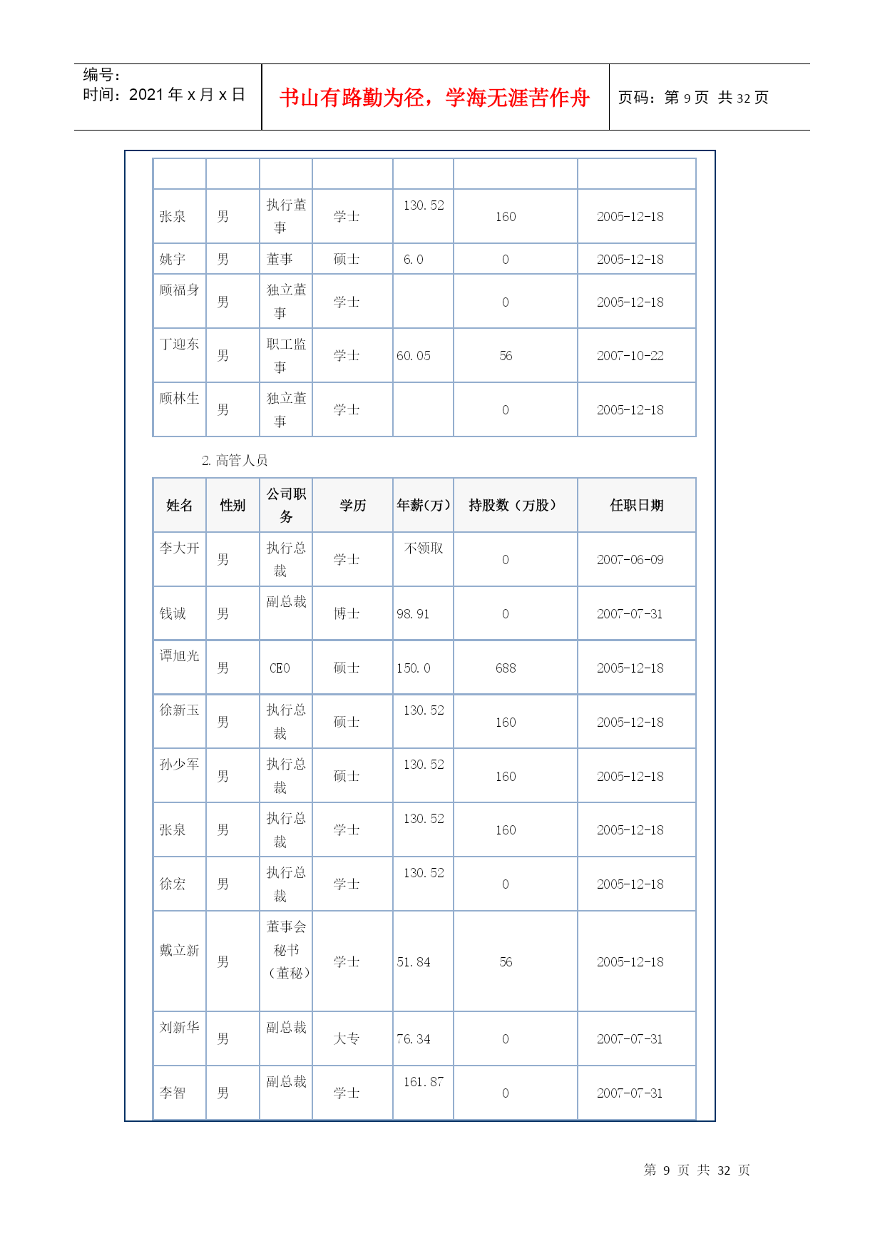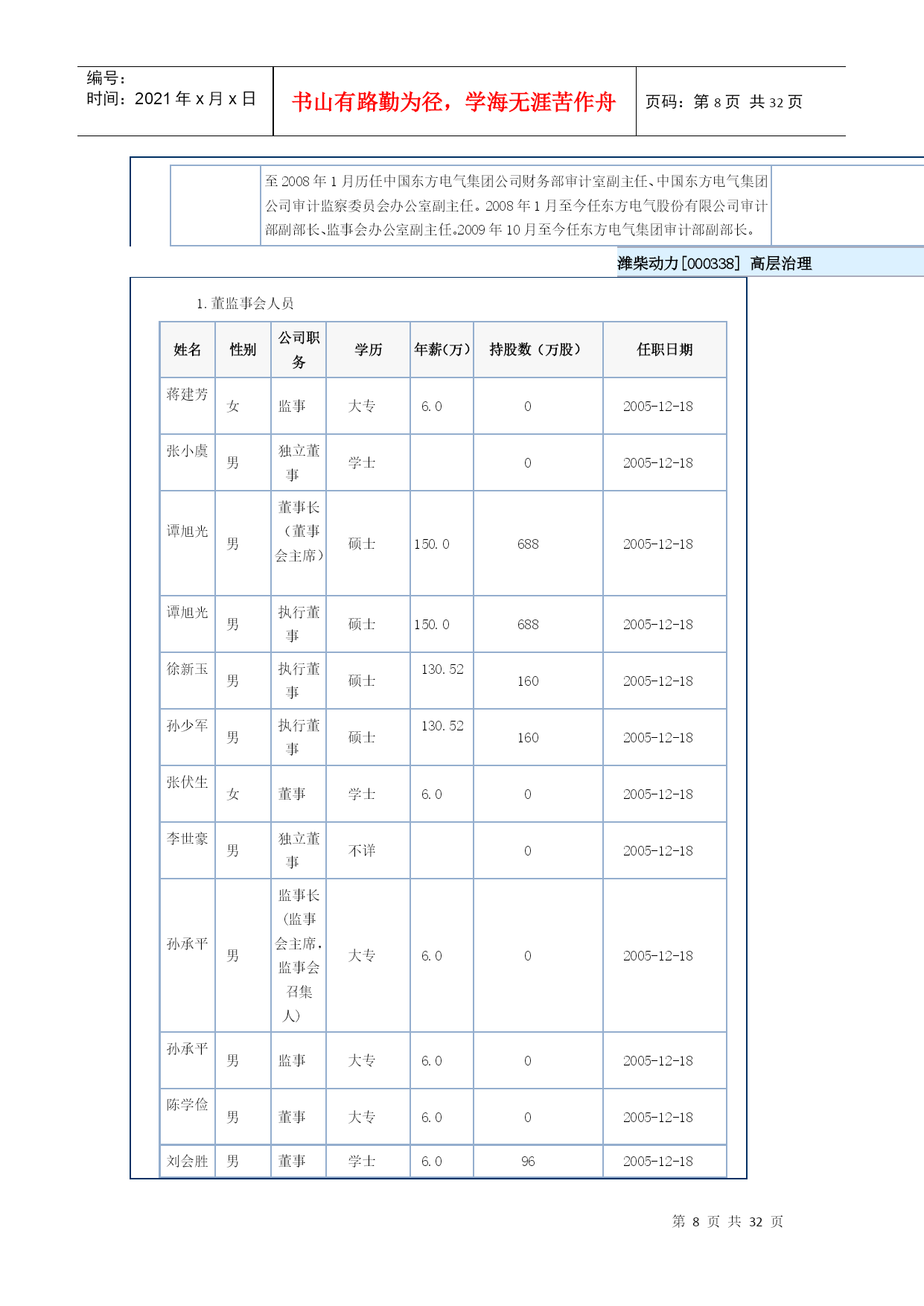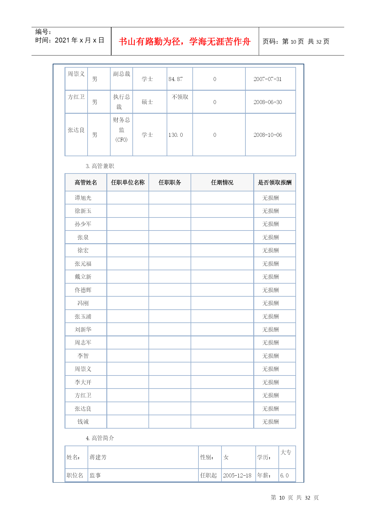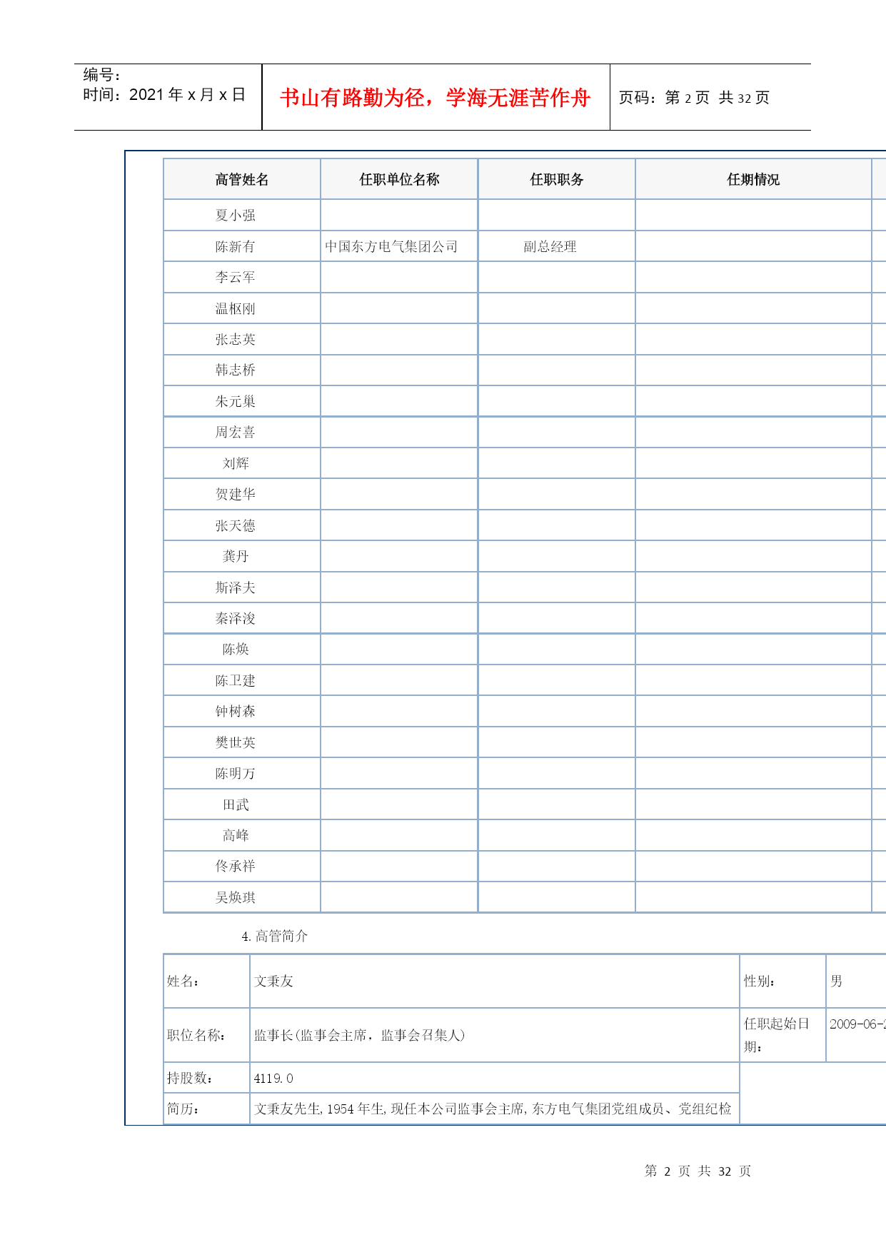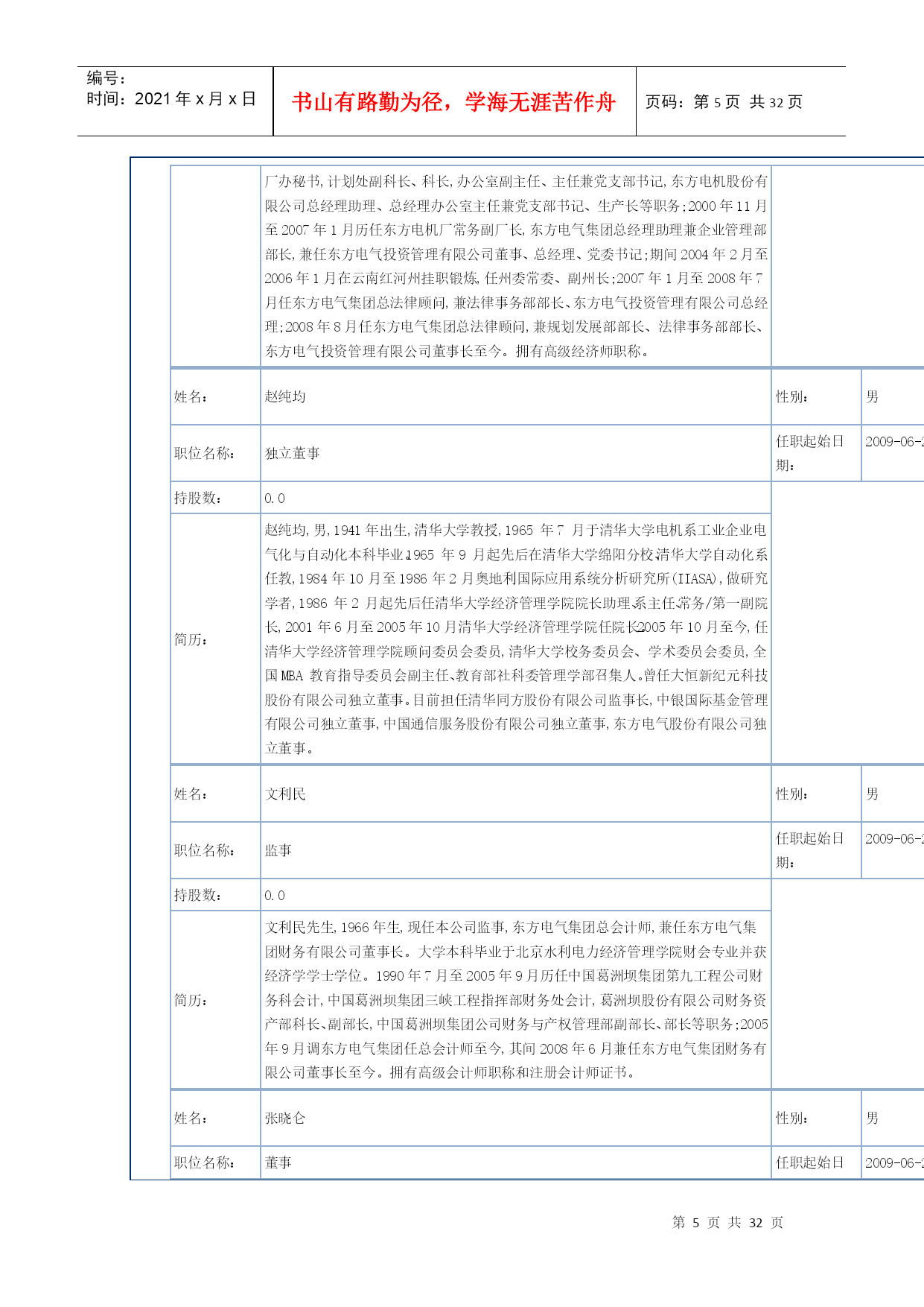 编号:时间:2021年x月x日书山有路勤为径,学海无涯苦作舟页码:第PAGE32页共NUMPAGES32页第PAGE\*MERGEFORMAT32页共NUMPAGES\*MERGEFORMAT32页东方电气[600875]高层治理1.董监事会人员姓名性别公司职务学历年薪(万)持股数(万股)任职日期文秉友男监事长(监事会主席,监事会召集人)学士不详0.4122009-06-29文秉友男监事学士不详0.4122009-06-25朱元巢男执行董事硕士不详02009-06-25斯泽夫男董事长(董事会主席)硕士不详02009-06-29斯泽夫男执行董事硕士不详02009-06-25张继烈男董事硕士不详02009-06-25赵纯均男独立董事学士不详02009-06-25文利民男监事学士不详02009-06-25张晓仑男董事硕士不详02009-06-25温枢刚男执行董事硕士不详02009-06-25李彦梦男独立董事学士不详02009-06-25彭韶兵男独立董事博士不详02010-06-18黄伟男董事博士不详02009-06-25王从远男职工监事学士不详02009-06-242.高管人员姓名性别公司职务学历年薪(万)持股数(万股)任职日期吴焕琪男副总裁学士不详02007-10-24韩志桥男副总裁不详不详0.1272007-10-24龚丹男董事会秘书(董秘)硕士不详0.1272001-02-16龚丹男总会计师硕士不详0.1272007-10-24温枢刚男总裁硕士不详02007-10-24张志英男副总裁学士不详02007-10-24陈焕男副总裁博士不详02009-06-293.高管兼职高管姓名任职单位名称任职职务任期情况是否领取报酬夏小强领取报酬陈新有中国东方电气集团公司副总经理无报酬李云军领取报酬温枢刚领取报酬张志英领取报酬韩志桥领取报酬朱元巢领取报酬周宏喜领取报酬刘辉领取报酬贺建华领取报酬张天德领取报酬龚丹领取报酬斯泽夫领取报酬秦泽浚领取报酬陈焕领取报酬陈卫建领取报酬钟树森领取报酬樊世英领取报酬陈明万领取报酬田武领取报酬高峰领取报酬佟承祥领取报酬吴焕琪领取报酬4.高管简介姓名:文秉友性别:男学历:学士职位名称:监事长(监事会主席,监事会召集人)任职起始日期:2009-06-29年薪:不详持股数:4119.0简历:文秉友先生,1954年生,现任本公司监事会主席,东方电气集团党组成员、党组纪检组组长、董事、机关党委书记。大学本科毕业于西安交通大学锅炉设计与制造专业并获工学学士学位。1982年加入东方锅炉厂,1991年8月至1997年8月历任东方锅炉厂水冷壁车间副主任,东方锅炉实业公司副总经理,东方锅炉(集团)股份有限公司生产长兼生产处党支部书记。1997年8月至2006年2月历任东方锅炉(集团)股份有限公司副董事长、总经理,东方电气集团总经济师。2006年2月任东方电气集团党组成员、党组纪检组组长至今,2008年4月任东方电气集团董事至今。其间,2006年12月至2008年1月兼任东方汽轮机有限公司监事会主席,2006年5月至今兼任东方电气集团机关党委书记。拥有高级工程师职称。姓名:文秉友性别:男学历:学士职位名称:监事任职起始日期:2009-06-25年薪:不详持股数:4119.0简历:文秉友先生,1954年生,现任本公司监事会主席,东方电气集团党组成员、党组纪检组组长、董事、机关党委书记。大学本科毕业于西安交通大学锅炉设计与制造专业并获工学学士学位。1982年加入东方锅炉厂,1991年8月至1997年8月历任东方锅炉厂水冷壁车间副主任,东方锅炉实业公司副总经理,东方锅炉(集团)股份有限公司生产长兼生产处党支部书记。1997年8月至2006年2月历任东方锅炉(集团)股份有限公司副董事长、总经理,东方电气集团总经济师。2006年2月任东方电气集团党组成员、党组纪检组组长至今,2008年4月任东方电气集团董事至今。其间,2006年12月至2008年1月兼任东方汽轮机有限公司监事会主席,2006年5月至今兼任东方电气集团机关党委书记。拥有高级工程师职称。姓名:朱元巢性别:男学历:硕士职位名称:执行董事任职起始日期:2009-06-25年薪:不详持股数:0.0简历:朱元巢先生,1957年生,现任本公司执行董事、高级副总裁,东方电气集团党组成员,兼任东方电气(武汉)核设备有限公司董事长。大学本科毕业于合肥工业大学电气工程系电机专业并获工学学士学位,研究生毕业于中央党校经济学(经济管理)专业。1982年加入东方电机厂,从事水轮发电机设计工作。从1995年4月至1999年12月先后任东方电机股份有限公司电机处副科长、总师办副主任、副总工程师等职务。1999年12月至2006年12月先后任东方电机股份有限公司执行董事、副