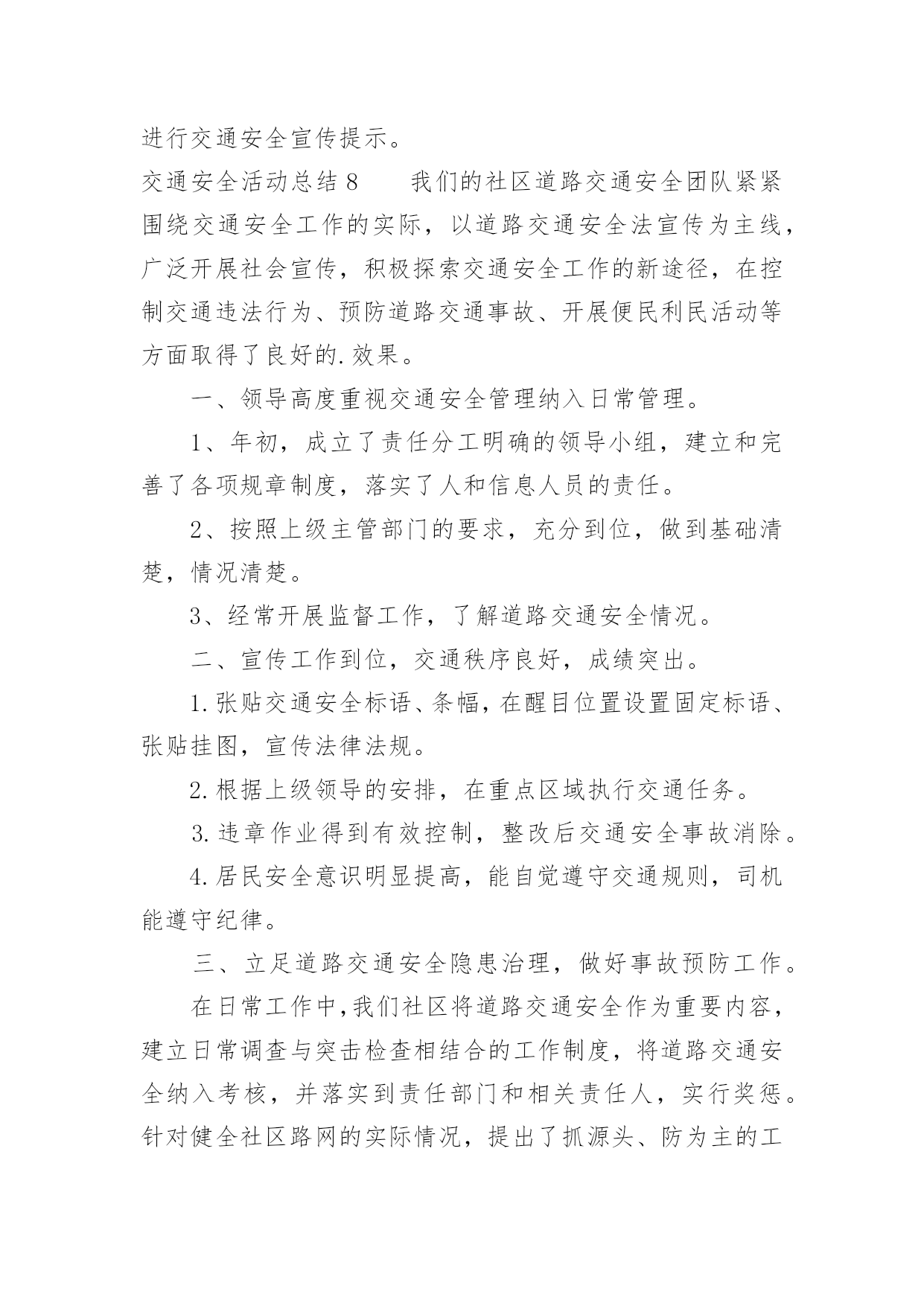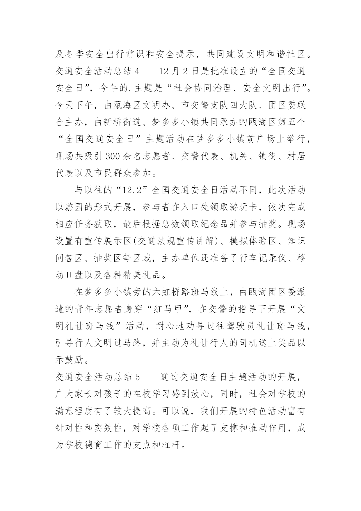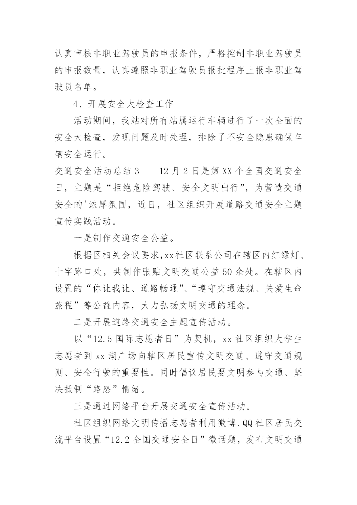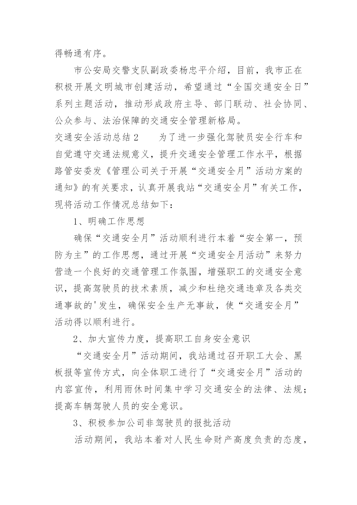 交通安全活动总结交通安全活动总结8篇总结是事后对某一阶段的学习或工作情况作加以回顾检查并分析评价的书面材料,它可以帮助我们有寻找学习和工作中的规律,因此我们要做好归纳,写好总结。那么总结应该包括什么内容呢?以下是小编为大家整理的交通安全活动总结,希望对大家有所帮助。交通安全活动总结112月2日是第五个“全国交通安全日”,市交警支队联合市文明办及其他单位,开展了“协同治理、文明出行”总结表彰活动,同时,向公交出租公司29辆出租车授予了“安全标兵车”标牌,对优秀出租车司机给予表彰和奖励。29辆“安全标兵车”上路12月2日上午10时许,在湖北路原体育中心广场,徐州市公交出租公司的29辆出租车整齐排列,交警支队和公交集团的领导向29辆出租车驾驶员授予了“安全标兵车”的标牌。挂牌后的29辆“安全标兵车”将发挥安全标兵的先锋表率作用,文明出行,文明礼让,让乘客真正坐上“安全车、放心车”。标兵车如果一年内发生一次责任事故的,将给予摘牌的处罚。据统计,该公司20xx年、20xx年连续两年无事故的车在120辆以上,连续四年无事故的车有29辆,这其中还有连续十年以上无事故的车3辆。他们在平常的服务工作中,不争道抢行,能够安全及时地将乘客送达目的地。该公司一直以来非常重视安全,已连续15年评选安全标兵,公司都是以年终奖励、悬挂标志的方式来进行表彰,鼓励更多的人在安全营运、服务中争当先进,争做安全标兵。其中一位连续11年安全行驶180万公里的苏CE9222车安全标兵吴光明介绍说:“作为一名出租车驾驶员,我认为安全就是最大的效益,用心开车、细心观察、安心营运。不抢不急,谨慎驾驶、礼让三先,在平时养成良好的职业文明素养,才能更好地为市民提供安全、放心的出行环境。”市民模范遵守交通法规获奖励日前,市交警支队开展了“童声童绘话平安”作品征集、文明交通征文等活动。这些活动得到了广大市民和少年儿童的积极响应,并从数千份征文和儿童画作品中分别选出10幅优秀的作品,并对作者进行了奖励和表彰。表彰活动结束后,交通志愿者来到市区6个主要路口,对模范遵守交通法规的.市民进行了表彰和奖励。在淮海西路与西安路交叉口,一位骑电动车的市民从西向东骑行,当他看到东西方向的信号灯变成红灯时马上将电动车停在线内,执勤民警和交通志愿者上前,向这名市民送上了一只精美的腰包。民警告诉这位市民:“今天是全国交通安全日,你模范地遵守了交通法规,给大家做出了榜样,理应受到表扬。”这位市民表示,作为一名市民,遵守交通法规是自己应该做的,这样既可以保证自己的生命安全,也可以让城市交通变得畅通有序。市公安局交警支队副政委杨忠平介绍,目前,我市正在积极开展文明城市创建活动,希望通过“全国交通安全日”系列主题活动,推动形成政府主导、部门联动、社会协同、公众参与、法治保障的交通安全管理新格局。交通安全活动总结2为了进一步强化驾驶员安全行车和自觉遵守交通法规意义,提升交通安全管理工作水平,根据路管安委发《管理公司关于开展“交通安全月”活动方案的通知》的有关要求,认真开展我站“交通安全月”有关工作,现将活动工作情况总结如下:1、明确工作思想确保“交通安全月”活动顺利进行本着“安全第一,预防为主”的工作思想,通过开展“交通安全月活动”来努力营造一个良好的交通管理工作氛围,增强职工的交通安全意识,提高驾驶员的技术素质,减少和杜绝交通违章及各类交通事故的'发生,确保安全生产无事故,使“交通安全月”活动得以顺利进行。2、加大宣传力度,提高职工自身安全意识“交通安全月”活动期间,我站通过召开职工大会、黑板报等宣传方式,向全体职工进行了“交通安全月”活动的内容宣传,利用雨休时间集中学习交通安全的法律、法规;提高车辆驾驶人员的安全意识。3、积极参加公司非驾驶员的报批活动活动期间,我站本着对人民生命财产高度负责的态度,认真审核非职业驾驶员的申报条件,严格控制非职业驾驶员的申报数量,认真遵照非职业驾驶员报批程序上报非职业驾驶员名单。4、开展安全大检查工作活动期间,我站对所有站属运行车辆进行了一次全面的安全大检查,发现问题及时处理,排除了不安全隐患确保车辆安全运行。交通安全活动总结312月2日是第XX个全国交通安全日,主题是“拒绝危险驾驶、安全文明出行”,为营造交通安全的'浓厚氛围,近日,社区组织开展道路交通安全主题宣传实践活动。一是制作交通安全公益。根据区相关会议要求,xx社区联系公司在辖区内红绿灯、十字路口处,共制作张贴文明交通公益50余处。在辖区内设置的“你让我让、道路畅通”、“遵守交通法规、关爱生命旅程”等公益内容,大力弘扬文明交通的理念。二是开展道路交通安全主题宣传活动。以“12.5国际志愿者日”为契机,xx社区组织大学生志愿者到xx湖广场向辖区居民宣传文明交通、遵守交通规则、安全行驶的重要性。同时倡议居民要文明参与交