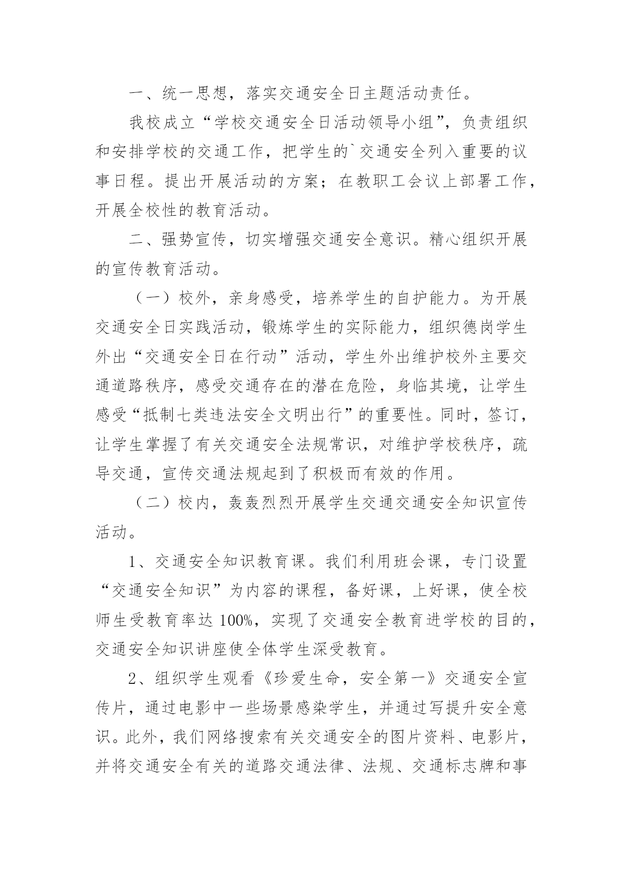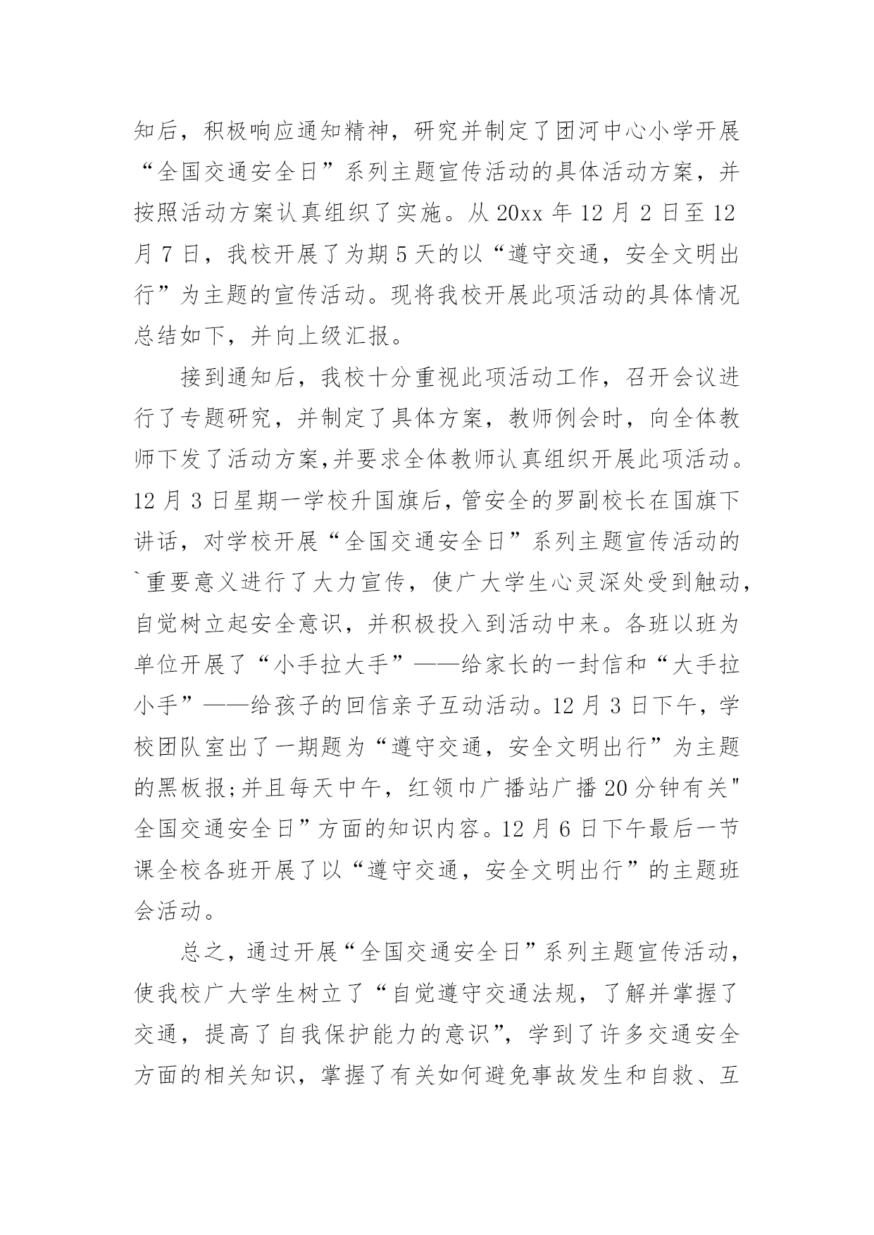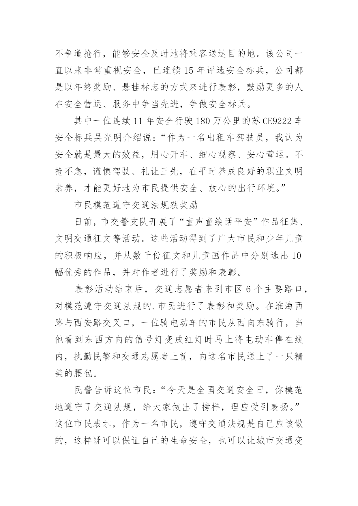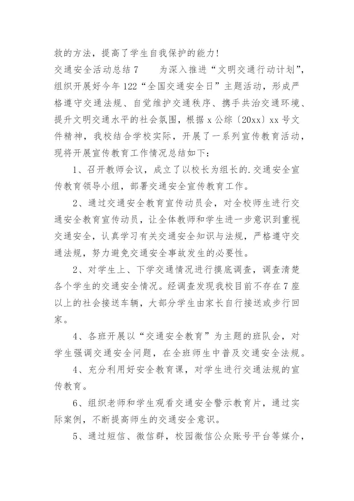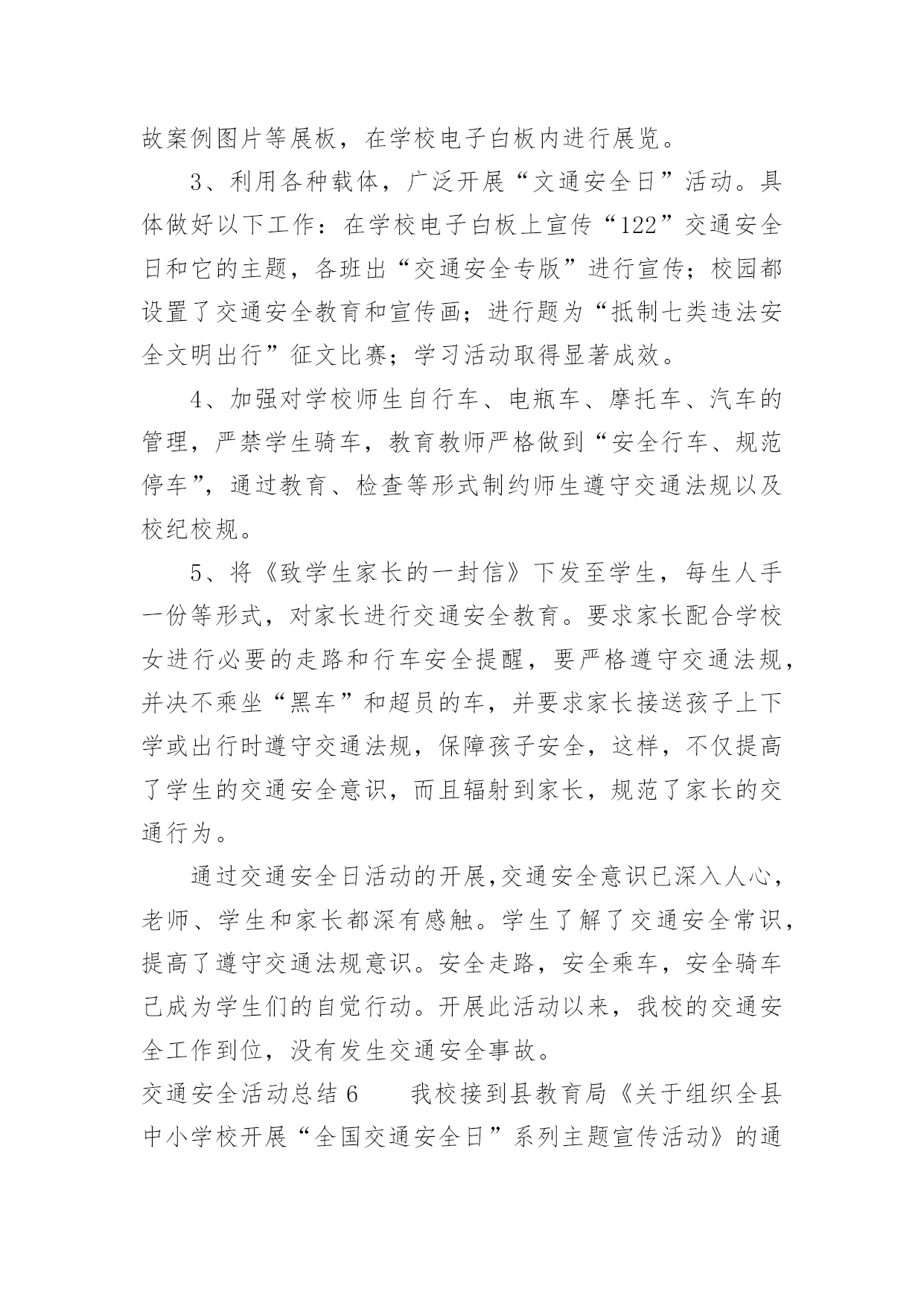 交通安全活动总结交通安全活动总结8篇总结是事后对某一阶段的学习或工作情况作加以回顾检查并分析评价的书面材料,它可以帮助我们有寻找学习和工作中的规律,因此我们要做好归纳,写好总结。那么总结应该包括什么内容呢?以下是小编为大家整理的交通安全活动总结,希望对大家有所帮助。交通安全活动总结112月2日是第五个“全国交通安全日”,市交警支队联合市文明办及其他单位,开展了“协同治理、文明出行”总结表彰活动,同时,向公交出租公司29辆出租车授予了“安全标兵车”标牌,对优秀出租车司机给予表彰和奖励。29辆“安全标兵车”上路12月2日上午10时许,在湖北路原体育中心广场,徐州市公交出租公司的29辆出租车整齐排列,交警支队和公交集团的领导向29辆出租车驾驶员授予了“安全标兵车”的标牌。挂牌后的29辆“安全标兵车”将发挥安全标兵的先锋表率作用,文明出行,文明礼让,让乘客真正坐上“安全车、放心车”。标兵车如果一年内发生一次责任事故的,将给予摘牌的处罚。据统计,该公司20xx年、20xx年连续两年无事故的车在120辆以上,连续四年无事故的车有29辆,这其中还有连续十年以上无事故的车3辆。他们在平常的服务工作中,不争道抢行,能够安全及时地将乘客送达目的地。该公司一直以来非常重视安全,已连续15年评选安全标兵,公司都是以年终奖励、悬挂标志的方式来进行表彰,鼓励更多的人在安全营运、服务中争当先进,争做安全标兵。其中一位连续11年安全行驶180万公里的苏CE9222车安全标兵吴光明介绍说:“作为一名出租车驾驶员,我认为安全就是最大的效益,用心开车、细心观察、安心营运。不抢不急,谨慎驾驶、礼让三先,在平时养成良好的职业文明素养,才能更好地为市民提供安全、放心的出行环境。”市民模范遵守交通法规获奖励日前,市交警支队开展了“童声童绘话平安”作品征集、文明交通征文等活动。这些活动得到了广大市民和少年儿童的积极响应,并从数千份征文和儿童画作品中分别选出10幅优秀的作品,并对作者进行了奖励和表彰。表彰活动结束后,交通志愿者来到市区6个主要路口,对模范遵守交通法规的.市民进行了表彰和奖励。在淮海西路与西安路交叉口,一位骑电动车的市民从西向东骑行,当他看到东西方向的信号灯变成红灯时马上将电动车停在线内,执勤民警和交通志愿者上前,向这名市民送上了一只精美的腰包。民警告诉这位市民:“今天是全国交通安全日,你模范地遵守了交通法规,给大家做出了榜样,理应受到表扬。”这位市民表示,作为一名市民,遵守交通法规是自己应该做的,这样既可以保证自己的生命安全,也可以让城市交通变得畅通有序。市公安局交警支队副政委杨忠平介绍,目前,我市正在积极开展文明城市创建活动,希望通过“全国交通安全日”系列主题活动,推动形成政府主导、部门联动、社会协同、公众参与、法治保障的交通安全管理新格局。交通安全活动总结2为了进一步强化驾驶员安全行车和自觉遵守交通法规意义,提升交通安全管理工作水平,根据路管安委发《管理公司关于开展“交通安全月”活动方案的通知》的有关要求,认真开展我站“交通安全月”有关工作,现将活动工作情况总结如下:1、明确工作思想确保“交通安全月”活动顺利进行本着“安全第一,预防为主”的工作思想,通过开展“交通安全月活动”来努力营造一个良好的交通管理工作氛围,增强职工的交通安全意识,提高驾驶员的技术素质,减少和杜绝交通违章及各类交通事故的'发生,确保安全生产无事故,使“交通安全月”活动得以顺利进行。2、加大宣传力度,提高职工自身安全意识“交通安全月”活动期间,我站通过召开职工大会、黑板报等宣传方式,向全体职工进行了“交通安全月”活动的内容宣传,利用雨休时间集中学习交通安全的法律、法规;提高车辆驾驶人员的安全意识。3、积极参加公司非驾驶员的报批活动活动期间,我站本着对人民生命财产高度负责的态度,认真审核非职业驾驶员的申报条件,严格控制非职业驾驶员的申报数量,认真遵照非职业驾驶员报批程序上报非职业驾驶员名单。4、开展安全大检查工作活动期间,我站对所有站属运行车辆进行了一次全面的安全大检查,发现问题及时处理,排除了不安全隐患确保车辆安全运行。交通安全活动总结312月2日是第XX个全国交通安全日,主题是“拒绝危险驾驶、安全文明出行”,为营造交通安全的'浓厚氛围,近日,社区组织开展道路交通安全主题宣传实践活动。一是制作交通安全公益。根据区相关会议要求,xx社区联系公司在辖区内红绿灯、十字路口处,共制作张贴文明交通公益50余处。在辖区内设置的“你让我让、道路畅通”、“遵守交通法规、关爱生命旅程”等公益内容,大力弘扬文明交通的理念。二是开展道路交通安全主题宣传活动。以“12.5国际志愿者日”为契机,xx社区组织大学生志愿者到xx湖广场向辖区居民宣传文明交通、遵守交通规则、安全行驶的重要性。同时倡议居民要文明参与交