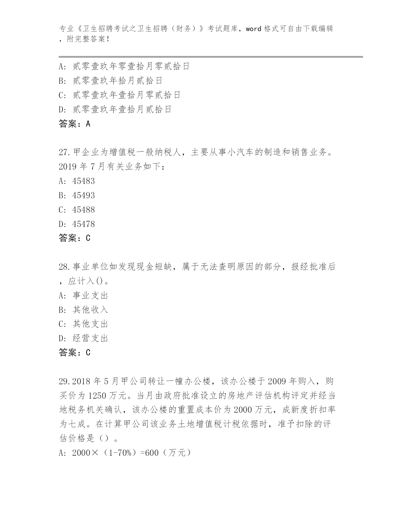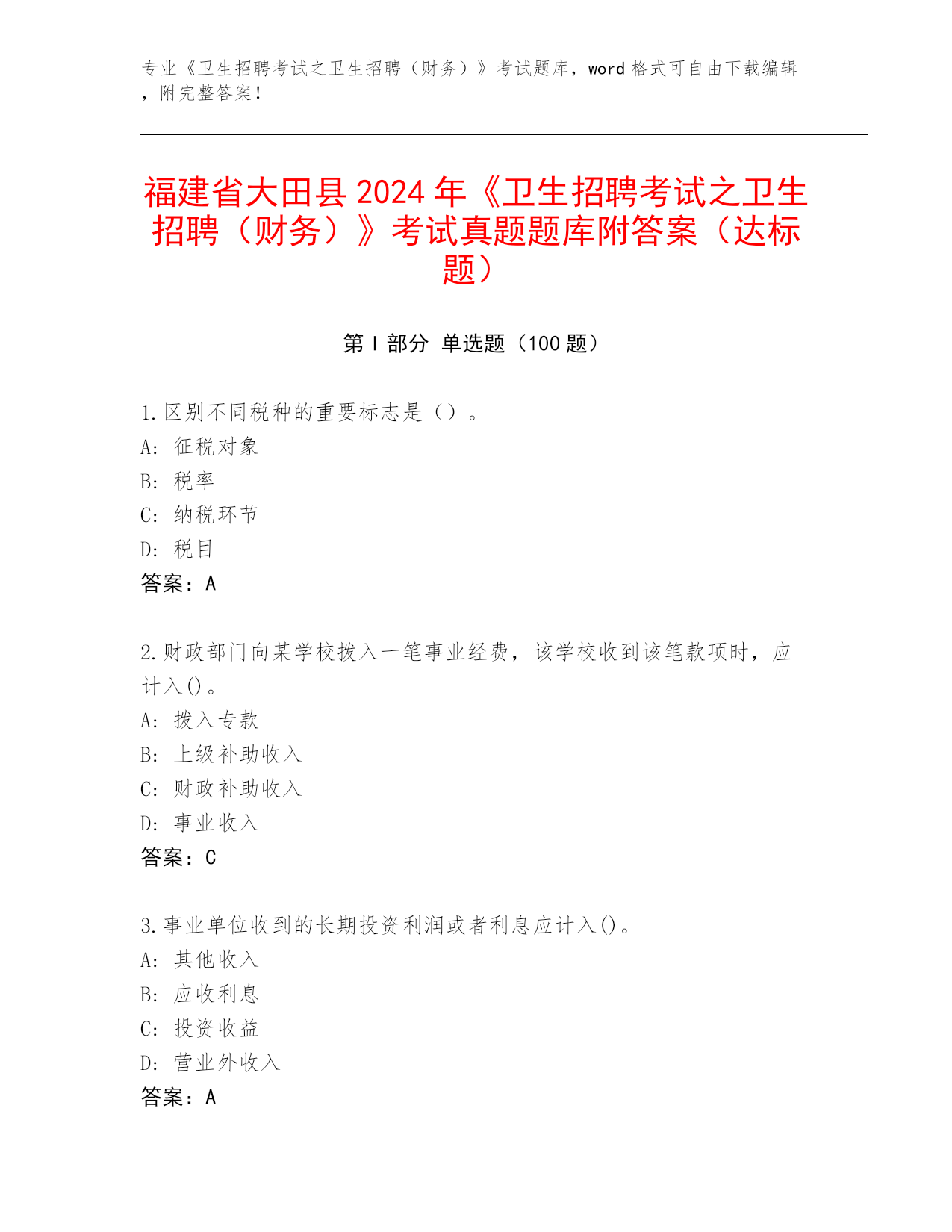 福建省大田县2024年《卫生招聘考试之卫生招聘(财务)》考试真题题库附答案(达标题)
