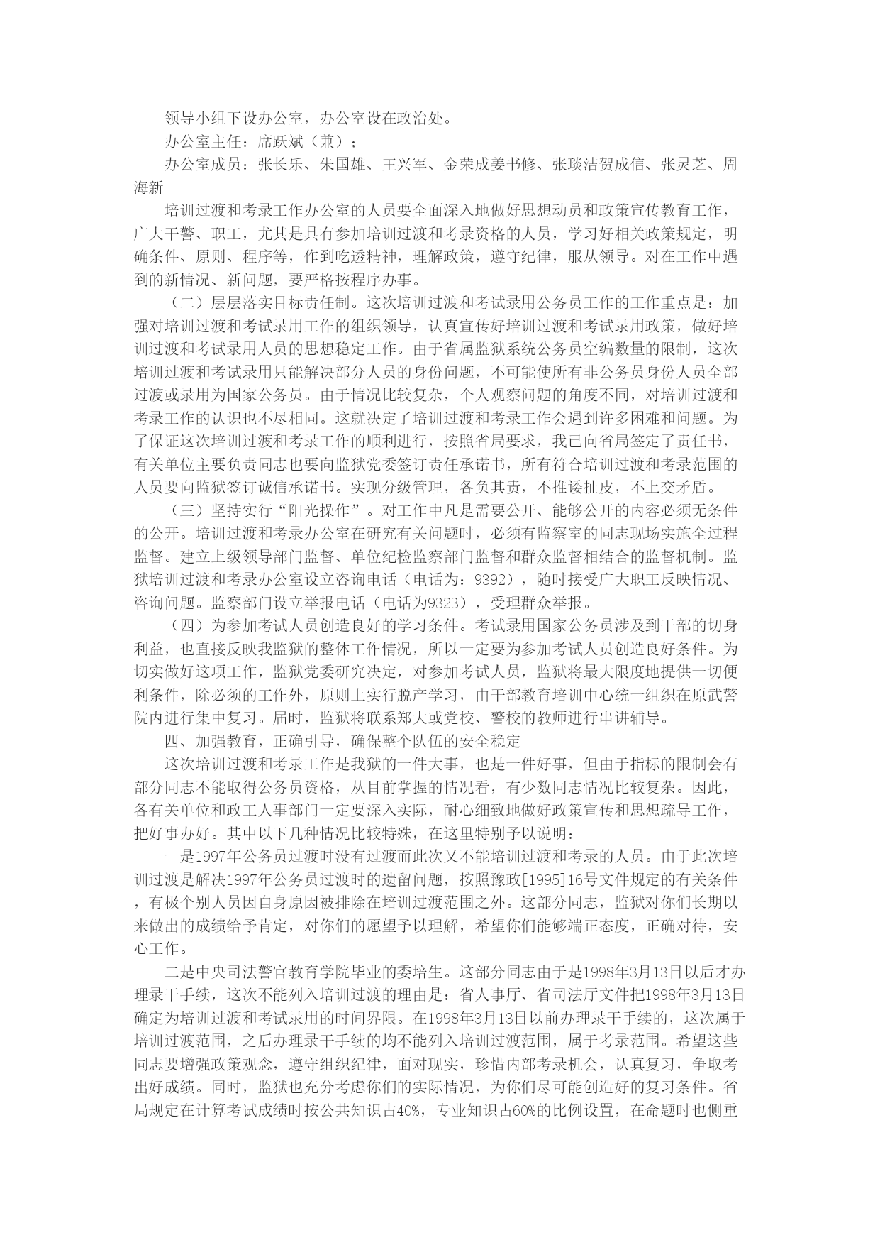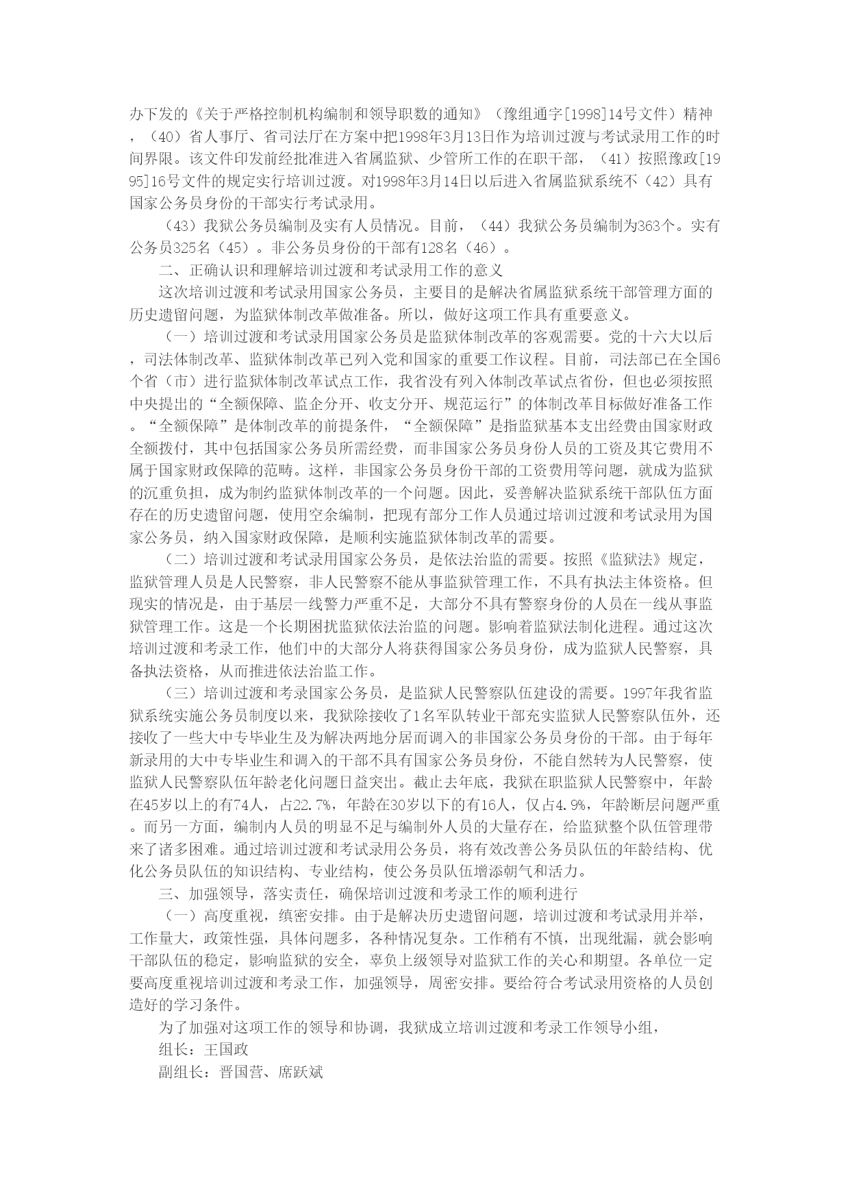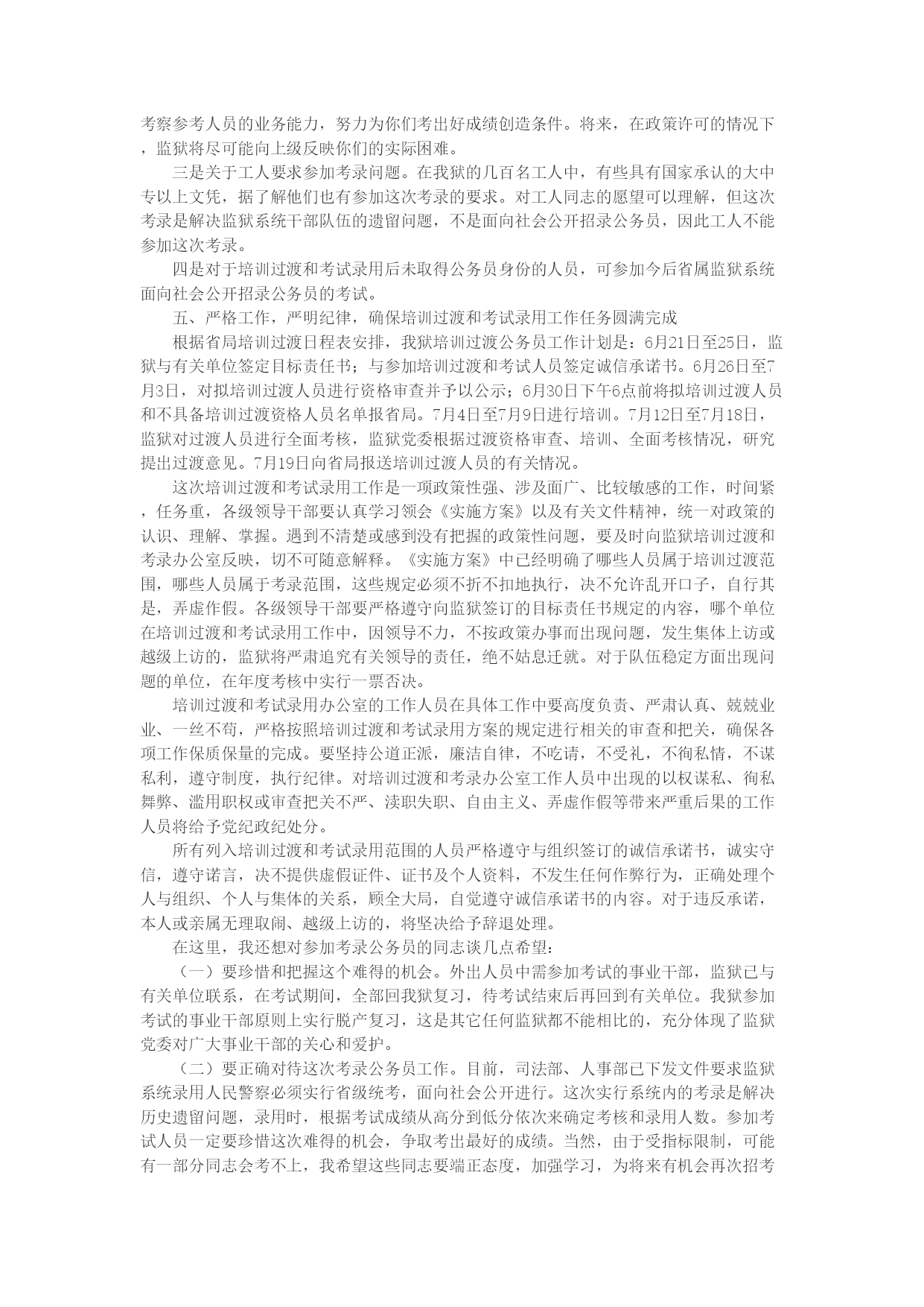 领导在考录公务员会上的讲话统一思想提高认识加强领导精心组织确保我狱培训过渡和考试录用国家公务员工作圆满完成王国政2004年6月21日同志们:6月18日,省局在郑州召开了省属监狱系统培训过渡和考试录用国家公务员工作会议,会上王有仁副厅长作了重要讲话,苏智通主任传达了两个实施方案。为贯彻落实省局会议精神,切实做好我狱培训过渡和考试录用国家公务员工作,经监狱党委研究决定,召开这次会议。会议的主要任务是部署和安排我狱培训过渡和考试录用国家公务员工作。刚才席主任传达了省人事厅、省司法厅《河南省省属监狱、少管所现有部分工作人员向国家公务员过渡工作实施方案》、《河南省省属监狱、少管所考试录用国家公务员(人民警察)工作实施方案》,为了切实做好这项工作,我代表监狱党委讲以下意见:一、关于省属监狱系统培训过渡和考试录用公务员工作有关情况的说明及我狱人员情况(1)目前省属监狱系统人员编制情况。截止2003年底,(2)经省编办核定的省属监狱系统国家公务员编制为11408名(3)。现在实有国家公务员9839名,(4)职位空缺1569名(5)。非国家公务员身份的干部2563名(6)。(7)关于两个《实施方案》的制订。1997年按照省政府部署,(8)我省监狱系统实施了公务员过渡,(9)当时由于受编制限制,(10)省属监狱系统有813人没有能够过渡,(11)形成了遗留问题。1998年以后,(12)为缓解监狱一线警力紧张问题,(13)照顾监狱系统子女就业,(14)又陆续接收大中专毕业生及录用中央司法警官学院(原“两劳”学院)等院校委培生共1750人,(15)因他们不(16)具有公务员身份,(17)形成了我们系统称谓的事业干部。为解决监狱系统干部管理方面的历史遗留问题,(18)利用现有编制资源将部分干部培训过渡和考录为公务员,(19)减少在推行监狱体制改革中的矛盾。省厅、局对培训过渡和考录公务员工作非常重视。今年3月5日,(20)省人事厅、省司法厅联合向省政府报送了《关于省属监狱劳教系统部分工作人员过渡及考录国家公务员问题的请示》。省委、省政府领导相继对培训过渡和考录工作作出重要批示。按照领导批示精神,(21)省人事厅公务员管理处、调配录用处、省司法厅政治部、省监狱管理局政治部联合组成调研组,(22)深入部分基层单位采取多种形式进行了调研,(23)对基层反映集中的问题作了深入分析。在此基础上,(24)根据省委、省政府有关文件和省领导批示精神,(25)拟订了《河南省省属监狱、少管所现有部分工作人员向国家公务员过渡工作实施方案》和《河南省省属监狱、少管所考试录用国家公务员(人民警察)工作实施方案》。6月1日,(26)省人事厅、司法厅、省监狱管理局主要领导及有关人员召开联席会议,(27)在对方案中的一些问题慎重研究,(28)认真修改,(29)统一认识的基础上形成上报省政府的意见。省政府领导在听取了省人事厅、省司法厅领导同(30)志汇报后,(31)批准了工作方案。两个《方案》对省属监狱、少管所部分工作人员培训过渡和考试录用为国家公务员(人民警察)工作的指(32)导思想和原则、组织领导、培训过渡与考录的对象、资格条件、方法步骤以及有关问题处理等作了比较明确具体规定。可以说,(33)这完全符合监狱系统的实际,(34)有利于解决我省监狱系统队伍(35)建设的历史遗留问题,(36)能有这样的结果,(37)是厅党委、局党委和厅、局有关部门长期努力的结果,(38)也是省委、省政府及有关部门对监狱工作关心和支持的结果。(39)关于适用培训过渡和考试录用的时间界定。按照省委组织部、省人事厅、省编办下发的《关于严格控制机构编制和领导职数的通知》(豫组通字[1998]14号文件)精神,(40)省人事厅、省司法厅在方案中把1998年3月13日作为培训过渡与考试录用工作的时间界限。该文件印发前经批准进入省属监狱、少管所工作的在职干部,(41)按照豫政[1995]16号文件的规定实行培训过渡。对1998年3月14日以后进入省属监狱系统不(42)具有国家公务员身份的干部实行考试录用。(43)我狱公务员编制及实有人员情况。目前,(44)我狱公务员编制为363个。实有公务员325名(45)。非公务员身份的干部有128名(46)。二、正确认识和理解培训过渡和考试录用工作的意义这次培训过渡和考试录用国家公务员,主要目的是解决省属监狱系统干部管理方面的历史遗留问题,为监狱体制改革做准备。所以,做好这项工作具有重要意义。(一)培训过渡和考试录用国家公务员是监狱体制改革的客观需要。党的十六大以后,司法体制改革、监狱体制改革已列入党和国家的重要工作议程。目前,司法部已在全国6个省(市)进行监狱体制改革试点工作,我省没有列入体制改革试点省份,但也必须按照中央提出的“全额保障、监企分开、收支分开、规范运行”的体制
