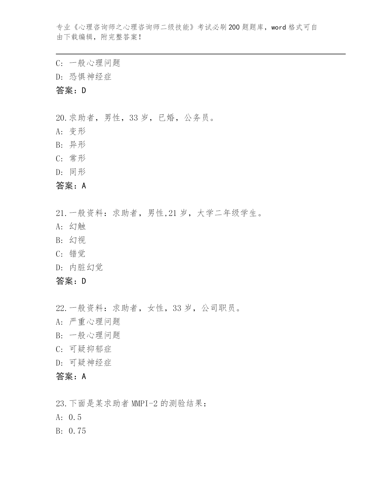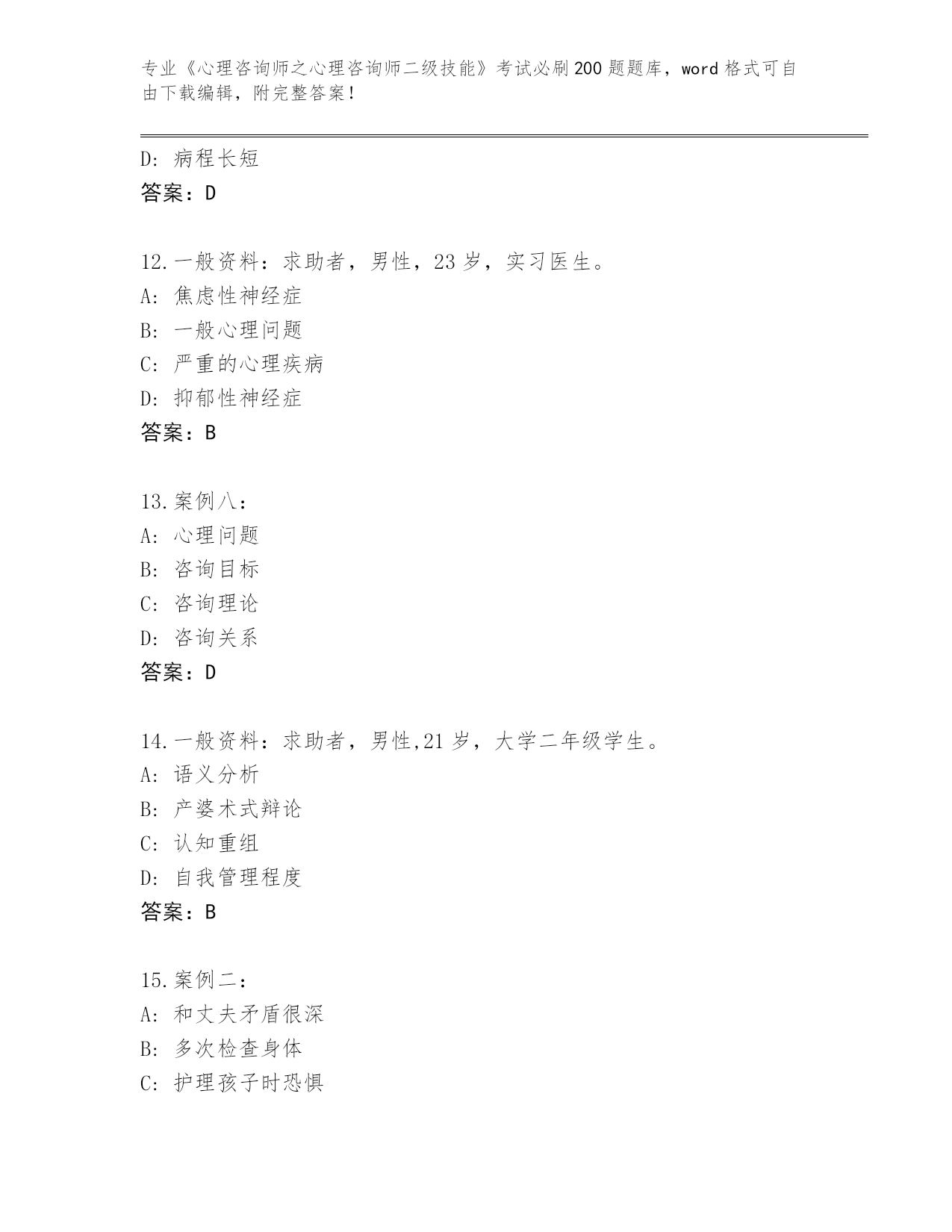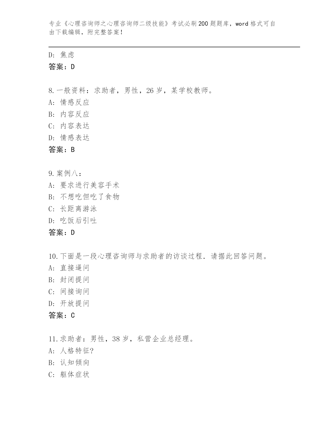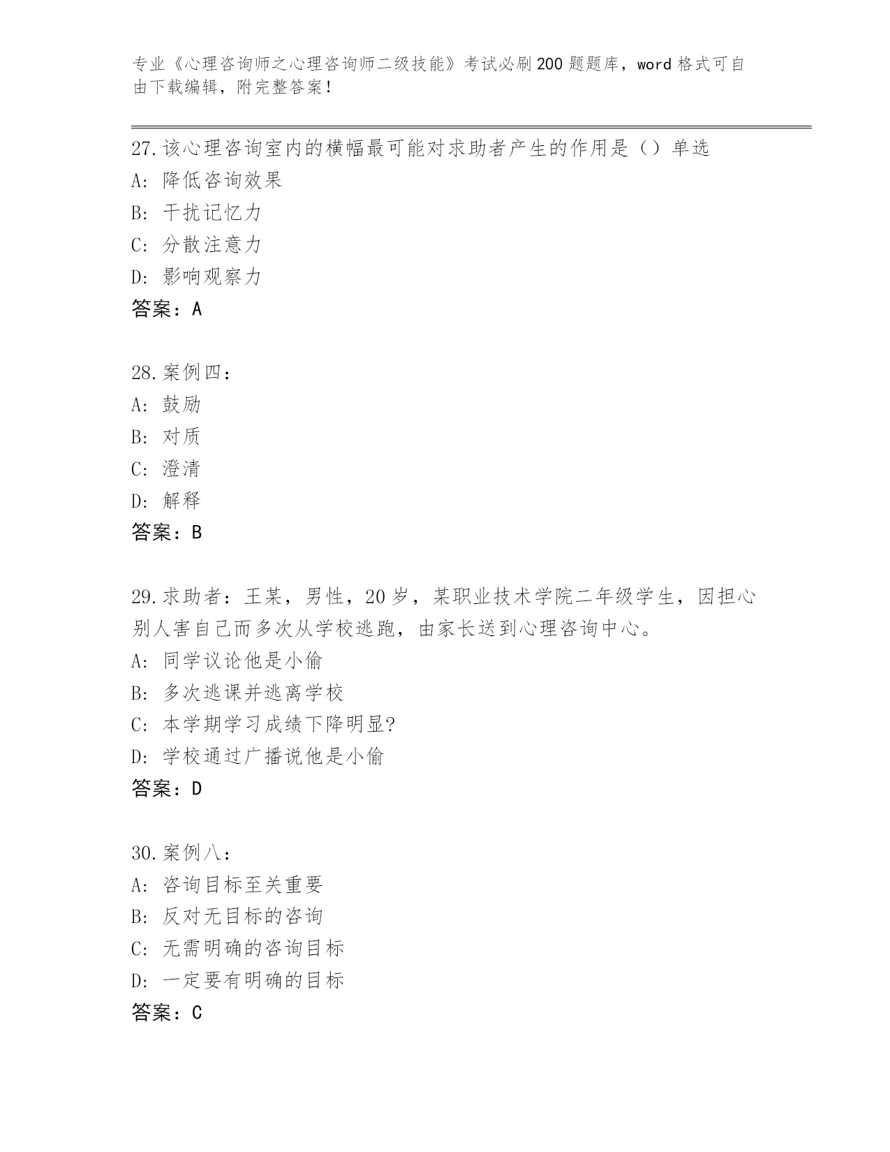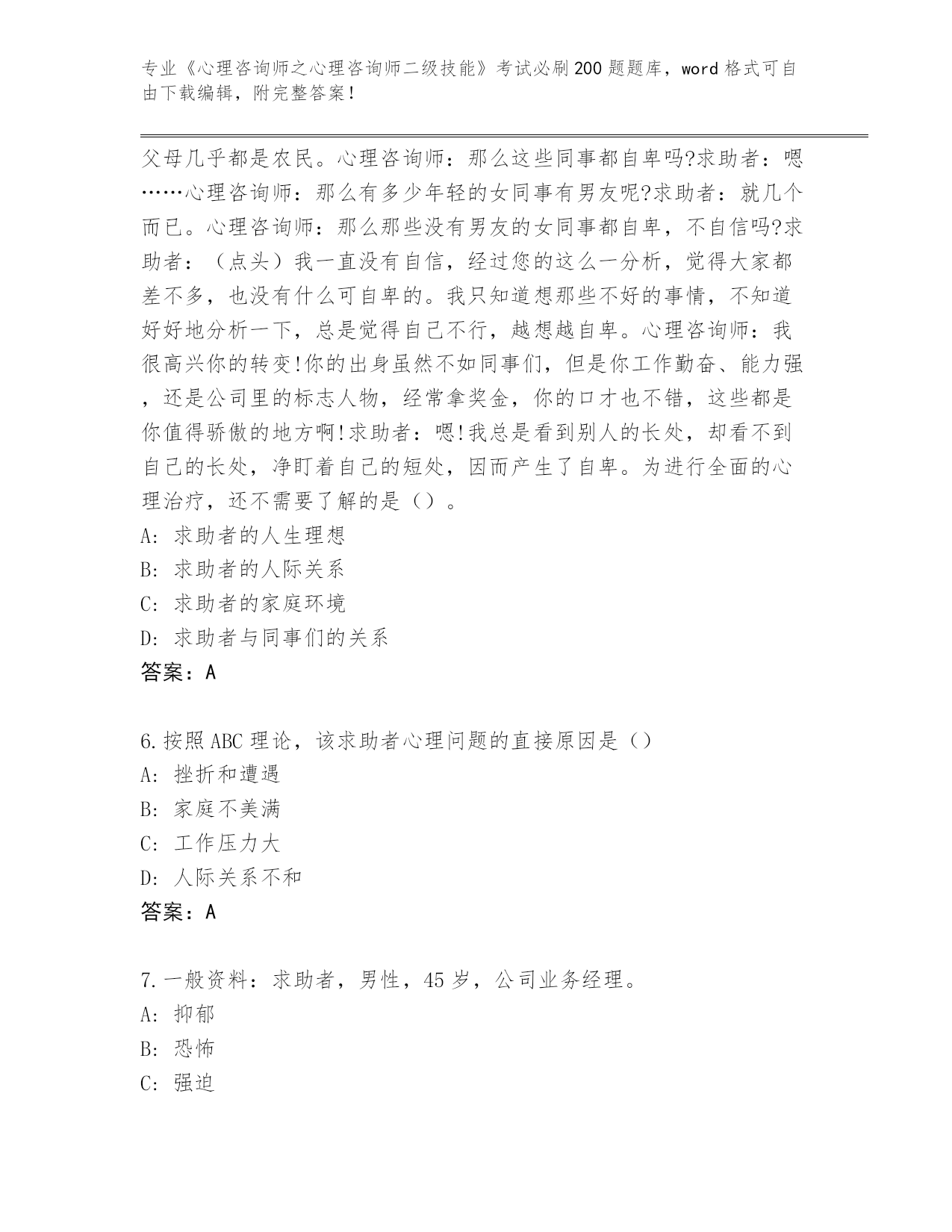 整理四川省武侯区《心理咨询师之心理咨询师二级技能》考试必刷200题完整版及答案