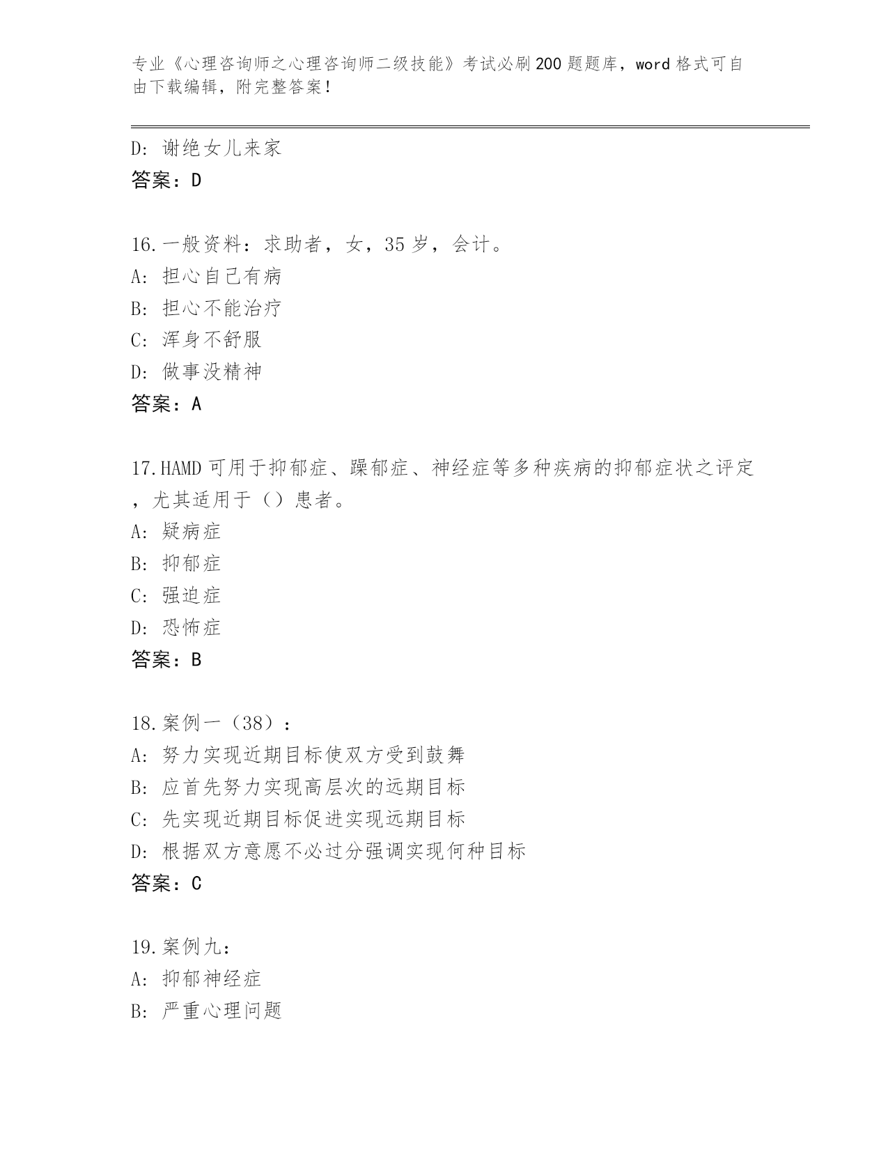 完整版甘肃省《心理咨询师之心理咨询师二级技能》考试必刷200题真题有完整答案