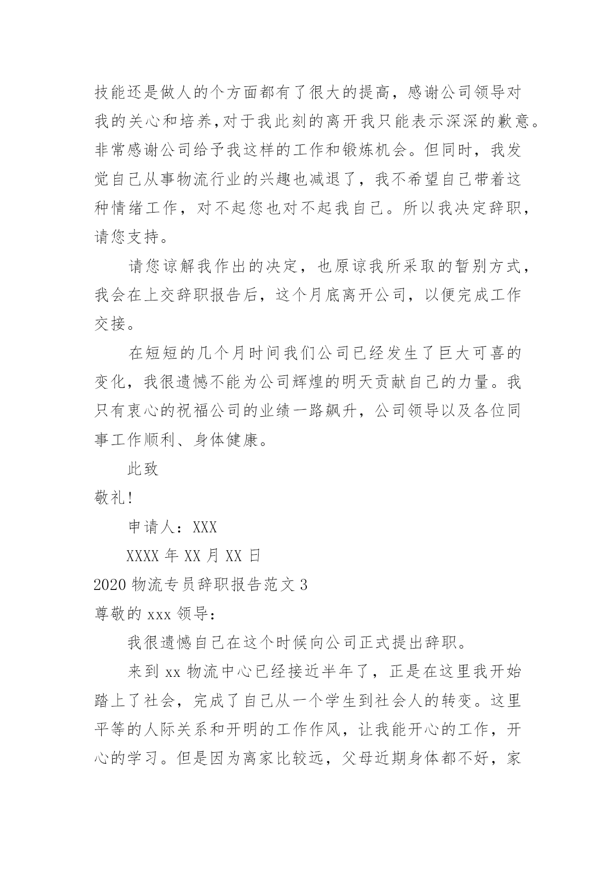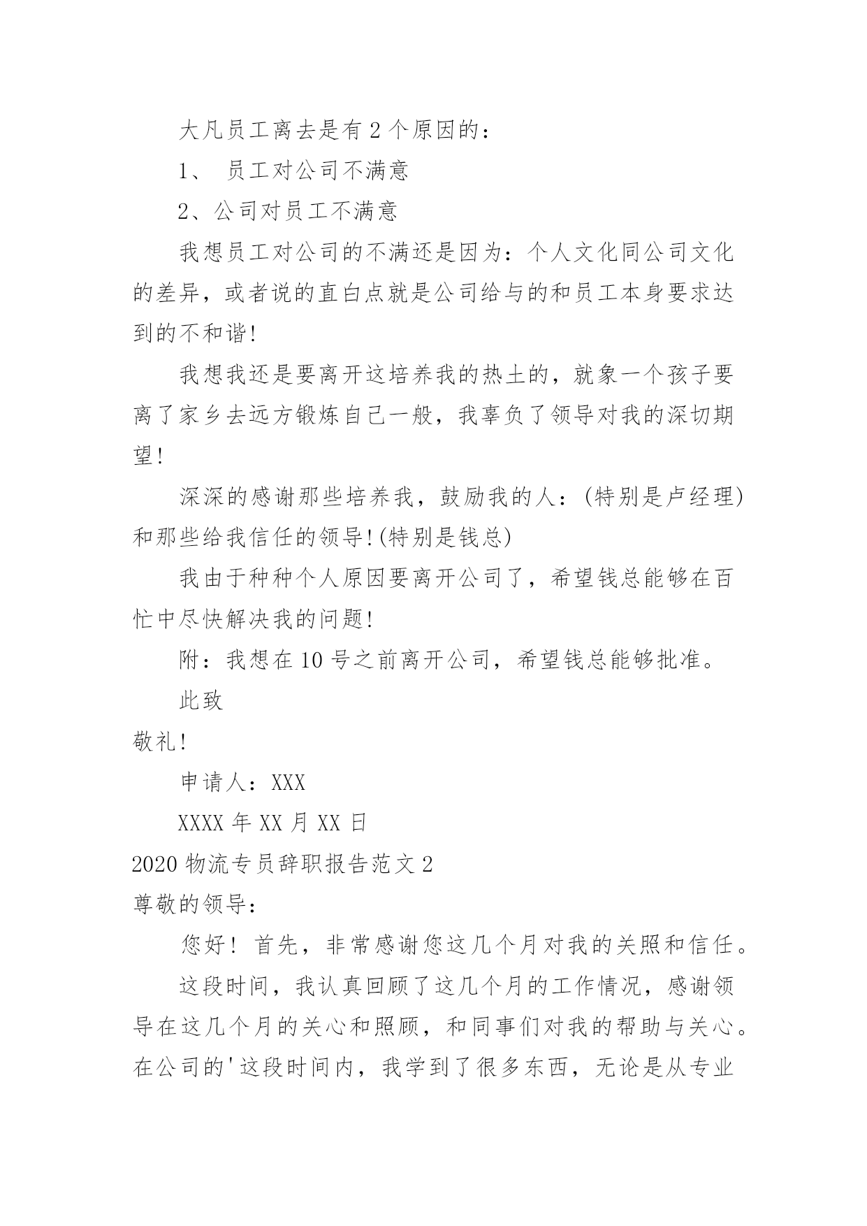 物流专员辞职报告2020物流专员辞职报告范文2020物流专员辞职报告范文1尊敬的XX领导:您好!不知不觉在公司也呆了快一年了,(去年9月进公司),在卢经理和各位领导的栽培和信任下,我从一个底层跟车的,到现在能够出来共同合作管理XXdc!这样的深情,我铭记在心!想来,当初进XX物流的时候,第一个是对“乐事”这样年轻的休闲食品的所包含的文化的'认同,我想我们的公司也是这样的一个年轻的公司,或者说具有年轻力量的公司,!我也体会到了这样的氛围:年轻,拼搏,能力,创新,团结!公司也在飞速的发展,从济南到XX,从苏州到南京!可以说公司的成长是几何的!我也很庆幸可以在这样的环境中长大!我没有什么样的文凭,可是我在这里是被认可的,这让我找到了我的自信心!我深深的感激这里!或者我是一个不好的学生,或者员工,最后,在这样的环境中我还是选择了离开!我不知道这样算不算背叛。只是我不得不离开!大凡员工离去是有2个原因的:1、员工对公司不满意2、公司对员工不满意我想员工对公司的不满还是因为:个人文化同公司文化的差异,或者说的直白点就是公司给与的和员工本身要求达到的不和谐!我想我还是要离开这培养我的热土的,就象一个孩子要离了家乡去远方锻炼自己一般,我辜负了领导对我的深切期望!深深的感谢那些培养我,鼓励我的人:(特别是卢经理)和那些给我信任的领导!(特别是钱总)我由于种种个人原因要离开公司了,希望钱总能够在百忙中尽快解决我的问题!附:我想在10号之前离开公司,希望钱总能够批准。此致敬礼!申请人:XXXXXXX年XX月XX日2020物流专员辞职报告范文2尊敬的领导:您好!首先,非常感谢您这几个月对我的关照和信任。这段时间,我认真回顾了这几个月的工作情况,感谢领导在这几个月的关心和照顾,和同事们对我的帮助与关心。在公司的'这段时间内,我学到了很多东西,无论是从专业技能还是做人的个方面都有了很大的提高,感谢公司领导对我的关心和培养,对于我此刻的离开我只能表示深深的歉意。非常感谢公司给予我这样的工作和锻炼机会。但同时,我发觉自己从事物流行业的兴趣也减退了,我不希望自己带着这种情绪工作,对不起您也对不起我自己。所以我决定辞职,请您支持。请您谅解我作出的决定,也原谅我所采取的暂别方式,我会在上交辞职报告后,这个月底离开公司,以便完成工作交接。在短短的几个月时间我们公司已经发生了巨大可喜的变化,我很遗憾不能为公司辉煌的明天贡献自己的力量。我只有衷心的祝福公司的业绩一路飙升,公司领导以及各位同事工作顺利、身体健康。此致敬礼!申请人:XXXXXXX年XX月XX日2020物流专员辞职报告范文3尊敬的xxx领导:我很遗憾自己在这个时候向公司正式提出辞职。来到xx物流中心已经接近半年了,正是在这里我开始踏上了社会,完成了自己从一个学生到社会人的转变。这里平等的人际关系和开明的工作作风,让我能开心的工作,开心的学习。但是因为离家比较远,父母近期身体都不好,家里没有人照顾,作为一个儿子我有侍奉双亲的责任,这两天我虽然很努力让自己专心工作,但是心却无时无刻不牵挂家里,我现在的状态确实已经无法胜任工作。正是考虑到这些因素,我郑重向公司提出辞职,希望领导能够批准,另外离开前我也会认真做好现有的工作,把未完成的工作做一下整理,以保证工作的顺利的交接。我真心的.感谢公司领导一直以来对我的信任,感谢身边同事对我的关心和帮助,很荣幸自己成为过公司的一员,我确信在公司的这段工作和学习的经历和经验将成为我一生宝贵的财富。祝公司业务蒸蒸日上,取得更大的成功!此致敬礼!申请人:XXXXXXX年XX月XX日
