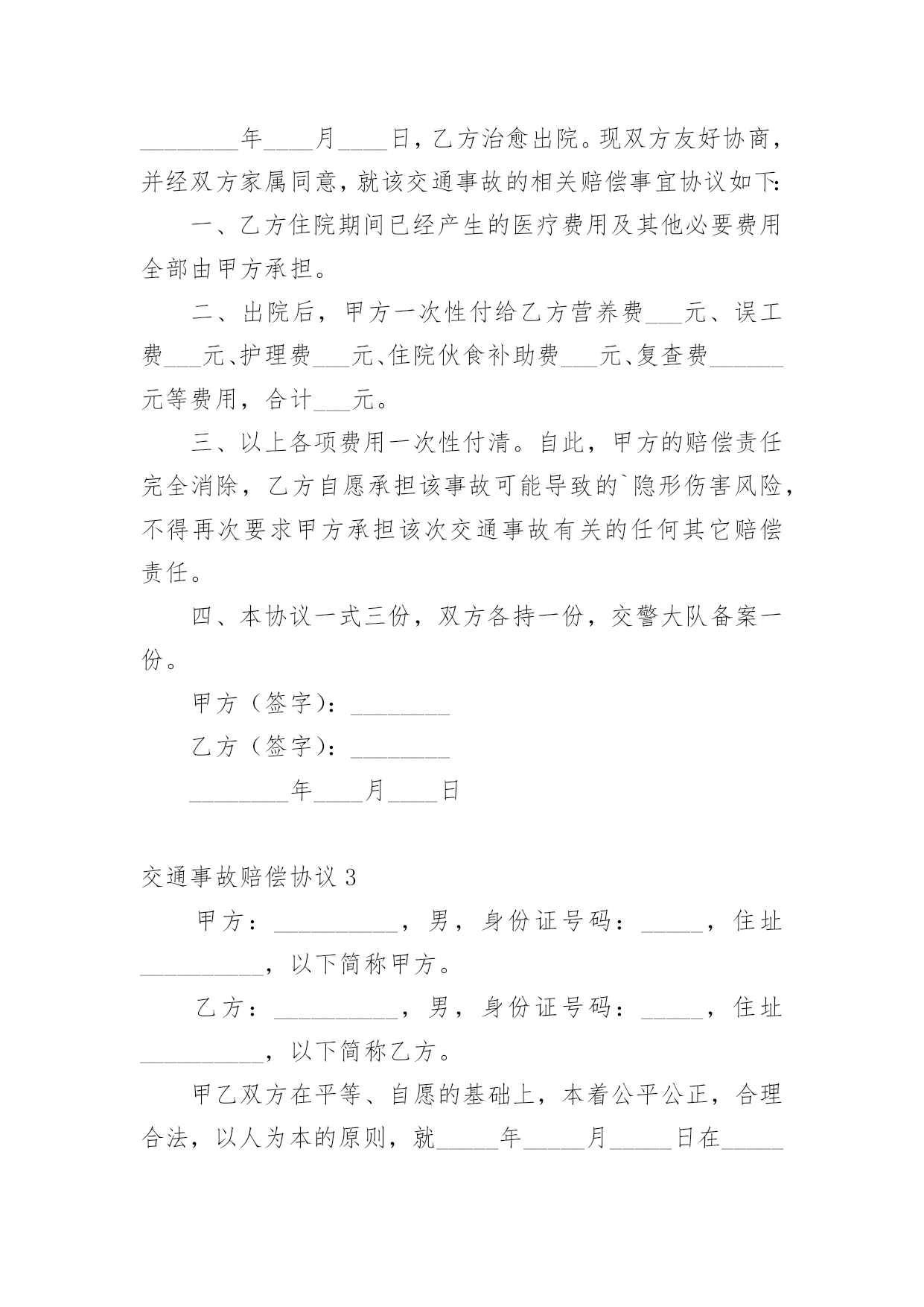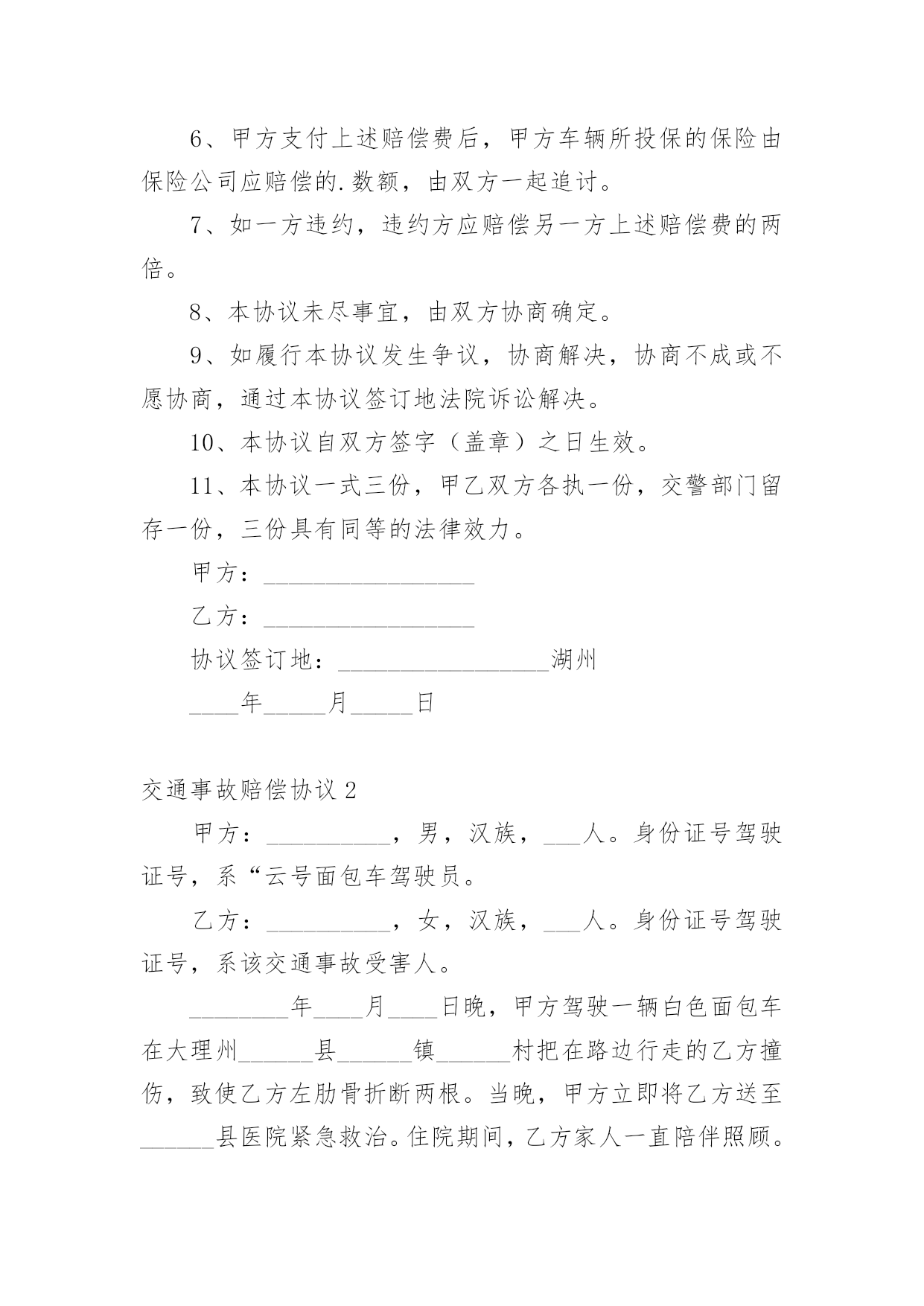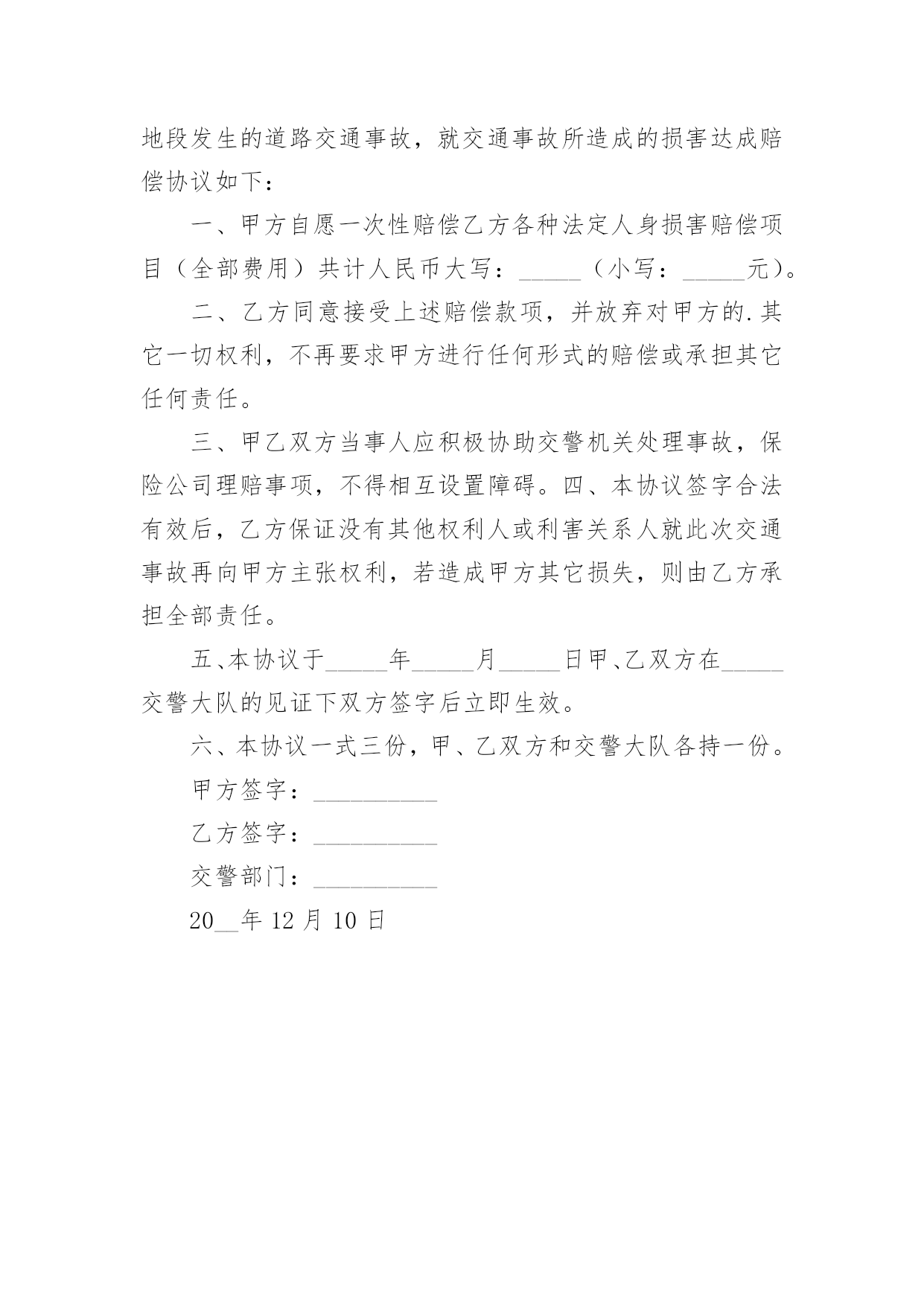 交通事故赔偿协议在日新月异的现代社会中,协议起到的作用越来越大,协议能够成为双方当事人的合法依据。那么协议怎么写才能发挥它最大的作用呢?下面是小编收集整理的交通事故赔偿协议,欢迎阅读与收藏。交通事故赔偿协议1甲方(肇事方):_________________乙方(受害方):_________________因甲方与乙方发生交通事故,现甲乙双方就赔偿事宜在公平、自愿的基础上,根据国家相关法律、法规的规定,经协商一致,签订本协议,以资共同信守执行。1、发生事故后,甲方已支付丧葬费贰万元,乙方皆已收悉,乙方对此没有异议。2、经协商,现甲方再一次性支付乙方十万元赔偿费及肇事车辆变卖所得价款,乙方自愿放弃包括通过诉讼的方式获得的其他一切赔偿款项。3、甲方支付上述款项乙方应出具收据。4、乙方到场签字家属保证有全权代理权。5、乙方应自签订本和解协议的同时向甲方出具一份《交通事故谅解书》。同时,乙方保证此谅解书为唯一的谅解书并不再出具与此谅解书内容相违背的其他书面的材料或是言辞。6、甲方支付上述赔偿费后,甲方车辆所投保的保险由保险公司应赔偿的.数额,由双方一起追讨。7、如一方违约,违约方应赔偿另一方上述赔偿费的两倍。8、本协议未尽事宜,由双方协商确定。9、如履行本协议发生争议,协商解决,协商不成或不愿协商,通过本协议签订地法院诉讼解决。10、本协议自双方签字(盖章)之日生效。11、本协议一式三份,甲乙双方各执一份,交警部门留存一份,三份具有同等的法律效力。甲方:_________________乙方:_________________协议签订地:_________________湖州____年_____月_____日交通事故赔偿协议2甲方:__________,男,汉族,___人。身份证号驾驶证号,系“云号面包车驾驶员。乙方:__________,女,汉族,___人。身份证号驾驶证号,系该交通事故受害人。________年____月____日晚,甲方驾驶一辆白色面包车在大理州______县______镇______村把在路边行走的乙方撞伤,致使乙方左肋骨折断两根。当晚,甲方立即将乙方送至______县医院紧急救治。住院期间,乙方家人一直陪伴照顾。________年____月____日,乙方治愈出院。现双方友好协商,并经双方家属同意,就该交通事故的相关赔偿事宜协议如下:一、乙方住院期间已经产生的医疗费用及其他必要费用全部由甲方承担。二、出院后,甲方一次性付给乙方营养费___元、误工费___元、护理费___元、住院伙食补助费___元、复查费______元等费用,合计___元。三、以上各项费用一次性付清。自此,甲方的赔偿责任完全消除,乙方自愿承担该事故可能导致的`隐形伤害风险,不得再次要求甲方承担该次交通事故有关的任何其它赔偿责任。四、本协议一式三份,双方各持一份,交警大队备案一份。甲方(签字):________乙方(签字):________________年____月____日交通事故赔偿协议3甲方:__________,男,身份证号码:_____,住址__________,以下简称甲方。乙方:__________,男,身份证号码:_____,住址__________,以下简称乙方。甲乙双方在平等、自愿的基础上,本着公平公正,合理合法,以人为本的原则,就_____年_____月_____日在_____地段发生的道路交通事故,就交通事故所造成的损害达成赔偿协议如下:一、甲方自愿一次性赔偿乙方各种法定人身损害赔偿项目(全部费用)共计人民币大写:_____(小写:_____元)。二、乙方同意接受上述赔偿款项,并放弃对甲方的.其它一切权利,不再要求甲方进行任何形式的赔偿或承担其它任何责任。三、甲乙双方当事人应积极协助交警机关处理事故,保险公司理赔事项,不得相互设置障碍。四、本协议签字合法有效后,乙方保证没有其他权利人或利害关系人就此次交通事故再向甲方主张权利,若造成甲方其它损失,则由乙方承担全部责任。五、本协议于_____年_____月_____日甲、乙双方在_____交警大队的见证下双方签字后立即生效。六、本协议一式三份,甲、乙双方和交警大队各持一份。甲方签字:__________乙方签字:__________交警部门:__________20__年12月10日