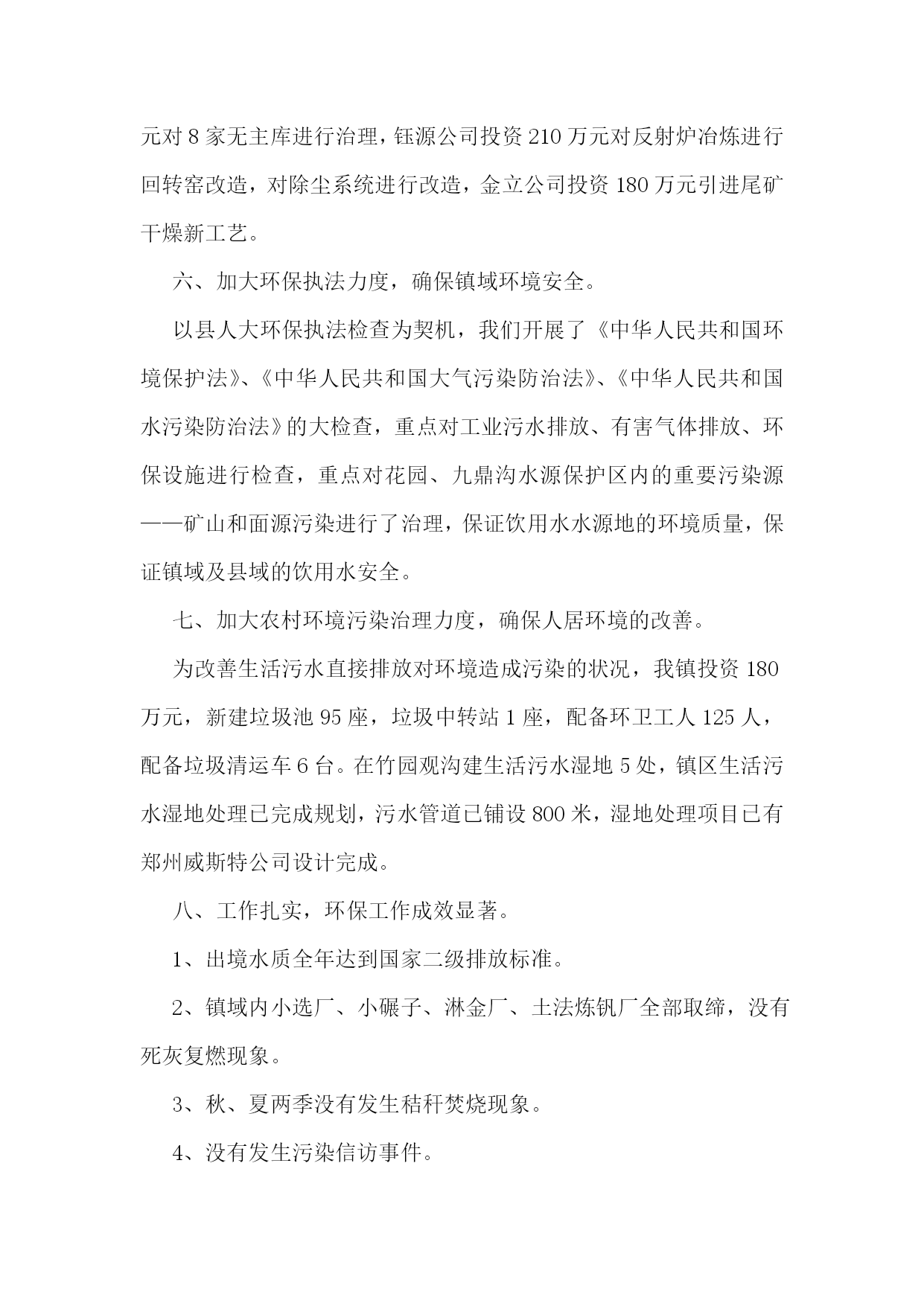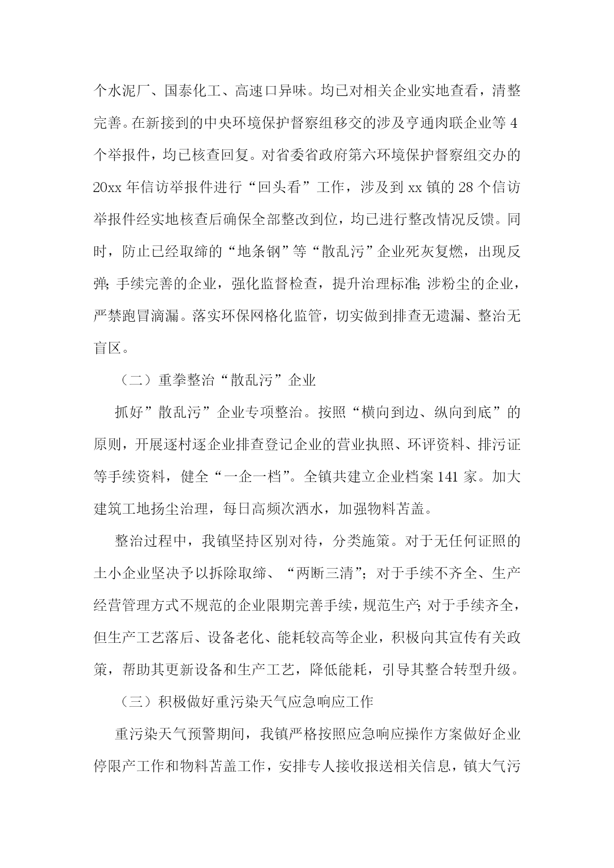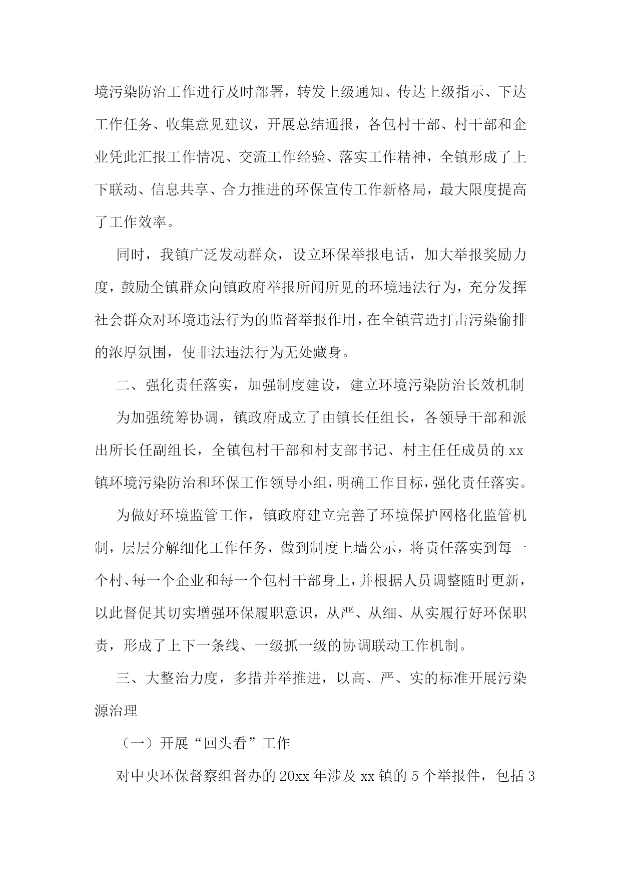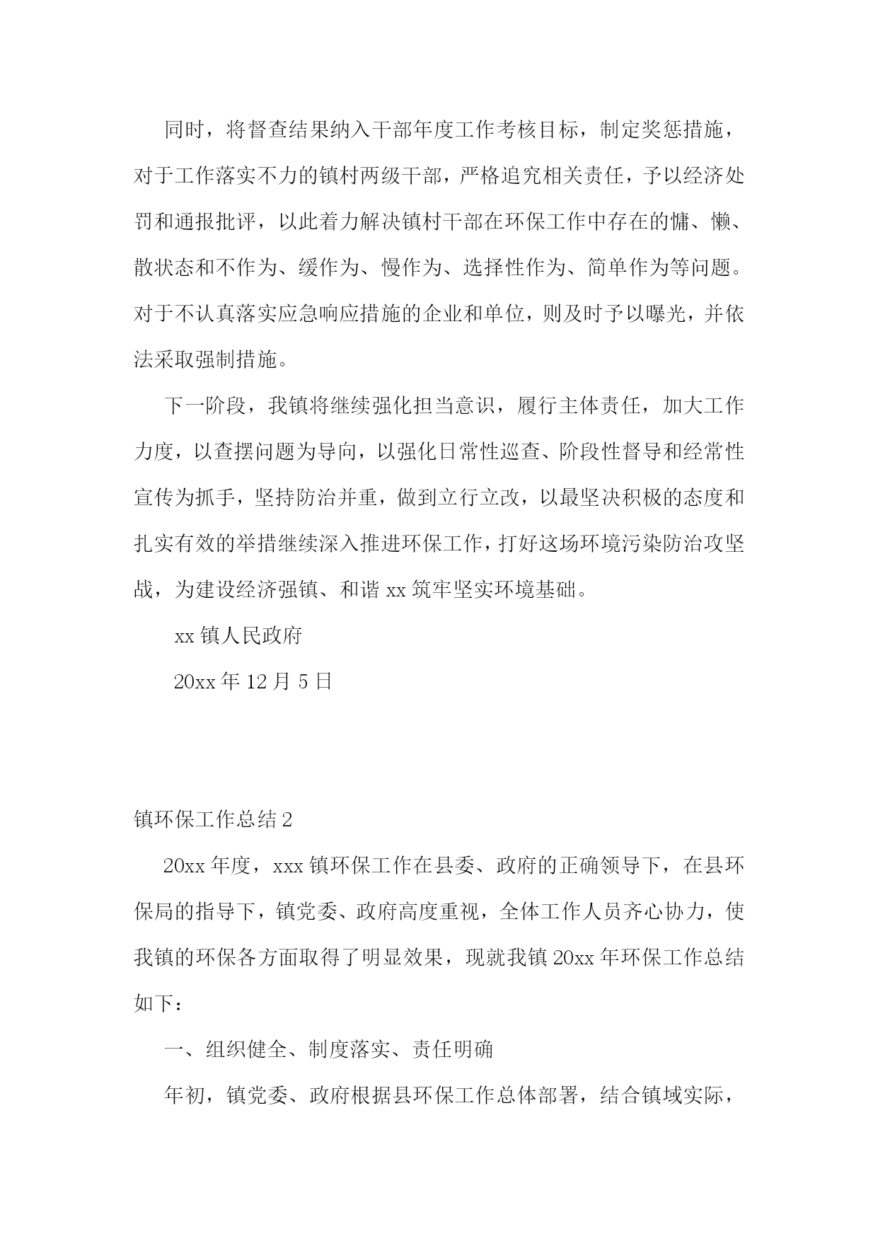 镇环保工作总结(10篇)镇环保工作总结120xx年,xx镇环保工作在区委、区政府的正确领导下,在区有关部门的指导下,镇党委、镇政府高度重视,周密部署,坚持问题导向,立足源头整治,以严格落实省市区有关环保工作精神要求为抓手,用真心、动真格、出真招,下大力气抓好抓实环境污染防治和环境保护工作,取得了可喜成绩,现就我镇20xx年环保工作总结如下:一、强化环保意识,落实主体责任,将环境污染防治作为全镇重点工作加以推进我镇党委、政府高度重视环境污染防治工作,切实落实环保“党政同责、一岗双责”制度。18年伊始,就决定将环保工作作为全镇重点性和常态化工作牢牢抓在手上。一年来,全镇每周都要至少召开2次党政班子会议和全镇干部会议,每月至少召开1次镇村两级干部大会,每季至少召开1次由全体镇村干部和企业法人参加的环保专题会议。会上,镇主要领导认真传达省市区关于环境污染防治工作的精通知要求,对环保工作作出系列安排,做到了及时传达上级新精神,讲明当前新形势,部署近期新任务,以此提高全镇干部和企业法人环保履职意识,明确环保工作目标,促使其切实增强做好环境污染防治工作的紧迫感和责任感。为加强信息互通,加快工作落实,镇政府建立了“xx镇环境卫生管理微信群”和“xx镇企业管理微信群”,将镇村两级干部60余人和全镇重点企业法人50余人纳入微信群。以此为载体,镇政府对环境污染防治工作进行及时部署,转发上级通知、传达上级指示、下达工作任务、收集意见建议,开展总结通报,各包村干部、村干部和企业凭此汇报工作情况、交流工作经验、落实工作精神,全镇形成了上下联动、信息共享、合力推进的环保宣传工作新格局,最大限度提高了工作效率。同时,我镇广泛发动群众,设立环保举报电话,加大举报奖励力度,鼓励全镇群众向镇政府举报所闻所见的环境违法行为,充分发挥社会群众对环境违法行为的监督举报作用,在全镇营造打击污染偷排的浓厚氛围,使非法违法行为无处藏身。二、强化责任落实,加强制度建设,建立环境污染防治长效机制为加强统筹协调,镇政府成立了由镇长任组长,各领导干部和派出所长任副组长,全镇包村干部和村支部书记、村主任任成员的xx镇环境污染防治和环保工作领导小组,明确工作目标,强化责任落实。为做好环境监管工作,镇政府建立完善了环境保护网格化监管机制,层层分解细化工作任务,做到制度上墙公示,将责任落实到每一个村、每一个企业和每一个包村干部身上,并根据人员调整随时更新,以此督促其切实增强环保履职意识,从严、从细、从实履行好环保职责,形成了上下一条线、一级抓一级的协调联动工作机制。三、大整治力度,多措并举推进,以高、严、实的标准开展污染源治理(一)开展“回头看”工作对中央环保督察组督办的20xx年涉及xx镇的5个举报件,包括3个水泥厂、国泰化工、高速口异味。均已对相关企业实地查看,清整完善。在新接到的中央环境保护督察组移交的涉及亨通肉联企业等4个举报件,均已核查回复。对省委省政府第六环境保护督察组交办的20xx年信访举报件进行“回头看”工作,涉及到xx镇的28个信访举报件经实地核查后确保全部整改到位,均已进行整改情况反馈。同时,防止已经取缔的“地条钢”等“散乱污”企业死灰复燃,出现反弹;手续完善的企业,强化监督检查,提升治理标准;涉粉尘的企业,严禁跑冒滴漏。落实环保网格化监管,切实做到排查无遗漏、整治无盲区。(二)重拳整治“散乱污”企业抓好”散乱污”企业专项整治。按照“横向到边、纵向到底”的原则,开展逐村逐企业排查登记企业的营业执照、环评资料、排污证等手续资料,健全“一企一档”。全镇共建立企业档案141家。加大建筑工地扬尘治理,每日高频次洒水,加强物料苫盖。整治过程中,我镇坚持区别对待,分类施策。对于无任何证照的土小企业坚决予以拆除取缔、“两断三清”;对于手续不齐全、生产经营管理方式不规范的企业限期完善手续,规范生产;对于手续齐全,但生产工艺落后、设备老化、能耗较高等企业,积极向其宣传有关政策,帮助其更新设备和生产工艺,降低能耗,引导其整合转型升级。(三)积极做好重污染天气应急响应工作重污染天气预警期间,我镇严格按照应急响应操作方案做好企业停限产工作和物料苫盖工作,安排专人接收报送相关信息,镇大气污染防治督导组及时对企业停限产情况、物料苫盖情况、禁烧情况、镇村干部驻厂情况进行昼夜督导,确保预警措施落到实处、取得实效。(四)扎实做好燃煤锅炉取缔工作一是加大摸排力度。18年我镇先后6次安排各村对辖区内燃煤锅炉进行核实排查,防止锅炉新增。二是做好后期监管。为已拆锅炉建立档案,做到了一炉一册,存档备查。同时,安排专人对已拆锅炉加大后期监管,不定期开展回头看,防止问题反弹。(五)全力做好辖区内禁烧工作为加大禁烧防控监管力度,镇政府建立了镇、村、村小组三级网格化监管责任体系,