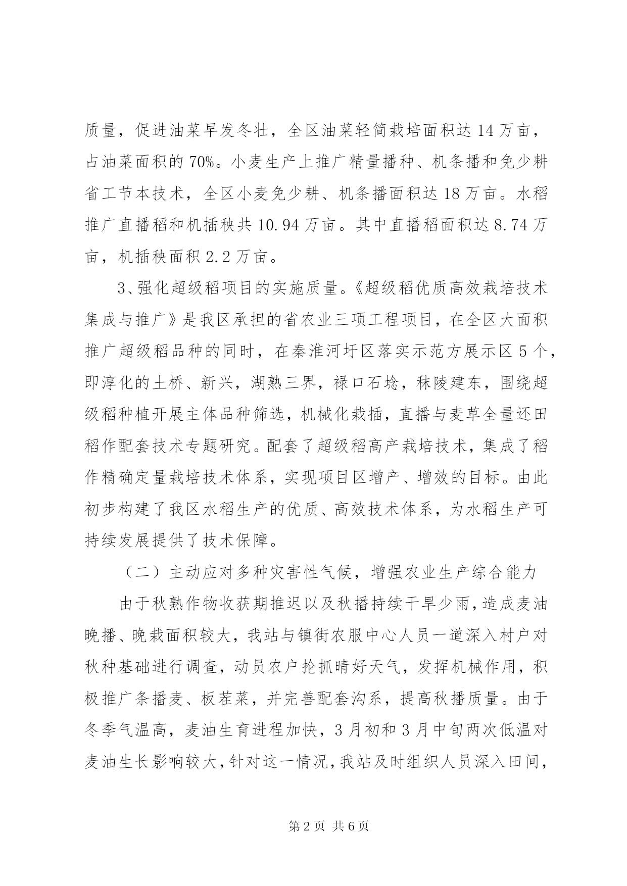 第PAGE\*Arabic\*MERGEFORMAT6页共NUMPAGES\*MERGEFORMAT6页农业技术推广站工作总结今年,农业生产是不平凡的一年。全区农作物遭受了干旱、冻害、洪涝、台风多种自然灾害和频繁病虫为害,特别是7月上旬连降暴雨,造成大面积农作物受灾,近万亩水稻绝收,我站紧扣“优质、高效、产业发展”主题,积极采取对策,落实各项有力措施,充分发挥农业科技作用,求真务实,扎实工作,实现稻、麦、油全面增产:油菜平均单产148.3公斤,较去年136.6公斤增11.7公斤;小麦平均单产312.7公斤,较去年293.6公斤增19.1公斤;水稻平均单产607公斤,较去年592.6公斤增14.4公斤。一、主要工作(一)突出新技术推广主线,确保粮油生产稳步发展1、强化农作物主体品种的推广应用。全区农作物以“优质、高产、多抗”和专用化为目标,强化主体品种的推广应用,提高农作物品质,推进产业的发展。油菜重点应用秦优7号、双低率100%;小麦以弱筋品种扬麦13为主体,搭配种植扬麦11,示范种植扬麦16;水稻以武粳15、武运粳7号、武2401和ⅱ优084为主体品种,重点示范超级稻南粳43。2、强化轻型栽培技术的推广应用。在油菜生产上,以直播油菜和板茬免耕移栽油菜为主,杂交稻茬采用直播油菜能充分利用温光资源、节工省本,晚粳茬口推广免少耕移栽,能提高移栽质量,促进油菜早发冬壮,全区油菜轻简栽培面积达14万亩,占油菜面积的70%。小麦生产上推广精量播种、机条播和免少耕省工节本技术,全区小麦免少耕、机条播面积达18万亩。水稻推广直播稻和机插秧共10.94万亩。其中直播稻面积达8.74万亩,机插秧面积2.2万亩。3、强化超级稻项目的实施质量。《超级稻优质高效栽培技术集成与推广》是我区承担的省农业三项工程项目,在全区大面积推广超级稻品种的同时,在秦淮河圩区落实示范方展示区5个,即淳化的土桥、新兴,湖熟三界,禄口石埝,秣陵建东,围绕超级稻种植开展主体品种筛选,机械化栽插,直播与麦草全量还田稻作配套技术专题研究。配套了超级稻高产栽培技术,集成了稻作精确定量栽培技术体系,实现项目区增产、增效的目标。由此初步构建了我区水稻生产的优质、高效技术体系,为水稻生产可持续发展提供了技术保障。(二)主动应对多种灾害性气候,增强农业生产综合能力由于秋熟作物收获期推迟以及秋播持续干旱少雨,造成麦油晚播、晚栽面积较大,我站与镇街农服中心人员一道深入村户对秋种基础进行调查,动员农户抡抓晴好天气,发挥机械作用,积极推广条播麦、板茬菜,并完善配套沟系,提高秋播质量。由于冬季气温高,麦油生育进程加快,3月初和3月中旬两次低温对麦油生长影响较大,针对这一情况,我站及时组织人员深入田间,拿出补救措施,利用媒体等多种形式,发动广大农户清沟、追施速效肥料,促进了麦油恢复性生长。7月上旬,雨量大、时间长,导致全区水稻受涝面积达12.3万亩,绝收面积达1.09万亩,面对突如其来的特大灾情,我们迅速在第一时间作出反应,冒雨深入重灾区察看水情,以最快的速度摸清全区受灾情况,为政府领导决策提供依据,并及时组织镇街技术人员到一线,指导农户抗灾。发动农户突击排除田间积水,施好恢复肥,抓好病虫防治等措施促恢复生长,对绝收田块及时改种。抗洪补种工作得到省厅、市局的高度肯定,并拔付救灾款物,对恢复生产、降低灾害损失起到了积极的作用。针对后期台风、暴雨导致部分水稻倒伏的实际,动员广大农户及时排除田间积水,对成熟水稻及时收割。(三)加快推进优质稻米建设步伐,着力提升区域产业化水平1、完善土桥核心方配套硬件建设。续建梯形硬质沟渠500米,机耕砂石路800米、农田水泥路1500米、放水小闸17座,过路涵15道,农田林网绿化植树1万多株。在抓好土桥稻米基地建设的同时,组织制订湖熟三界千亩核心方规划,完成主干道基础性工程建设和部分沟、涵、闸配套设施。2、做好无公害优质米技术应用,确保稻米质量。主要通过邀请省农科院、南农大、专家、教授讲课,举办培训班等形式宣传新品种、新技术,使无公害优质米建设成为共识,并积极做好万亩超级优质水稻规模生产基地建设,对100个面积在20亩以上种粮大户建立了田间生产档案,并实行ic卡管理。3、扩展订单生产,提升产业化水平。在不断加强龙头企业建设的同时,积极扩展订单生产,共落实稻米订单生产面积5万亩,订单数量2000万公斤,订单价格高于市场价6%。(四)扎实做好各项惠农政策的落实,充分调动农民种粮的积极性在落实粮食直补等各项惠农政策的工作中,我站人员克服多重困难,在做好面上工作的同时,又深入镇村对出现的问题及时处理,对群众来访和举报认真调查,耐心解释,化解矛盾,将工作做细、做实,保证了粮食直补等工作的顺利完成。一是确保农资综合补贴45.5万亩,1365万元,水稻直补38