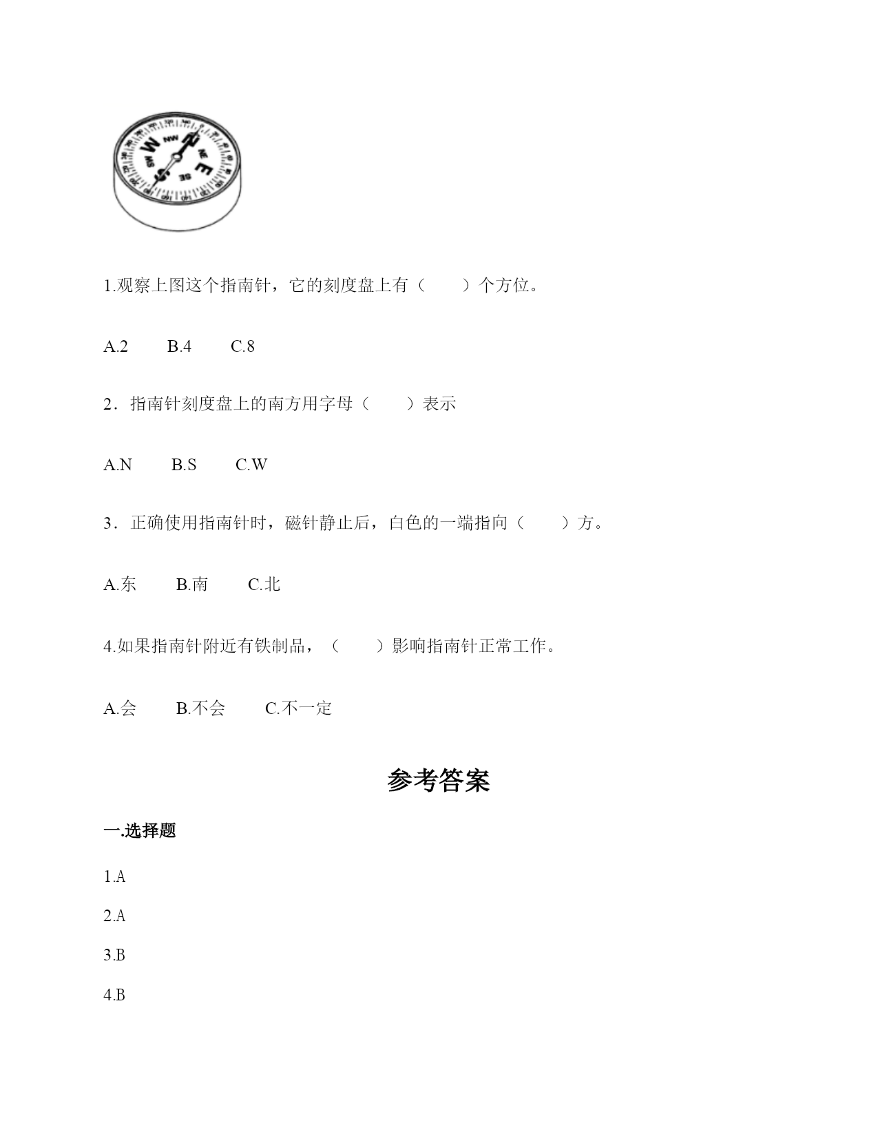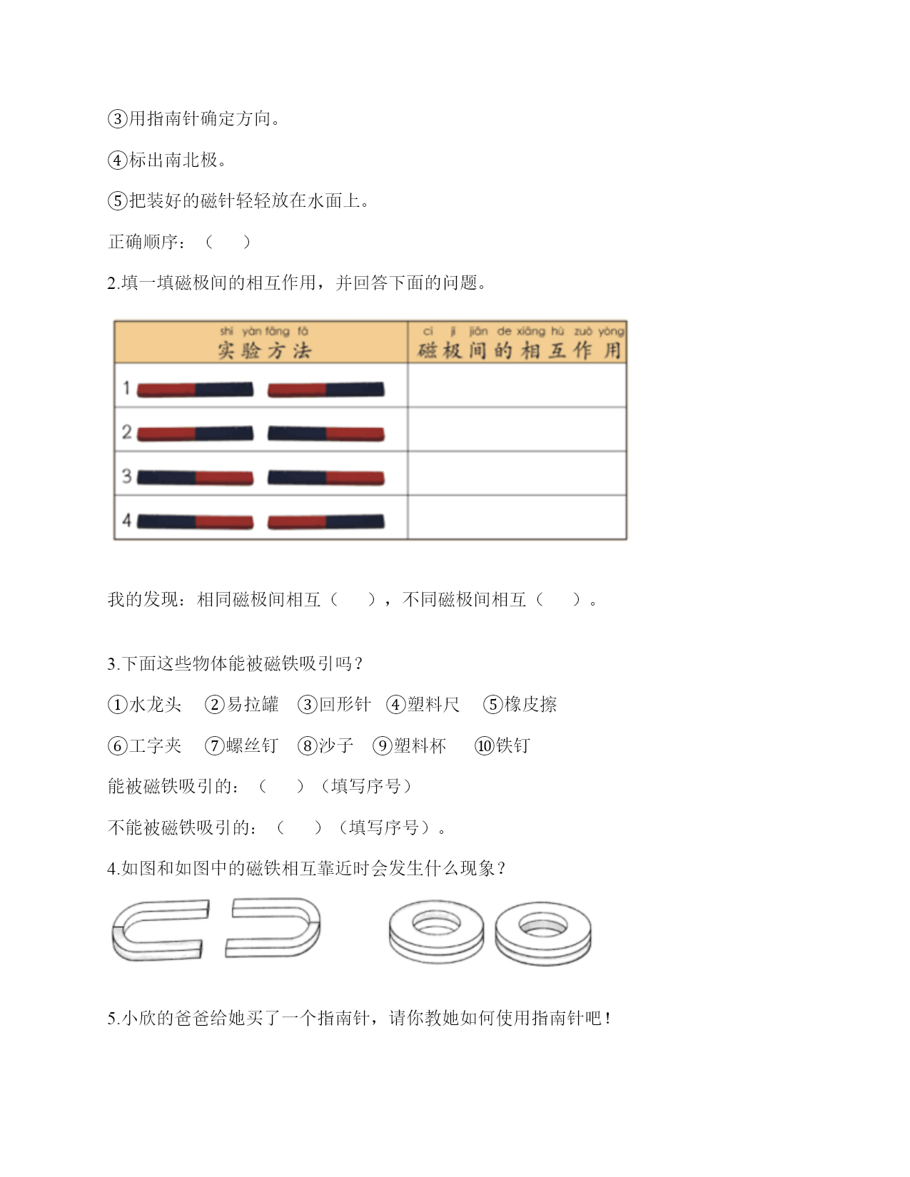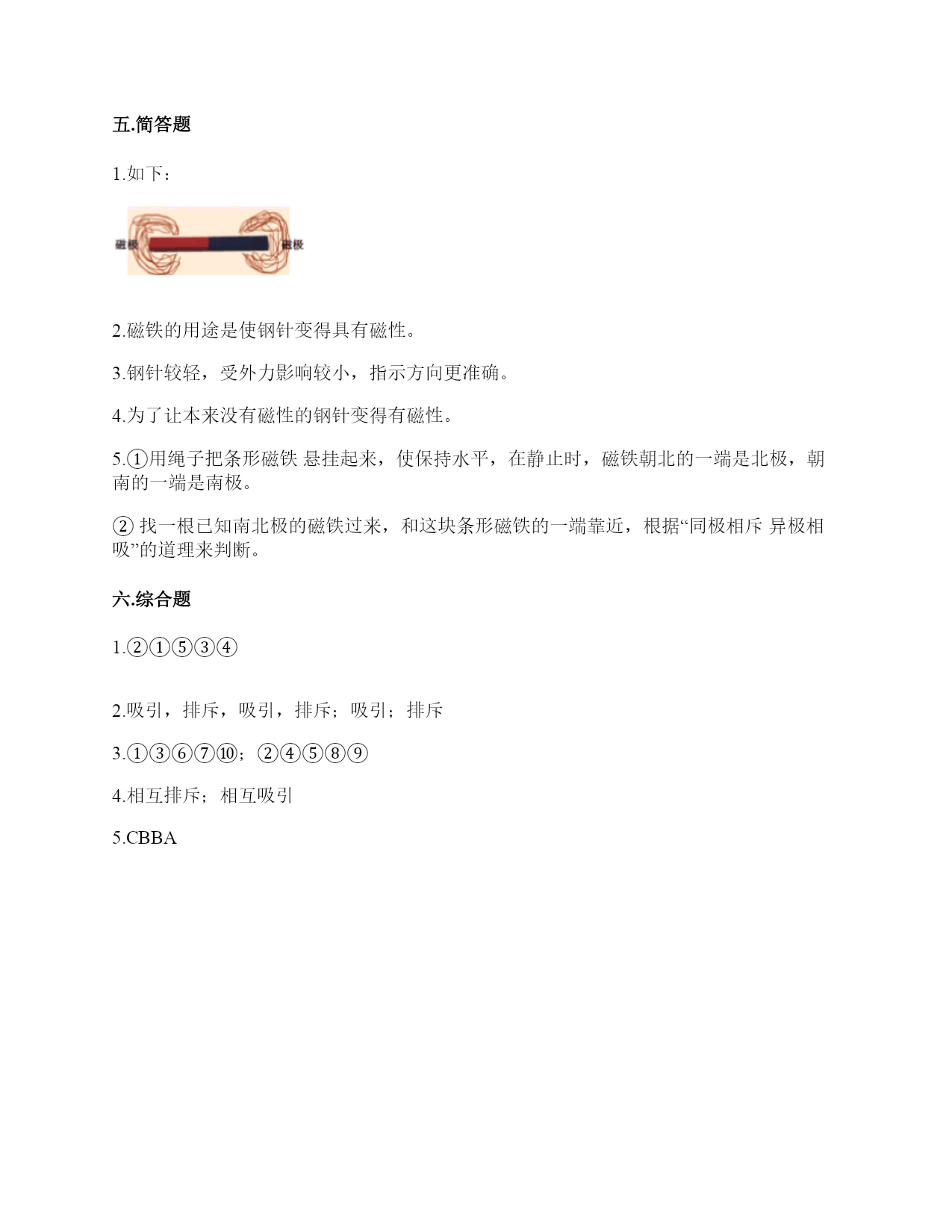 小学科学《磁铁》练习题一.选择题(共6题,共12分)1.天然磁铁又叫()。A.磁石B.岩石2.如图已知三个都是磁铁,A为N极,A和C相吸,C和F相斥,则E是()。A.N极B.S极C.无法判断3.为什么我们在实验过程中要重复同一组实验很多次?为什么我们要检测几种不同形状的磁铁?()A.老师的要求。B.得到更可靠的规律C.增加实验的趣味性4.下列物体中不能够被磁铁吸引的是()。A.铁钉B.白纸C.磁铁5.磁力黑板擦(如图)的发明,利用了()。A.磁铁能指示方向的特点B.磁极相互排斥的原理C.磁铁可以吸引铁的性质6.把一块条形磁铁悬挂在空中使它能自由转动等磁铁静止时我们发现——磁极的两端分别指向()。A.东、西B.东、南C.南、北D.东、北二.填空题(共6题,共26分)1.我国古代四大发明之一是应用磁铁可以指示方向的性质制成的,它是()。2.磁铁有两个磁极,用汉字表示分别是()和(),相应的字母表示分别是()和()。3.指南针由两部分构成,分别是()和()。4.磁悬浮列车是利用()悬浮起来的。5.磁悬浮列车的轨道上都装有特殊的磁铁,利用()的相互作用,列车就悬浮在轨道上了。6.一个能自由转动的磁铁,静止时一端指向南方,一端指向北方,我们把指南的一方叫()极,用字母()表示;指北的一方叫()极,用字母()表示。三.判断题(共6题,共14分)1.将两块磁铁的磁极相互靠近,它们之间的相互作用有两种情况。()2.钢针也是一种磁铁,可以吸引其他钢针。()3.摔断的磁铁就不再具有磁极了。()4.磁铁只能够吸引铁质的东西,其他的都不能吸引。()5.将安装好的磁针3次轻轻放入水盘中间,使磁针慢慢转动,我们发现静止后磁针针尖和针尾的指向每次都不一样。()6.我们可以用“悬挂法”给蹄形磁铁(环形磁铁)进行指示方向的实验。()四.连线题(共1题,共4分)1.把下列事物和应用磁铁的原理用线连起来。五.简答题(共5题,共25分)1.铁粉在条形磁铁上是怎样分布的?画一画,并标出磁极。2.在制作水浮式指南针时,我们会用到一块磁铁,请问磁铁的用途是什么?3.制作水浮式指南针时,我们用被磁化的钢针指示南北的。我们是因为钢针具有怎样的特点才选择它的?4.在制作水浮式指南针时,为什么要用磁铁摩擦钢针?5.怎样判断一块没有标明磁极的条形磁铁的南北极?六.综合题(共5题,共29分)1.请将制作指南针的步骤按正确的顺序进行排序。①把磁针固定在吹塑纸上。②把磁针磁化。③用指南针确定方向。④标出南北极。⑤把装好的磁针轻轻放在水面上。正确顺序:()2.填一填磁极间的相互作用,并回答下面的问题。我的发现:相同磁极间相互(),不同磁极间相互()。3.下面这些物体能被磁铁吸引吗?①水龙头②易拉罐③回形针④塑料尺⑤橡皮擦⑥工字夹⑦螺丝钉⑧沙子⑨塑料杯⑩铁钉能被磁铁吸引的:()(填写序号)不能被磁铁吸引的:()(填写序号)。4.如图和如图中的磁铁相互靠近时会发生什么现象?5.小欣的爸爸给她买了一个指南针,请你教她如何使用指南针吧!1.观察上图这个指南针,它的刻度盘上有()个方位。A.2B.4C.82.指南针刻度盘上的南方用字母()表示A.NB.SC.W3.正确使用指南针时,磁针静止后,白色的一端指向()方。A.东B.南C.北4.如果指南针附近有铁制品,()影响指南针正常工作。A.会B.不会C.不一定参考答案一.选择题1.A2.A3.B4.B5.C6.C二.填空题1.指南针2.南极;北极;S;N3.磁针;刻度盘4.相同磁极相互排斥的磁力5.磁极6.南;S;北;N三.判断题1.×2.×3.×4.×5.×6.√四.连线题1.如下:五.简答题1.如下:2.磁铁的用途是使钢针变得具有磁性。3.钢针较轻,受外力影响较小,指示方向更准确。4.为了让本来没有磁性的钢针变得有磁性。5.①用绳子把条形磁铁悬挂起来,使保持水平,在静止时,磁铁朝北的一端是北极,朝南的一端是南极。②找一根已知南北极的磁铁过来,和这块条形磁铁的一端靠近,根据“同极相斥异极相吸”的道理来判断。六.综合题1.②①⑤③④2.吸引,排斥,吸引,排斥;吸引;排斥3.①③⑥⑦⑩;②④⑤⑧⑨4.相互排斥;相互吸引5.CBBA