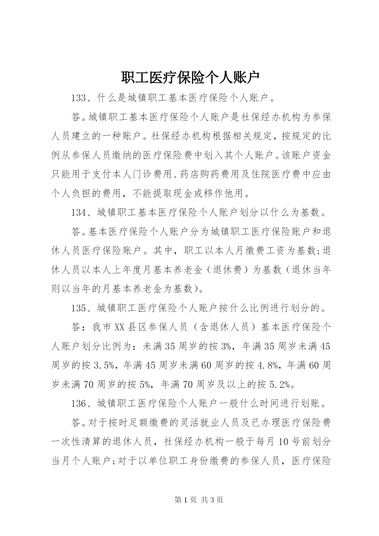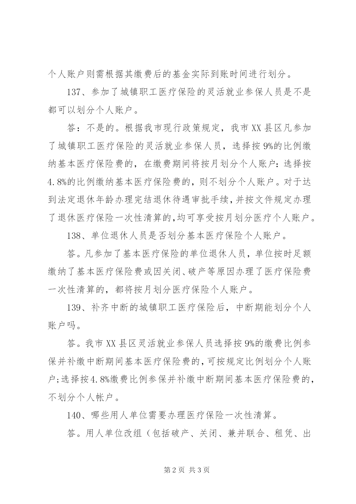 第PAGE\*Arabic\*MERGEFORMAT3页共NUMPAGES\*MERGEFORMAT3页职工医疗保险个人账户133、什么是城镇职工基本医疗保险个人账户。答。城镇职工基本医疗保险个人账户是社保经办机构为参保人员建立的一种账户。社保经办机构根据相关规定,按规定的比例从参保人员缴纳的医疗保险费中划入其个人账户。该账户资金只能用于支付本人门诊费用、药店购药费用及住院医疗费中应由个人负担的费用,不能提取现金或移作他用。134、城镇职工基本医疗保险个人账户划分以什么为基数。答。基本医疗保险个人账户分为城镇职工医疗保险账户和退休人员医疗保险账户。其中,职工以本人月缴费工资为基数;退休人员以本人上年度月基本养老金(退休费)为基数(退休当年则以当年的月基本养老金为基数)。135、城镇职工医疗保险个人账户按什么比例进行划分的。答:我市XX县区参保人员(含退休人员)基本医疗保险个人账户划分比例为:未满35周岁的按3%,年满35周岁未满45周岁的按3.5%,年满45周岁未满60周岁的按4.8%,年满60周岁未满70周岁的按5%,年满70周岁及以上的按5.2%。136、城镇职工医疗保险个人账户一般什么时间进行划账。答。对于按时足额缴费的灵活就业人员及已办理医疗保险费一次性清算的退休人员,社保经办机构一般于每月10号前划分当月个人账户;对于以单位职工身份缴费的参保人员,医疗保险个人账户则需根据其缴费后的基金实际到账时间进行划分。137、参加了城镇职工医疗保险的灵活就业参保人员是不是都可以划分个人账户。答:不是的。根据我市现行政策规定,我市XX县区凡参加了城镇职工医疗保险的灵活就业参保人员,选择按9%的比例缴纳基本医疗保险费的,在缴费期间将按月划分个人账户:选择按4.8%的比例缴纳基本医疗保险费的,则不划分个人账户。对于达到法定退休年龄办理完结退休待遇审批手续,并按文件规定办理了退休医疗保险一次性清算的,均可享受按月划分医疗个人账户。138、单位退休人员是否划分基本医疗保险个人账户。答。凡参加了基本医疗保险的单位退休人员,单位按时足额缴纳了基本医疗保险费或因关闭、破产等原因办理了医疗保险费一次性清算的,都将按月划分医疗保险个人账户。139、补齐中断的城镇职工医疗保险后,中断期能划分个人账户吗。答。我市XX县区灵活就业参保人员选择按9%的缴费比例参保并补缴中断期间基本医疗保险费的,可按规定比例划分个人账户;选择按4.8%缴费比例参保并补缴中断期间基本医疗保险费的,不划分个人帐户。140、哪些用人单位需要办理医疗保险一次性清算。答。用人单位改组(包括破产、关闭、兼并联合、租凭、出售和进行公司改制等)时,以及各类参保单位在社保经办机构办理单位注销手续前,都应先清偿退休人员10年的医疗保险费和大额医疗保险费。141、已办理医保一次性清算的参保退休人员,未享受退休医保待遇而死亡的,其清算的医疗保险费能否返还。答。一次性清算或补足医疗保险费的参保退休人员,在住院等待期内未享受统筹基金支付待遇死亡的,或参保人员预缴医疗保险费后死亡的,医疗保险经办机构在扣减其个人帐户(因为个人账户资金已属于当事人)后,退还剩余的因清算、补足或预缴的医疗保险费。142、医疗保险个人账户一次性注入的项目包括哪些。答:我市XX县区医疗保险个人账户一次性注入包括:国家公务员补助医疗保险个人账户、城镇职工补充医疗保险个人账户及政策性规定特殊参保人员补充医疗保险个人账户。[职工医疗保险个人账户]