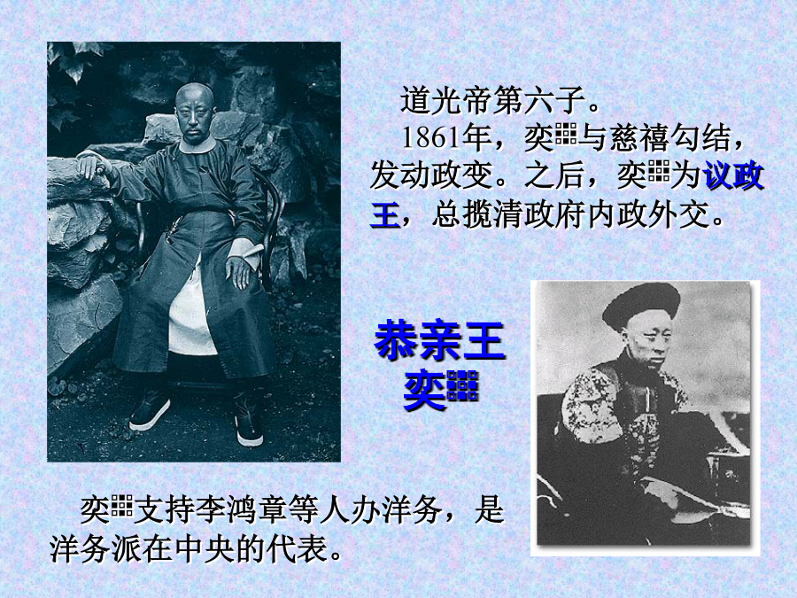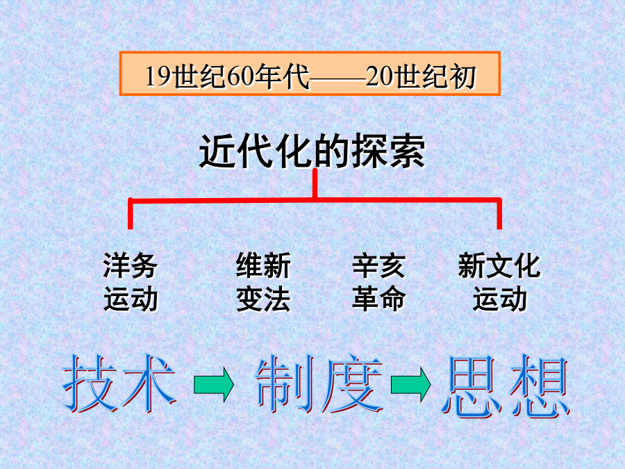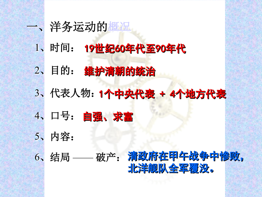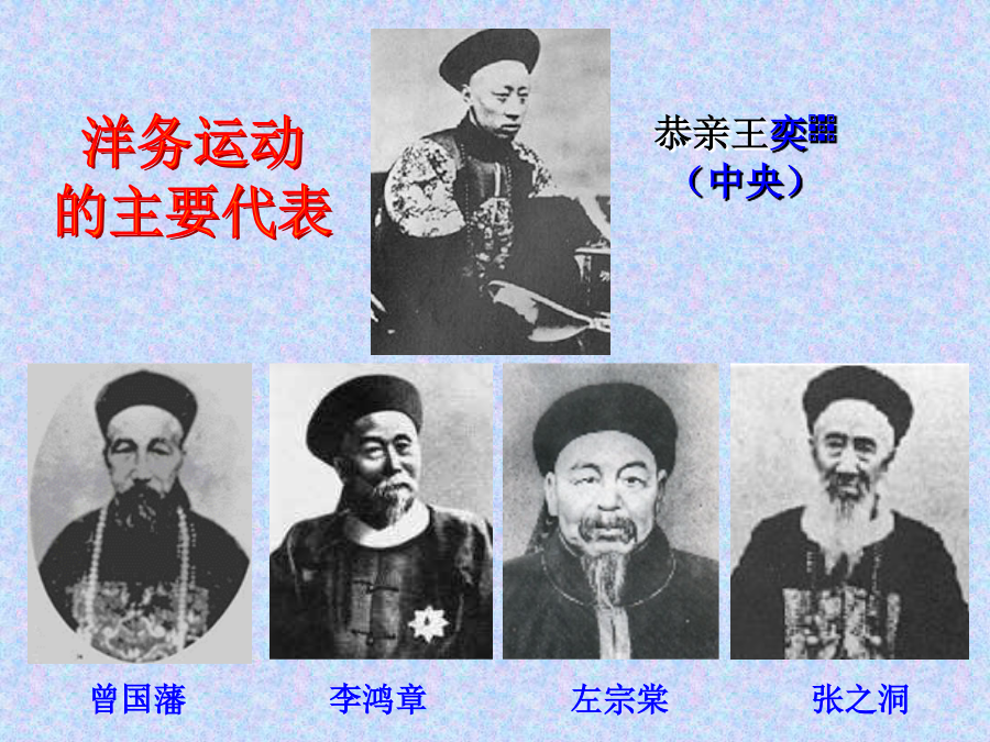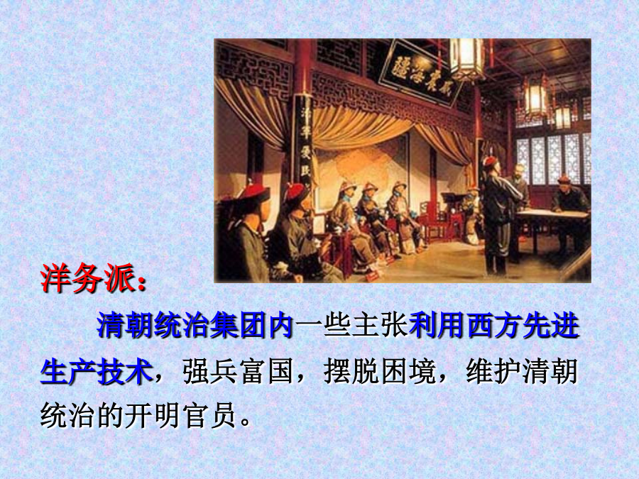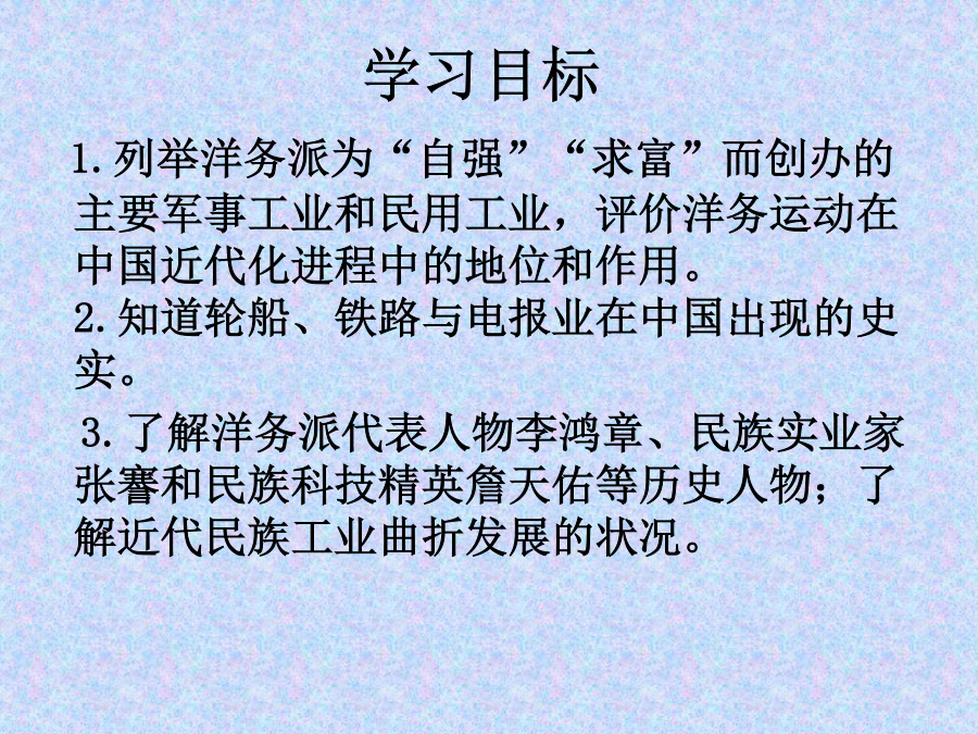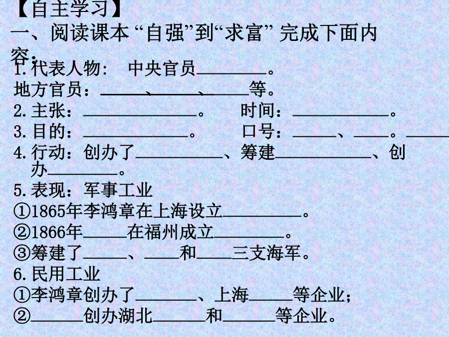 第二单元近代化的艰难起步所谓近代化,即是中国人民向西方学习,寻求新的出路的过程。近代化的探索学习目标【自主学习】一、阅读课本“自强”到“求富”完成下面内容:洋务运动洋务派:清朝统治集团内一些主张利用西方先进生产技术,强兵富国,摆脱困境,维护清朝统治的开明官员。一、洋务运动的概况曾国藩恭亲王奕创办军事工业时间江南制造总局仿制的毛瑟枪总局内生产大炮的厂房江南制造总局企业名称:江南制造总局创办者:曾国藩、李鸿章地点:上海产品:火枪、炮弹等武器企业性质:军事工业资金来源:清政府调拨生产方式:机器生产技术及工匠来源:引进外国技术,聘请外国工匠管理方式:封建衙门式管理评价:洋务派开办的最大的近代军事工业。但经营方式不科学,工人积极性不高,产品质量也得不到保证。北洋海军北洋舰队培养人才时间二、评价洋务运动三、轮船、铁路与电报业的出现阅读课本第32—33页第三、四目内容四、状元实业家五、詹天佑与京张铁路内忧外患两考验,统治阶级忙自救。师夷长技三十年,自强求富办洋务。奕曾李与左张,工业海军和学堂。甲午一战三军败,国未能富兵未强。开辟中国近代化,探索之路艰又长。课后思考题创办军事工业和民用工业听听李鸿章在甲午战争后说的一番话,思考:1、为什么李鸿章说练兵、办海军都是“纸糊的老虎”?2、李鸿章把自己比作一个裱糊、修补破房子的裱糊匠,那这所破房子指的是什么?3、由李鸿章的话中,你能分析出洋务运动的局限性是什么吗?