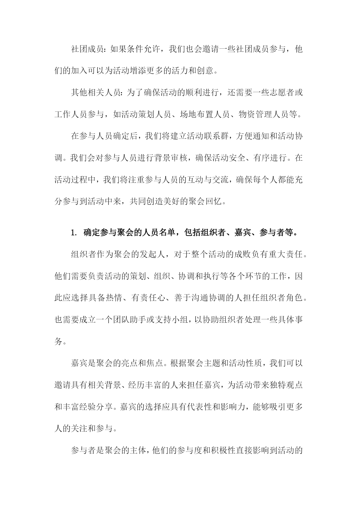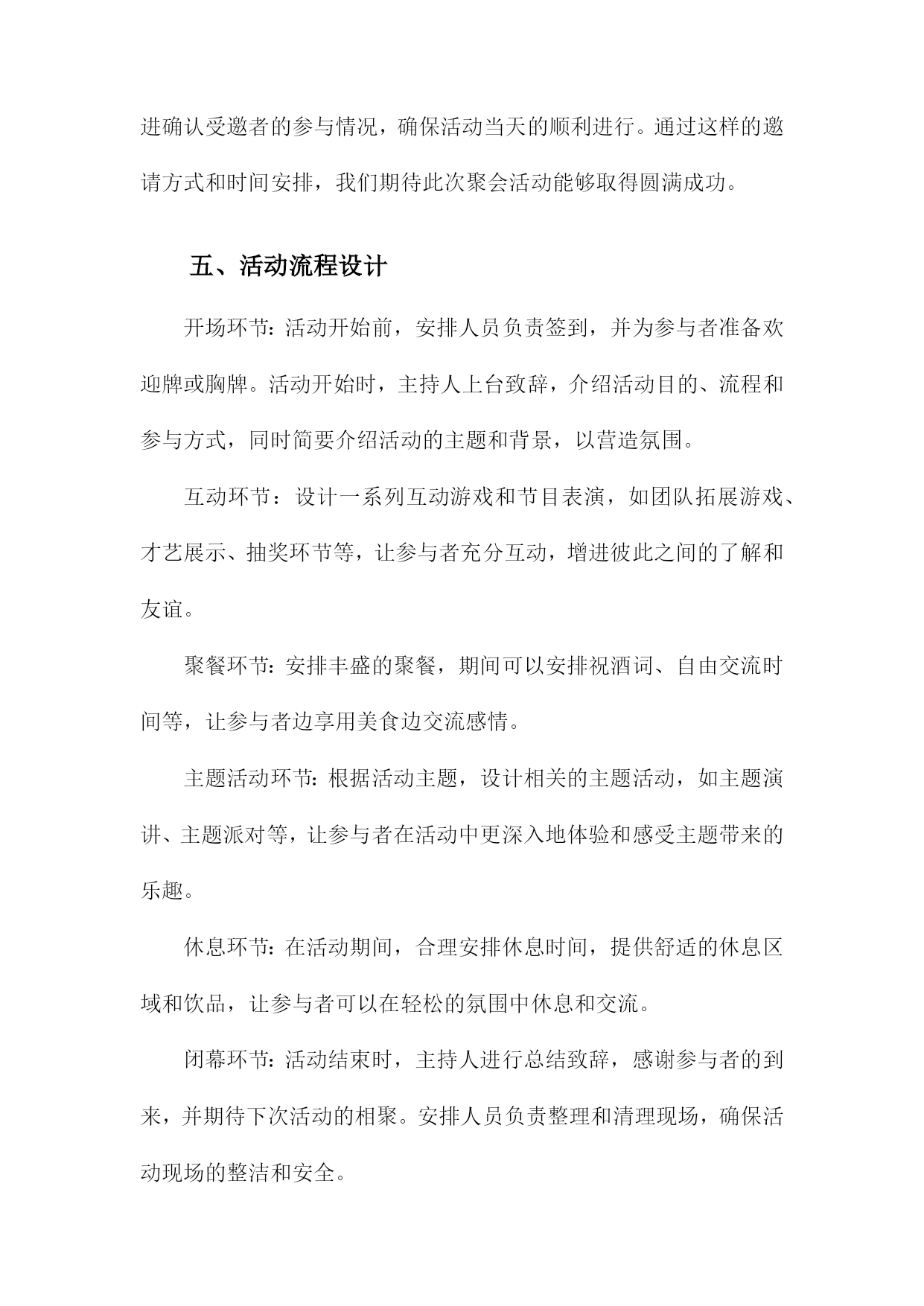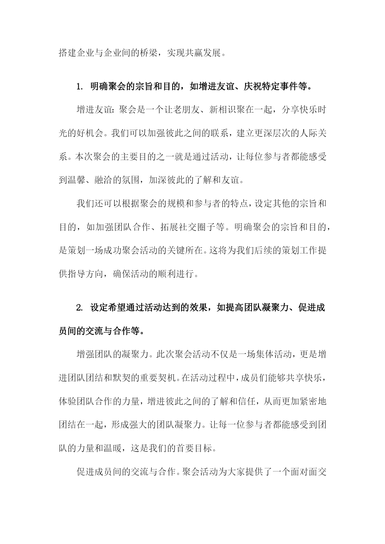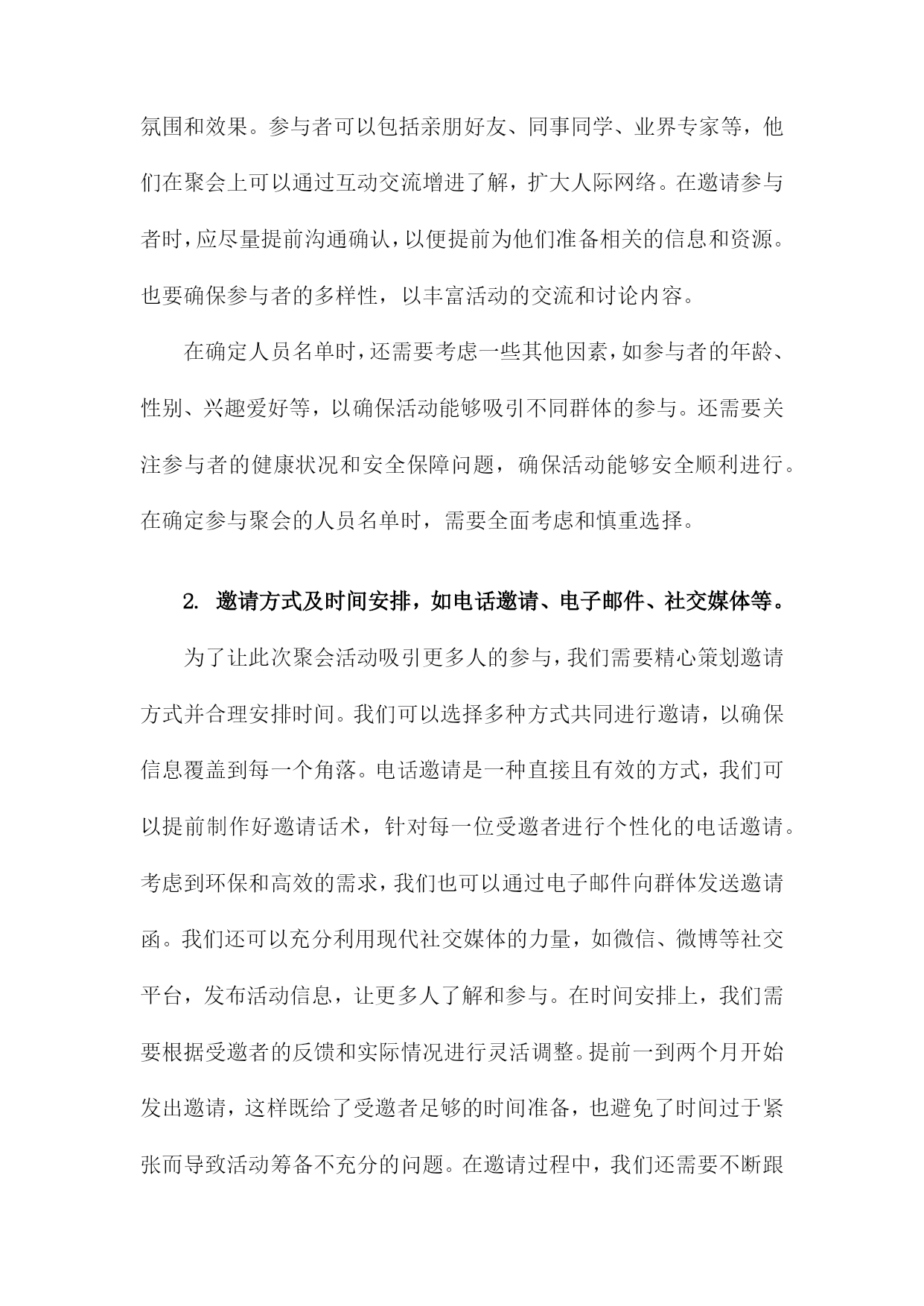 聚会活动策划方案一、内容概要本聚会活动策划方案旨在举办一场盛大且充满欢乐的聚会活动,通过细致的筹备与安排,确保活动的顺利进行和圆满成功。活动内容丰富多样,包括主题设定、活动地点选择、时间安排、嘉宾邀请、节目安排、餐饮安排等方面。本方案旨在营造一个轻松愉悦的氛围,增进参与者之间的友谊与联系,共同度过美好的时光。通过此次活动,我们期望能够达成加强团结合作、共享欢乐成果的目的。二、活动目标增强集体凝聚力:通过此次聚会活动,强化团队成员之间的归属感和团队凝聚力,构建良好的团队合作氛围。拓展人脉资源:为大家提供一个认识新朋友、拓展社交圈的机会,以拓展未来可能合作和共同发展的机会。交流经验与资源:促进参与者之间互相交流,分享个人的工作经验、资源和行业动态,相互学习成长。提升情感联络:在轻松愉快的活动过程中增进友谊,强化人与人之间的情感纽带,促进未来的交流与合作。促进业务发展:借助聚会活动的机会,进行品牌推广和业务拓展,搭建企业与企业间的桥梁,实现共赢发展。1.明确聚会的宗旨和目的,如增进友谊、庆祝特定事件等。增进友谊:聚会是一个让老朋友、新相识聚在一起,分享快乐时光的好机会。我们可以加强彼此之间的联系,建立更深层次的人际关系。本次聚会的主要目的之一就是通过活动,让每位参与者都能感受到温馨、融洽的氛围,加深彼此的了解和友谊。我们还可以根据聚会的规模和参与者的特点,设定其他的宗旨和目的,如加强团队合作、拓展社交圈子等。明确聚会的宗旨和目的,是策划一场成功聚会活动的关键所在。这将为我们后续的策划工作提供指导方向,确保活动的顺利进行。2.设定希望通过活动达到的效果,如提高团队凝聚力、促进成员间的交流与合作等。增强团队的凝聚力。此次聚会活动不仅是一场集体活动,更是增进团队团结和默契的重要契机。在活动过程中,成员们能够共享快乐,体验团队合作的力量,增进彼此之间的了解和信任,从而更加紧密地团结在一起,形成强大的团队凝聚力。让每一位参与者都能感受到团队的力量和温暖,这是我们的首要目标。促进成员间的交流与合作。聚会活动为大家提供了一个面对面交流的平台,让成员们有机会在非工作场合下相互了解、交流思想、分享经验。通过活动中的互动环节,可以增进彼此的了解和友谊,拓宽交流渠道,提升合作能力。我们希望借助此次活动,激发成员间的创新思维和合作精神,为未来的工作和发展打下坚实基础。营造轻松愉悦的氛围。在紧张的工作之余,通过举办聚会活动让大家放松心情,以更好的状态投入到工作中去。活动旨在营造一种轻松愉悦的氛围,让每位参与者都能感受到温馨与快乐,从而增强团队的士气和活力。本次聚会活动的目标是多方面的,旨在通过活动增进团队凝聚力、促进成员间的交流与合作、营造轻松愉悦的氛围以及提升个人与团队的综合素质。我们将全力以赴,确保活动的顺利进行,让每位参与者都能收获满满的快乐和成果。三、活动时间与地点为了确保活动的顺利进行,我们将对场地进行合理安排,保证各个活动环节的顺畅进行。我们还将考虑到天气因素,以应对可能出现的天气变化。活动具体时间和地点的选择将充分考虑参与者的意见和实际情况,确保活动的成功举行。1.确定具体的活动时间,考虑到参与者的日程安排和节假日因素。确定具体的活动时间至关重要。在考虑活动日期时,我们需充分考虑到参与者的日程安排和节假日因素。考虑到大多数人的时间分配与日程安排,我们应选择一个大多数人都可参与的周末或者法定节假日进行活动。这样能够确保更多的参与者能够腾出时间参加聚会,同时也不会影响他们的正常工作或学习。在确定具体活动时间时,可以通过调查问卷或者在线投票等方式收集参与者的意见,从而找到一个大部分人都能接受的合适时间。还需提前进行场地预定,确保活动地点的顺利使用。在活动时间的安排上,我们应确保既有充足的自由活动时间供大家交流互动,又有必要的组织活动环节来保持聚会的节奏感。参与者在享受轻松愉快氛围的也能充分感受到活动的组织与安排的专业性。还需做好充分的准备工作。包括场地布置、餐饮安排、交通接送等事项都需要提前规划和准备。在活动前一周,成立活动筹备小组,确保活动的顺利进行。还需制定详细的活动流程表,明确各个环节的时间安排和责任人,确保活动按照计划顺利进行。在确定好活动时间后,我们将开始规划活动内容。考虑到参与者的兴趣和特点,我们将设计一系列丰富多彩的活动项目,如团队建设游戏、自由交流环节等。在活动内容的安排上,我们将充分考虑活动的互动性和趣味性,让每一位参与者都能在活动中找到自己的位置,享受到聚会的乐趣。我们还会设置一些团队竞赛环节,通过竞争激发大家的参与热情,加强团队合作和凝聚力。在活动过程中,我们会设置专门的拍照环节和纪念品赠送环节,为参与者留下美好的回忆。我们也会充分考虑活动的安全性和舒适性因素,确保每一位参与者都能在