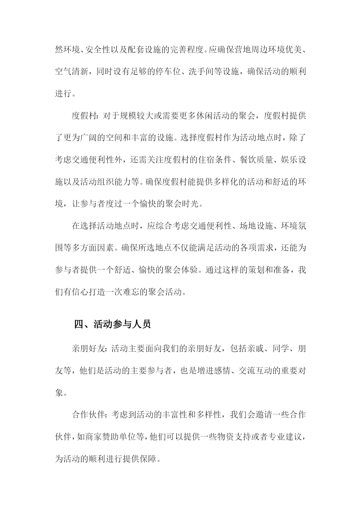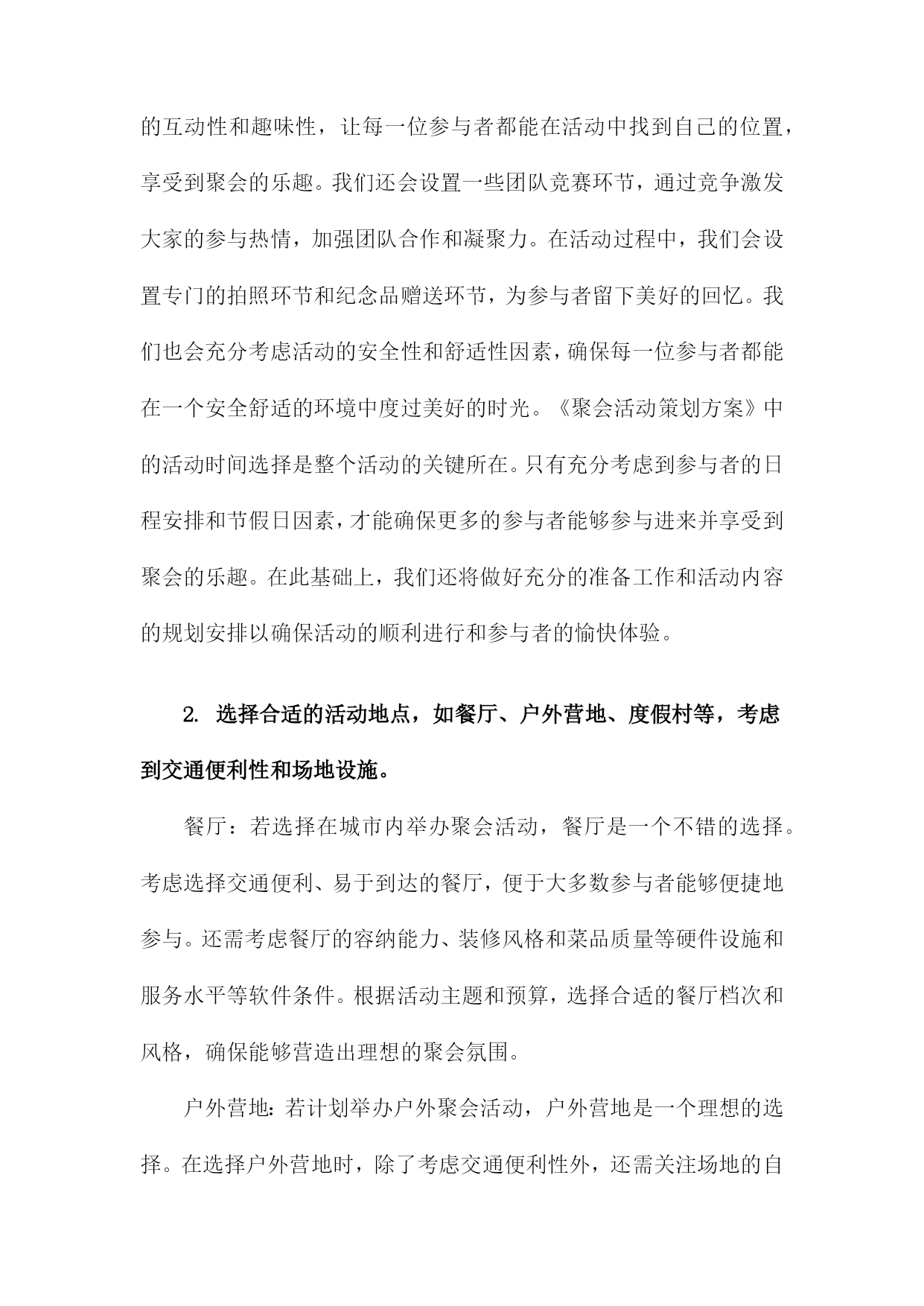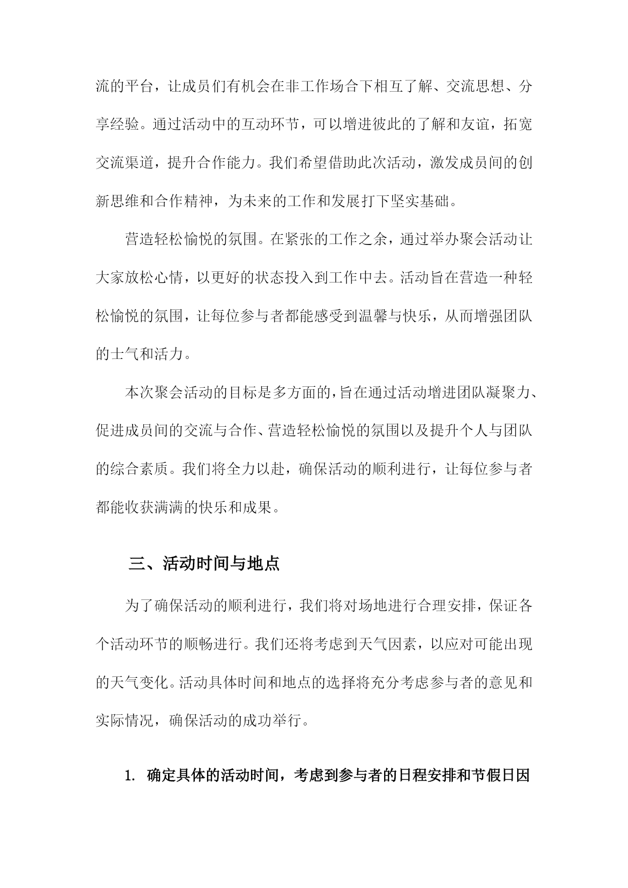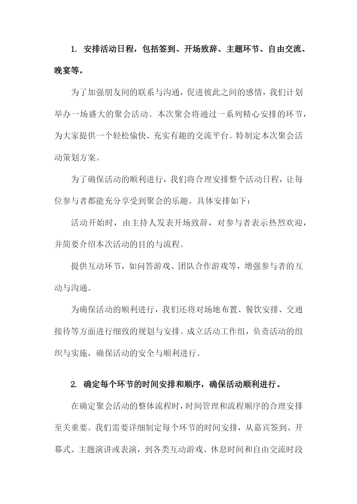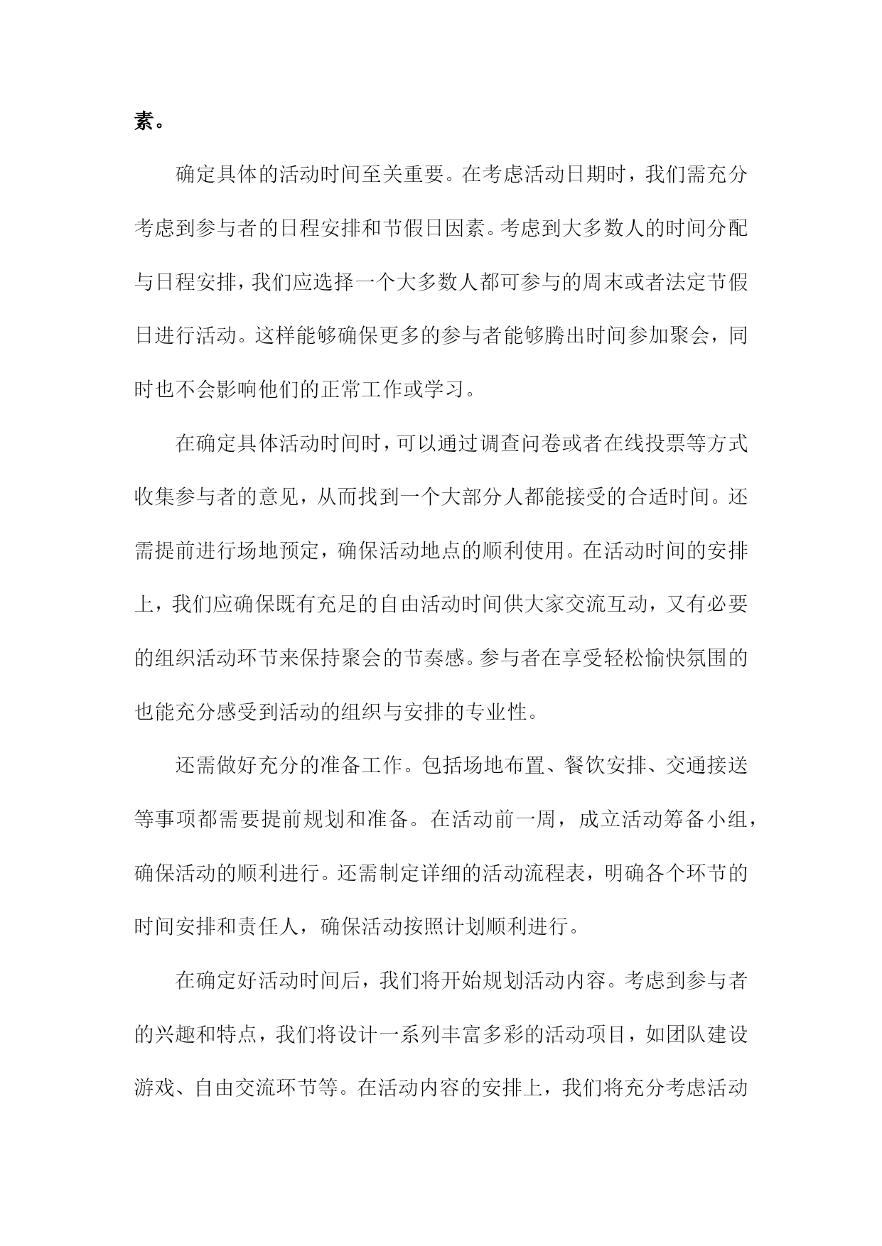 聚会活动策划方案一、内容概要本聚会活动策划方案旨在举办一场盛大且充满欢乐的聚会活动,通过细致的筹备与安排,确保活动的顺利进行和圆满成功。活动内容丰富多样,包括主题设定、活动地点选择、时间安排、嘉宾邀请、节目安排、餐饮安排等方面。本方案旨在营造一个轻松愉悦的氛围,增进参与者之间的友谊与联系,共同度过美好的时光。通过此次活动,我们期望能够达成加强团结合作、共享欢乐成果的目的。二、活动目标增强集体凝聚力:通过此次聚会活动,强化团队成员之间的归属感和团队凝聚力,构建良好的团队合作氛围。拓展人脉资源:为大家提供一个认识新朋友、拓展社交圈的机会,以拓展未来可能合作和共同发展的机会。交流经验与资源:促进参与者之间互相交流,分享个人的工作经验、资源和行业动态,相互学习成长。提升情感联络:在轻松愉快的活动过程中增进友谊,强化人与人之间的情感纽带,促进未来的交流与合作。促进业务发展:借助聚会活动的机会,进行品牌推广和业务拓展,搭建企业与企业间的桥梁,实现共赢发展。1.明确聚会的宗旨和目的,如增进友谊、庆祝特定事件等。增进友谊:聚会是一个让老朋友、新相识聚在一起,分享快乐时光的好机会。我们可以加强彼此之间的联系,建立更深层次的人际关系。本次聚会的主要目的之一就是通过活动,让每位参与者都能感受到温馨、融洽的氛围,加深彼此的了解和友谊。我们还可以根据聚会的规模和参与者的特点,设定其他的宗旨和目的,如加强团队合作、拓展社交圈子等。明确聚会的宗旨和目的,是策划一场成功聚会活动的关键所在。这将为我们后续的策划工作提供指导方向,确保活动的顺利进行。2.设定希望通过活动达到的效果,如提高团队凝聚力、促进成员间的交流与合作等。增强团队的凝聚力。此次聚会活动不仅是一场集体活动,更是增进团队团结和默契的重要契机。在活动过程中,成员们能够共享快乐,体验团队合作的力量,增进彼此之间的了解和信任,从而更加紧密地团结在一起,形成强大的团队凝聚力。让每一位参与者都能感受到团队的力量和温暖,这是我们的首要目标。促进成员间的交流与合作。聚会活动为大家提供了一个面对面交流的平台,让成员们有机会在非工作场合下相互了解、交流思想、分享经验。通过活动中的互动环节,可以增进彼此的了解和友谊,拓宽交流渠道,提升合作能力。我们希望借助此次活动,激发成员间的创新思维和合作精神,为未来的工作和发展打下坚实基础。营造轻松愉悦的氛围。在紧张的工作之余,通过举办聚会活动让大家放松心情,以更好的状态投入到工作中去。活动旨在营造一种轻松愉悦的氛围,让每位参与者都能感受到温馨与快乐,从而增强团队的士气和活力。本次聚会活动的目标是多方面的,旨在通过活动增进团队凝聚力、促进成员间的交流与合作、营造轻松愉悦的氛围以及提升个人与团队的综合素质。我们将全力以赴,确保活动的顺利进行,让每位参与者都能收获满满的快乐和成果。三、活动时间与地点为了确保活动的顺利进行,我们将对场地进行合理安排,保证各个活动环节的顺畅进行。我们还将考虑到天气因素,以应对可能出现的天气变化。活动具体时间和地点的选择将充分考虑参与者的意见和实际情况,确保活动的成功举行。1.确定具体的活动时间,考虑到参与者的日程安排和节假日因素。确定具体的活动时间至关重要。在考虑活动日期时,我们需充分考虑到参与者的日程安排和节假日因素。考虑到大多数人的时间分配与日程安排,我们应选择一个大多数人都可参与的周末或者法定节假日进行活动。这样能够确保更多的参与者能够腾出时间参加聚会,同时也不会影响他们的正常工作或学习。在确定具体活动时间时,可以通过调查问卷或者在线投票等方式收集参与者的意见,从而找到一个大部分人都能接受的合适时间。还需提前进行场地预定,确保活动地点的顺利使用。在活动时间的安排上,我们应确保既有充足的自由活动时间供大家交流互动,又有必要的组织活动环节来保持聚会的节奏感。参与者在享受轻松愉快氛围的也能充分感受到活动的组织与安排的专业性。还需做好充分的准备工作。包括场地布置、餐饮安排、交通接送等事项都需要提前规划和准备。在活动前一周,成立活动筹备小组,确保活动的顺利进行。还需制定详细的活动流程表,明确各个环节的时间安排和责任人,确保活动按照计划顺利进行。在确定好活动时间后,我们将开始规划活动内容。考虑到参与者的兴趣和特点,我们将设计一系列丰富多彩的活动项目,如团队建设游戏、自由交流环节等。在活动内容的安排上,我们将充分考虑活动的互动性和趣味性,让每一位参与者都能在活动中找到自己的位置,享受到聚会的乐趣。我们还会设置一些团队竞赛环节,通过竞争激发大家的参与热情,加强团队合作和凝聚力。在活动过程中,我们会设置专门的拍照环节和纪念品赠送环节,为参与者留下美好的回忆。我们也会充分考虑活动的安全性和舒适性因素,确保每一位参与者都能在