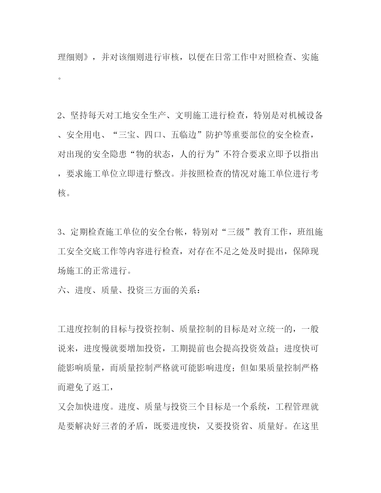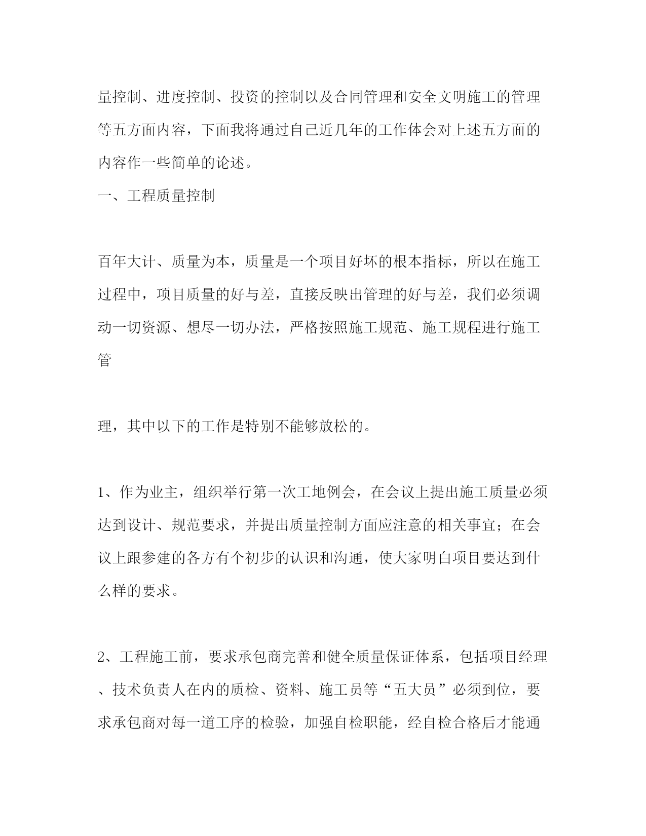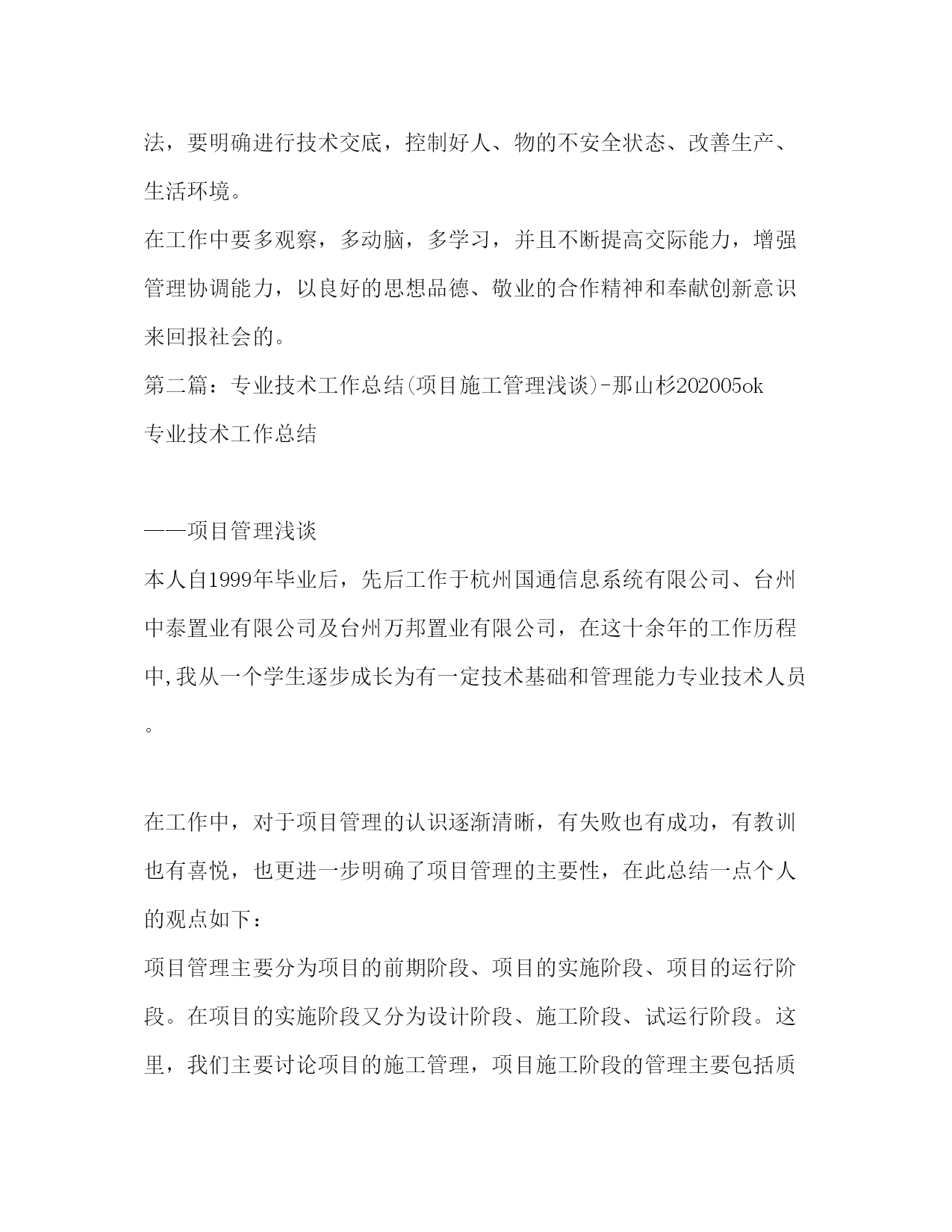 PAGE此资料由网络收集而来,如有侵权请告知上传者立即删除。资料共分享,我们负责传递知识。项目管理技术工作总结(精选多篇)第一篇:工程项目管理专业技术工作自我总结作为项目管理人,要以专业技术为依托,以工程项目管理为中心,先进的工程建设理念,明确项目成本、质量、进度和安全目标。扎实的工程建设理论和技术管理知识、丰富的现场施工经验是做好工程项目管理的基础;这就需要在平时的工作中不断积累和总结,让实践与理论更好地沉淀于能力上,更好去管理协调。一、对于整个施工过程中的技术实施,主要还是在于工程的质量,质量不合格,其它一切也就白谈了。影响施工项目的质量因素主要是人、材、机、方法和环境。所以如何控制好质量是关键。1.要熟悉工程建设中的各种材料的技术性质和质量要求;材料要严格检查验收,正确合理使用,建立管理台帐,进行收、发、储、运等环节的技术管理,避免混料和将不合格的原材料使用到工程上。2.对各工序的施工工艺充分地把握,严格按施工方案施工;全面分析,预防为主,对可能出现质量隐患的,设置控制点,重点防范;控制好整个施工过程的质量通病:质量通病面大量广,危害极大,消除质量通病只要思想重视,施工过程严格按施工验收规范进行施工,遵守施工程序和操作规程,贯彻技术责任,严格检查、层层把关,绝大多数质量通病都能消除。二、当今社会是一个讲效率的社会,时间就是金钱,质量保证了,进度也要跟得上,要合理地赶进度,对各种资源优化搭配,从而节省管理资源,节约管理成本。三、建立项目核算制,对项目进行成本控制,人、材、机、管是构成成本的主要费用;人工费严格按工程量计算,优化劳动力,减少返工,杜绝滥用工,施工要按工期严格进行,严禁窝工,无故停工,用工要按时按量(定量定工);材料在在提取使用前,施工主要负责人要熟悉施工图纸,对所用的材料的数量做到心中有数,要按时按量提取材料,尽量控制材料使用量,严格按照图纸施工,多用材料和少用材料土建工长都要以洽商的形式反映在书面上。也就是说主要负责人要对提取的材料严格把关,严禁多提错提。在现场要有人专门盯工程质量,依图施工,严禁浪费材料,丢失材料。工人对施工工艺不了解会导致浪费材料,还要防止工人盗窃施工材料和施工工具;机械施工方案的选择,要合理配置机械,提高使用率;管理人员要严格配置,架构要合理,管理人员素质、技术、办事效率要高,缩短工期,减少管理成本;优化整个施工过程各工序的施工工艺,综合衡量,通过改变工艺,搞高效率,减少人、材、机,从而降低成本。四、要以人为本,安全第一,明确安全目标、减少和消除生产过程中的事故,保证人员健康安全和财产免受损失;统一安全生产管理,制定周密的安全措施,建全规章制度,保证在多项目、多部位、多工种施工的条件下有序地进行工作,对使用一些特殊建筑材料性能、使用方法,要明确进行技术交底,控制好人、物的不安全状态、改善生产、生活环境。在工作中要多观察,多动脑,多学习,并且不断提高交际能力,增强管理协调能力,以良好的思想品德、敬业的合作精神和奉献创新意识来回报社会的。第二篇:专业技术工作总结(项目施工管理浅谈)-那山杉202005ok专业技术工作总结——项目管理浅谈本人自1999年毕业后,先后工作于杭州国通信息系统有限公司、台州中泰置业有限公司及台州万邦置业有限公司,在这十余年的工作历程中,我从一个学生逐步成长为有一定技术基础和管理能力专业技术人员。在工作中,对于项目管理的认识逐渐清晰,有失败也有成功,有教训也有喜悦,也更进一步明确了项目管理的主要性,在此总结一点个人的观点如下:项目管理主要分为项目的前期阶段、项目的实施阶段、项目的运行阶段。在项目的实施阶段又分为设计阶段、施工阶段、试运行阶段。这里,我们主要讨论项目的施工管理,项目施工阶段的管理主要包括质量控制、进度控制、投资的控制以及合同管理和安全文明施工的管理等五方面内容,下面我将通过自己近几年的工作体会对上述五方面的内容作一些简单的论述。一、工程质量控制百年大计、质量为本,质量是一个项目好坏的根本指标,所以在施工过程中,项目质量的好与差,直接反映出管理的好与差,我们必须调动一切资源、想尽一切办法,严格按照施工规范、施工规程进行施工管理,其中以下的工作是特别不能够放松的。1、作为业主,组织举行第一次工地例会,在会议上提出施工质量必须达到设计、规范要求,并提出质量控制方面应注意的相关事宜;在会议上跟参建的各方有个初步的认识和沟通,使大家明白项目要达到什么样的要求。2、工程施工前,要求承包商完善和健全质量保证体系,包括项目经理、技术负责人在内的质检、资料、施工员等“五大员”必须到位,要求承包商对每一道工序的检验,加强自检职能,经自检合格后才能通知监理工程师确认,确保每道环节都能到位。3、审核材料取样、