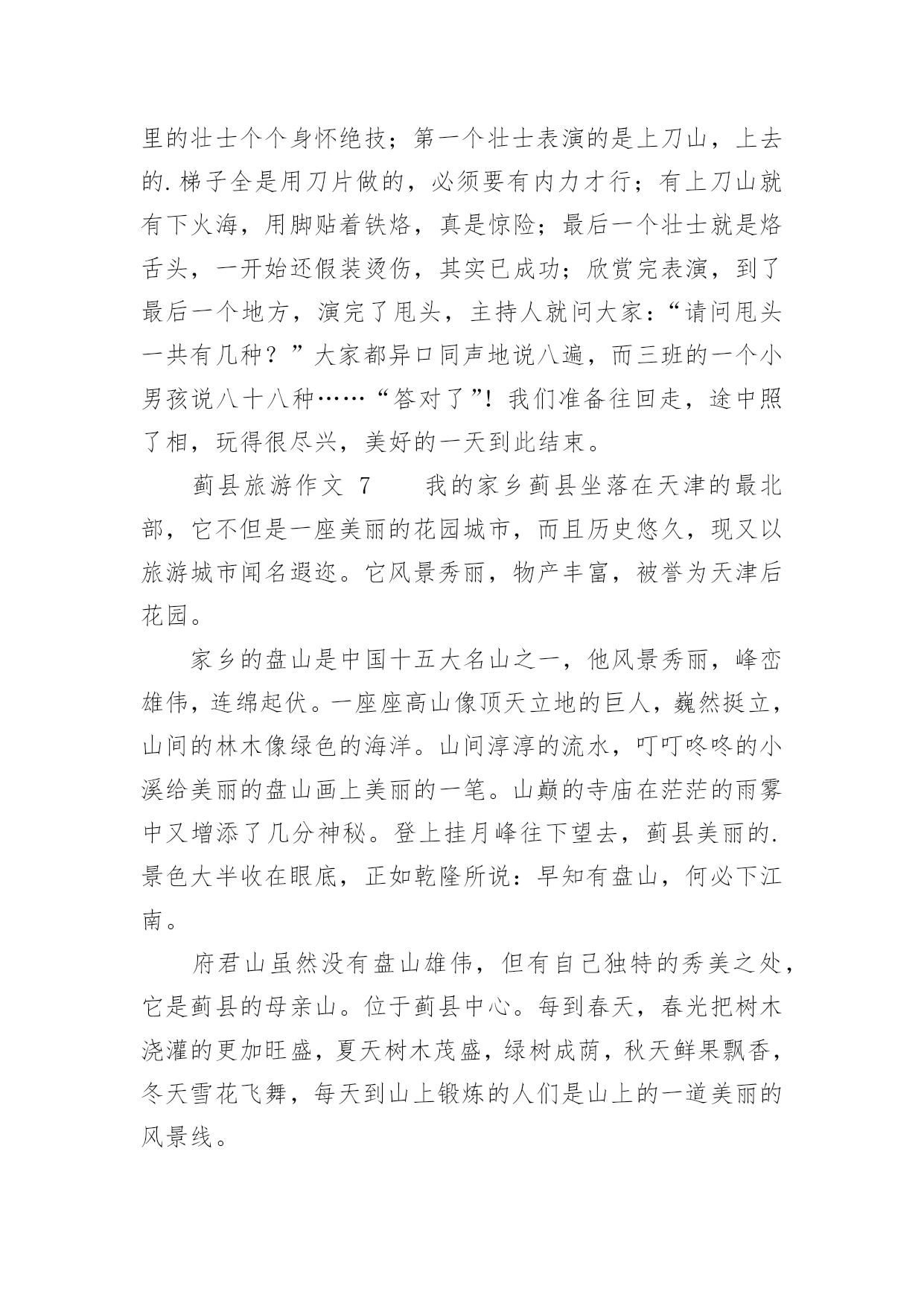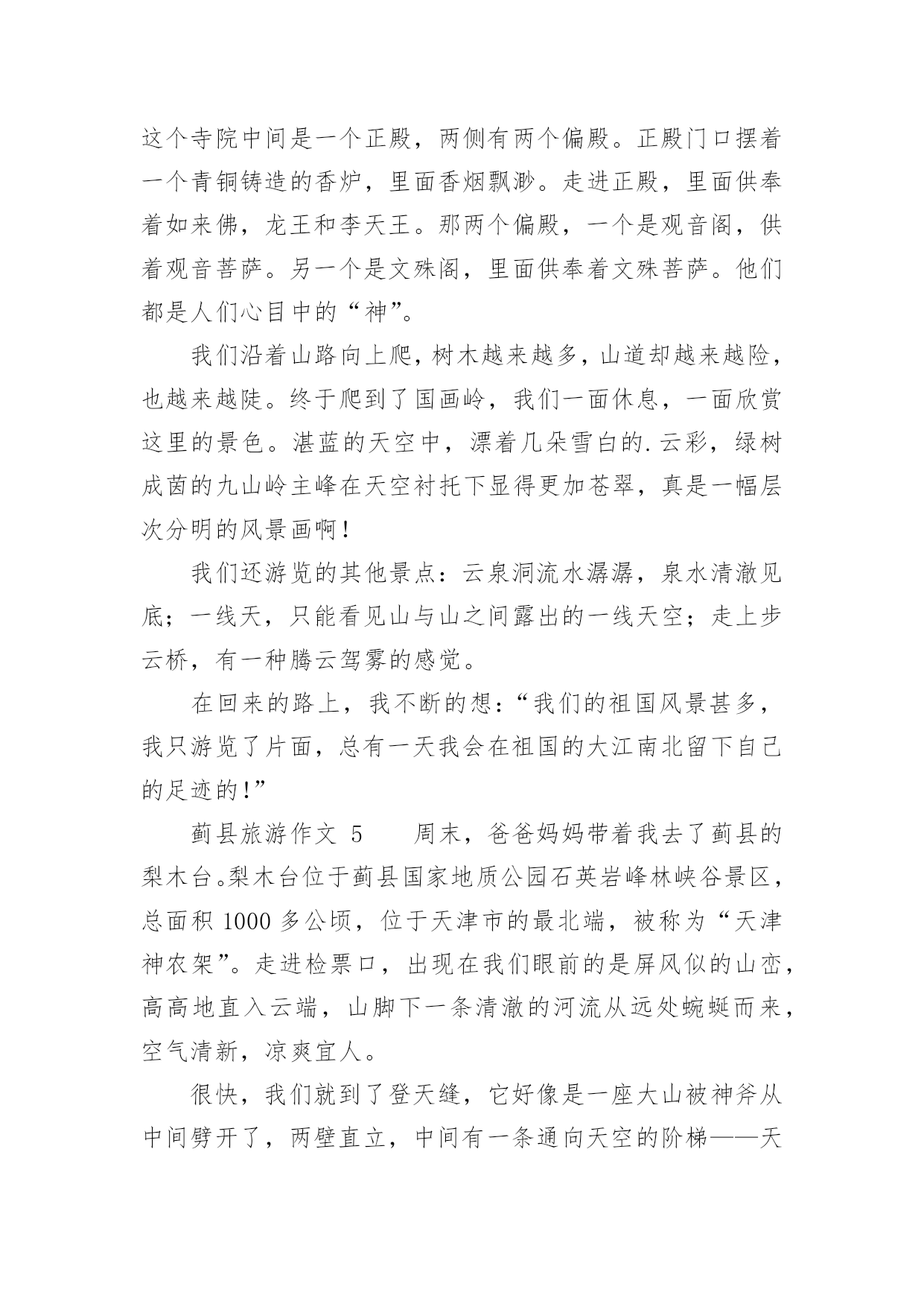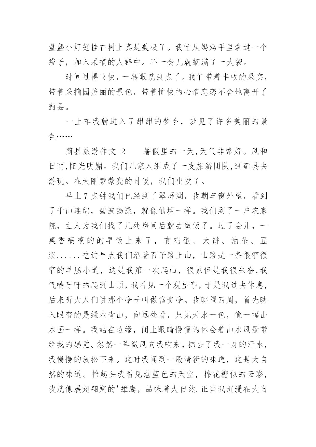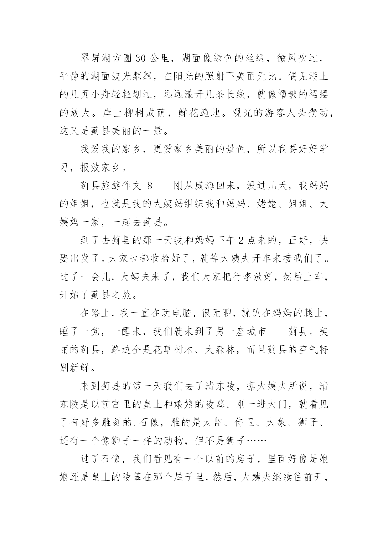 蓟县旅游作文蓟县旅游作文(精选26篇)在我们平凡的日常里,大家一定都接触过作文吧,通过作文可以把我们那些零零散散的思想,聚集在一块。你写作文时总是无从下笔?以下是小编精心整理的蓟县旅游作文,希望能够帮助到大家。蓟县旅游作文1暑假里,我和爸爸妈妈一起去蓟县游玩儿。那里的天非常蓝,哪里的云非常白,环境十分优美,空气十分的新鲜。我们先在农家院儿饱餐了一顿之后,又到农家院儿对面的水库去玩儿。水库非常得大,还有很多人在专心地钓鱼。水库的周围都是泥,那些泥非常得滑,要是你一不小心踩上去,很容易掉下去的。接着,我们来到了蓟县的.一个非常有名的采摘园,一进园子,我就被那美丽的景色吸引了。看,映入眼帘的只有一片绿,这是好阔好阔的绿园啊!地上小草嫩绿嫩绿的,一棵棵错落有致的树木,树叶儿是翠绿翠绿的,在这绿色世界里看天空,蔚蓝的天空仿佛也变成了绿色。我在这园子里尽情地玩耍,尽情地歌唱。犹如一只快乐的小鸟。瞧,那一群美丽的蝴蝶正在捉迷藏,我跑过去,它们一下子就散开了,好像是被我惊到了。这时妈妈喊道:“别乱跑,小心丢了。”我一下子惊醒了。再次抬头望去,发现在那一大片一大片绿色中还有许多可爱的小果实——又大又红的李子,它们像一盏盏小灯笼挂在树上真是美极了。我忙从妈妈手里拿过一个袋子,加入采摘的人群中。不一会儿就摘满了一大袋。时间过得飞快,一转眼就到点了。我们带着丰收的果实,带着采摘园美丽的景色,带着愉快的心情恋恋不舍地离开了蓟县。一上车我就进入了甜甜的梦乡,梦见了许多美丽的景色……蓟县旅游作文2暑假里的一天,天气非常好。风和日丽,阳光明媚。我们几家人组成了一支旅游团队,到蓟县去游玩。在天刚蒙蒙亮的时候,我们出发了。早上7点钟我们已经到了翠屏湖,我朝车窗外望,看到了千山连绵,碧波荡漾,就像仙境一样。我们到了一户农家院,主人为我们找了几处房间后就去做饭了。过了会儿,一桌香喷喷的的早饭上来了,有鸡蛋、大饼、油条、豆浆......吃过早点我们沿着石子路上山,山路是一条很窄很窄的羊肠小道,这是我第一次爬山,很累但是我很兴奋,我气喘吁吁的爬到山顶,我看见一个观望亭,于是我过去休息,后来听大人们讲那个亭子叫做富贵亭。我眺望四周,首先映入眼帘的是绿水青山,向远处看,只见天水一色,像一幅山水画一样。我站在边缘,闭上眼睛慢慢的体会着山水风景带给我的感觉。忽然一阵微风向我吹来,拂去了我一身的汗水,我慢慢的放松下来。这时我闻到一股清新的味道,这是大自然的味道。抬起头我看见湛蓝色的天空,棉花糖似的云彩,我就像展翅翱翔的'雄鹰,品味着大自然.正当我沉浸在大自然中的时候,爸爸告诉我该回去了,我依依不舍的对这一切说再见了。回到了农家院,桌子上已摆上了美味佳肴。有我最喜欢的湖鱼、小鸡炖蘑菇、小葱拌豆腐、鸡蛋炒西胡等等,这些都是我最喜欢吃的菜。主食是大饼,米饭,手擀面,还有好吃的贴饽饽,表面上看起来很薄很透明的样子,吃下去却是甜甜的,保你吃完一个还想再吃一个。这顿饭是我至今以来吃到的最好吃的午餐了,我吃的饱饱的,捂着我撑得大大的肚皮,休息片刻后我们一家去划船了,我们上船了,爸爸和妈妈划的都很好,我也尝试着划,可是一直在画句号。太糟糕了!转天早上我们就起程了,我向这一切挥挥手,与它们告别再见。这次我来到蓟县我体会到了城市与农村的差别,城市的空气中总是悬浮着灰色的粉尘,饭菜也没有农家院的风味。很多很多的生活条件比城市还要优越。虽然没有高楼大厦,但是有宽敞的农家大院。虽然没有拥挤的人群,但是有憨厚的劳动农民。我希望下次再来的时候,我一定要融入美好的大自然。蓟县旅游作文3今天我来到了蓟县的“西大峪”,之前沉闷的心情立刻转变成兴奋。我迫不及待地放下手包,换好衣服去爬山。听说这里可以爬到元代长城那,我很想看元代长城变出发了。我们一路上经历千辛万苦终于爬上了第一个上头,听说这个上叫做“鸡冠峰”。我们就往前走,很快就看见了一块石碑,已经很古老了,什么都看不清了。轻轻抹下灰尘,仔细端详,原来上面有几个字,写着:山神之位。很快我们爬过了两座山,我很累,便停下来休息一会,我就靠在一棵松树上,尽情欣赏这自然美景。歇了一会我们又出发了,许久,我们爬上了长城,长城上有一只小鸟一直在唱歌,十分动听。我好羡慕这只小鸟能在大子让自然中翱翔,歌唱。长城上有一个三届碑——这次有游玩使我流连忘返,明年要再去一次!蓟县旅游作文4暑假里的一天,天气非常好。天空晴朗,阳光明媚。我们几家人组成了一支旅游小队,到蓟县去游玩。我们的汽车沿着盘山公路上了山,到了半山腰找了一家农家旅店住下了。这是一个地道的农家院,有两排平房,还有一个很深的地窖。爸爸告诉我:“山里的人到城里买菜不方便,他们就把过冬用的粮食放进地窖里备用。”稍微休息后,我们开始吃午饭。这顿饭可是地道的农家风味。那鸡蛋可味。那鸡蛋可不一般,都是“地走鸡”下的蛋。所谓“地走鸡”就