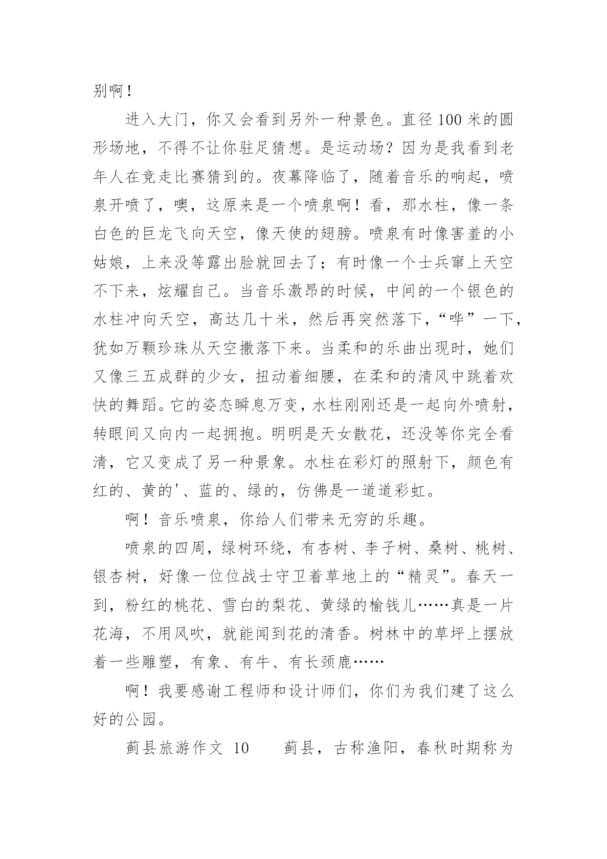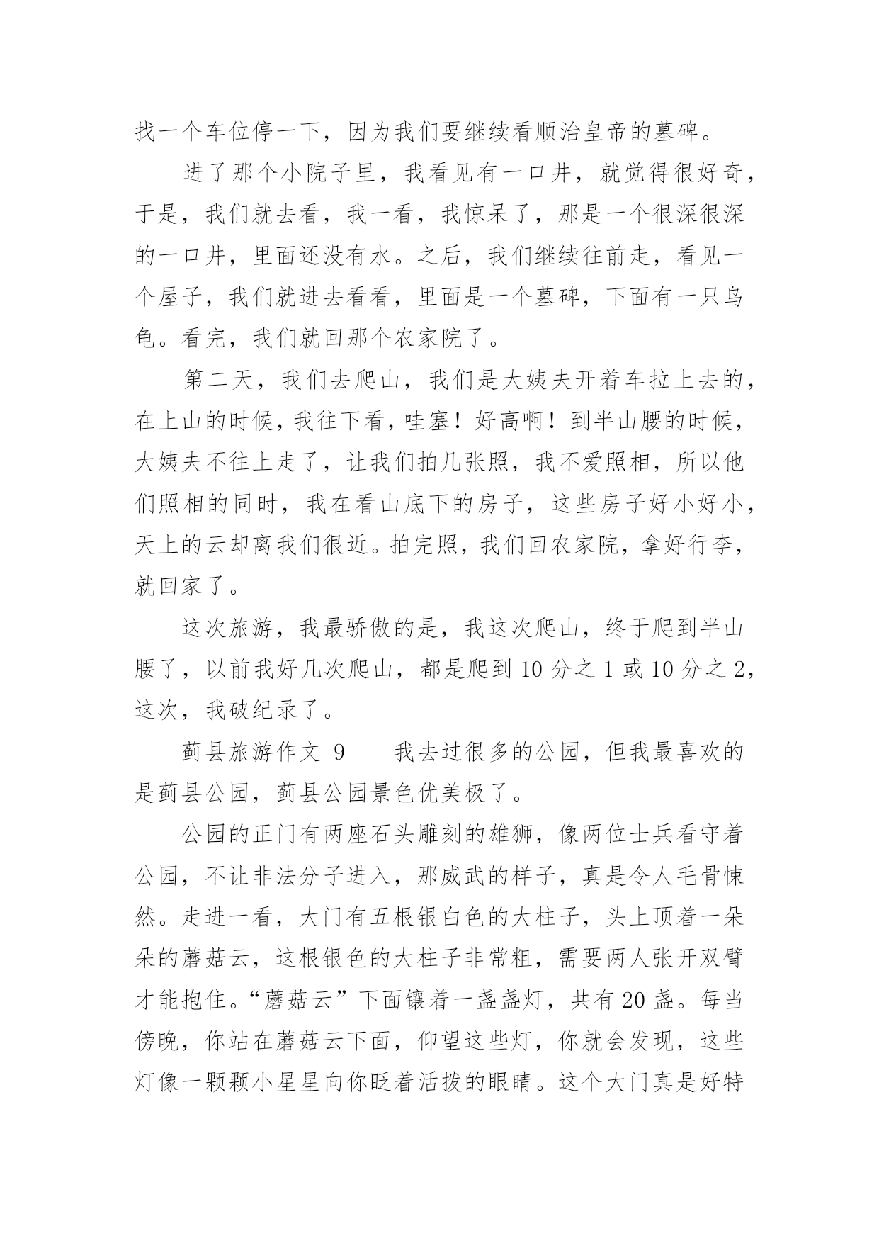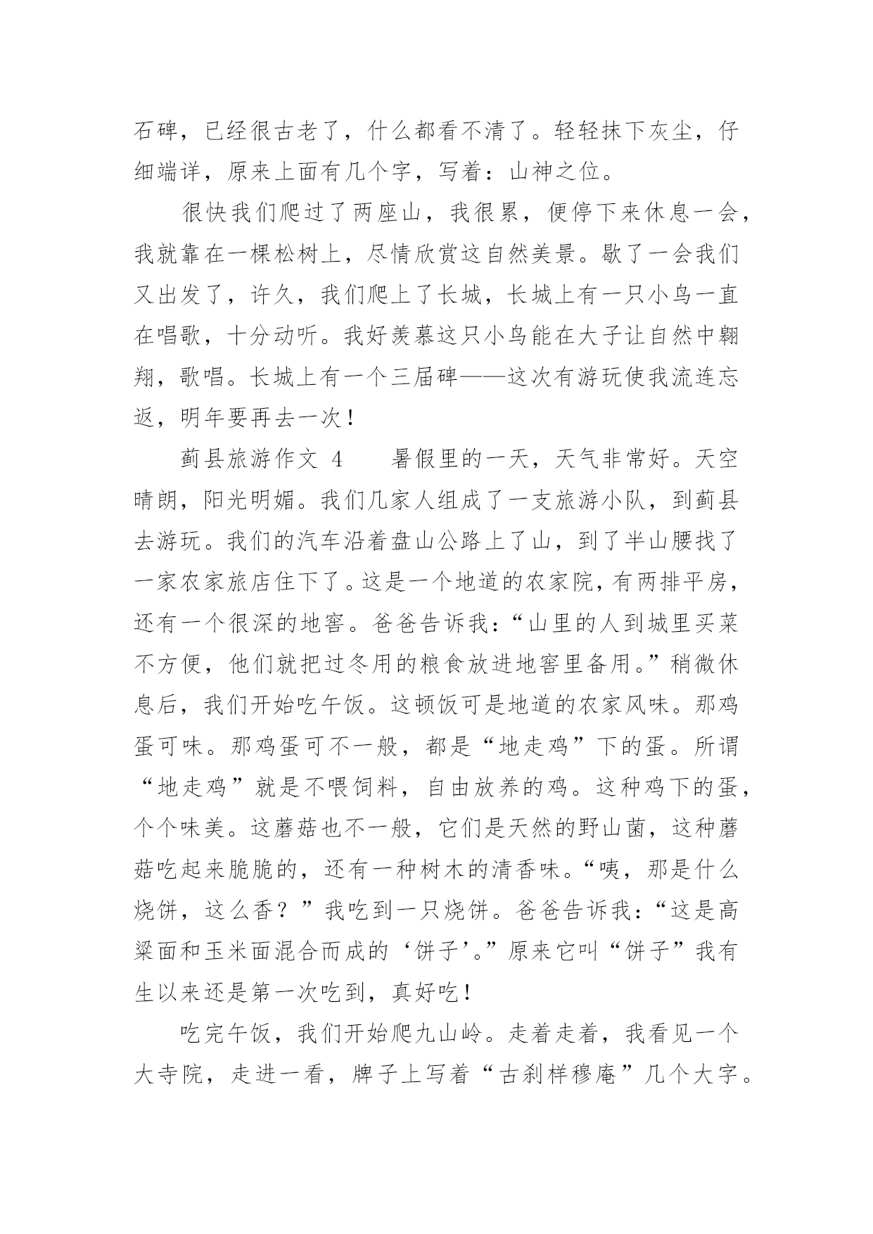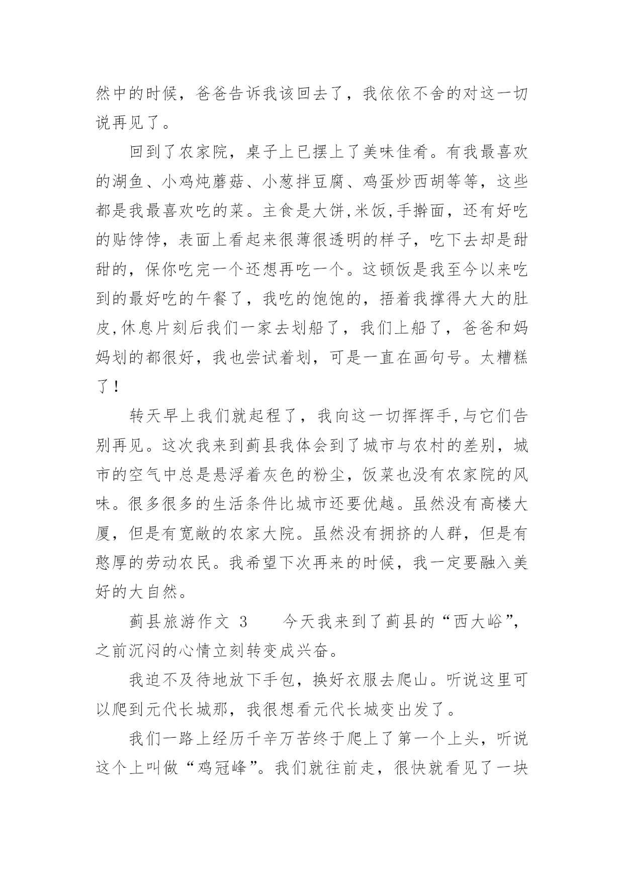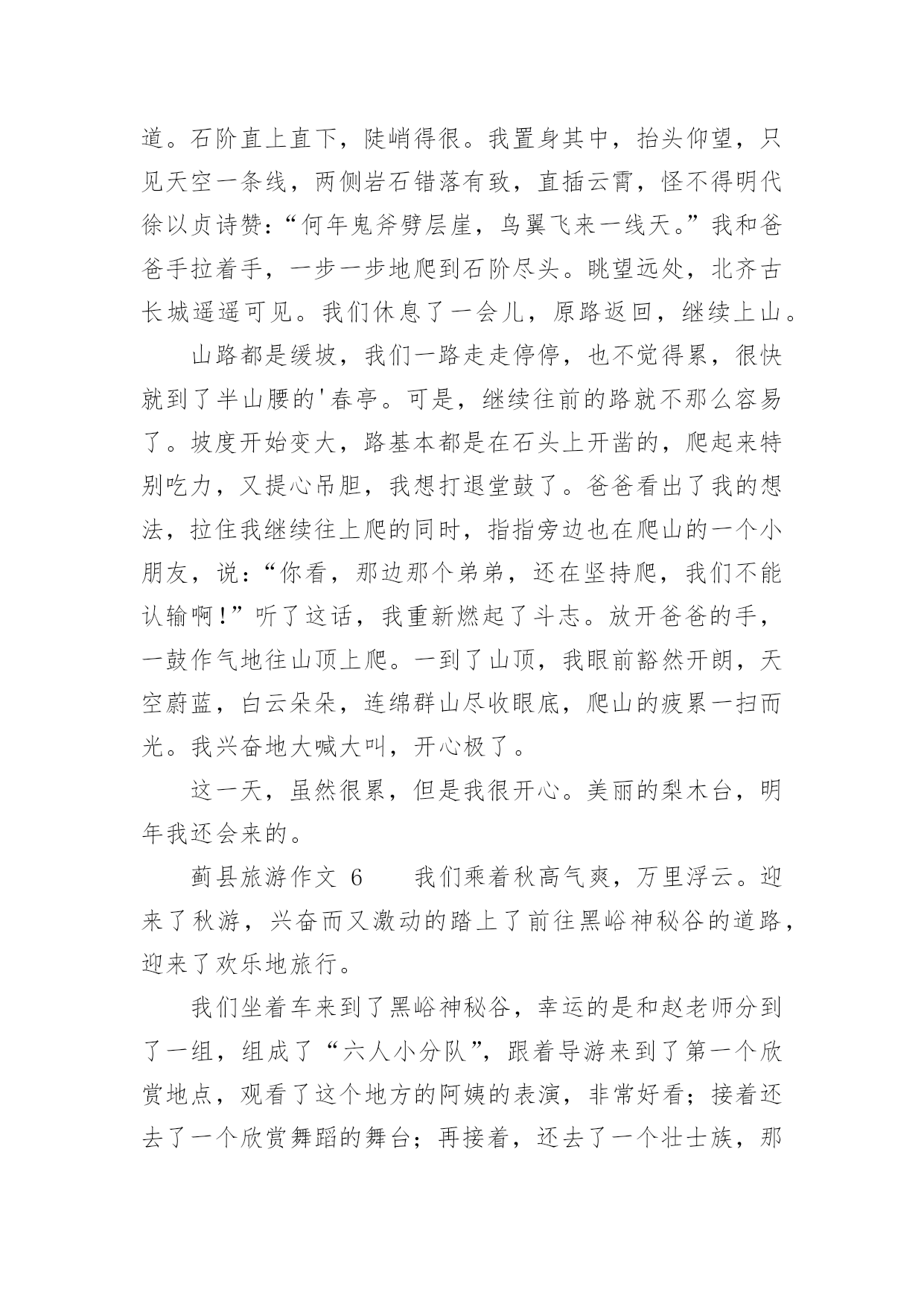 蓟县旅游作文蓟县旅游作文(精选26篇)在我们平凡的日常里,大家一定都接触过作文吧,通过作文可以把我们那些零零散散的思想,聚集在一块。你写作文时总是无从下笔?以下是小编精心整理的蓟县旅游作文,希望能够帮助到大家。蓟县旅游作文1暑假里,我和爸爸妈妈一起去蓟县游玩儿。那里的天非常蓝,哪里的云非常白,环境十分优美,空气十分的新鲜。我们先在农家院儿饱餐了一顿之后,又到农家院儿对面的水库去玩儿。水库非常得大,还有很多人在专心地钓鱼。水库的周围都是泥,那些泥非常得滑,要是你一不小心踩上去,很容易掉下去的。接着,我们来到了蓟县的.一个非常有名的采摘园,一进园子,我就被那美丽的景色吸引了。看,映入眼帘的只有一片绿,这是好阔好阔的绿园啊!地上小草嫩绿嫩绿的,一棵棵错落有致的树木,树叶儿是翠绿翠绿的,在这绿色世界里看天空,蔚蓝的天空仿佛也变成了绿色。我在这园子里尽情地玩耍,尽情地歌唱。犹如一只快乐的小鸟。瞧,那一群美丽的蝴蝶正在捉迷藏,我跑过去,它们一下子就散开了,好像是被我惊到了。这时妈妈喊道:“别乱跑,小心丢了。”我一下子惊醒了。再次抬头望去,发现在那一大片一大片绿色中还有许多可爱的小果实——又大又红的李子,它们像一盏盏小灯笼挂在树上真是美极了。我忙从妈妈手里拿过一个袋子,加入采摘的人群中。不一会儿就摘满了一大袋。时间过得飞快,一转眼就到点了。我们带着丰收的果实,带着采摘园美丽的景色,带着愉快的心情恋恋不舍地离开了蓟县。一上车我就进入了甜甜的梦乡,梦见了许多美丽的景色……蓟县旅游作文2暑假里的一天,天气非常好。风和日丽,阳光明媚。我们几家人组成了一支旅游团队,到蓟县去游玩。在天刚蒙蒙亮的时候,我们出发了。早上7点钟我们已经到了翠屏湖,我朝车窗外望,看到了千山连绵,碧波荡漾,就像仙境一样。我们到了一户农家院,主人为我们找了几处房间后就去做饭了。过了会儿,一桌香喷喷的的早饭上来了,有鸡蛋、大饼、油条、豆浆......吃过早点我们沿着石子路上山,山路是一条很窄很窄的羊肠小道,这是我第一次爬山,很累但是我很兴奋,我气喘吁吁的爬到山顶,我看见一个观望亭,于是我过去休息,后来听大人们讲那个亭子叫做富贵亭。我眺望四周,首先映入眼帘的是绿水青山,向远处看,只见天水一色,像一幅山水画一样。我站在边缘,闭上眼睛慢慢的体会着山水风景带给我的感觉。忽然一阵微风向我吹来,拂去了我一身的汗水,我慢慢的放松下来。这时我闻到一股清新的味道,这是大自然的味道。抬起头我看见湛蓝色的天空,棉花糖似的云彩,我就像展翅翱翔的'雄鹰,品味着大自然.正当我沉浸在大自然中的时候,爸爸告诉我该回去了,我依依不舍的对这一切说再见了。回到了农家院,桌子上已摆上了美味佳肴。有我最喜欢的湖鱼、小鸡炖蘑菇、小葱拌豆腐、鸡蛋炒西胡等等,这些都是我最喜欢吃的菜。主食是大饼,米饭,手擀面,还有好吃的贴饽饽,表面上看起来很薄很透明的样子,吃下去却是甜甜的,保你吃完一个还想再吃一个。这顿饭是我至今以来吃到的最好吃的午餐了,我吃的饱饱的,捂着我撑得大大的肚皮,休息片刻后我们一家去划船了,我们上船了,爸爸和妈妈划的都很好,我也尝试着划,可是一直在画句号。太糟糕了!转天早上我们就起程了,我向这一切挥挥手,与它们告别再见。这次我来到蓟县我体会到了城市与农村的差别,城市的空气中总是悬浮着灰色的粉尘,饭菜也没有农家院的风味。很多很多的生活条件比城市还要优越。虽然没有高楼大厦,但是有宽敞的农家大院。虽然没有拥挤的人群,但是有憨厚的劳动农民。我希望下次再来的时候,我一定要融入美好的大自然。蓟县旅游作文3今天我来到了蓟县的“西大峪”,之前沉闷的心情立刻转变成兴奋。我迫不及待地放下手包,换好衣服去爬山。听说这里可以爬到元代长城那,我很想看元代长城变出发了。我们一路上经历千辛万苦终于爬上了第一个上头,听说这个上叫做“鸡冠峰”。我们就往前走,很快就看见了一块石碑,已经很古老了,什么都看不清了。轻轻抹下灰尘,仔细端详,原来上面有几个字,写着:山神之位。很快我们爬过了两座山,我很累,便停下来休息一会,我就靠在一棵松树上,尽情欣赏这自然美景。歇了一会我们又出发了,许久,我们爬上了长城,长城上有一只小鸟一直在唱歌,十分动听。我好羡慕这只小鸟能在大子让自然中翱翔,歌唱。长城上有一个三届碑——这次有游玩使我流连忘返,明年要再去一次!蓟县旅游作文4暑假里的一天,天气非常好。天空晴朗,阳光明媚。我们几家人组成了一支旅游小队,到蓟县去游玩。我们的汽车沿着盘山公路上了山,到了半山腰找了一家农家旅店住下了。这是一个地道的农家院,有两排平房,还有一个很深的地窖。爸爸告诉我:“山里的人到城里买菜不方便,他们就把过冬用的粮食放进地窖里备用。”稍微休息后,我们开始吃午饭。这顿饭可是地道的农家风味。那鸡蛋可味。那鸡蛋可不一般,都是“地走鸡”下的蛋。所谓“地走鸡”就