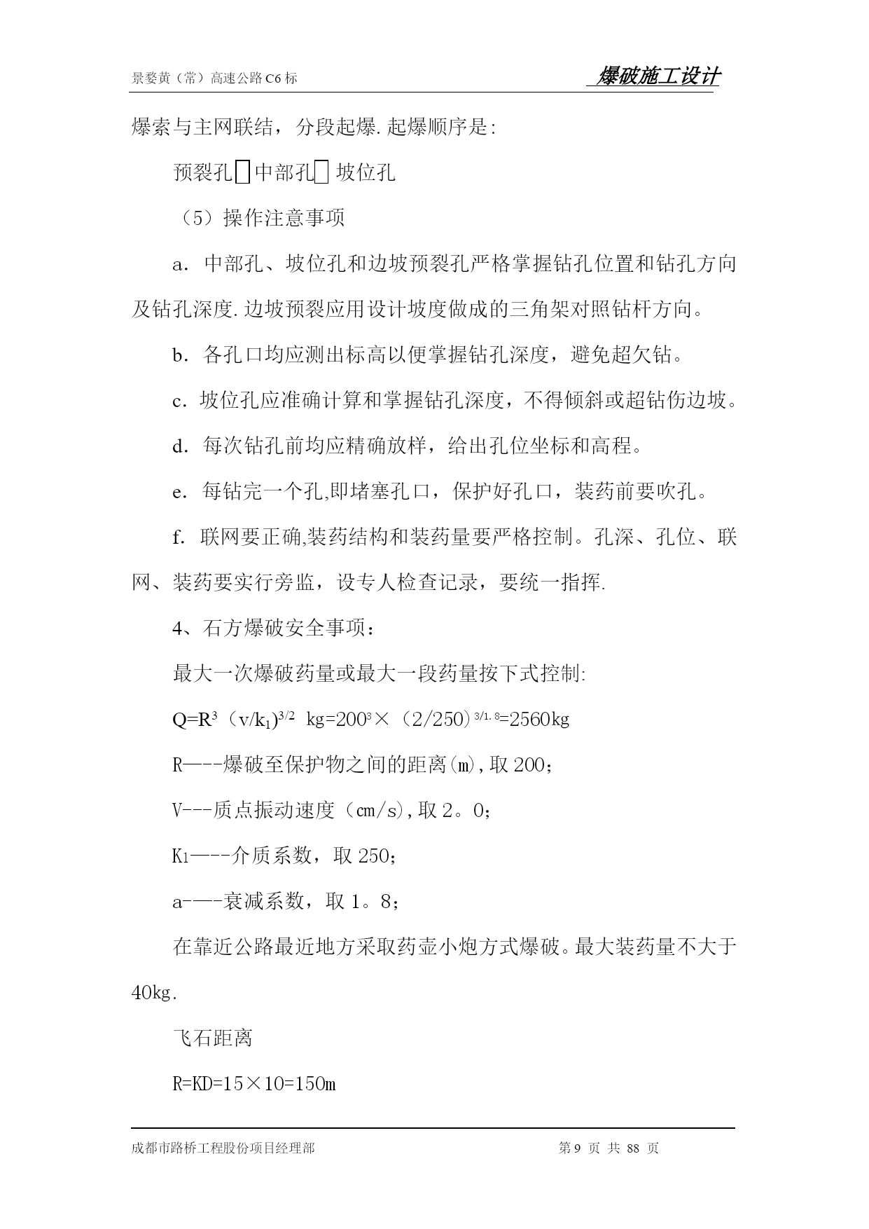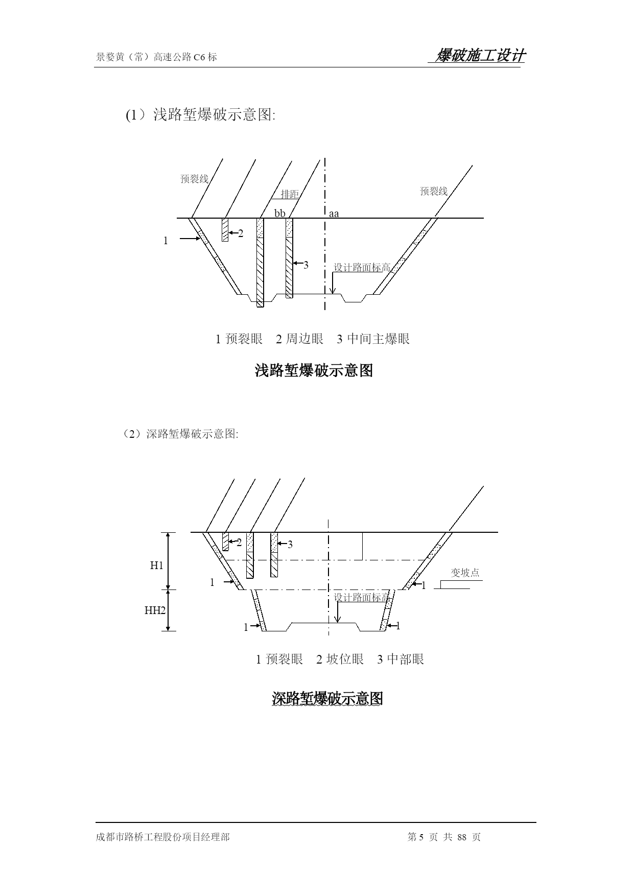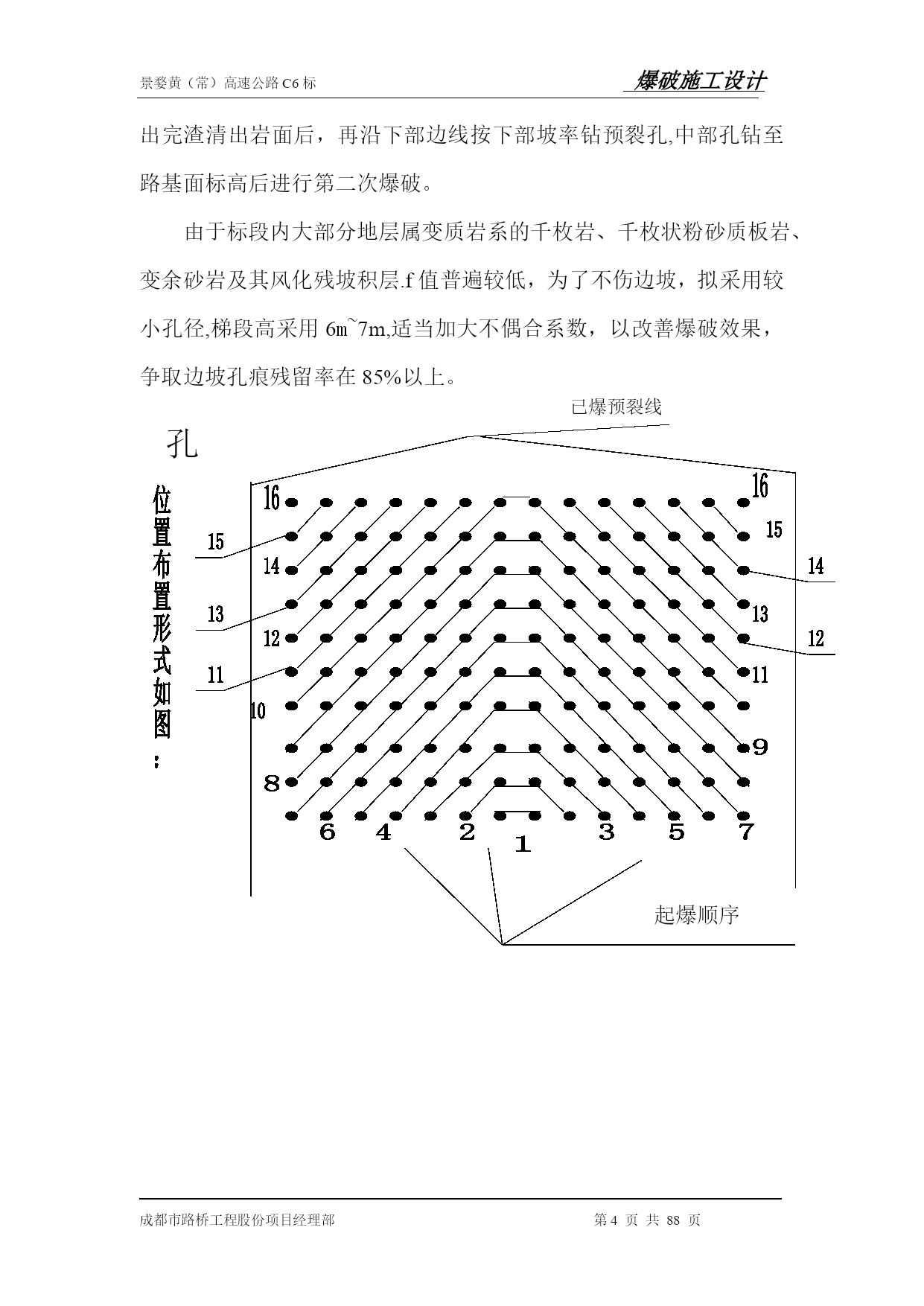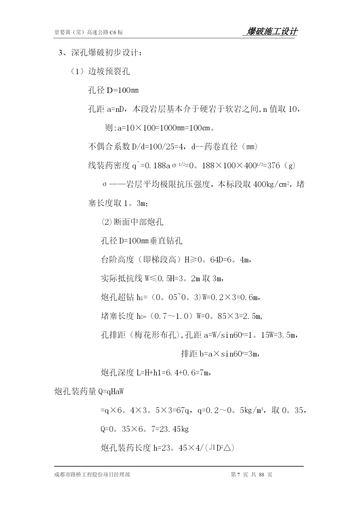 景婺黄(常)高速公路C6标爆破施工设计成都市路桥工程股份项目经理部第PAGE28页共NUMPAGES88页爆破施工设计【实用文档】doc文档可直接使用可编辑,欢迎下载爆破施工设计一、编制依据:《爆破安全规程》(GB6722-2003)《景婺黄(常)高速公路C6标两段施工图纸》《景婺黄(常)高速公路C6标实施性施工组织设计》二、工程概况及环境与技术要求:爆破起于婺源县紫阳镇董家林经老虎滩、星江河、马家村、祝家庄等地,终止戴家村以北400米,路线长4。48公里。基土石方1231595M3,大桥3座、中桥1座、分离立交一处。全线施工总体安排:C6标段工程施工期为2005年11月15日,开工日期为2004年12月8日,本标段施工网络关键线路上的工程为梅林隧道。在确保隧道施工工期的前提下,全线于2004年12月15日完成所有单位工程的施工准备工作,达到开工条件.本标段在经过村落地段,有少量民房及景白公路通过,在董家林距离公路最近50米,爆破时须严格控制飞石和空气冲击波影响范围。其余地段均为偏僻山坳,对爆破较为有利。具体情况见平面图。三、工程地质条件及爆破方量1、地形本标段主要位于江西省东北部,属赣东北中、低山与丘陵区婺源怀山侵蚀丘陵亚区。路线一直平行于景白公路沿变质岩系组成的低丘区展布,地形起伏较大,山势陡峻,植被极发育,发育谷盆地和“V”型冲沟,谷盆地地表为水田。地面高程在64~254米之间,其中K21+110~K21+638段路线以隧道形式穿山体主峰。2、地质本标段地层主要为前震旦系变岩系,在终点段小范围出露白垩系红砂岩,沿线地质构造(褶皱和断裂带)极其发育,变质岩系由于受多期地质构造的作用,加上风化时间久长,岩体总体比较破碎,对边坡稳定不利,但地质层总体呈北东走向,与路线呈大角度相交,岩层产状对边坡有利.3、爆破工程量本标段路基共挖软石方,次坚石方;桥涵挖基软石方。四、爆破施工方案(一)、路基土石方爆破方案1、爆破方案选择本标段次坚石、坚石爆破以小型及松动爆破为主,爆破后产生的大块石采用挖掘机配液压破碎锤改小。边坡根据岩石的完整性较差采用预裂爆破。浅路堑石方开挖采用浅孔台阶爆破,超过6米以上的路堑均采用边坡预裂,断面采用微差挤压梯段爆破。根据地形、地质及挖深选择适宜的开挖爆破方法及参数,浅孔爆破采用气腿式风钻钻孔、深孔爆破采用潜孔钻机钻孔。本段挖深当堑坡仅有一个坡率时,预裂眼沿边线按坡率一次钻眼到底,再钻断面中部孔;当堑坡为两个坡率时,则第一阶段的预裂孔钻至变坡点,中部孔也钻至变坡点水平高度。当第一阶段孔爆破完毕,出完渣清出岩面后,再沿下部边线按下部坡率钻预裂孔,中部孔钻至路基面标高后进行第二次爆破。已爆预裂线由于标段内大部分地层属变质岩系的千枚岩、千枚状粉砂质板岩、变余砂岩及其风化残坡积层.f值普遍较低,为了不伤边坡,拟采用较小孔径,梯段高采用6m~7m,适当加大不偶合系数,以改善爆破效果,争取边坡孔痕残留率在85%以上。孔起爆顺序(1)浅路堑爆破示意图:设计路面标高123aabb浅路堑爆破示意图1预裂眼2周边眼3中间主爆眼预裂线排距预裂线(2)深路堑爆破示意图:1231111预裂眼2坡位眼3中部眼H1HH2变坡点深路堑爆破示意图设计路面标高2、深孔微差梯段爆破工程序:深孔微差梯段爆破施工程序框图爆破设计工程师批准平整工作面孔位放线工程师批准钻孔工程师批准击发起爆安全警戒总结效果炸后检查堵塞装药孔位检查网络联结3、深孔爆破初步设计:(1)边坡预裂孔孔径D=100㎜孔距a=nD,本段岩层基本介于硬岩于软岩之间,n值取10,则:a=10×100=1000㎜=100㎝。不偶合系数D/d=100/25=4,d--药卷直径(㎜)线装药密度q`=0.188aσ1/2=0。188×100×4001/2=376(g)σ——岩层平均极限抗压强度,本标段取400㎏/㎝2,堵塞长度取1。3m;(2)断面中部炮孔孔径D=100㎜垂直钻孔台阶高度(即梯段高)H≥0。64D=6。4m,实际抵抗线W≤0.5H=3。2m取3m,炮孔超钻h1=(0。05~0。3)W=0.2×3=0.6m,堵塞长度h0=(0.7~1.0)W=0。85×3=2.5m,孔排距(梅花形布孔),孔距a=W/sin60o=1。15W=3.5m,排距b=a×sin60o=3m,炮孔深度L=H+h1=6.4+0.6=7m,炮孔装药量Q=qHaW=q×6。4×3。5×3=67q