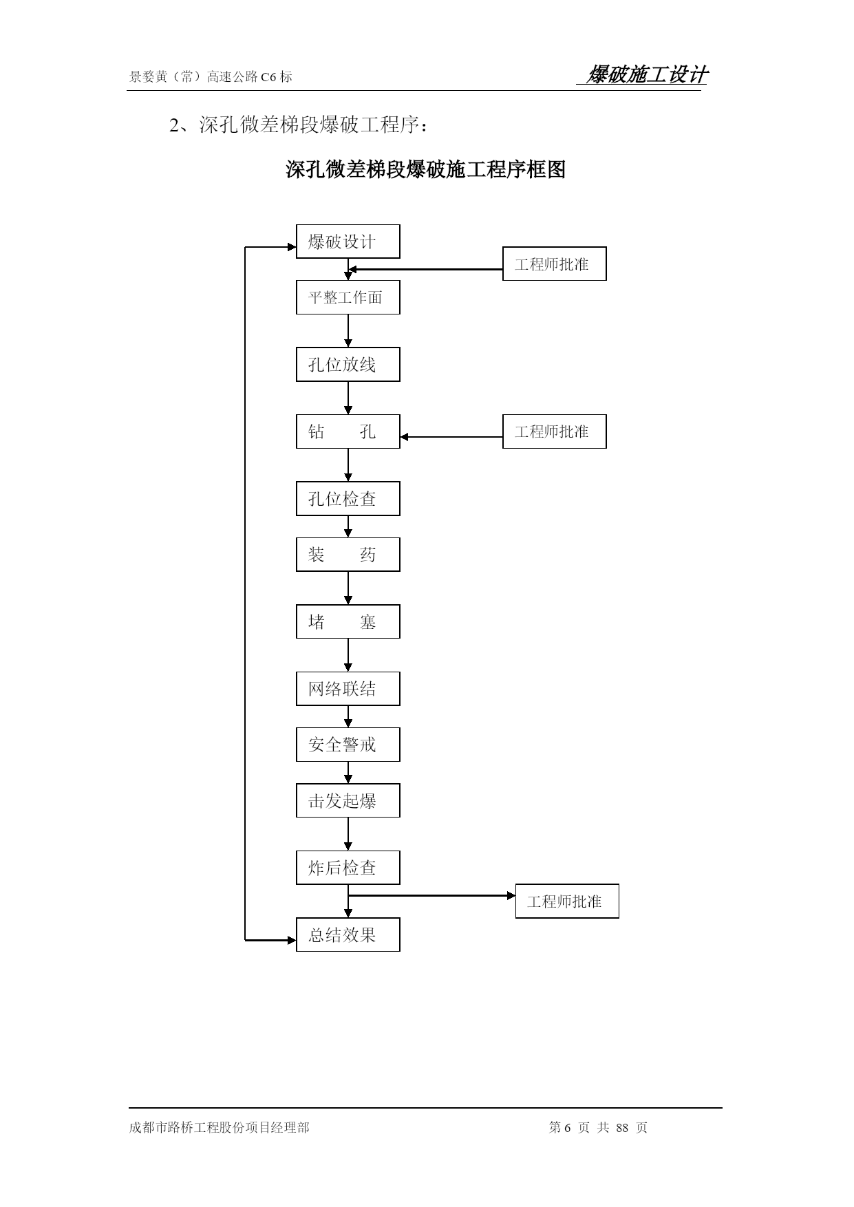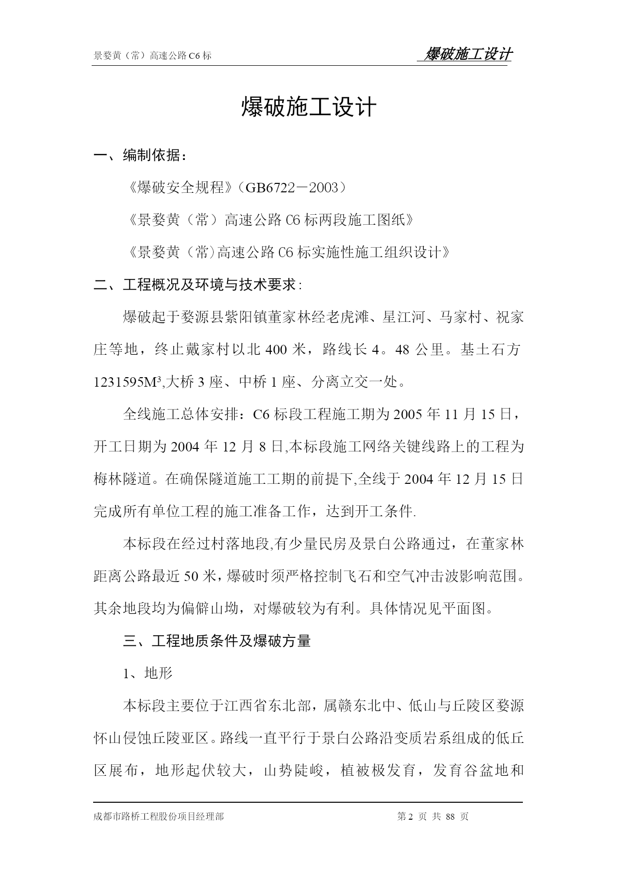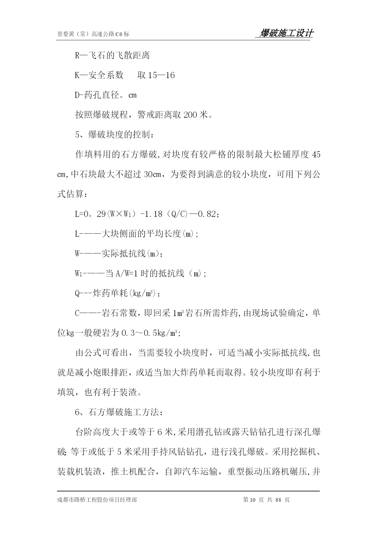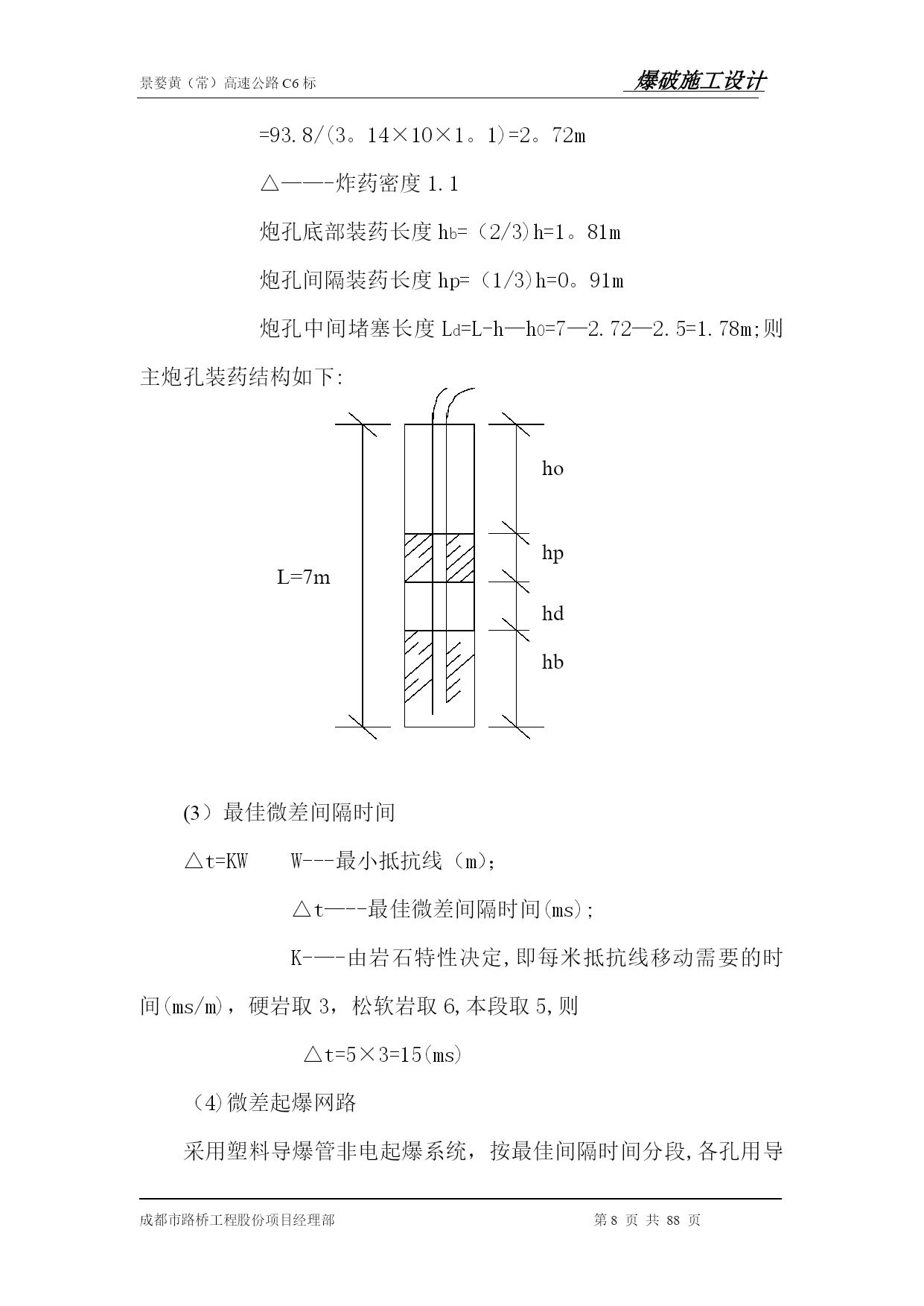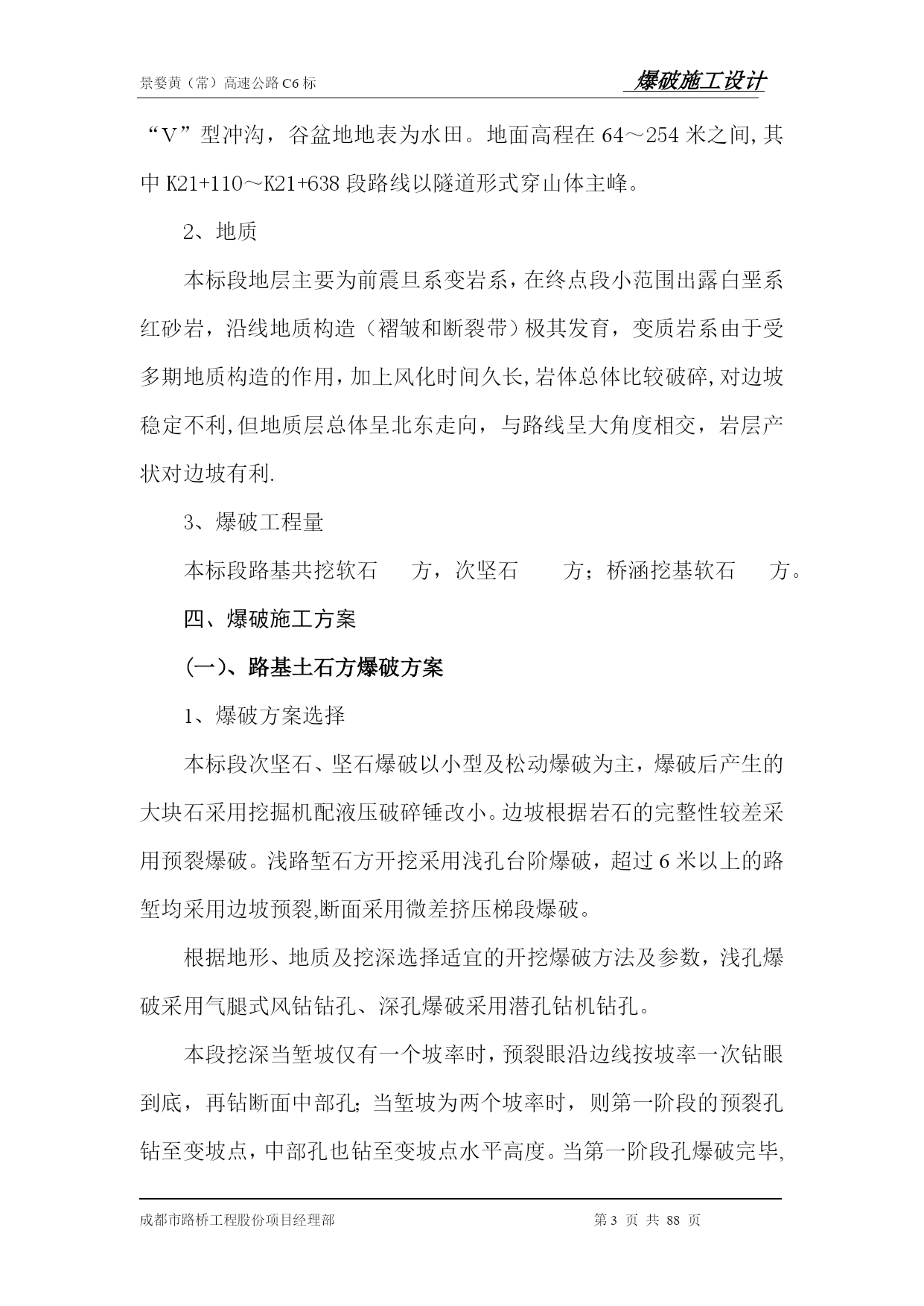 景婺黄(常)高速公路C6标爆破施工设计成都市路桥工程股份项目经理部第PAGE28页共NUMPAGES88页爆破施工设计【实用文档】doc文档可直接使用可编辑,欢迎下载爆破施工设计一、编制依据:《爆破安全规程》(GB6722-2003)《景婺黄(常)高速公路C6标两段施工图纸》《景婺黄(常)高速公路C6标实施性施工组织设计》二、工程概况及环境与技术要求:爆破起于婺源县紫阳镇董家林经老虎滩、星江河、马家村、祝家庄等地,终止戴家村以北400米,路线长4。48公里。基土石方1231595M3,大桥3座、中桥1座、分离立交一处。全线施工总体安排:C6标段工程施工期为2005年11月15日,开工日期为2004年12月8日,本标段施工网络关键线路上的工程为梅林隧道。在确保隧道施工工期的前提下,全线于2004年12月15日完成所有单位工程的施工准备工作,达到开工条件.本标段在经过村落地段,有少量民房及景白公路通过,在董家林距离公路最近50米,爆破时须严格控制飞石和空气冲击波影响范围。其余地段均为偏僻山坳,对爆破较为有利。具体情况见平面图。三、工程地质条件及爆破方量1、地形本标段主要位于江西省东北部,属赣东北中、低山与丘陵区婺源怀山侵蚀丘陵亚区。路线一直平行于景白公路沿变质岩系组成的低丘区展布,地形起伏较大,山势陡峻,植被极发育,发育谷盆地和“V”型冲沟,谷盆地地表为水田。地面高程在64~254米之间,其中K21+110~K21+638段路线以隧道形式穿山体主峰。2、地质本标段地层主要为前震旦系变岩系,在终点段小范围出露白垩系红砂岩,沿线地质构造(褶皱和断裂带)极其发育,变质岩系由于受多期地质构造的作用,加上风化时间久长,岩体总体比较破碎,对边坡稳定不利,但地质层总体呈北东走向,与路线呈大角度相交,岩层产状对边坡有利.3、爆破工程量本标段路基共挖软石方,次坚石方;桥涵挖基软石方。四、爆破施工方案(一)、路基土石方爆破方案1、爆破方案选择本标段次坚石、坚石爆破以小型及松动爆破为主,爆破后产生的大块石采用挖掘机配液压破碎锤改小。边坡根据岩石的完整性较差采用预裂爆破。浅路堑石方开挖采用浅孔台阶爆破,超过6米以上的路堑均采用边坡预裂,断面采用微差挤压梯段爆破。根据地形、地质及挖深选择适宜的开挖爆破方法及参数,浅孔爆破采用气腿式风钻钻孔、深孔爆破采用潜孔钻机钻孔。本段挖深当堑坡仅有一个坡率时,预裂眼沿边线按坡率一次钻眼到底,再钻断面中部孔;当堑坡为两个坡率时,则第一阶段的预裂孔钻至变坡点,中部孔也钻至变坡点水平高度。当第一阶段孔爆破完毕,出完渣清出岩面后,再沿下部边线按下部坡率钻预裂孔,中部孔钻至路基面标高后进行第二次爆破。已爆预裂线由于标段内大部分地层属变质岩系的千枚岩、千枚状粉砂质板岩、变余砂岩及其风化残坡积层.f值普遍较低,为了不伤边坡,拟采用较小孔径,梯段高采用6m~7m,适当加大不偶合系数,以改善爆破效果,争取边坡孔痕残留率在85%以上。孔起爆顺序(1)浅路堑爆破示意图:设计路面标高123aabb浅路堑爆破示意图1预裂眼2周边眼3中间主爆眼预裂线排距预裂线(2)深路堑爆破示意图:1231111预裂眼2坡位眼3中部眼H1HH2变坡点深路堑爆破示意图设计路面标高2、深孔微差梯段爆破工程序:深孔微差梯段爆破施工程序框图爆破设计工程师批准平整工作面孔位放线工程师批准钻孔工程师批准击发起爆安全警戒总结效果炸后检查堵塞装药孔位检查网络联结3、深孔爆破初步设计:(1)边坡预裂孔孔径D=100㎜孔距a=nD,本段岩层基本介于硬岩于软岩之间,n值取10,则:a=10×100=1000㎜=100㎝。不偶合系数D/d=100/25=4,d--药卷直径(㎜)线装药密度q`=0.188aσ1/2=0。188×100×4001/2=376(g)σ——岩层平均极限抗压强度,本标段取400㎏/㎝2,堵塞长度取1。3m;(2)断面中部炮孔孔径D=100㎜垂直钻孔台阶高度(即梯段高)H≥0。64D=6。4m,实际抵抗线W≤0.5H=3。2m取3m,炮孔超钻h1=(0。05~0。3)W=0.2×3=0.6m,堵塞长度h0=(0.7~1.0)W=0。85×3=2.5m,孔排距(梅花形布孔),孔距a=W/sin60o=1。15W=3.5m,排距b=a×sin60o=3m,炮孔深度L=H+h1=6.4+0.6=7m,炮孔装药量Q=qHaW=q×6。4×3。5×3=67q