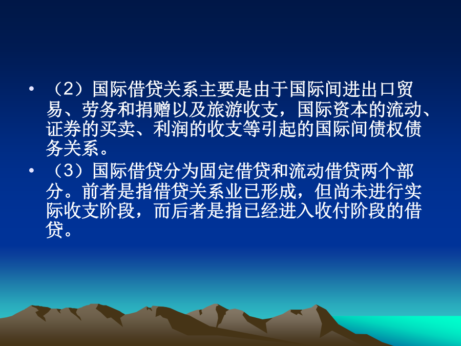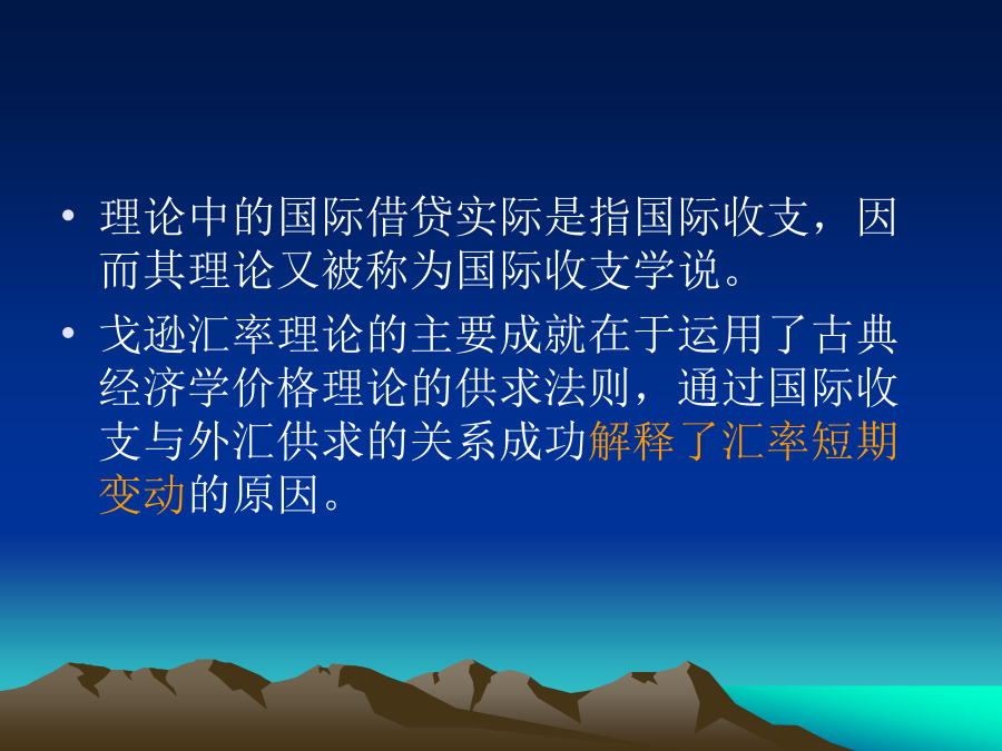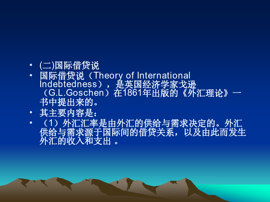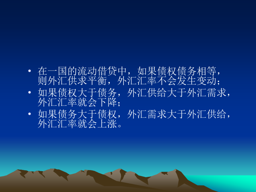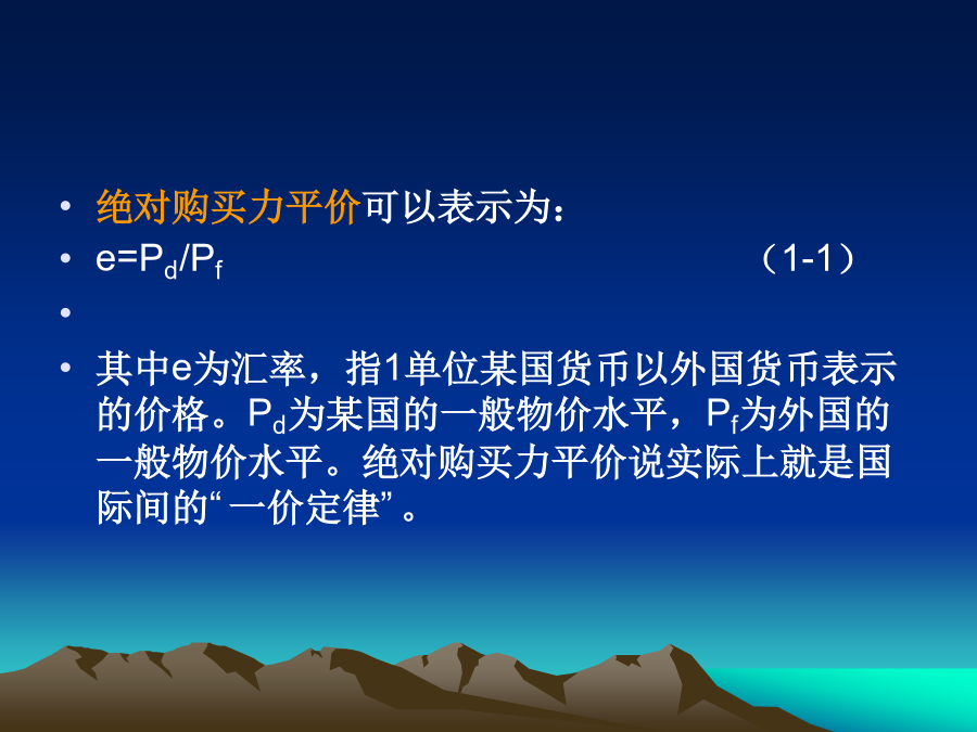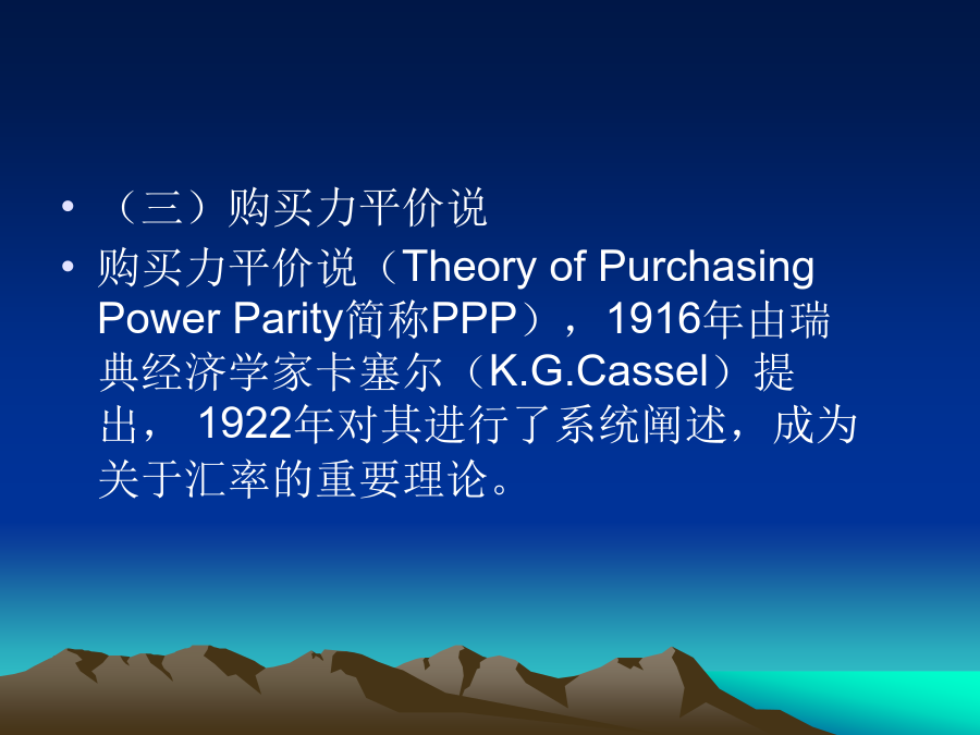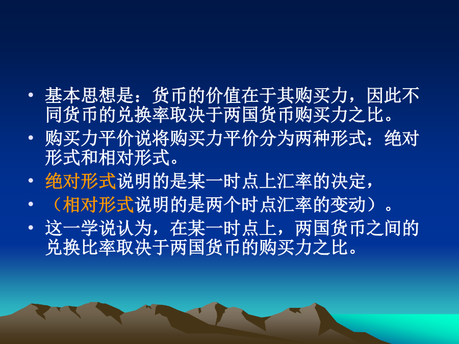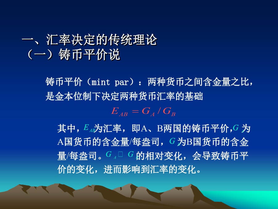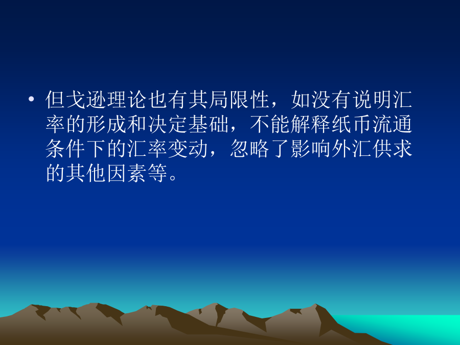 汇率的决定理论一、汇率决定的传统理论(一)铸币平价说(2)国际借贷关系主要是由于国际间进出口贸易、劳务和捐赠以及旅游收支,国际资本的流动、证券的买卖、利润的收支等引起的国际间债权债务关系。(3)国际借贷分为固定借贷和流动借贷两个部分。前者是指借贷关系业已形成,但尚未进行实际收支阶段,而后者是指已经进入收付阶段的借贷。绝对购买力平价可以表示为:e=Pd/Pf(1-1)其中e为汇率,指1单位某国货币以外国货币表示的价格。Pd为某国的一般物价水平,Pf为外国的一般物价水平。绝对购买力平价说实际上就是国际间的“一价定律”。(5)它忽略了国际资本流动对汇率所产生的冲击。这往往是现实汇率尤其是在短期内偏离购买力平价的根本所在;(6)购买力平价说只是一种静态或比较静态分析,没有对物价如何影响汇率的传导机制进行具体分析。(四)汇兑心理说汇兑心理说(PsychologicalTheoryofExchange),是由法国经济学家阿夫塔里昂(A.Aftalion)于1927年在其所著的《货币、物价与汇兑》一书中提出的。其理论基础则源于边际效用论。因为P和ib都是分数,所以其乘积Pib通常较小,可以将之省略,由此得:Pia-ib(1-7)即远期升水率等于国内外利差。式(1-7)就称为利率平价方程式。这表明,如果国内利率高于国外利率,则远期外汇必为升水(即期本币汇率上升,远期下降,外汇汇率则相反);如果国内利率低于国外利率,则远期外汇必为贴水(即期本币汇率下降,远期上升,外汇汇率则相反),并且升(贴)水率等于两国利差。二、战后汇率决定理论货币主义汇率理论既接受了购买力平价学说的基本观点,又引用了弗里德曼货币数量论观点解释物价与汇率变动问题。其成就在于:把汇率视为两国货币的相对价格,而不是两国商品的相对价格,强调货币市场的货币存量供应情况对汇率的决定作用。同时,它用货币存量来分析汇率,打破了长期以来国际收支学派和购买力平价论者以流量分析汇率的传统,并取得良好效果。其不足则在于:未考虑国际收支结构性因素对汇率的影响。货币供求只是影响汇率的众多因素之一,单纯用其解释汇率变动过于片面。而且,其前提条件是假定购买力平价成立,这一点是不现实的。各种资产的比例应与本身的预期收益率成正比,与其他替代性资产的预期收益率成反比。汇率的变动通过影响私人部门对财富的重新估价(因为汇率的变动影响以本国货币表示的国外资产额),起着平衡资产供求存量的作用。均衡汇率正是使私人部门意愿持有现有国内外各种资产存量的汇率水平。但这一模式也存在一些不足:商品市场的失衡如何影响汇率,没有纳入其分析中;它用财富总额代替收入作为影响资产组合的因素,而又没有说明实际收入对财富总额的影响。