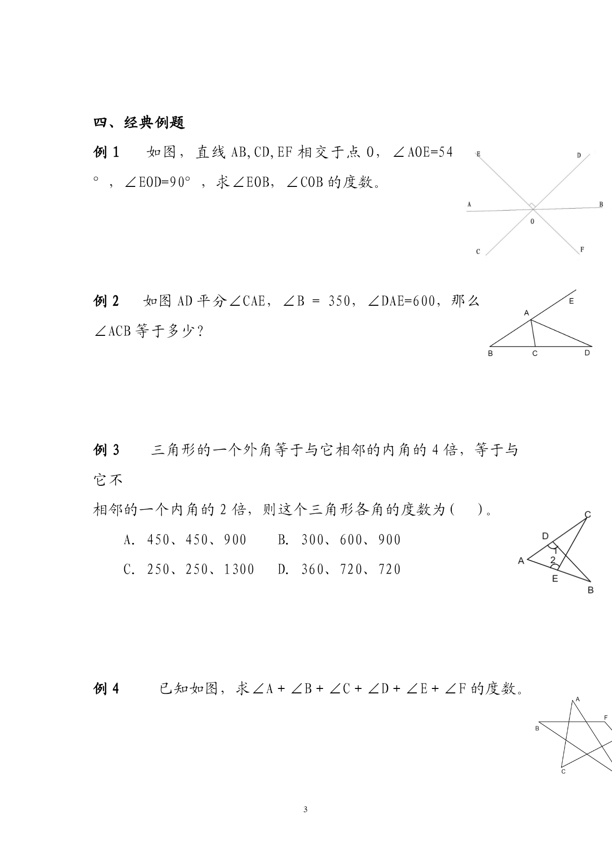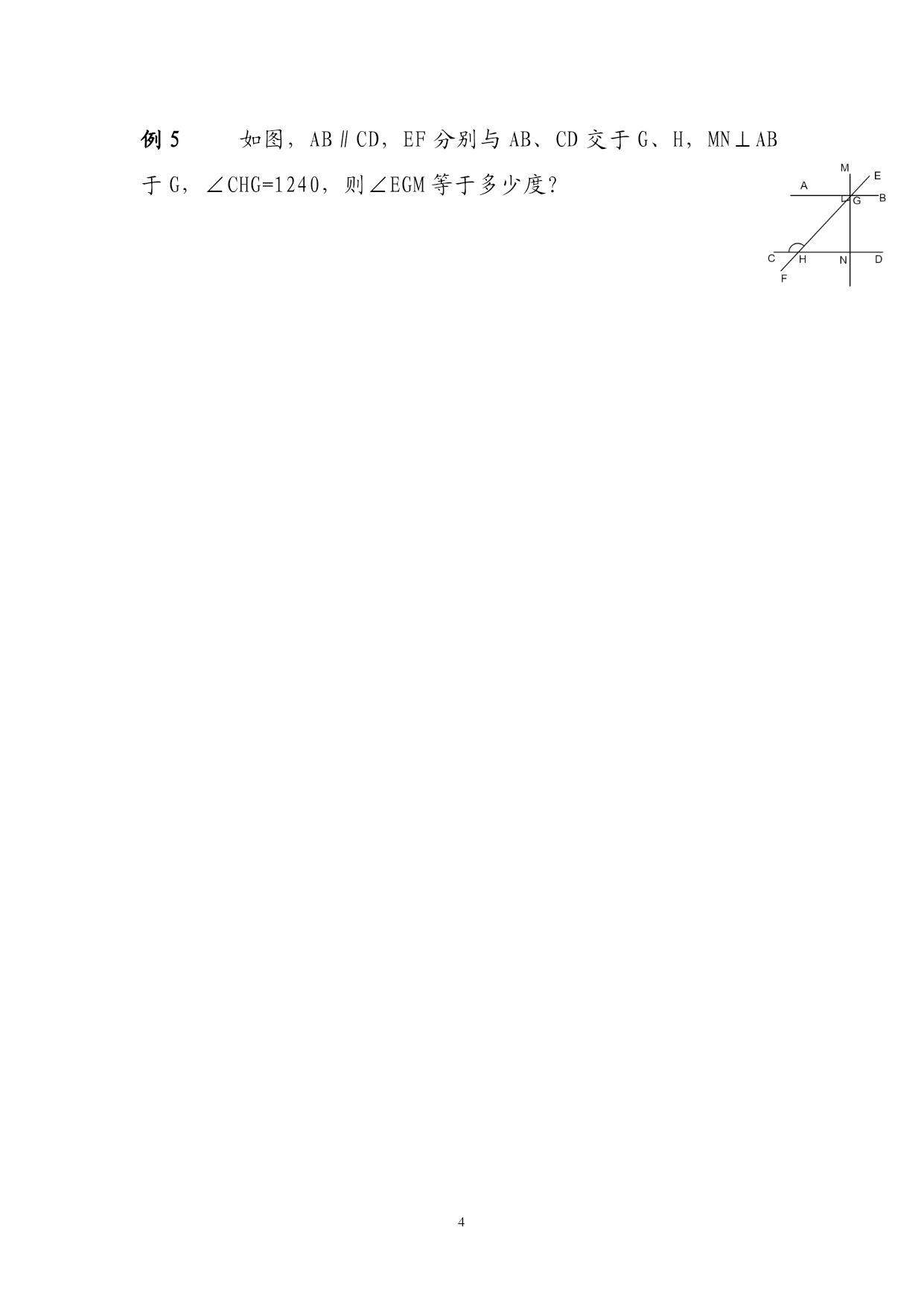 PAGEPAGE4相交线与平行线一、知识结构图相交线相交线垂线同位角、内错角、同旁内角平行线平行线及其判定平行线的判定平行线的性质平行线的性质命题、定理平移二、知识定义邻补角:两条直线相交所构成的四个角中,有公共顶点且有一条公共边的两个角是邻补角。对顶角:一个角的两边分别是另一个叫的两边的反向延长线,像这样的两个角互为对顶角。垂线:两条直线相交成直角时,叫做互相垂直,其中一条叫做另一条的垂线。平行线:在同一平面内,不相交的两条直线叫做平行线。同位角、内错角、同旁内角:同位角:∠1与∠5像这样具有相同位置关系的一对角叫做同位角。内错角:∠2与∠6像这样的一对角叫做内错角。同旁内角:∠2与∠5像这样的一对角叫做同旁内角。命题:判断一件事情的语句叫命题。平移:在平面内,将一个图形沿某个方向移动一定的距离,图形的这种移动叫做平移平移变换,简称平移。对应点:平移后得到的新图形中每一点,都是由原图形中的某一点移动后得到的,这样的两个点叫做对应点。三、定理与性质对顶角的性质:对顶角相等。垂线的性质:性质1:过一点有且只有一条直线与已知直线垂直。性质2:连接直线外一点与直线上各点的所有线段中,垂线段最短。平行公理:经过直线外一点有且只有一条直线与已知直线平行。平行公理的推论:如果两条直线都与第三条直线平行,那么这两条直线也互相平行。平行线的性质:性质1:两直线平行,同位角相等。性质2:两直线平行,内错角相等。性质3:两直线平行,同旁内角互补。平行线的判定:判定1:同位角相等,两直线平行。判定2:内错角相等,两直线平行。判定3:同旁内角相等,两直线平行。四、经典例题例1如图,直线AB,CD,EF相交于点O,∠AOE=54°,∠EOD=90°,求∠EOB,∠COB的度数。例2如图AD平分∠CAE,∠B=350,∠DAE=600,那么∠ACB等于多少?例3三角形的一个外角等于与它相邻的内角的4倍,等于与它不相邻的一个内角的2倍,则这个三角形各角的度数为()。A.450、450、900B.300、600、900C.250、250、1300D.360、720、720例4已知如图,求∠A+∠B+∠C+∠D+∠E+∠F的度数。例5如图,AB∥CD,EF分别与AB、CD交于G、H,MN⊥AB于G,∠CHG=1240,则∠EGM等于多少度?