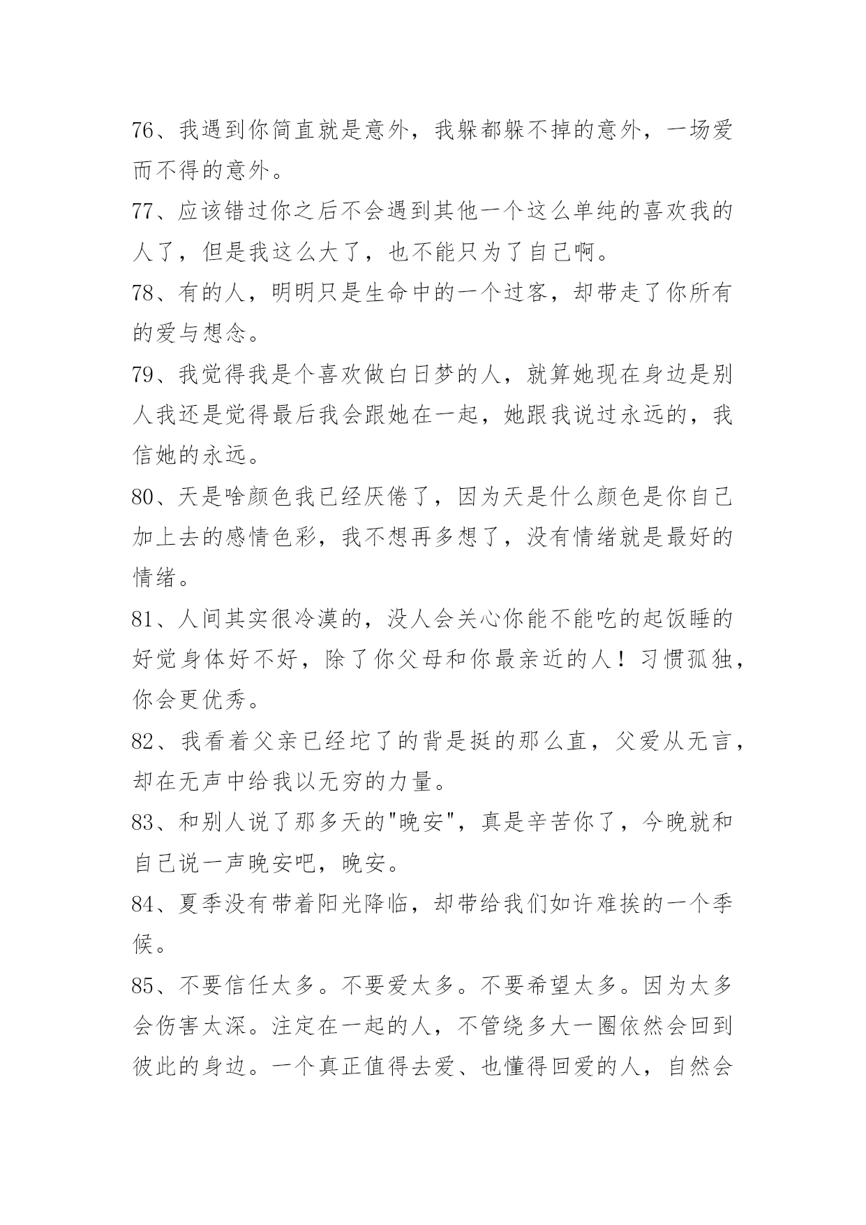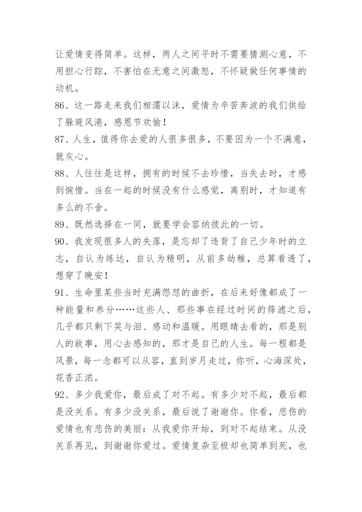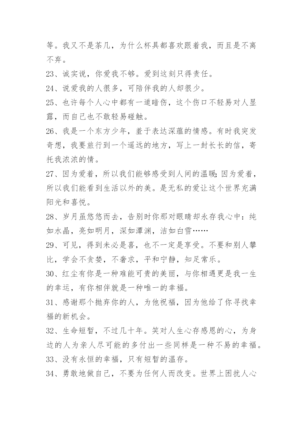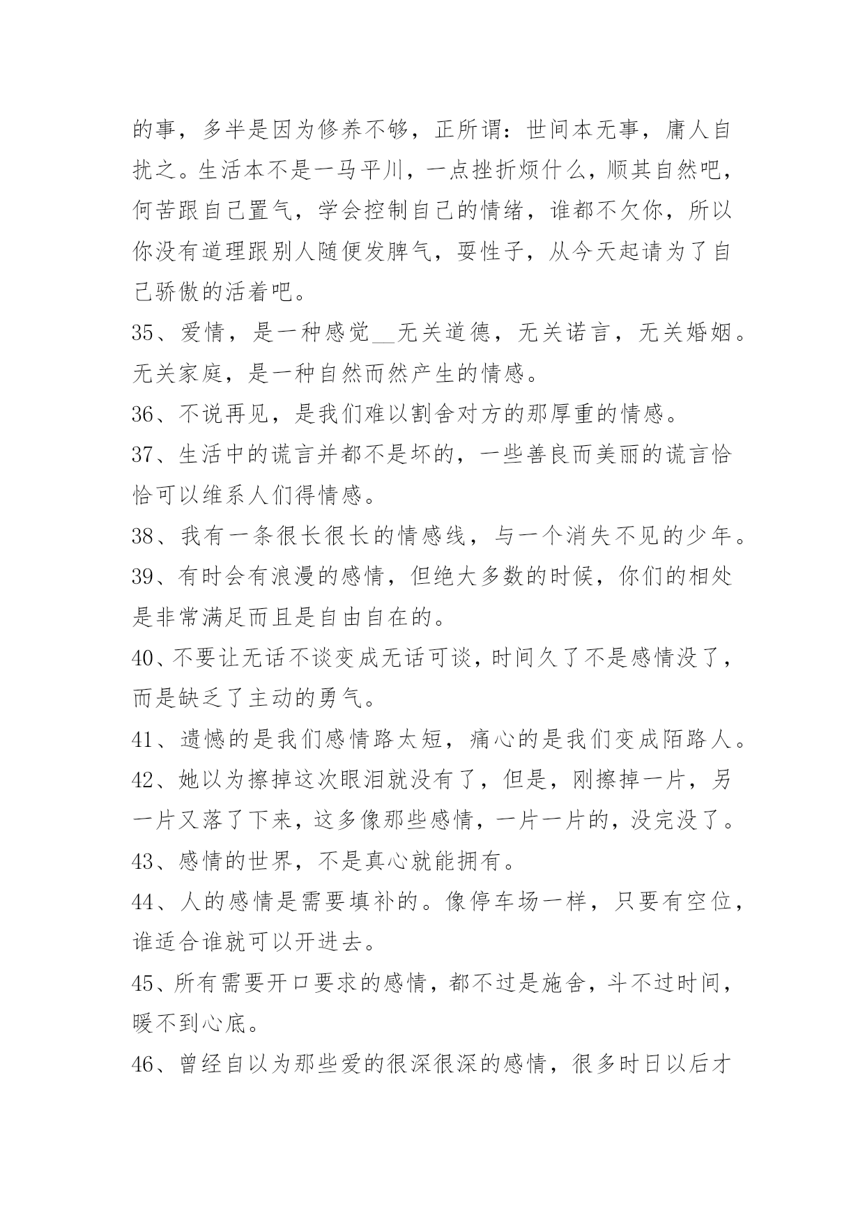 情感的语录95条实用的情感的语录集锦95条无论到了什么时候,陪我的只是我的影子。以下是小编为大家收集的情感的语录95条,欢迎阅读与收藏。1、不论是白银、是黄金,都不是我所恋慕的东西,我只是恋慕着你,心上人,只要我依旧活在人世,我要发誓向你保证我的全部爱情、名誉和忠实。2、当年被他过早埋葬的花,下一世终究开不出诱人的繁华。3、奈何我们怎样拼命的繁华,还是败给了惨白的宿命。4、曾经你给了我太多的如果,也给予了我过多的奢望。5、曾经的天长地久,变成了现在的曾经拥有。6、放下你的浮躁,放下你的懒惰,放下三分钟的热度,放空你禁不住诱惑的大脑,放开你容易被任何事物吸引的眼睛,放淡你什么都想聊两句八卦的嘴巴,静下心来好好做你该做的事。7、你以为你奋不顾身去追逐的就是爱情吗?那不过是欲望!对方也许根本不在乎你的热情与付出!直到你筋疲力尽,最后留在你身边的才是真正的爱人,她总是默默的在这里目睹你的疯狂,从未离开。8、有些情感,不能表露只能刻意隐藏。9、有些人,有些感情,错过了一次,也许就会错过整整的一生。10、往幸福的途中,太多分叉路口,可以迷路,不准退缩。11、为什么我们的幸福悬挂在半空,总是那么遥远。12、到底结果结果幸福不是曹操,不能说到就到。13、不愿自言自语守着秘密,不想注定悲剧只好放弃,更不要人前演戏却又默默哭泣。只想大声告诉你,天涯海角,请一定带我去,不论哪里!14、恋爱往往需要成熟一点的,但是要说完全的了解和熟悉,或者说要百分之百的看透你,看你到底是不是日后特别乖的恋爱对象是很难的,所以所恋爱都是有风险的,婚姻那是女人一生当中最大的冒险。15、我对自己好,什么都感觉不到。只有你对我好,才能感觉的到。幸福。16、我不过是仗着对感情表现出的皮糙肉厚才敢义无反顾地向前,承受所有的难过与疼痛。17、任何吃不下的东西都可以让垃圾桶去吃,同样,任何解决不了的问题都可以让时间去解决。18、玫瑰就是玫瑰,莲花就是莲花,只要去看,不要比较。一味的比较最容易动摇我们的心态,改变我们的初衷,而比较的结果,使人不是自卑,就是自傲,总之是流于平庸。19、你吃醋,你生气表示足够在乎他,而在乎就是那最好的告白。20、花木兰:就是死我也要死在战场上,你会陪我吗?文泰:陪。21、别说爱我多久等我多久我不再是那个只相信你的傻瓜了。22、你说你会等我回来,你确实等了,还找了个人一起陪你等。我又不是茶几,为什么杯具都喜欢跟着我,而且是不离不弃。23、诚实说,你爱我不够。爱到这刻只得责任。24、说爱我的人很多,可陪伴我的人却很少。25、也许每个人心中都有一道暗伤,这个伤口不轻易对人显露,而自己也不敢轻易碰触。26、我是一个东方少年,羞于表达深蕴的情感。有时我突发奇想,我要旅行到一个遥远的地方,写上一封长长的信,寄托我浓浓的情。27、因为爱着,所以我们能够感受到人间的温暖;因为爱着,所以我们能看到生活以外的美。是无私的爱让这个世界充满阳光和喜悦。28、岁月虽悠悠而去,告别时你那对眼睛却永存我心中:纯如水晶,亮如明月,深如潭渊,洁如白雪……29、可见,得到未必是喜,也不一定是享受。不要和别人攀比,学会不贪婪,不奢求,平和宁静,知足常乐。30、红尘有你是一种难能可贵的美丽,与你相遇更是我一生的幸运,有你相伴就是一种唯一的幸福。31、感谢那个抛弃你的人,为他祝福,因为他给了你寻找幸福的新机会。32、生命短暂,不过几十年。笑对人生心存感恩的心,为身边的人为亲人尽可能的多付出一些同样是一种不易的幸福。33、没有永恒的幸福,只有短暂的温存。34、勇敢地做自己,不要为任何人而改变。世界上困扰人心的事,多半是因为修养不够,正所谓:世间本无事,庸人自扰之。生活本不是一马平川,一点挫折烦什么,顺其自然吧,何苦跟自己置气,学会控制自己的情绪,谁都不欠你,所以你没有道理跟别人随便发脾气,耍性子,从今天起请为了自己骄傲的活着吧。35、爱情,是一种感觉__无关道德,无关诺言,无关婚姻。无关家庭,是一种自然而然产生的情感。36、不说再见,是我们难以割舍对方的那厚重的情感。37、生活中的谎言并都不是坏的,一些善良而美丽的谎言恰恰可以维系人们得情感。38、我有一条很长很长的情感线,与一个消失不见的少年。39、有时会有浪漫的感情,但绝大多数的时候,你们的相处是非常满足而且是自由自在的。40、不要让无话不谈变成无话可谈,时间久了不是感情没了,而是缺乏了主动的勇气。41、遗憾的是我们感情路太短,痛心的是我们变成陌路人。42、她以为擦掉这次眼泪就没有了,但是,刚擦掉一片,另一片又落了下来,这多像那些感情,一片一片的,没完没了。43、感情的世界,不是真心就能拥有。44、人的感情是需要填补的。像停车场一样,只要有空位,谁适合谁就可以开进去。45、所有需要开口要求的感情,都不过是施舍,斗不过时间,暖不到心底。46、
