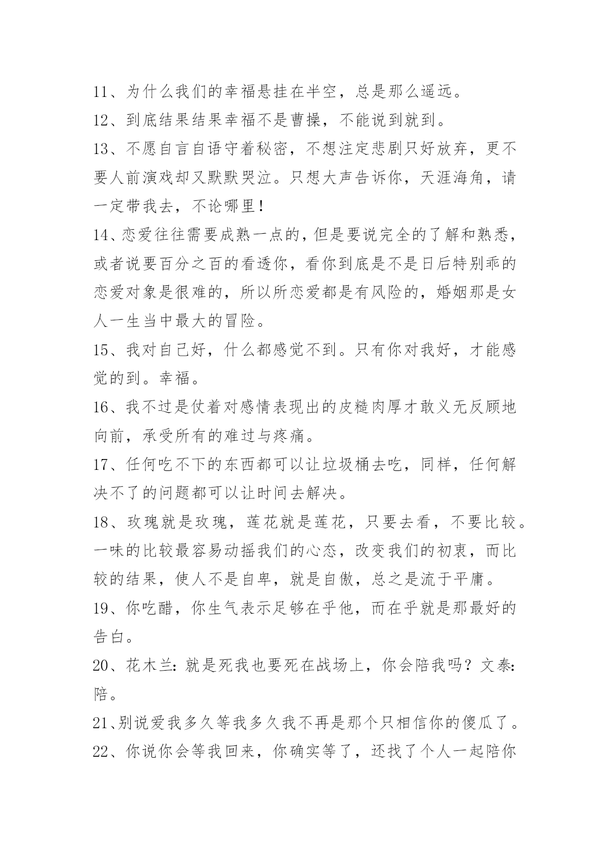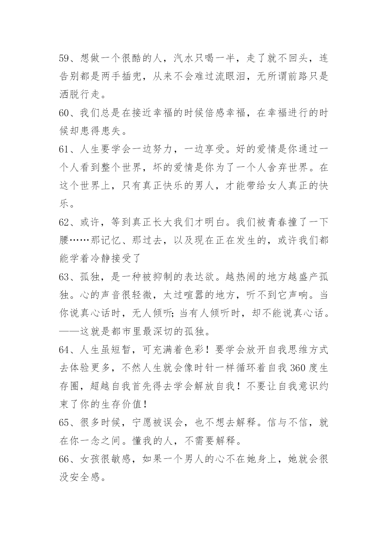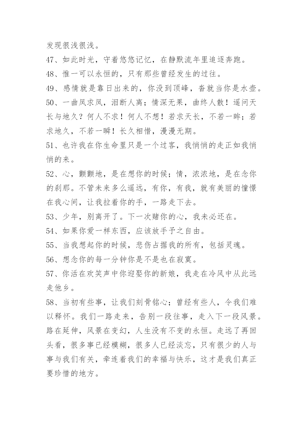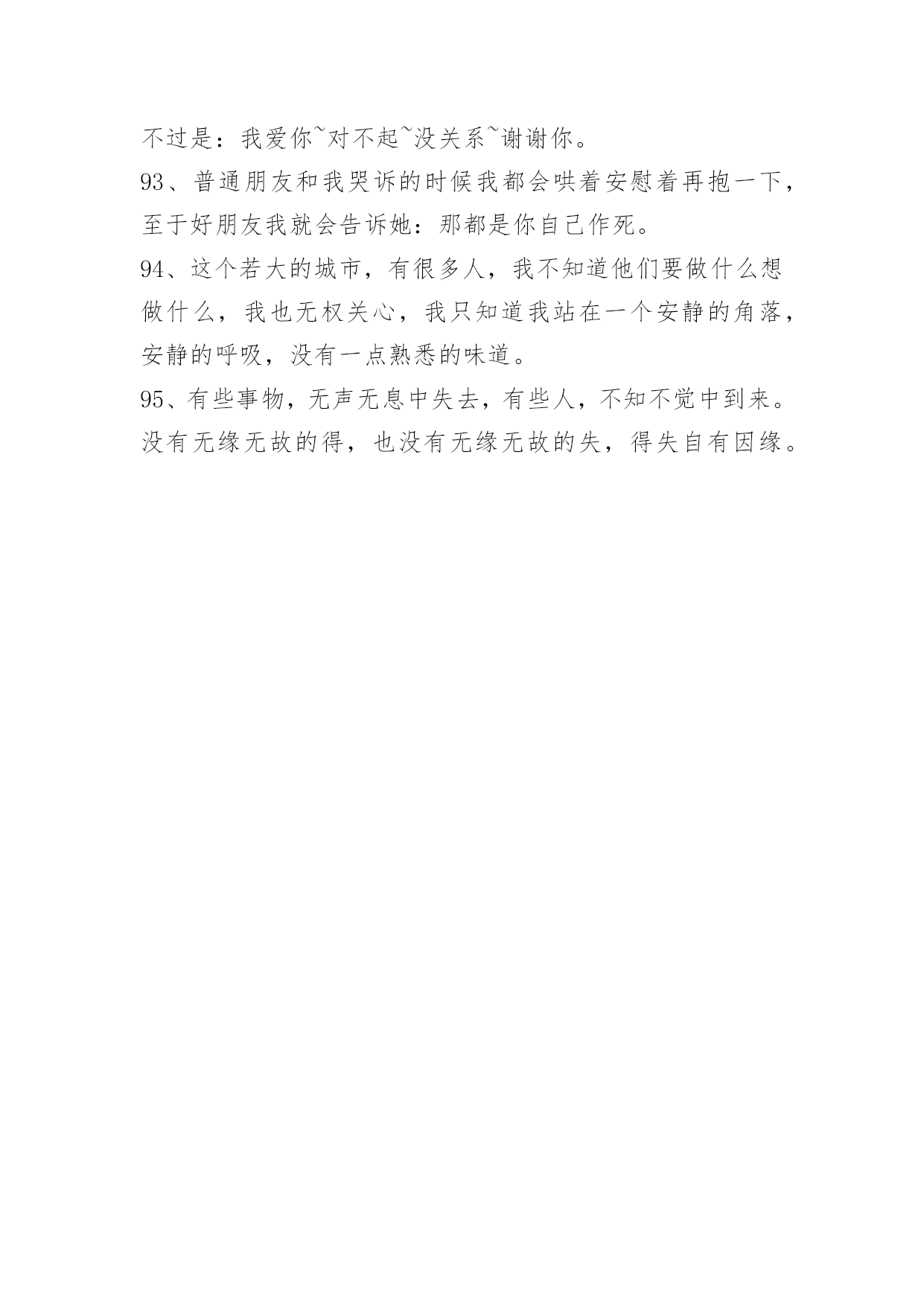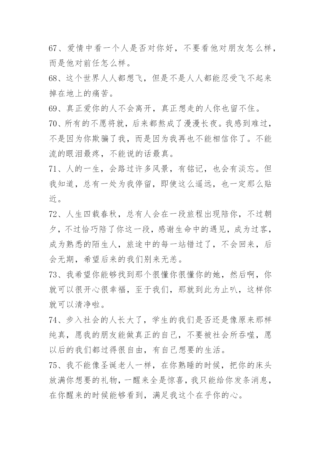 情感的语录95条实用的情感的语录集锦95条无论到了什么时候,陪我的只是我的影子。以下是小编为大家收集的情感的语录95条,欢迎阅读与收藏。1、不论是白银、是黄金,都不是我所恋慕的东西,我只是恋慕着你,心上人,只要我依旧活在人世,我要发誓向你保证我的全部爱情、名誉和忠实。2、当年被他过早埋葬的花,下一世终究开不出诱人的繁华。3、奈何我们怎样拼命的繁华,还是败给了惨白的宿命。4、曾经你给了我太多的如果,也给予了我过多的奢望。5、曾经的天长地久,变成了现在的曾经拥有。6、放下你的浮躁,放下你的懒惰,放下三分钟的热度,放空你禁不住诱惑的大脑,放开你容易被任何事物吸引的眼睛,放淡你什么都想聊两句八卦的嘴巴,静下心来好好做你该做的事。7、你以为你奋不顾身去追逐的就是爱情吗?那不过是欲望!对方也许根本不在乎你的热情与付出!直到你筋疲力尽,最后留在你身边的才是真正的爱人,她总是默默的在这里目睹你的疯狂,从未离开。8、有些情感,不能表露只能刻意隐藏。9、有些人,有些感情,错过了一次,也许就会错过整整的一生。10、往幸福的途中,太多分叉路口,可以迷路,不准退缩。11、为什么我们的幸福悬挂在半空,总是那么遥远。12、到底结果结果幸福不是曹操,不能说到就到。13、不愿自言自语守着秘密,不想注定悲剧只好放弃,更不要人前演戏却又默默哭泣。只想大声告诉你,天涯海角,请一定带我去,不论哪里!14、恋爱往往需要成熟一点的,但是要说完全的了解和熟悉,或者说要百分之百的看透你,看你到底是不是日后特别乖的恋爱对象是很难的,所以所恋爱都是有风险的,婚姻那是女人一生当中最大的冒险。15、我对自己好,什么都感觉不到。只有你对我好,才能感觉的到。幸福。16、我不过是仗着对感情表现出的皮糙肉厚才敢义无反顾地向前,承受所有的难过与疼痛。17、任何吃不下的东西都可以让垃圾桶去吃,同样,任何解决不了的问题都可以让时间去解决。18、玫瑰就是玫瑰,莲花就是莲花,只要去看,不要比较。一味的比较最容易动摇我们的心态,改变我们的初衷,而比较的结果,使人不是自卑,就是自傲,总之是流于平庸。19、你吃醋,你生气表示足够在乎他,而在乎就是那最好的告白。20、花木兰:就是死我也要死在战场上,你会陪我吗?文泰:陪。21、别说爱我多久等我多久我不再是那个只相信你的傻瓜了。22、你说你会等我回来,你确实等了,还找了个人一起陪你等。我又不是茶几,为什么杯具都喜欢跟着我,而且是不离不弃。23、诚实说,你爱我不够。爱到这刻只得责任。24、说爱我的人很多,可陪伴我的人却很少。25、也许每个人心中都有一道暗伤,这个伤口不轻易对人显露,而自己也不敢轻易碰触。26、我是一个东方少年,羞于表达深蕴的情感。有时我突发奇想,我要旅行到一个遥远的地方,写上一封长长的信,寄托我浓浓的情。27、因为爱着,所以我们能够感受到人间的温暖;因为爱着,所以我们能看到生活以外的美。是无私的爱让这个世界充满阳光和喜悦。28、岁月虽悠悠而去,告别时你那对眼睛却永存我心中:纯如水晶,亮如明月,深如潭渊,洁如白雪……29、可见,得到未必是喜,也不一定是享受。不要和别人攀比,学会不贪婪,不奢求,平和宁静,知足常乐。30、红尘有你是一种难能可贵的美丽,与你相遇更是我一生的幸运,有你相伴就是一种唯一的幸福。31、感谢那个抛弃你的人,为他祝福,因为他给了你寻找幸福的新机会。32、生命短暂,不过几十年。笑对人生心存感恩的心,为身边的人为亲人尽可能的多付出一些同样是一种不易的幸福。33、没有永恒的幸福,只有短暂的温存。34、勇敢地做自己,不要为任何人而改变。世界上困扰人心的事,多半是因为修养不够,正所谓:世间本无事,庸人自扰之。生活本不是一马平川,一点挫折烦什么,顺其自然吧,何苦跟自己置气,学会控制自己的情绪,谁都不欠你,所以你没有道理跟别人随便发脾气,耍性子,从今天起请为了自己骄傲的活着吧。35、爱情,是一种感觉__无关道德,无关诺言,无关婚姻。无关家庭,是一种自然而然产生的情感。36、不说再见,是我们难以割舍对方的那厚重的情感。37、生活中的谎言并都不是坏的,一些善良而美丽的谎言恰恰可以维系人们得情感。38、我有一条很长很长的情感线,与一个消失不见的少年。39、有时会有浪漫的感情,但绝大多数的时候,你们的相处是非常满足而且是自由自在的。40、不要让无话不谈变成无话可谈,时间久了不是感情没了,而是缺乏了主动的勇气。41、遗憾的是我们感情路太短,痛心的是我们变成陌路人。42、她以为擦掉这次眼泪就没有了,但是,刚擦掉一片,另一片又落了下来,这多像那些感情,一片一片的,没完没了。43、感情的世界,不是真心就能拥有。44、人的感情是需要填补的。像停车场一样,只要有空位,谁适合谁就可以开进去。45、所有需要开口要求的感情,都不过是施舍,斗不过时间,暖不到心底。46、