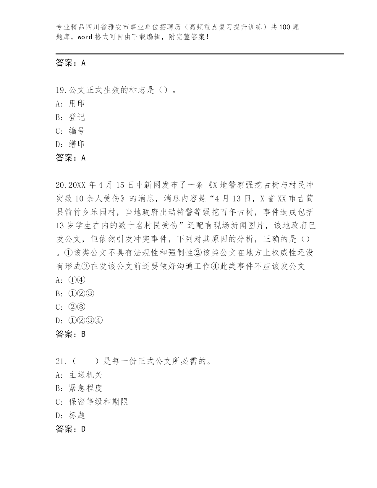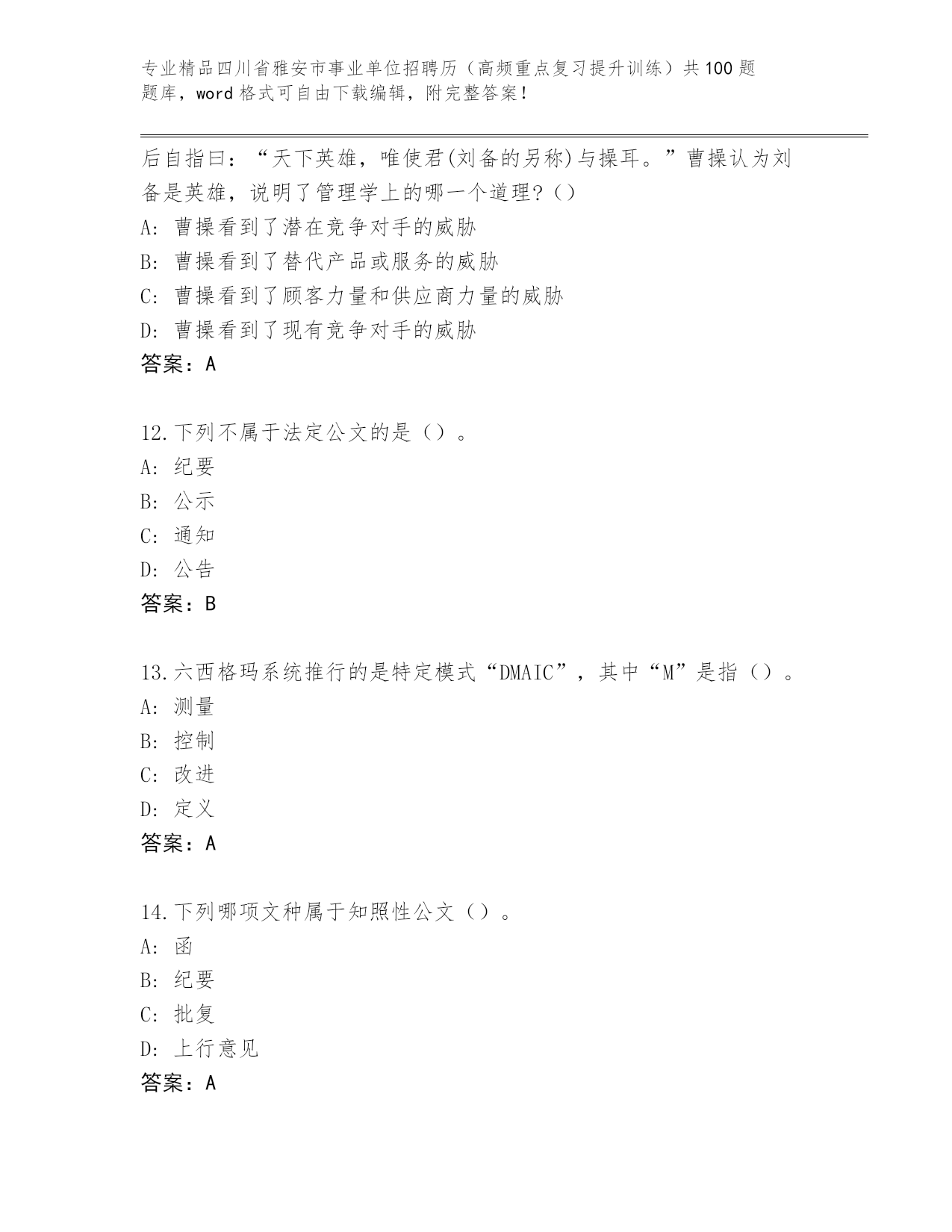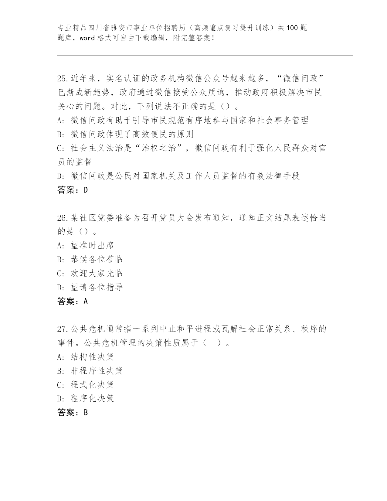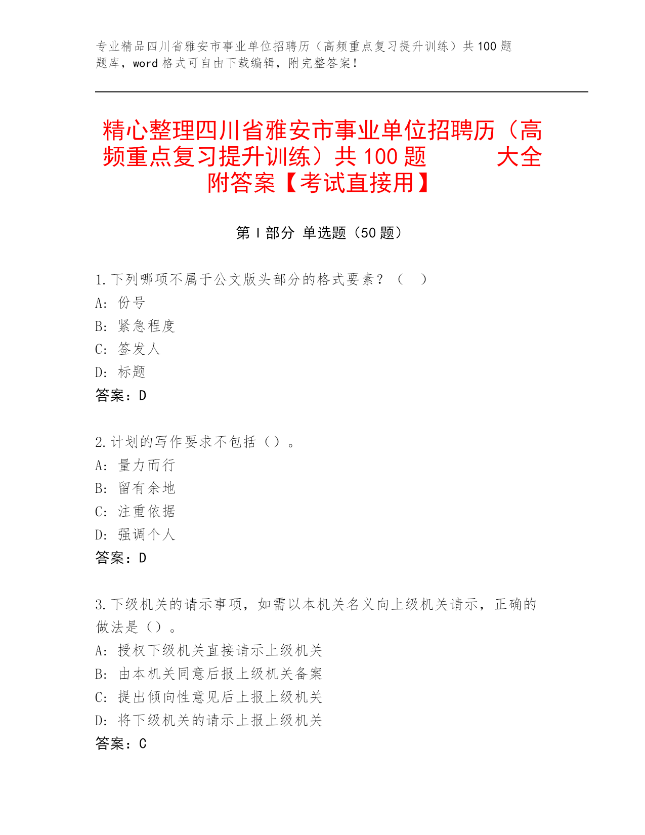精心整理四川省雅安市事业单位招聘历(高频重点复习提升训练)共100题大全附答案【考试直接用】.docx