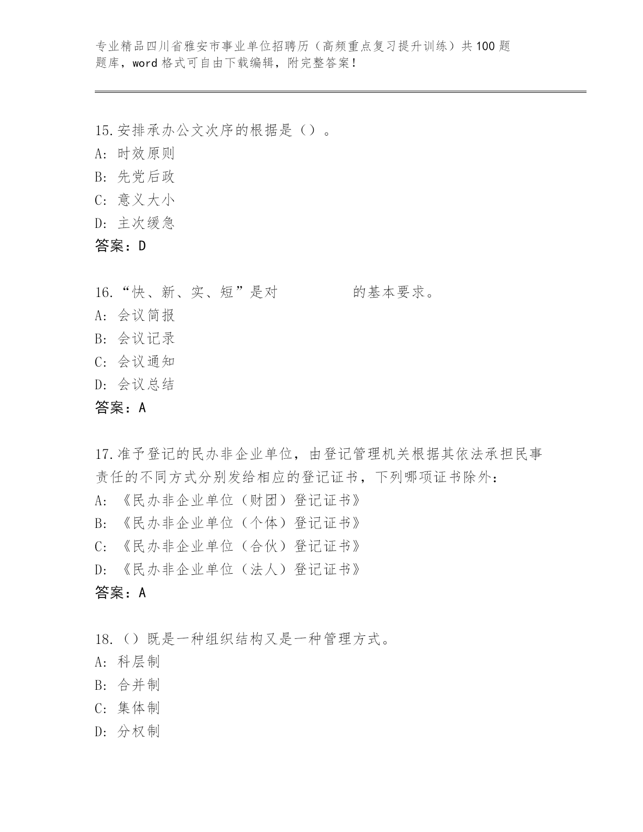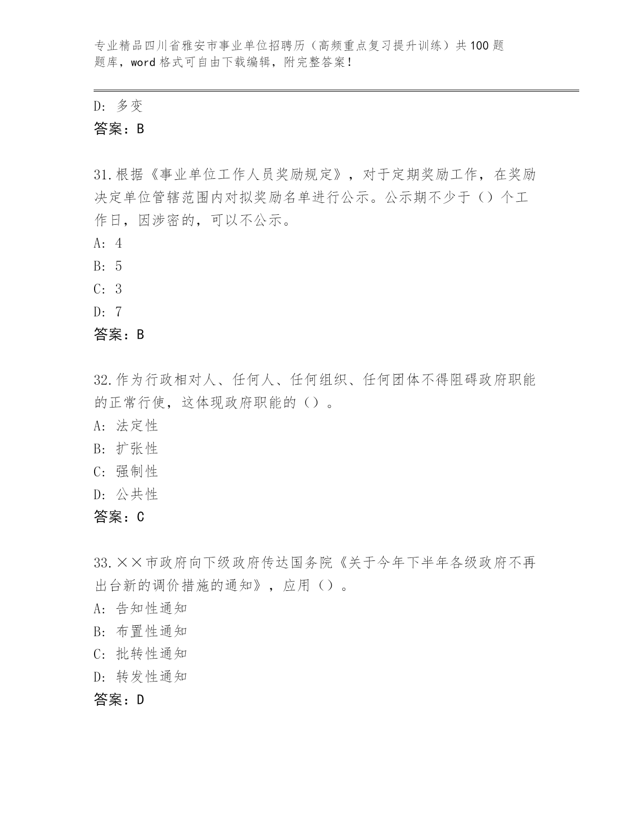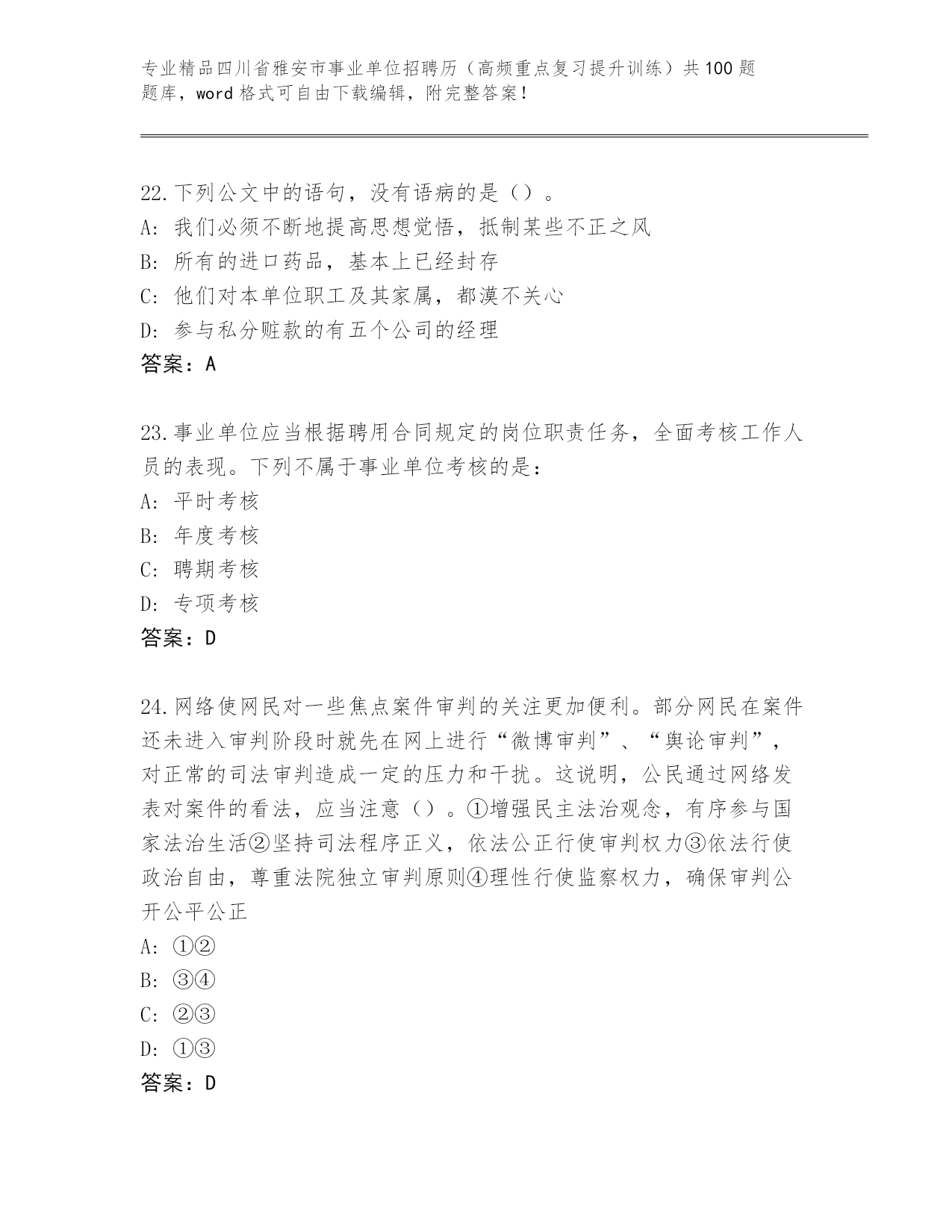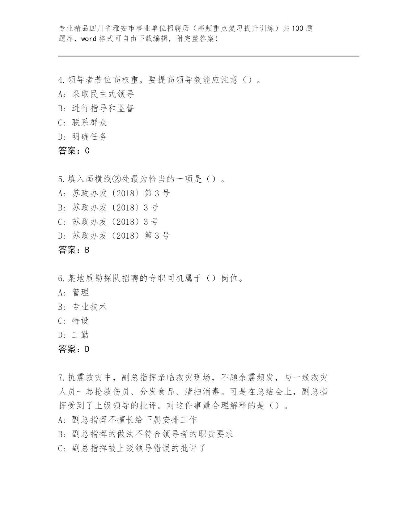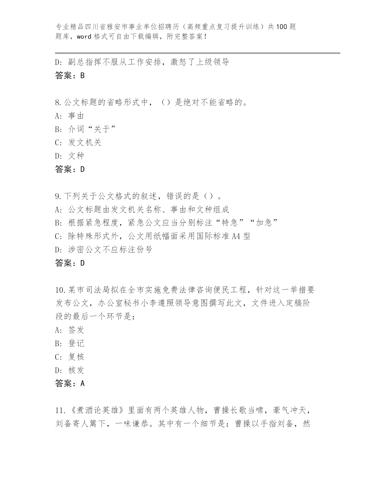 精心整理四川省雅安市事业单位招聘历(高频重点复习提升训练)共100题大全附答案【考试直接用】.docx