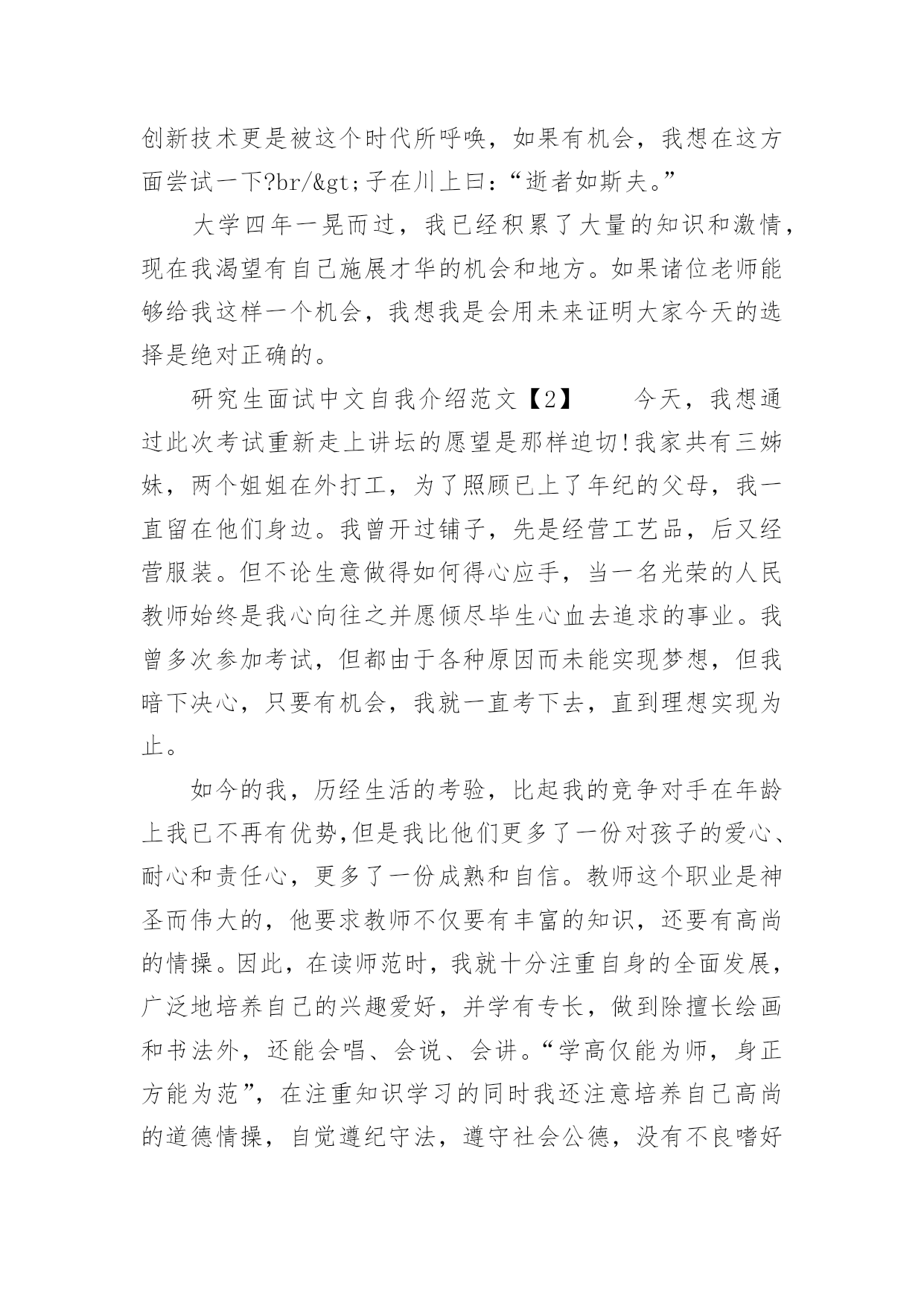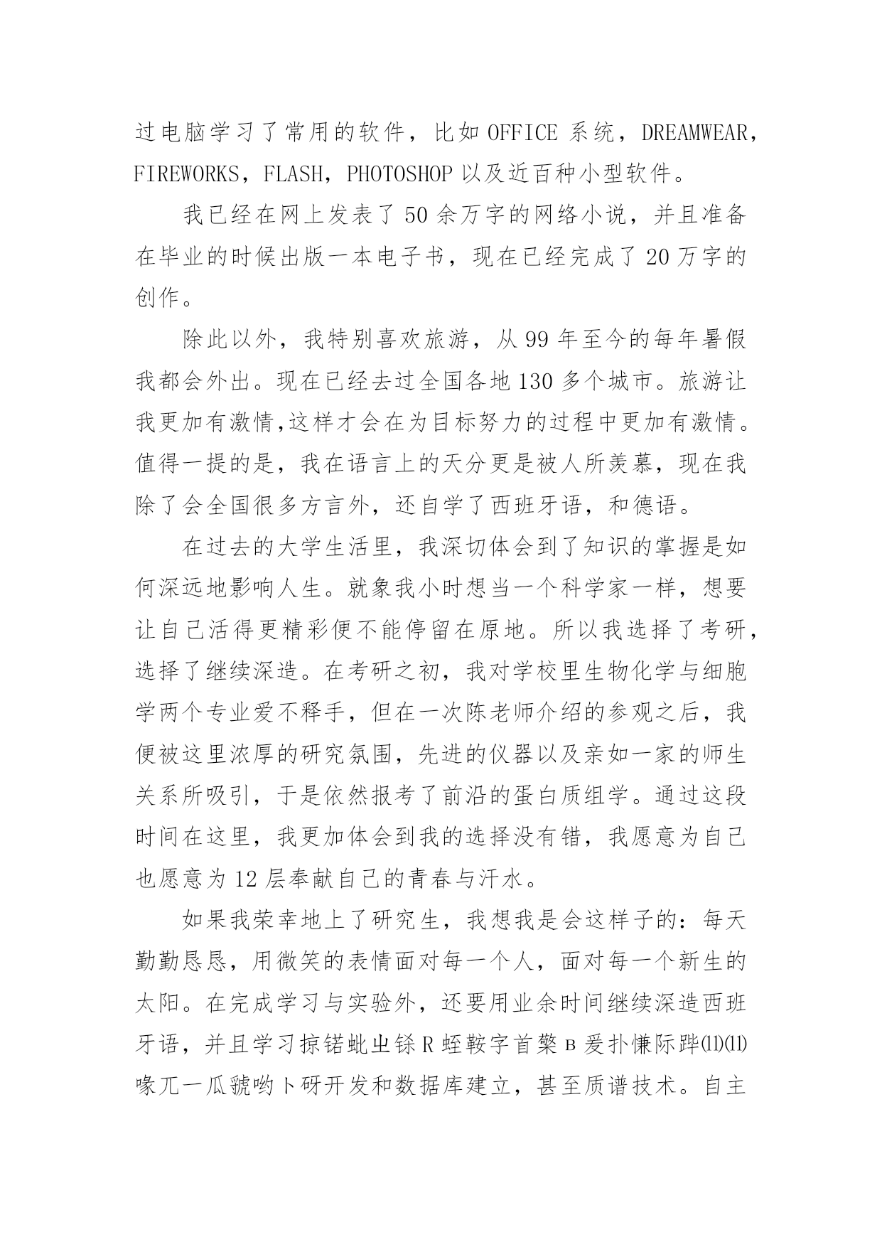 研究生面试中文自我介绍研究生面试中文自我介绍范文自我介绍是向别人展示你自我介绍好不好,甚至直接关系到你给别人的第一印象的好坏及以后交往的顺利与否。同时,也是认识自我的手段。以下是小编整理的关于研究生面试中文自我介绍范文,欢迎阅读参考。研究生面试中文自我介绍范文【1】早上好,各位尊敬的老师,我很荣幸今天有这样面试的机会。我叫xxx,今年22岁,是这所大学的应届毕业生,在今年考研的时候我报选了李铮老师的蛋白质组学。现在我在12层上完成本科毕业论文。论文内容关于建立双向电泳技术,恰好是蛋白质组学研究的基础工作。下面我来简单自我介绍下我自己。我从小就特别喜欢生物,并立志当一个生物学家。现在家里还有两阳台的花草鱼虫,书柜中更是摆满了生物类书籍。我还曾经在奥林匹克生物竞赛上获得全国第三名。我在这个城市中长大,在家庭的熏陶下涉猎群书,学习自己喜欢的东西。忘我的程度总是让我喜欢专注于一件事情,不达目的誓不摆休。如果日后荣幸和老师们一起共事,你们便可以从我以前的生活中略见一斑。我的.性格十分随和,好交朋友。别人对我的评价是:和我在一起十分快乐。我的兴趣非常广泛,在大学期间除了对本专业内容产生浓厚兴趣并深得一些老师喜欢外,我还通过电脑学习了常用的软件,比如OFFICE系统,DREAMWEAR,FIREWORKS,FLASH,PHOTOSHOP以及近百种小型软件。我已经在网上发表了50余万字的网络小说,并且准备在毕业的时候出版一本电子书,现在已经完成了20万字的创作。除此以外,我特别喜欢旅游,从99年至今的每年暑假我都会外出。现在已经去过全国各地130多个城市。旅游让我更加有激情,这样才会在为目标努力的过程中更加有激情。值得一提的是,我在语言上的天分更是被人所羡慕,现在我除了会全国很多方言外,还自学了西班牙语,和德语。在过去的大学生活里,我深切体会到了知识的掌握是如何深远地影响人生。就象我小时想当一个科学家一样,想要让自己活得更精彩便不能停留在原地。所以我选择了考研,选择了继续深造。在考研之初,我对学校里生物化学与细胞学两个专业爱不释手,但在一次陈老师介绍的参观之后,我便被这里浓厚的研究氛围,先进的仪器以及亲如一家的师生关系所吸引,于是依然报考了前沿的蛋白质组学。通过这段时间在这里,我更加体会到我的选择没有错,我愿意为自己也愿意为12层奉献自己的青春与汗水。如果我荣幸地上了研究生,我想我是会这样子的:每天勤勤恳恳,用微笑的表情面对每一个人,面对每一个新生的太阳。在完成学习与实验外,还要用业余时间继续深造西班牙语,并且学习掠锘蚍ㄓ铩R蛭鞍字首檠в爰扑慊际跸⑾⑾喙兀一瓜虢哟ト砑开发和数据库建立,甚至质谱技术。自主创新技术更是被这个时代所呼唤,如果有机会,我想在这方面尝试一下?br/>子在川上曰:“逝者如斯夫。”大学四年一晃而过,我已经积累了大量的知识和激情,现在我渴望有自己施展才华的机会和地方。如果诸位老师能够给我这样一个机会,我想我是会用未来证明大家今天的选择是绝对正确的。研究生面试中文自我介绍范文【2】今天,我想通过此次考试重新走上讲坛的愿望是那样迫切!我家共有三姊妹,两个姐姐在外打工,为了照顾已上了年纪的父母,我一直留在他们身边。我曾开过铺子,先是经营工艺品,后又经营服装。但不论生意做得如何得心应手,当一名光荣的人民教师始终是我心向往之并愿倾尽毕生心血去追求的事业。我曾多次参加考试,但都由于各种原因而未能实现梦想,但我暗下决心,只要有机会,我就一直考下去,直到理想实现为止。如今的我,历经生活的考验,比起我的竞争对手在年龄上我已不再有优势,但是我比他们更多了一份对孩子的爱心、耐心和责任心,更多了一份成熟和自信。教师这个职业是神圣而伟大的,他要求教师不仅要有丰富的知识,还要有高尚的情操。因此,在读师范时,我就十分注重自身的全面发展,广泛地培养自己的兴趣爱好,并学有专长,做到除擅长绘画和书法外,还能会唱、会说、会讲。“学高仅能为师,身正方能为范”,在注重知识学习的同时我还注意培养自己高尚的道德情操,自觉遵纪守法,遵守社会公德,没有不良嗜好和行为。我想这些都是一名教育工作者应该具备的最起码的素养。您现在阅读的文章来自“中国人才指南网”,请记住我们的永久域名:假如,我通过了面试,成为众多教师队伍中的成员,我将不断努力学习,努力工作,为家乡的教育事业贡献自己的力量,决不辜负“人类灵魂的工程师”这个光荣的称号。
