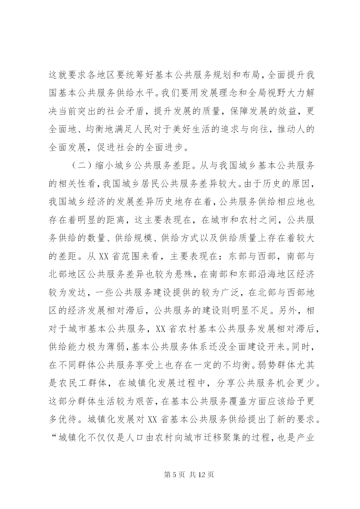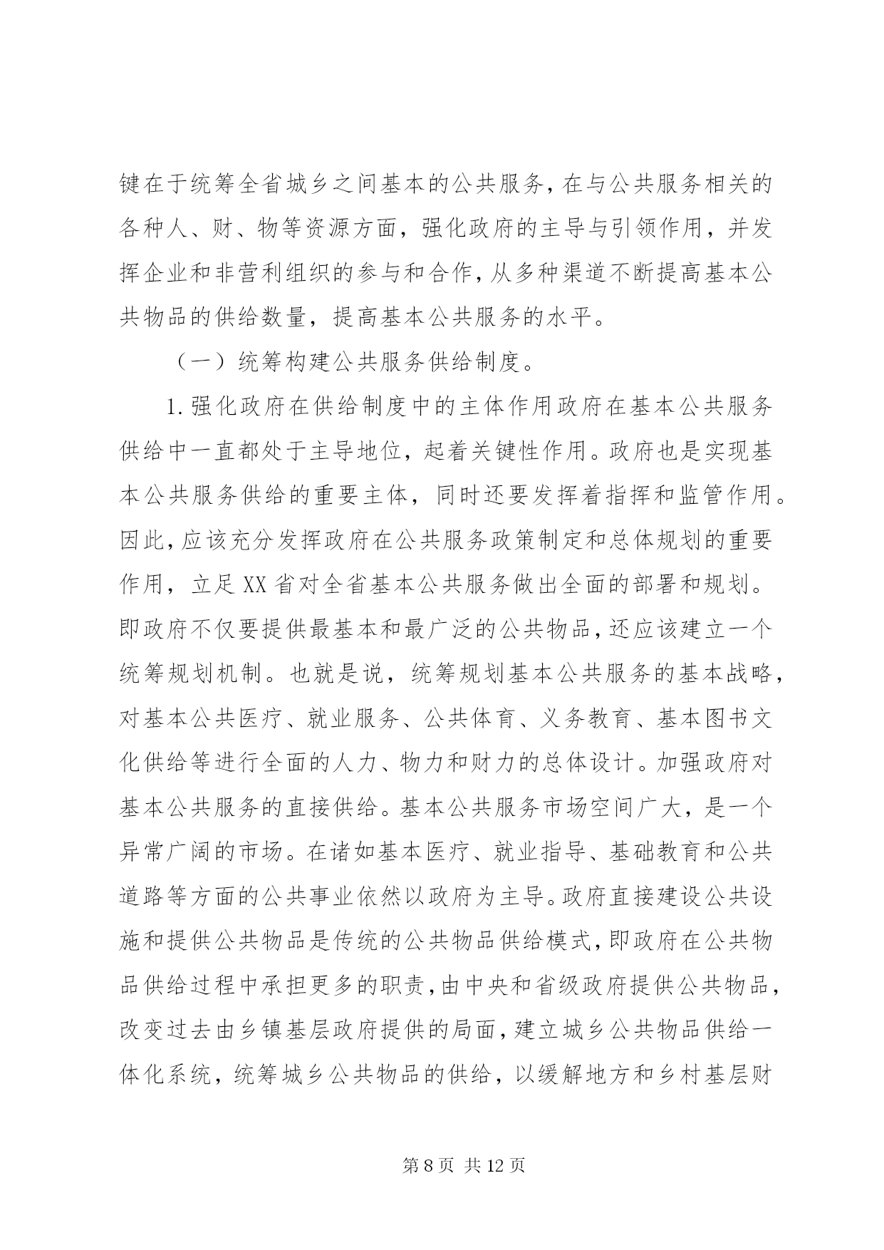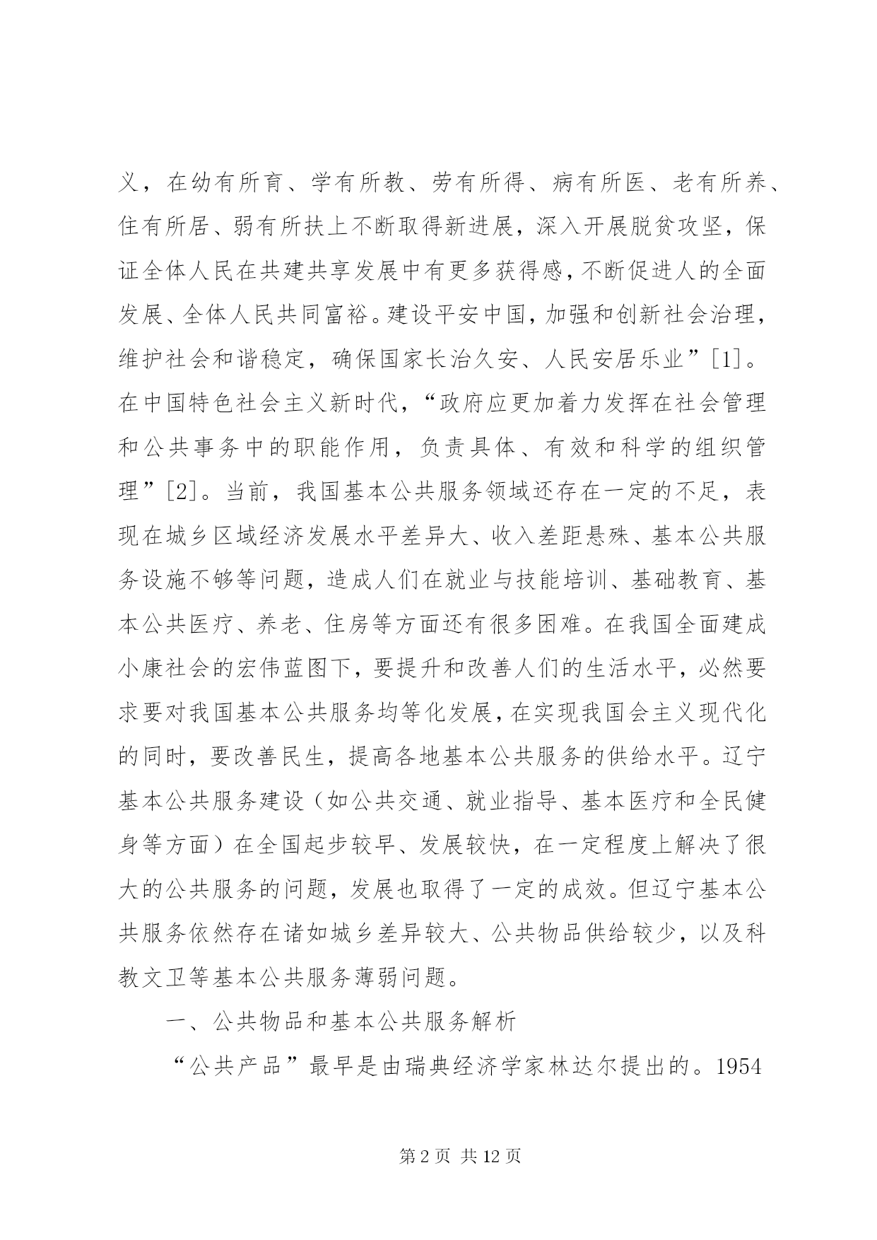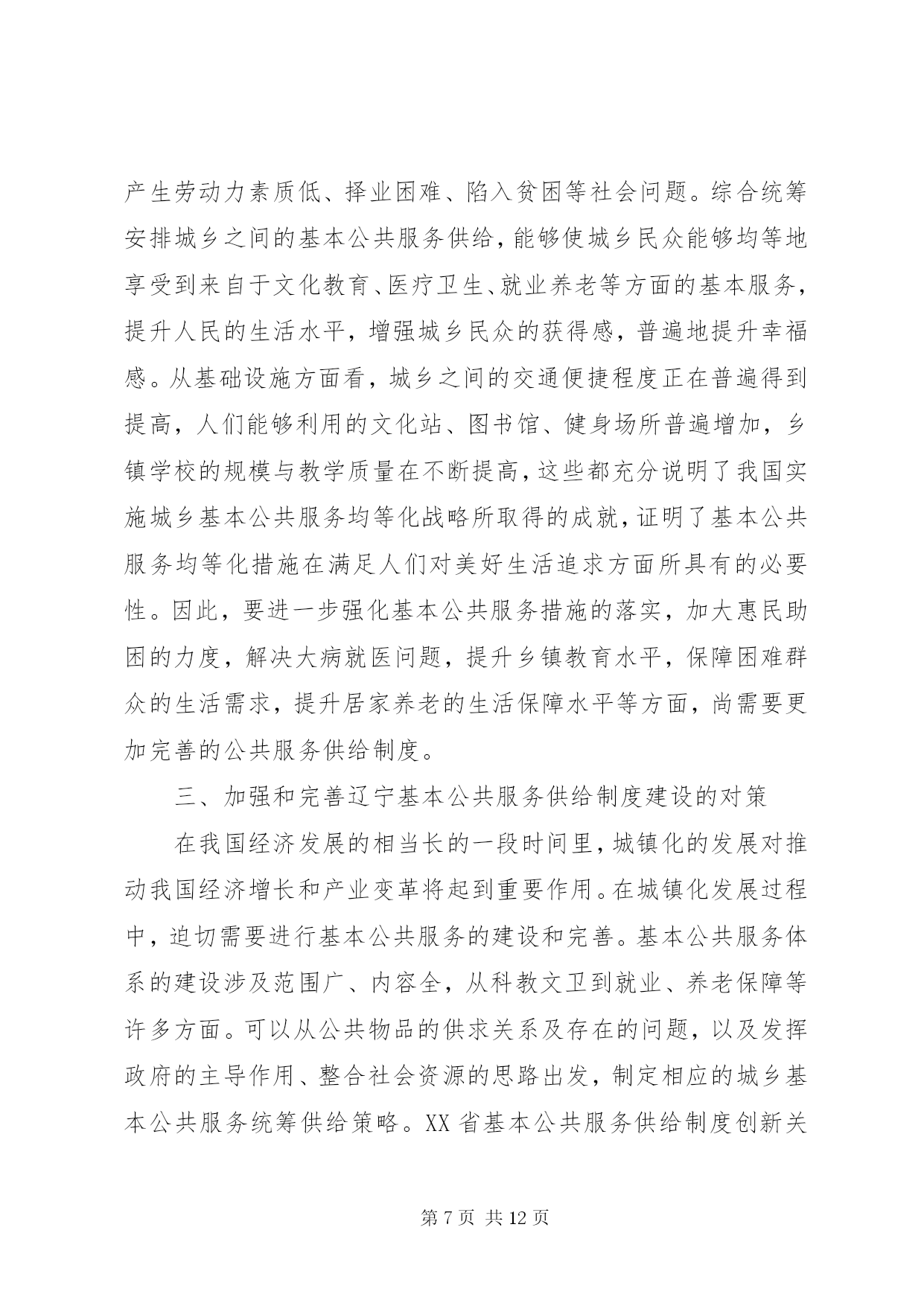 第PAGE\*Arabic\*MERGEFORMAT12页共NUMPAGES\*MERGEFORMAT12页公共服务统筹供给制度建设分析摘要。基本公共服务水平的提高是改善人们生活水平和提高生活品质的重要标志之一。辽宁基本公共服务建设在全国起步较早、发展较快,在一定程度上解决了很大的公共服务的问题,发展也取得了一定的成效。但辽宁基本公共服务依然存在诸如城乡差异较大、公共物品供给较少,以及科教文卫等基本公共服务薄弱等问题。通过统筹构建公共服务供给制度、创新基本公共服务融资制度、完善城乡基本公共服务监督与管理制度等,可以加强和完善辽宁基本公共服务供给制度建设。关键词:辽宁;基本公共服务;城乡;均等化公平正义是社会发展进步的一种价值取向,是人类追求美好生活的一个永恒主题。社会的进步和国家的发展,不仅要看经济实力的发展状况,还要看社会的公平正义。党的十九大报告在“提高保障和改善民生水平,加强和创新社会治理”篇提出了“坚持人人尽责、人人享有,坚持底线、突出重点、完善制度、引导预期,完善公共服务体系,不断促进社会公平正义,形成有效的社会治理、良好的社会秩序,使人民获得感、幸福感、安全感更加充实、更有保障、更可持续”[1]。习近平总书记在讲到“新时代中国特色社会主义思想和基本方略”时,指出要“坚持发展保障和改善民生。增进民生福祉是发展的根本目的。必须多谋民生之利、多解民生之忧,在发展中补齐民生短板、促进社会公平正义,在幼有所育、学有所教、劳有所得、病有所医、老有所养、住有所居、弱有所扶上不断取得新进展,深入开展脱贫攻坚,保证全体人民在共建共享发展中有更多获得感,不断促进人的全面发展、全体人民共同富裕。建设平安中国,加强和创新社会治理,维护社会和谐稳定,确保国家长治久安、人民安居乐业”[1]。在中国特色社会主义新时代,“政府应更加着力发挥在社会管理和公共事务中的职能作用,负责具体、有效和科学的组织管理”[2]。当前,我国基本公共服务领域还存在一定的不足,表现在城乡区域经济发展水平差异大、收入差距悬殊、基本公共服务设施不够等问题,造成人们在就业与技能培训、基础教育、基本公共医疗、养老、住房等方面还有很多困难。在我国全面建成小康社会的宏伟蓝图下,要提升和改善人们的生活水平,必然要求要对我国基本公共服务均等化发展,在实现我国会主义现代化的同时,要改善民生,提高各地基本公共服务的供给水平。辽宁基本公共服务建设(如公共交通、就业指导、基本医疗和全民健身等方面)在全国起步较早、发展较快,在一定程度上解决了很大的公共服务的问题,发展也取得了一定的成效。但辽宁基本公共服务依然存在诸如城乡差异较大、公共物品供给较少,以及科教文卫等基本公共服务薄弱问题。一、公共物品和基本公共服务解析“公共产品”最早是由瑞典经济学家林达尔提出的。1954年,萨缪尔森首次对“公共产品”这一概念进行定义,认为公共产品是“必须由集团中的所有成员均等消费的产品。如果集体中的任何一个成员可以得到一个单位,那么根据定义,该集团的每一个其他成员也可以得到一个单位”[3]。随后在他的《经济学》版本中不断改进和完善,在第18版中提出“公共物品是指将效用扩展于他人的成本为零,并且无法排除他人参与共享的一种商品”[4]。萨缪尔森认为,公共物品在消费中具有非排他性和非竞争性。2008年,在《中共中央、国务院关于切实加强农业基础设施,进一步促进农业发展农民增收的若干意见》中,界定基本公共服务的内容主要包括:义务教育、医疗服务、低生育、公共文化、社会保障、扶贫开发、公共交通、人居环境等。一些学者从研究角度对基本公共服务进行范围划分,认为“基本公共服务包括基础教育、社会保障、公共卫生与公共安全、基本医疗、基础设施、就业、公共文化、环境保护等内容”[5]。在此基础上,进一步探索基本公共服务均等化问题。基本公共服务的均等化是政府对全体社会成员公平地平等地提供基本的公共产品和基本的公共服务。这是社会成员生存与发展所需要的最基本的条件,体现社会公平正义原则,但是均等化不是平均化,而是由非均等化状态向均等化状态逐步转化的一个动态过程。一些学者总结了我国的具体情况,从基本公共服务的内容上探讨均等化的问题,认为“从我国国情看,基本公共服务均等化主要包括四个方面。”[6]基本的民生服务包括就业、社会救助、养老保障,公共事业服务包括科学技术、公共卫生、义务教育和公共文化等,公益基础服务包括基本公共设施建设、生态维护、环境治理等,公共安全服务包括生产安全、消费安全、国防安全等。当前城乡基本公共服务均等化的内容也主要包括基础教育、基础医疗卫生和社会保障等内容。在供给方面,还需特殊提供适宜农村地区特有的农村基础设施、农业信息、科技服务和技术培训等内容。二、统筹基本公共服务供给的必要性(一)统筹基本公共服务能够
