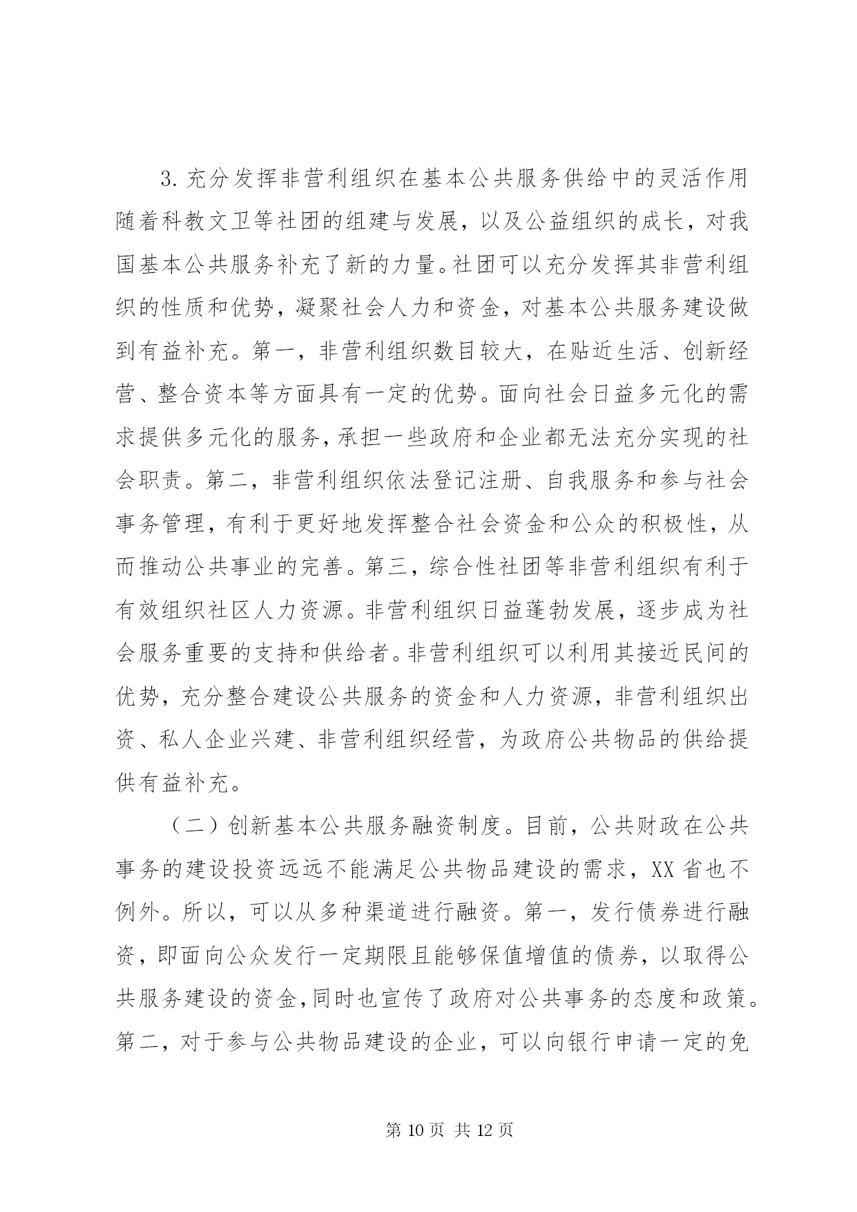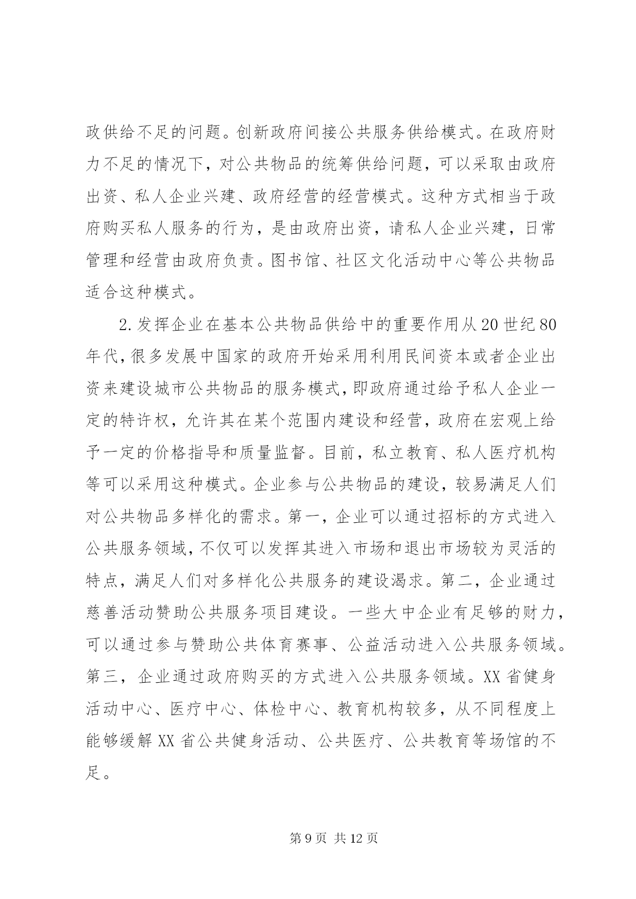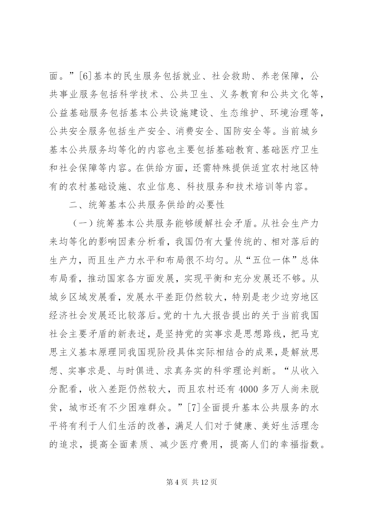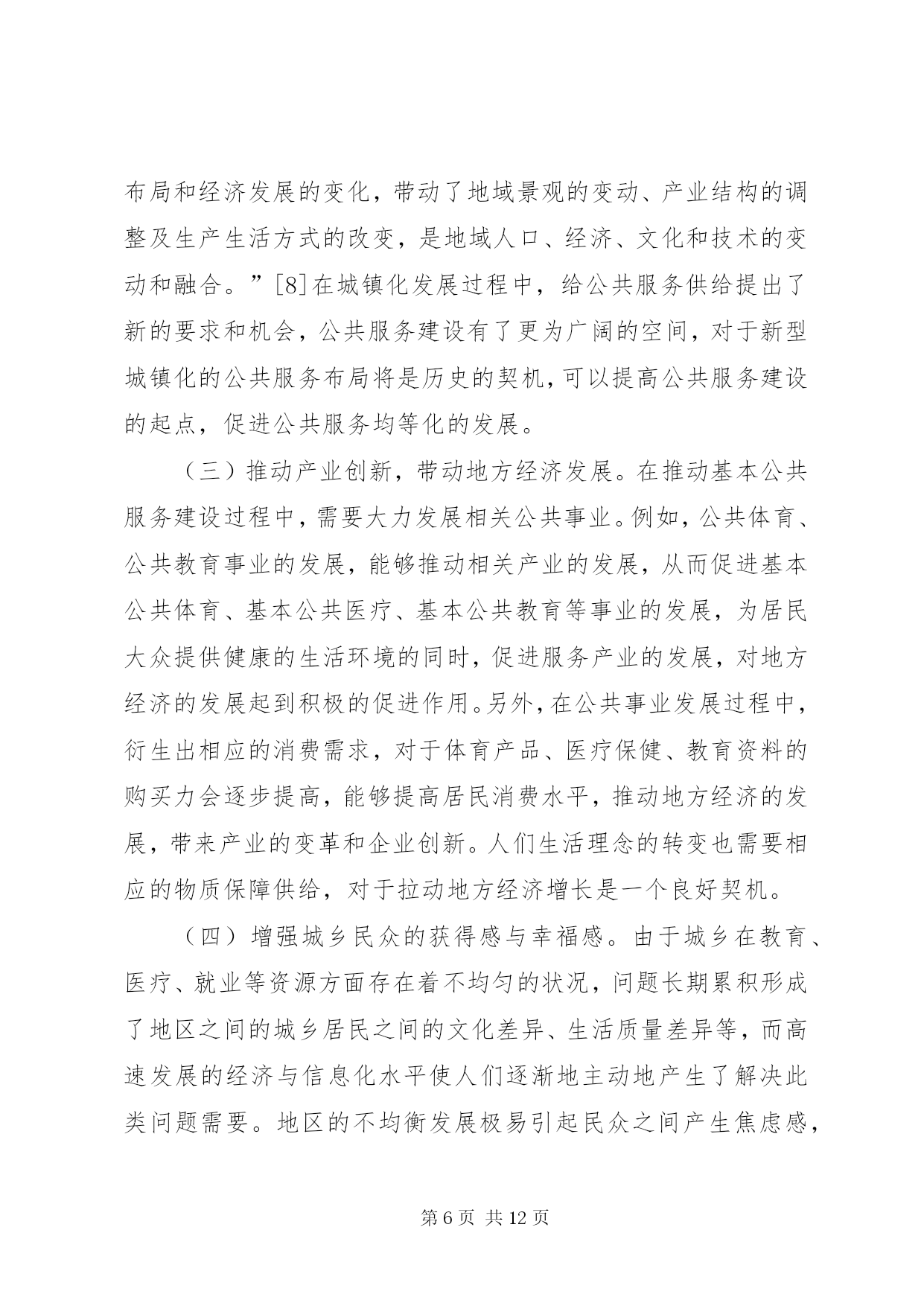 第PAGE\*Arabic\*MERGEFORMAT12页共NUMPAGES\*MERGEFORMAT12页公共服务统筹供给制度建设分析摘要。基本公共服务水平的提高是改善人们生活水平和提高生活品质的重要标志之一。辽宁基本公共服务建设在全国起步较早、发展较快,在一定程度上解决了很大的公共服务的问题,发展也取得了一定的成效。但辽宁基本公共服务依然存在诸如城乡差异较大、公共物品供给较少,以及科教文卫等基本公共服务薄弱等问题。通过统筹构建公共服务供给制度、创新基本公共服务融资制度、完善城乡基本公共服务监督与管理制度等,可以加强和完善辽宁基本公共服务供给制度建设。关键词:辽宁;基本公共服务;城乡;均等化公平正义是社会发展进步的一种价值取向,是人类追求美好生活的一个永恒主题。社会的进步和国家的发展,不仅要看经济实力的发展状况,还要看社会的公平正义。党的十九大报告在“提高保障和改善民生水平,加强和创新社会治理”篇提出了“坚持人人尽责、人人享有,坚持底线、突出重点、完善制度、引导预期,完善公共服务体系,不断促进社会公平正义,形成有效的社会治理、良好的社会秩序,使人民获得感、幸福感、安全感更加充实、更有保障、更可持续”[1]。习近平总书记在讲到“新时代中国特色社会主义思想和基本方略”时,指出要“坚持发展保障和改善民生。增进民生福祉是发展的根本目的。必须多谋民生之利、多解民生之忧,在发展中补齐民生短板、促进社会公平正义,在幼有所育、学有所教、劳有所得、病有所医、老有所养、住有所居、弱有所扶上不断取得新进展,深入开展脱贫攻坚,保证全体人民在共建共享发展中有更多获得感,不断促进人的全面发展、全体人民共同富裕。建设平安中国,加强和创新社会治理,维护社会和谐稳定,确保国家长治久安、人民安居乐业”[1]。在中国特色社会主义新时代,“政府应更加着力发挥在社会管理和公共事务中的职能作用,负责具体、有效和科学的组织管理”[2]。当前,我国基本公共服务领域还存在一定的不足,表现在城乡区域经济发展水平差异大、收入差距悬殊、基本公共服务设施不够等问题,造成人们在就业与技能培训、基础教育、基本公共医疗、养老、住房等方面还有很多困难。在我国全面建成小康社会的宏伟蓝图下,要提升和改善人们的生活水平,必然要求要对我国基本公共服务均等化发展,在实现我国会主义现代化的同时,要改善民生,提高各地基本公共服务的供给水平。辽宁基本公共服务建设(如公共交通、就业指导、基本医疗和全民健身等方面)在全国起步较早、发展较快,在一定程度上解决了很大的公共服务的问题,发展也取得了一定的成效。但辽宁基本公共服务依然存在诸如城乡差异较大、公共物品供给较少,以及科教文卫等基本公共服务薄弱问题。一、公共物品和基本公共服务解析“公共产品”最早是由瑞典经济学家林达尔提出的。1954年,萨缪尔森首次对“公共产品”这一概念进行定义,认为公共产品是“必须由集团中的所有成员均等消费的产品。如果集体中的任何一个成员可以得到一个单位,那么根据定义,该集团的每一个其他成员也可以得到一个单位”[3]。随后在他的《经济学》版本中不断改进和完善,在第18版中提出“公共物品是指将效用扩展于他人的成本为零,并且无法排除他人参与共享的一种商品”[4]。萨缪尔森认为,公共物品在消费中具有非排他性和非竞争性。2008年,在《中共中央、国务院关于切实加强农业基础设施,进一步促进农业发展农民增收的若干意见》中,界定基本公共服务的内容主要包括:义务教育、医疗服务、低生育、公共文化、社会保障、扶贫开发、公共交通、人居环境等。一些学者从研究角度对基本公共服务进行范围划分,认为“基本公共服务包括基础教育、社会保障、公共卫生与公共安全、基本医疗、基础设施、就业、公共文化、环境保护等内容”[5]。在此基础上,进一步探索基本公共服务均等化问题。基本公共服务的均等化是政府对全体社会成员公平地平等地提供基本的公共产品和基本的公共服务。这是社会成员生存与发展所需要的最基本的条件,体现社会公平正义原则,但是均等化不是平均化,而是由非均等化状态向均等化状态逐步转化的一个动态过程。一些学者总结了我国的具体情况,从基本公共服务的内容上探讨均等化的问题,认为“从我国国情看,基本公共服务均等化主要包括四个方面。”[6]基本的民生服务包括就业、社会救助、养老保障,公共事业服务包括科学技术、公共卫生、义务教育和公共文化等,公益基础服务包括基本公共设施建设、生态维护、环境治理等,公共安全服务包括生产安全、消费安全、国防安全等。当前城乡基本公共服务均等化的内容也主要包括基础教育、基础医疗卫生和社会保障等内容。在供给方面,还需特殊提供适宜农村地区特有的农村基础设施、农业信息、科技服务和技术培训等内容。二、统筹基本公共服务供给的必要性(一)统筹基本公共服务能够