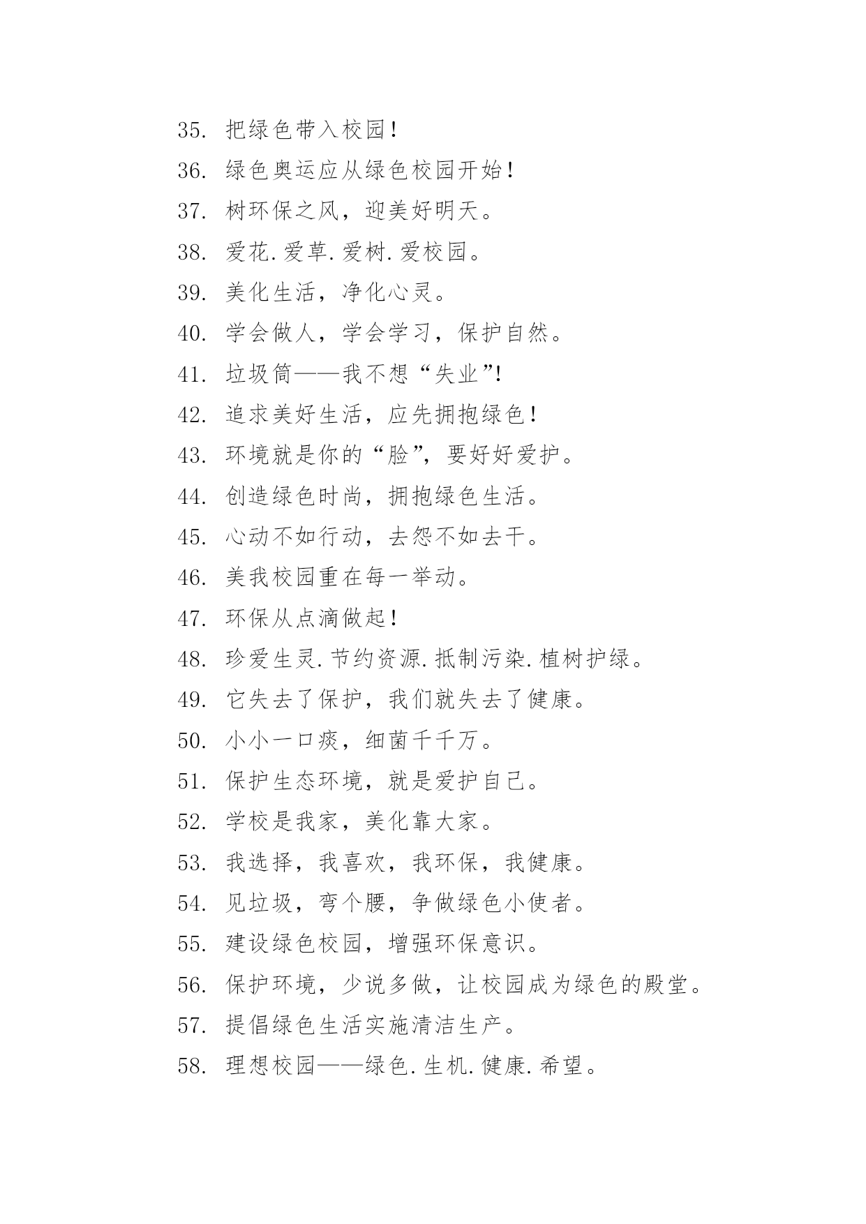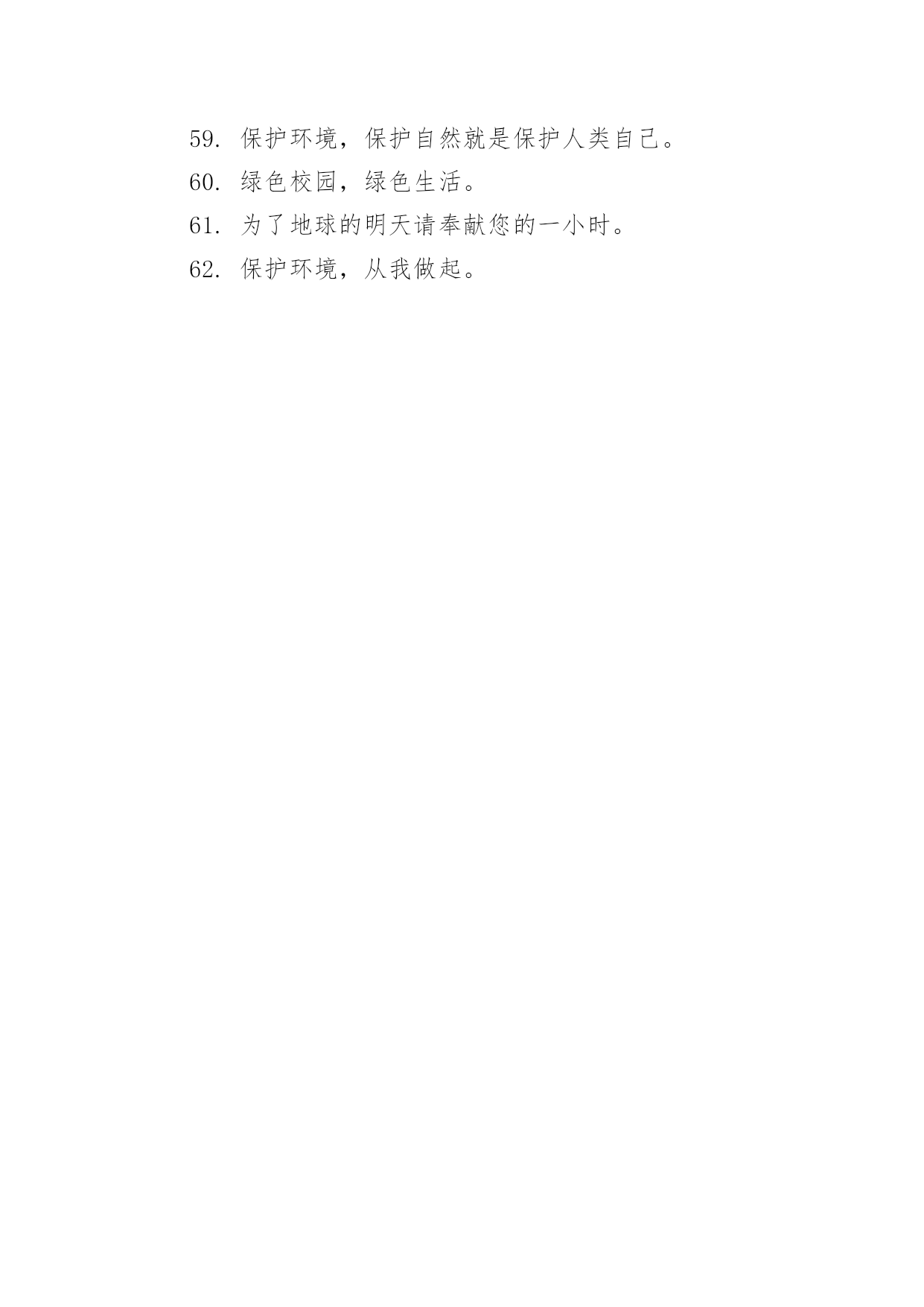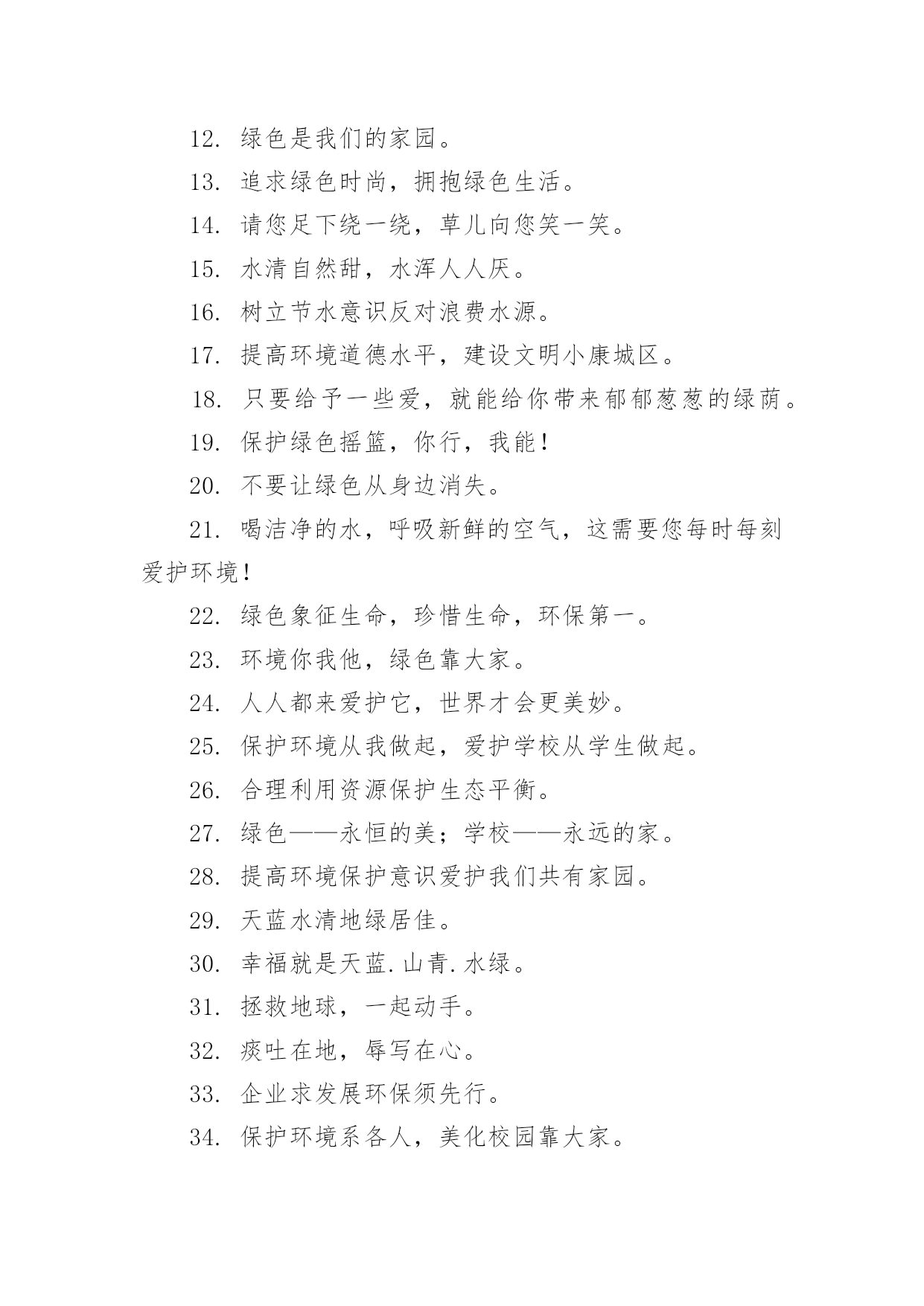 低碳环保口号低碳环保口号无论在学习、工作或是生活中,许多人都接触过一些比较经典的口号吧,口号具有文字简练、意义鲜明的特点。那么什么样的口号才更具感染力呢?下面是小编帮大家整理的低碳环保口号,供大家参考借鉴,希望可以帮助到有需要的朋友。1.当绿色褪去,就意味着人类走向命运的.低谷。2.节能低碳意义大,行动落实靠大家,关灯节水多步行,绿水青天笑脸迎。3.人类只有好好地对待大自然,大自然才能无限地回报人类。4.让绿色的希望从校园萌芽!5.保护环境=保护自己。6.创建绿色校园,从你我做起。7.让校园成为绿色殿堂!8.让绿色的旋律环绕每一个生命!9.保护环境,少说多做。10.别在绿色消失时,我们才去后悔。11.节约好比燕衔泥,浪费犹如河缺口,能源连着你我他,低碳生活靠大家。12.绿色是我们的家园。13.追求绿色时尚,拥抱绿色生活。14.请您足下绕一绕,草儿向您笑一笑。15.水清自然甜,水浑人人厌。16.树立节水意识反对浪费水源。17.提高环境道德水平,建设文明小康城区。18.只要给予一些爱,就能给你带来郁郁葱葱的绿荫。19.保护绿色摇篮,你行,我能!20.不要让绿色从身边消失。21.喝洁净的水,呼吸新鲜的空气,这需要您每时每刻爱护环境!22.绿色象征生命,珍惜生命,环保第一。23.环境你我他,绿色靠大家。24.人人都来爱护它,世界才会更美妙。25.保护环境从我做起,爱护学校从学生做起。26.合理利用资源保护生态平衡。27.绿色——永恒的美;学校——永远的家。28.提高环境保护意识爱护我们共有家园。29.天蓝水清地绿居佳。30.幸福就是天蓝.山青.水绿。31.拯救地球,一起动手。32.痰吐在地,辱写在心。33.企业求发展环保须先行。34.保护环境系各人,美化校园靠大家。35.把绿色带入校园!36.绿色奥运应从绿色校园开始!37.树环保之风,迎美好明天。38.爱花.爱草.爱树.爱校园。39.美化生活,净化心灵。40.学会做人,学会学习,保护自然。41.垃圾筒——我不想“失业”!42.追求美好生活,应先拥抱绿色!43.环境就是你的“脸”,要好好爱护。44.创造绿色时尚,拥抱绿色生活。45.心动不如行动,去怨不如去干。46.美我校园重在每一举动。47.环保从点滴做起!48.珍爱生灵.节约资源.抵制污染.植树护绿。49.它失去了保护,我们就失去了健康。50.小小一口痰,细菌千千万。51.保护生态环境,就是爱护自己。52.学校是我家,美化靠大家。53.我选择,我喜欢,我环保,我健康。54.见垃圾,弯个腰,争做绿色小使者。55.建设绿色校园,增强环保意识。56.保护环境,少说多做,让校园成为绿色的殿堂。57.提倡绿色生活实施清洁生产。58.理想校园——绿色.生机.健康.希望。59.保护环境,保护自然就是保护人类自己。60.绿色校园,绿色生活。61.为了地球的明天请奉献您的一小时。62.保护环境,从我做起。