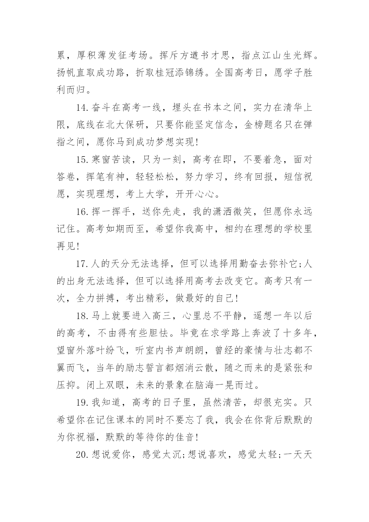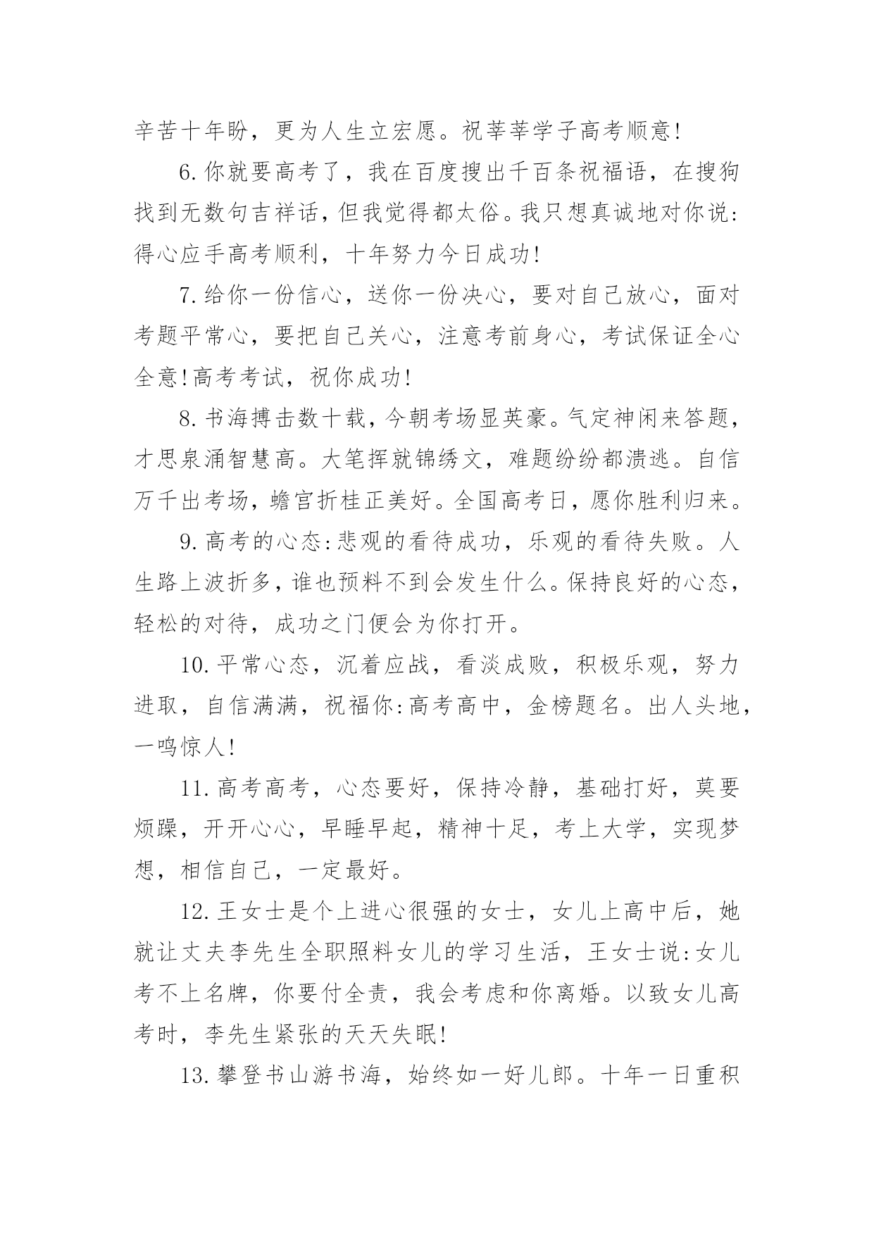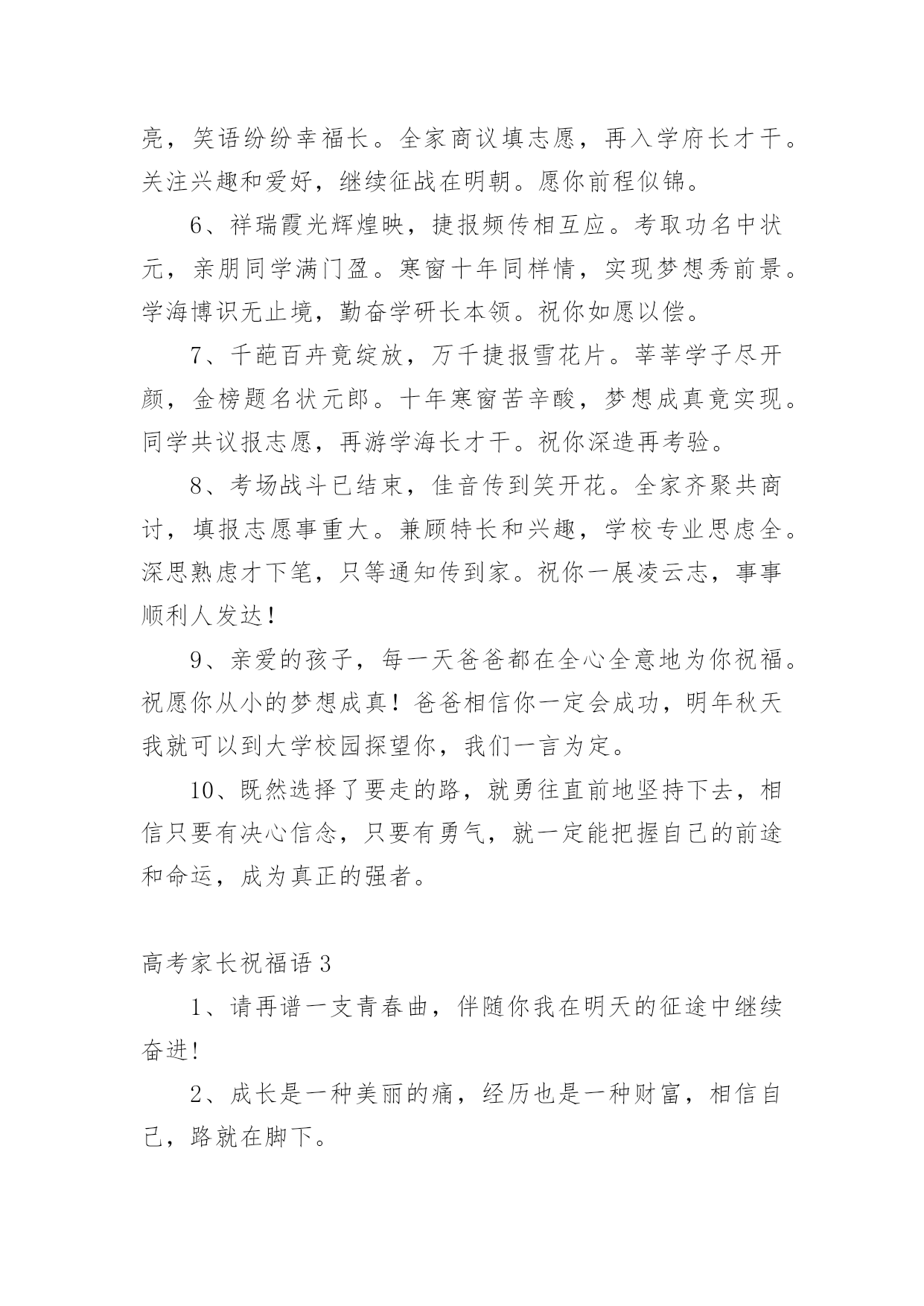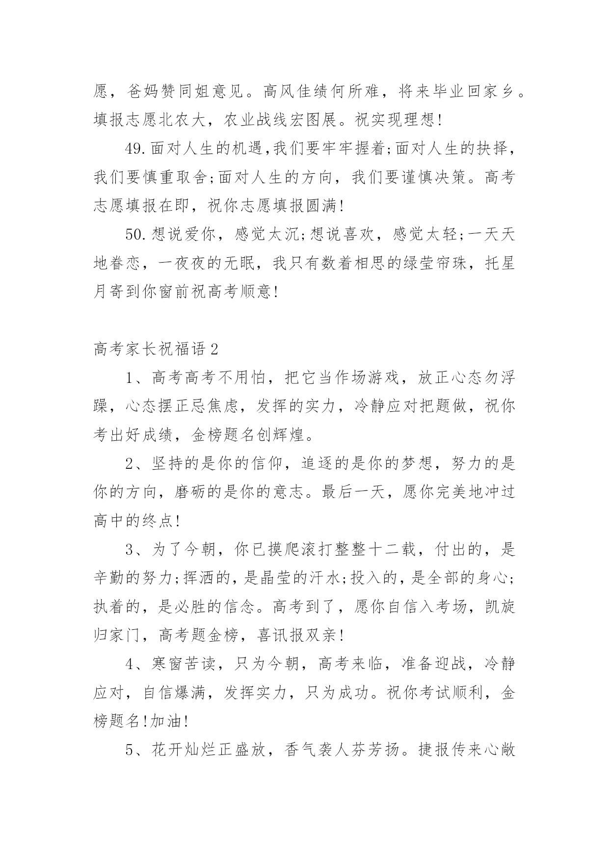 高考家长祝福语无论是身处学校还是步入社会,大家一定都接触过祝福语吧,祝福语往往灵活机动,可以随机应变。你会写祝福语吗?以下是小编精心整理的高考家长祝福语,希望对大家有所帮助。高考家长祝福语11.健康身体是高考成功的基础,良好学风是高考成功的条件,勤奋刻苦是高考成功的前提,学习方法是高考成功的关键,心理素质是高考成功的保证,祝广大考生在奔放的六月,考出水平,超常发挥,成就未来。2.举国上下,千里高考,万里高考。望课室内外,人头涌涌;宿舍上下,皆谈高考。十年寒窗,月月烧香,今日亮枪,祝你马到成功一锤定音为祖上争光!3.什么是黑暗,什么是光明,即便把自己从混沌的黑暗中解脱出来了,但等待我们的仍然是一片空白,就像高考,就像混乱的爱情。4.苦读寒窗十载,耗费爸妈心血。天下父母心愿,望子成龙飞腾。养精蓄锐待今,出手冲刺高考。展现真才实学,佳绩定能胜出。爸妈您别忧愁,金榜题名报喜。5.十年寒窗为今朝,临危不惧迎高考;十年艰辛来苦读,只为今朝收获足,十年磨剑剑更锋,考场之上逞英雄;十年辛苦十年盼,更为人生立宏愿。祝莘莘学子高考顺意!6.你就要高考了,我在百度搜出千百条祝福语,在搜狗找到无数句吉祥话,但我觉得都太俗。我只想真诚地对你说:得心应手高考顺利,十年努力今日成功!7.给你一份信心,送你一份决心,要对自己放心,面对考题平常心,要把自己关心,注意考前身心,考试保证全心全意!高考考试,祝你成功!8.书海搏击数十载,今朝考场显英豪。气定神闲来答题,才思泉涌智慧高。大笔挥就锦绣文,难题纷纷都溃逃。自信万千出考场,蟾宫折桂正美好。全国高考日,愿你胜利归来。9.高考的心态:悲观的看待成功,乐观的看待失败。人生路上波折多,谁也预料不到会发生什么。保持良好的心态,轻松的对待,成功之门便会为你打开。10.平常心态,沉着应战,看淡成败,积极乐观,努力进取,自信满满,祝福你:高考高中,金榜题名。出人头地,一鸣惊人!11.高考高考,心态要好,保持冷静,基础打好,莫要烦躁,开开心心,早睡早起,精神十足,考上大学,实现梦想,相信自己,一定最好。12.王女士是个上进心很强的女士,女儿上高中后,她就让丈夫李先生全职照料女儿的学习生活,王女士说:女儿考不上名牌,你要付全责,我会考虑和你离婚。以致女儿高考时,李先生紧张的天天失眠!13.攀登书山游书海,始终如一好儿郎。十年一日重积累,厚积薄发征考场。挥斥方遒书才思,指点江山生光辉。扬帆直取成功路,折取桂冠添锦绣。全国高考日,愿学子胜利而归。14.奋斗在高考一线,埋头在书本之间,实力在清华上限,底线在北大保研,只要你能坚定信念,金榜题名只在弹指之间,愿你马到成功梦想实现!15.寒窗苦读,只为一刻,高考在即,不要着急,面对答卷,挥笔有神,轻轻松松,努力学习,终有回报,短信祝愿,实现理想,考上大学,开开心心。16.挥一挥手,送你先走,我的潇洒微笑,但愿你永远记住。高考如期而至,希望你我高中,相约在理想的学校里再见!17.人的天分无法选择,但可以选择用勤奋去弥补它;人的出身无法选择,但可以选择用高考去改变它。高考只有一次,全力拼搏,考出精彩,做最好的自己!18.马上就要进入高三,心里总不平静,遥想一年以后的高考,不由得有些胆怯。毕竟在求学路上奔波了十多年,望窗外落叶纷飞,听室内书声朗朗,曾经的豪情与壮志都不翼而飞,当年的励志誓言都烟消云散,随之而来的是紧张和压抑。闭上双眼,未来的景象在脑海一晃而过。19.我知道,高考的日子里,虽然清苦,却很充实。只希望你在记住课本的同时不要忘了我,我会在你背后默默的为你祝福,默默的等待你的佳音!20.想说爱你,感觉太沉;想说喜欢,感觉太轻;一天天地眷恋,一夜夜的无眠,我只有数着相思的绿莹帘珠,托星月寄到你窗前祝高考顺意!21.高考,是一场持久战,只有坚持到最后的人才能笑到最后;高考,是一场心理战的拼搏,谁心态好谁就是黑马;高考,是一场大师级的博弈,时刻保持清醒的头脑才能取得最后的胜利!22.喜鹊枝头叫喳喳,高考喜报到你家。开心快乐不言说,梦想彼岸将到达。斟酌轻重志愿报,专业名校志向大。只愿心想事成万事顺,父母亲人笑开花!23.又逢一年高考到,呼吸紧张心急跳。良好心态很重要,小小贴士要记牢。莫急莫慌心静好,早睡早起身体好。缓解紧张有妙招,多吃香蕉和核桃。24.又是一年高考到,一心一意祝福你,二份真心伴你行,三分提醒沉着应考,四份好运陪伴你,五份细心要做到,六六大顺金榜题名。25.诗书满腹才华高,高考成绩一枝俏,理想没有大和小,真实善良就美好,实现价值光闪耀,成功将会把你绕。祝福你被理想学校录取。26.时间会记得,你翻过的书,背过的笔记,老天会看到,你努过的力,流过的汗滴,别把负担,留给自己,满腔的报负,就全部写到考卷里,祝你高考顺利!27.命运转折由高考开始,辉煌前景由志愿定夺;羡慕白衣天使救死扶