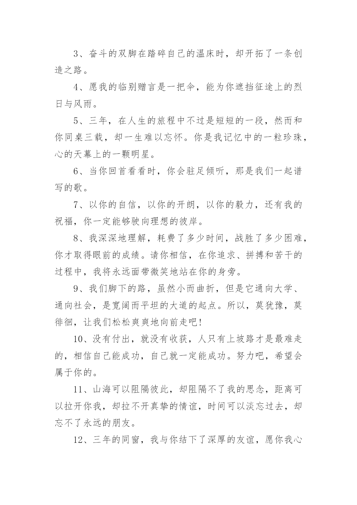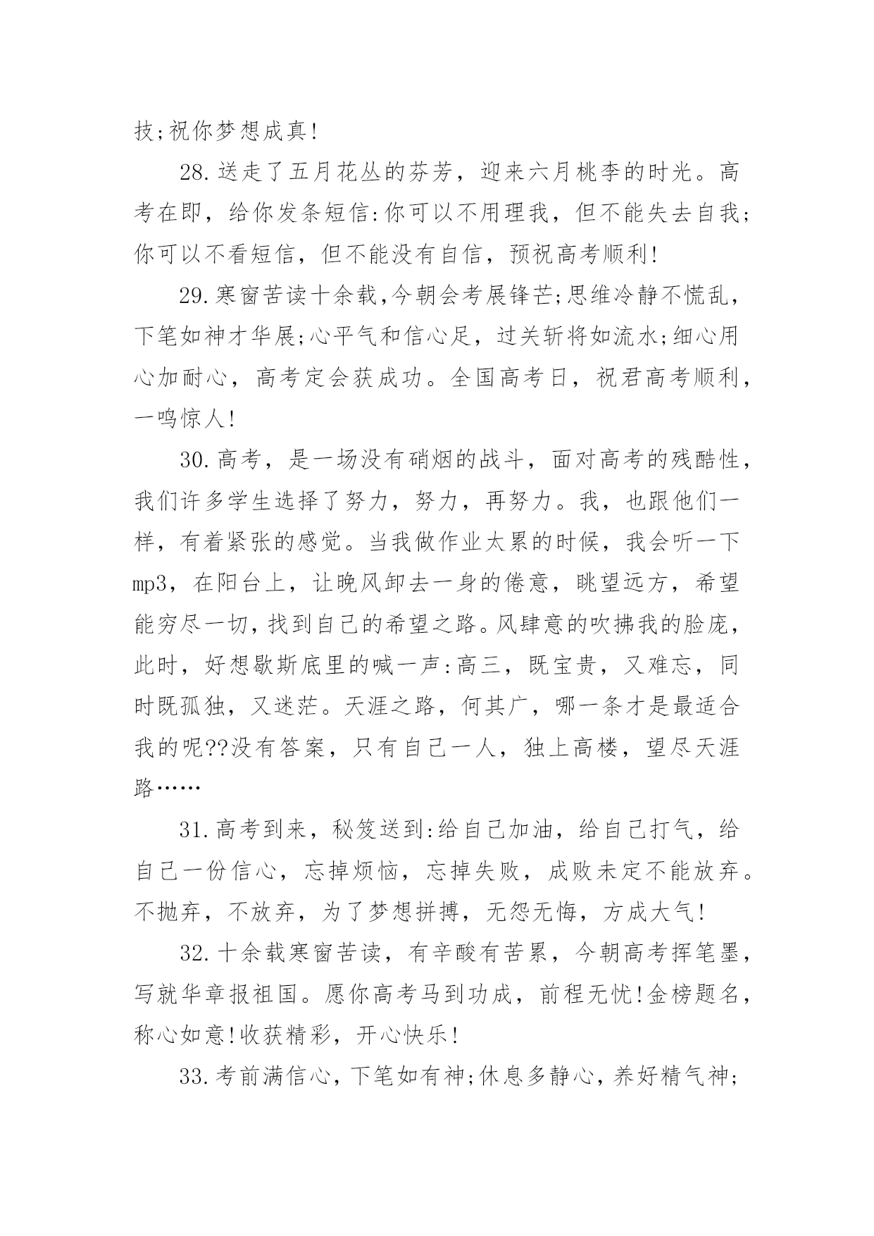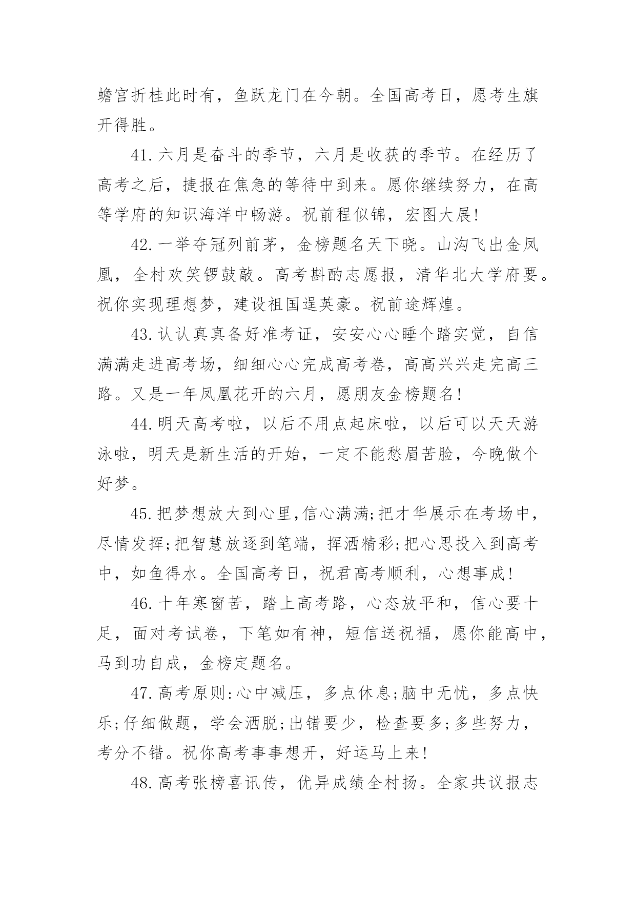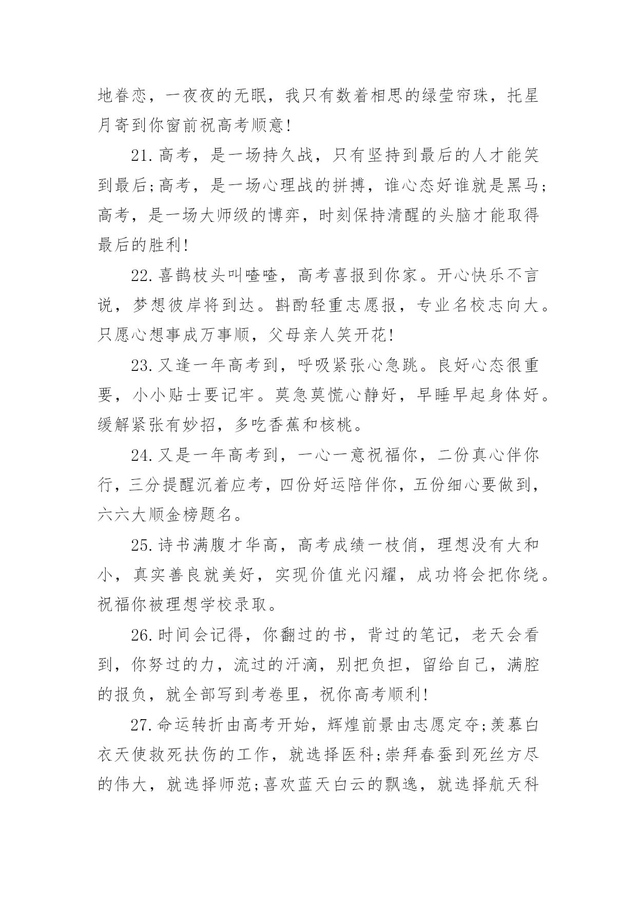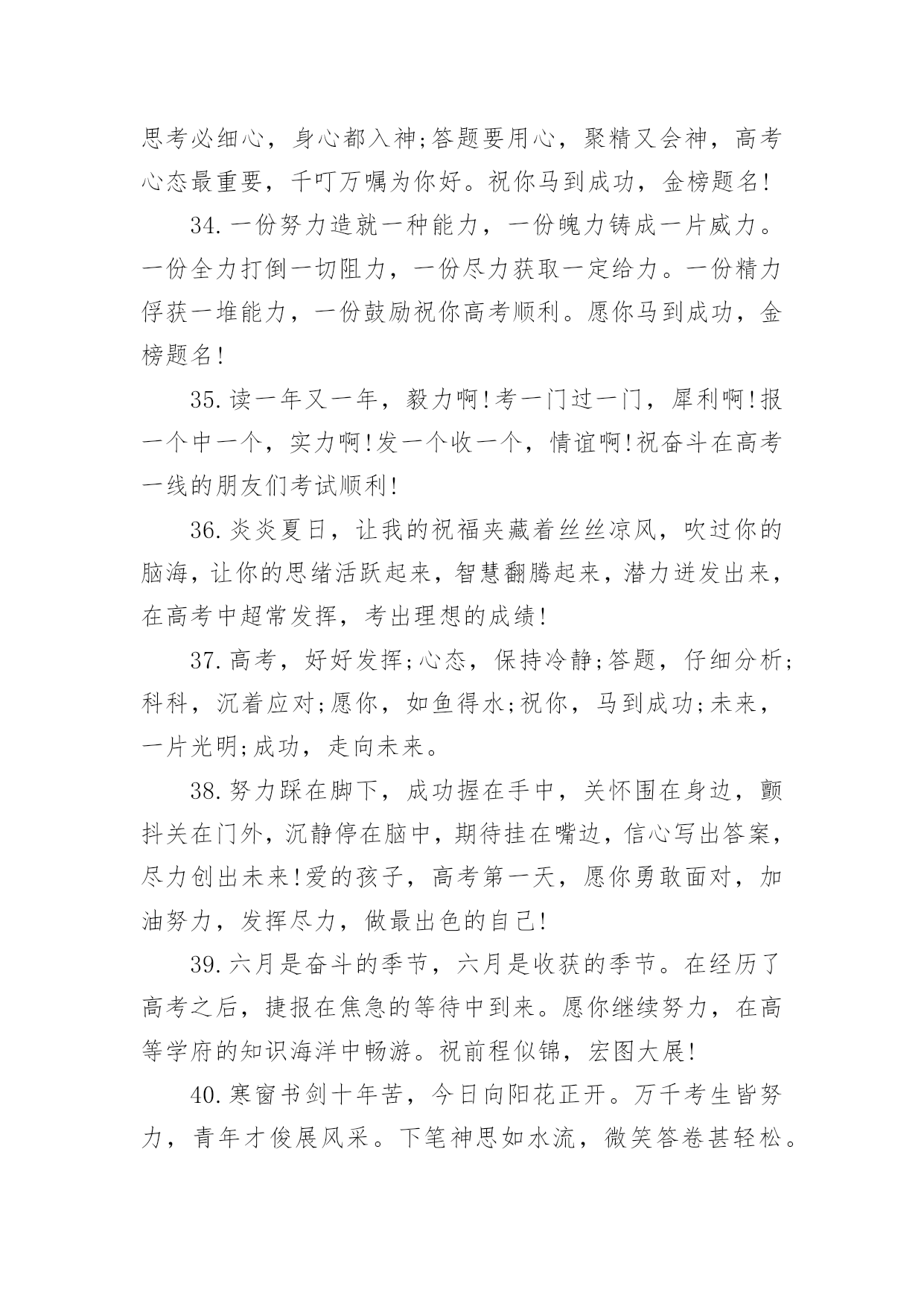 高考家长祝福语无论是身处学校还是步入社会,大家一定都接触过祝福语吧,祝福语往往灵活机动,可以随机应变。你会写祝福语吗?以下是小编精心整理的高考家长祝福语,希望对大家有所帮助。高考家长祝福语11.健康身体是高考成功的基础,良好学风是高考成功的条件,勤奋刻苦是高考成功的前提,学习方法是高考成功的关键,心理素质是高考成功的保证,祝广大考生在奔放的六月,考出水平,超常发挥,成就未来。2.举国上下,千里高考,万里高考。望课室内外,人头涌涌;宿舍上下,皆谈高考。十年寒窗,月月烧香,今日亮枪,祝你马到成功一锤定音为祖上争光!3.什么是黑暗,什么是光明,即便把自己从混沌的黑暗中解脱出来了,但等待我们的仍然是一片空白,就像高考,就像混乱的爱情。4.苦读寒窗十载,耗费爸妈心血。天下父母心愿,望子成龙飞腾。养精蓄锐待今,出手冲刺高考。展现真才实学,佳绩定能胜出。爸妈您别忧愁,金榜题名报喜。5.十年寒窗为今朝,临危不惧迎高考;十年艰辛来苦读,只为今朝收获足,十年磨剑剑更锋,考场之上逞英雄;十年辛苦十年盼,更为人生立宏愿。祝莘莘学子高考顺意!6.你就要高考了,我在百度搜出千百条祝福语,在搜狗找到无数句吉祥话,但我觉得都太俗。我只想真诚地对你说:得心应手高考顺利,十年努力今日成功!7.给你一份信心,送你一份决心,要对自己放心,面对考题平常心,要把自己关心,注意考前身心,考试保证全心全意!高考考试,祝你成功!8.书海搏击数十载,今朝考场显英豪。气定神闲来答题,才思泉涌智慧高。大笔挥就锦绣文,难题纷纷都溃逃。自信万千出考场,蟾宫折桂正美好。全国高考日,愿你胜利归来。9.高考的心态:悲观的看待成功,乐观的看待失败。人生路上波折多,谁也预料不到会发生什么。保持良好的心态,轻松的对待,成功之门便会为你打开。10.平常心态,沉着应战,看淡成败,积极乐观,努力进取,自信满满,祝福你:高考高中,金榜题名。出人头地,一鸣惊人!11.高考高考,心态要好,保持冷静,基础打好,莫要烦躁,开开心心,早睡早起,精神十足,考上大学,实现梦想,相信自己,一定最好。12.王女士是个上进心很强的女士,女儿上高中后,她就让丈夫李先生全职照料女儿的学习生活,王女士说:女儿考不上名牌,你要付全责,我会考虑和你离婚。以致女儿高考时,李先生紧张的天天失眠!13.攀登书山游书海,始终如一好儿郎。十年一日重积累,厚积薄发征考场。挥斥方遒书才思,指点江山生光辉。扬帆直取成功路,折取桂冠添锦绣。全国高考日,愿学子胜利而归。14.奋斗在高考一线,埋头在书本之间,实力在清华上限,底线在北大保研,只要你能坚定信念,金榜题名只在弹指之间,愿你马到成功梦想实现!15.寒窗苦读,只为一刻,高考在即,不要着急,面对答卷,挥笔有神,轻轻松松,努力学习,终有回报,短信祝愿,实现理想,考上大学,开开心心。16.挥一挥手,送你先走,我的潇洒微笑,但愿你永远记住。高考如期而至,希望你我高中,相约在理想的学校里再见!17.人的天分无法选择,但可以选择用勤奋去弥补它;人的出身无法选择,但可以选择用高考去改变它。高考只有一次,全力拼搏,考出精彩,做最好的自己!18.马上就要进入高三,心里总不平静,遥想一年以后的高考,不由得有些胆怯。毕竟在求学路上奔波了十多年,望窗外落叶纷飞,听室内书声朗朗,曾经的豪情与壮志都不翼而飞,当年的励志誓言都烟消云散,随之而来的是紧张和压抑。闭上双眼,未来的景象在脑海一晃而过。19.我知道,高考的日子里,虽然清苦,却很充实。只希望你在记住课本的同时不要忘了我,我会在你背后默默的为你祝福,默默的等待你的佳音!20.想说爱你,感觉太沉;想说喜欢,感觉太轻;一天天地眷恋,一夜夜的无眠,我只有数着相思的绿莹帘珠,托星月寄到你窗前祝高考顺意!21.高考,是一场持久战,只有坚持到最后的人才能笑到最后;高考,是一场心理战的拼搏,谁心态好谁就是黑马;高考,是一场大师级的博弈,时刻保持清醒的头脑才能取得最后的胜利!22.喜鹊枝头叫喳喳,高考喜报到你家。开心快乐不言说,梦想彼岸将到达。斟酌轻重志愿报,专业名校志向大。只愿心想事成万事顺,父母亲人笑开花!23.又逢一年高考到,呼吸紧张心急跳。良好心态很重要,小小贴士要记牢。莫急莫慌心静好,早睡早起身体好。缓解紧张有妙招,多吃香蕉和核桃。24.又是一年高考到,一心一意祝福你,二份真心伴你行,三分提醒沉着应考,四份好运陪伴你,五份细心要做到,六六大顺金榜题名。25.诗书满腹才华高,高考成绩一枝俏,理想没有大和小,真实善良就美好,实现价值光闪耀,成功将会把你绕。祝福你被理想学校录取。26.时间会记得,你翻过的书,背过的笔记,老天会看到,你努过的力,流过的汗滴,别把负担,留给自己,满腔的报负,就全部写到考卷里,祝你高考顺利!27.命运转折由高考开始,辉煌前景由志愿定夺;羡慕白衣天使救死扶