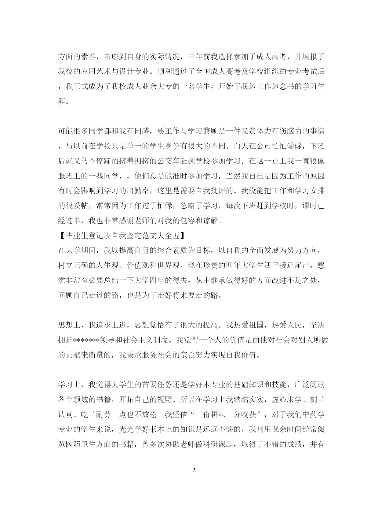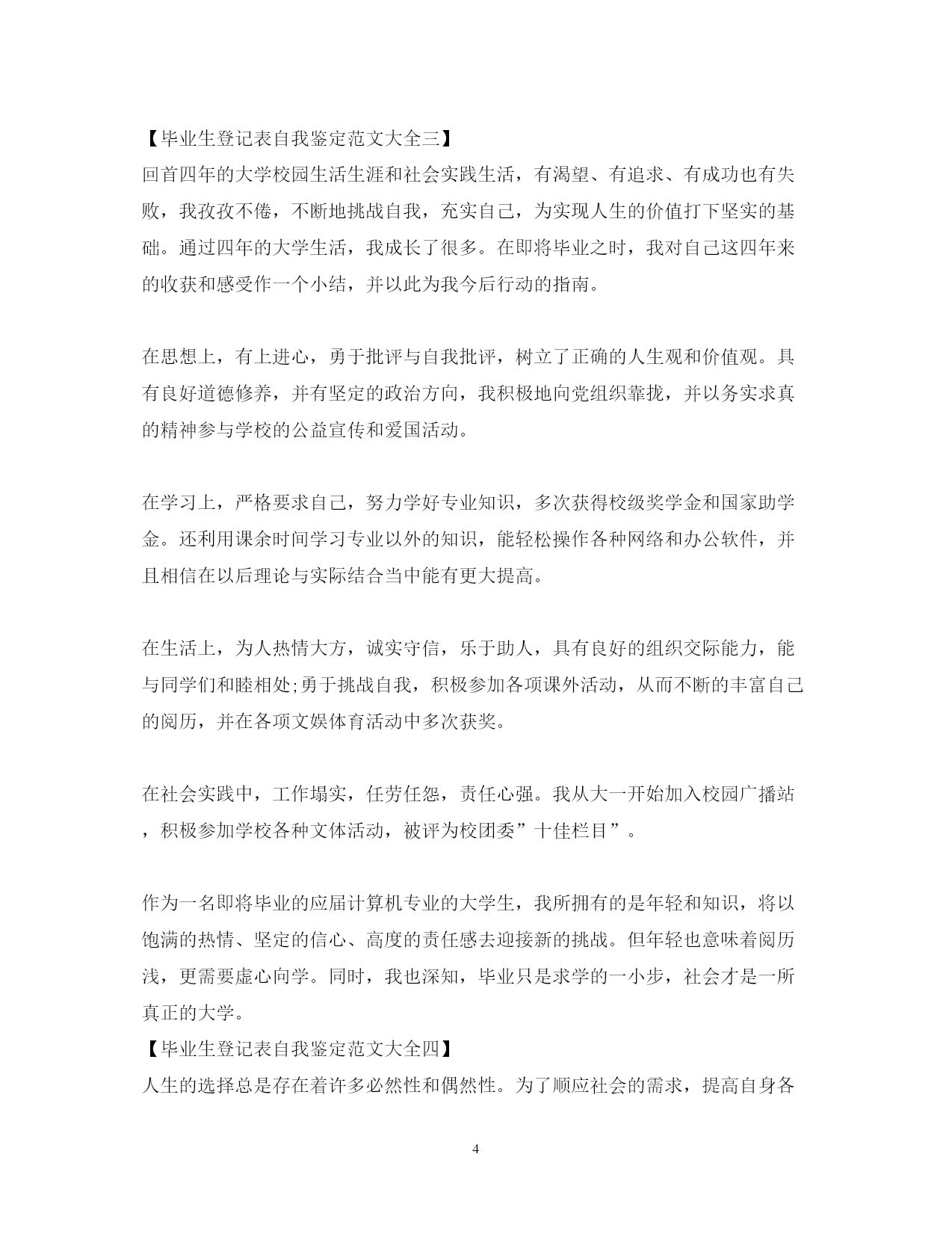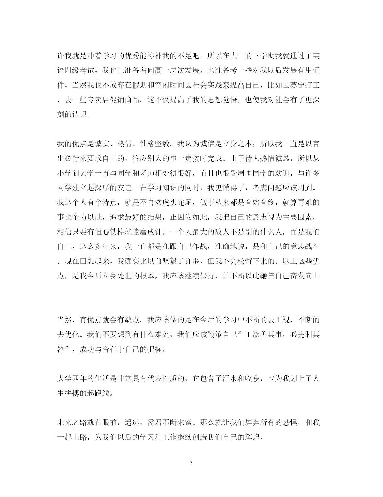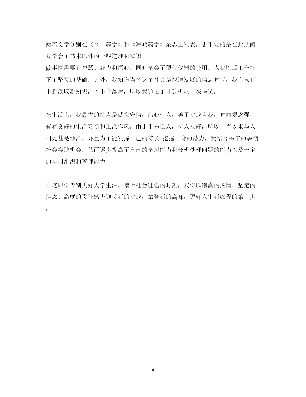此资料由网络收集而来,如有侵权请告知上传者立即删除。资料共分享,我们负责传递知识。PAGEPAGE6毕业生登记表自我鉴定范文大全导语:下面由小编为大家整理的毕业生登记表自我鉴定,欢迎大家查看!【毕业生登记表自我鉴定范文大全一】悄然溜走的岁月,转瞬即逝的年华。转眼间大学生活就要结束了,离校之前,该好好的给自己作个总结,及时给自己定位,规划好未来。回顾过去,在学校、老师和同学们的帮助下我觉得自己过得很快乐,也很充实。除了努力学习基础课程和掌握本专业的理论知识外,我还积极参加各种社会实践、文体活动,在这三年多的大学生活里我明显感觉到自己在学习成绩、工作能力、思想觉悟等方面比起刚来大学的时候有了很大的提高。在政治上,我有坚定的政治方向,积极上进,热爱祖国,热爱人民,坚决拥护中国共产党的领导,拥护党的各项方针政策,遵纪守法,勇于批评和自我批评,树立了正确的人生观和价值观。在学习上,凭着对知识的渴望和追求,我一向严于律己,勤奋好学,成绩优异,连续三年获得校奖学金。平时我还非常注重英语能力的培养,涉猎了大量英语方面的课外书,并通过了国家英语六级考试。同时我还利用课余时间阅读了大量文学名著,拓宽自己的视野,并自学各类与平面设计相关的软件,以进一步完善与本专业相关的知识体系。在工作上,除了积极参加学校、系、班级组织的各项活动外,结合自身特长,我还积极参加学校、社会组织的各种网络设计比赛,并获得奖励,为学校争光,得到了学校、老师和同学们的认可。在生活上,养成了良好的生活习惯,生活充实而有条理,有严谨的生活态度,良好的生活作风;为人热情大方,诚实守信,乐于助人。有自己为人处世的原则,与同学,朋友和睦相处,共同进步。当然,我也有自己的不足之处,那就是做事有时候会优柔寡断,不能果断、大胆的放开手去做事。在今后的日子里,我会从自身找原因,改进缺点不足,继续努力,不断进取,以饱满的热情去迎接我人生的新旅程。对于一名大四毕业生来说,离开校园踏入社会开始人生的新旅程,走好这段人生新旅程的第一步也非常重要。通过对这三年多的总结,我对自己有了一个更加系统地客观地认识,在以后的求职路上我会更加明确自己的职业目标,以全新的面貌面向社会、迎接未来,迈好人生新旅程的第一步。【毕业生登记表自我鉴定范文大全二】四年的大学生活就这样匆匆忙忙的结束了,发现自己也长大成熟了好多。四年来点点滴滴的磨练成为我生活中的一个个关键的起点。有的辉煌,值得你记住一辈子的。我不怕苦,我只是怕我们没有挑战自我、充实自我和实现人生价值的勇气和机遇。所以我一直在努力着,一直在努力。刚上大一的时候,学校有好多的社团可以加入,比较好的就有广播站、学习部等。由于自己的害怕而放弃了加入学校这些优秀的社团。也许还要怪自己当时的想法,就是不在学校社团难道就不能发展自己了吗?难道作为一名普通的学生就不能学校做出贡献了吗?就这样机会与我擦肩而过。当我清楚知道加入社团的好处的时候,我其实也不是很后悔,而是自己默默的在心里发誓,做一名学生也要出类拔萃。没有加入社团对我来说其实就是比别人晚了一步要进入所谓大学的半个社会。我经常会利用课余时间去外系旁听学习,虽然没有他们专业,但总比普通学生多学习了一点。就这样我不放弃任何学习的机会,有一点就学习一点。我知道我在某些方面不如那些同学,所以我就拼命的学习,人家都说“学习能改变命运”,也许我就是冲着学习的优秀能祢补我的不足吧。所以在大一的下学期我就通过了英语四级考试,我也正准备着向高一层次发展。也准备考一些对我以后发展有用证件。当然我也不放弃在假期和空闲时间去社会实践来提高自己,比如去苏宁打工,去一些专卖店促销商品。这不仅提高了我的思想觉悟,也使我对社会有了更深刻的认识。我的优点是诚实、热情、性格坚毅。我认为诚信是立身之本,所以我一直是以言出必行来要求自己的,答应别人的事一定按时完成。由于待人热情诚恳,所以从小学到大学一直与同学和老师相处得很好,而且也很受周围同学的欢迎,与许多同学建立起深厚的友谊。在学习知识的同时,我更懂得了,考虑问题应该周到。我这个人有个特点,就是不喜欢虎头蛇尾,做事从来都是有始有终,就算再难的事也全力以赴,追求最好的结果,正因为如此,我把自己的意志视为主要因素,相信只要有恒心铁棒就能磨成针。一个人最大的敌人不是别的什么人,而是我们自己。这么多年来,我一直都是在跟自己作战,准确地说,是和自己的意志战斗。现在回想起来,我确实比以前坚毅了许多,但我不会松懈下来的。以上这些优点,是我今后立身处世的根本,我应该继续保持,并不断以此鞭策自己奋发向上。当然,有优点就会有缺点。我应该做的是在今后的学习中不断的去正视,不断的去优化。我们不要想到有什么难处,我们应该鞭策自己”工欲善其事,必先利其器”。成功与否在于自己的把握。大学四