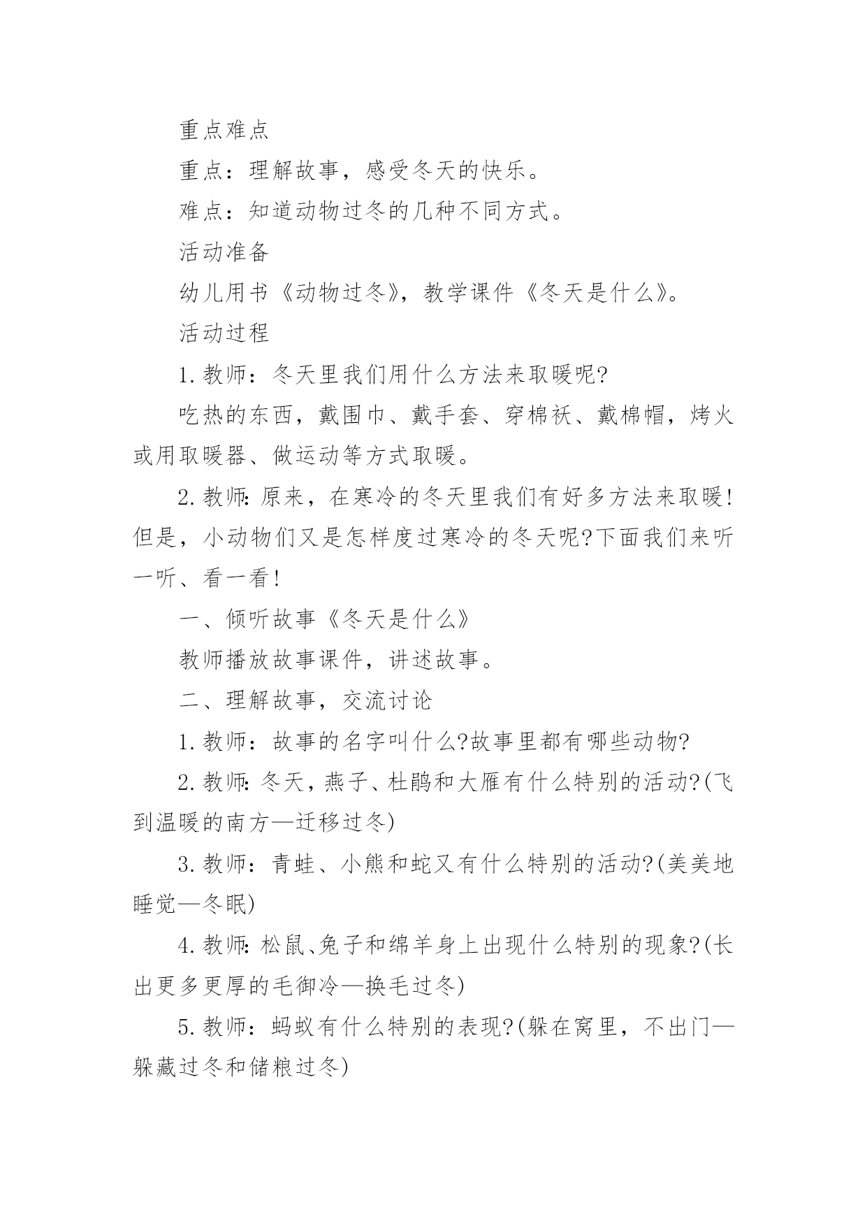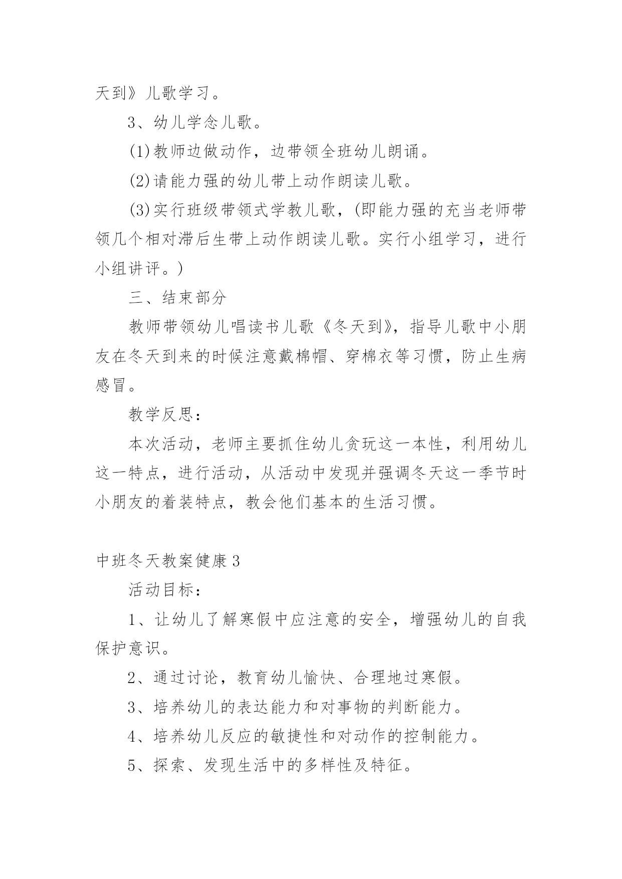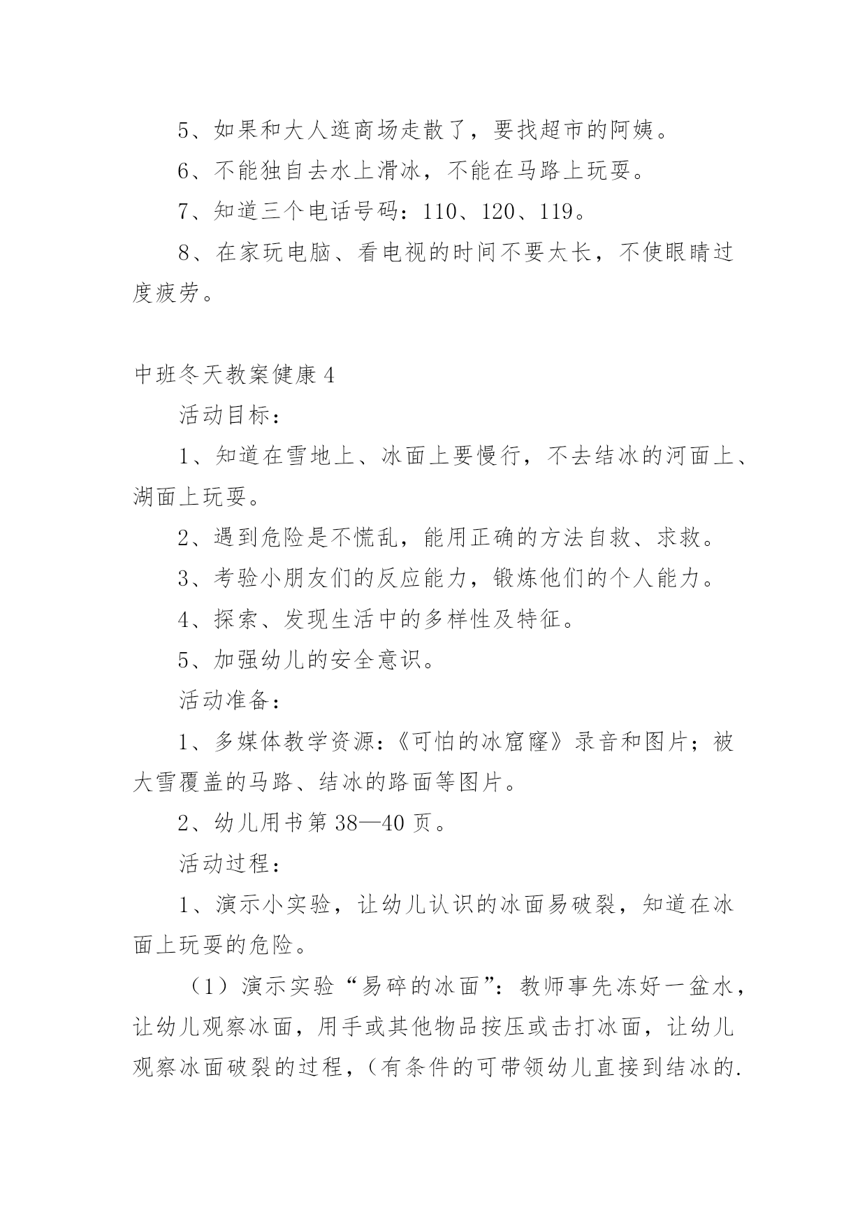 中班冬天教案健康作为一名人民教师,就有可能用到教案,教案有利于教学水平的提高,有助于教研活动的开展。快来参考教案是怎么写的吧!下面是小编帮大家整理的中班冬天教案健康,欢迎阅读,希望大家能够喜欢。中班冬天教案健康1设计背景随着冬天的到来,孩子们发现人们的穿着有所改变的同时也产生许多迷惑:“为什么看不到小蚂蚁出来搬食物?树上的小鸟不见了,它们都到哪去了?”孩子们对动物的生活习性的改变产生了好奇,因此为了顺应幼儿的兴趣需要和发展的需要,我通过活动《冬天是什么》可以让孩子们了解冬天对动物们生活习性产生的影响,以激发幼儿的兴趣和对动物的情感。活动目标1.理解故事《冬天是什么》,感受冬天里的快乐,了解一些动物在冬天里的特别活动。2.理解一些动物不同的过冬方式。3.通过语言表达和动作相结合的形式充分感受故事的'童趣。4.能分析故事情节,培养想象力。5.引导幼儿在故事和游戏中学习,感悟生活。重点难点重点:理解故事,感受冬天的快乐。难点:知道动物过冬的几种不同方式。活动准备幼儿用书《动物过冬》,教学课件《冬天是什么》。活动过程1.教师:冬天里我们用什么方法来取暖呢?吃热的东西,戴围巾、戴手套、穿棉袄、戴棉帽,烤火或用取暖器、做运动等方式取暖。2.教师:原来,在寒冷的冬天里我们有好多方法来取暖!但是,小动物们又是怎样度过寒冷的冬天呢?下面我们来听一听、看一看!一、倾听故事《冬天是什么》教师播放故事课件,讲述故事。二、理解故事,交流讨论1.教师:故事的名字叫什么?故事里都有哪些动物?2.教师:冬天,燕子、杜鹃和大雁有什么特别的活动?(飞到温暖的南方—迁移过冬)3.教师:青蛙、小熊和蛇又有什么特别的活动?(美美地睡觉—冬眠)4.教师:松鼠、兔子和绵羊身上出现什么特别的现象?(长出更多更厚的毛御冷—换毛过冬)5.教师:蚂蚁有什么特别的表现?(躲在窝里,不出门—躲藏过冬和储粮过冬)6.教师:冬天里的小朋友有什么特别的活动?(坐雪橇、堆雪人、打雪仗)7.教师小结。在冬天里,小动物们就是通过迁移、冬眠、换毛、躲藏和储粮等过冬方式来度过寒冷的冬天的。8.让幼儿操作幼儿用书《动物过冬》,结束活动。教学反思本次活动教师能运用课件引导幼儿倾听故事,帮助幼儿理解故事的同时能引导幼儿理解一些动物不同过冬的方式,从而丰富幼儿对各种动物过冬的科学知识。活动中,教师注重孩子们的年龄特点,采用生动形象的课件和有效提问来引导幼儿进行讨论,鼓励幼儿大胆交流,分享彼此不同见解,在说中学,从而发展了幼儿的思维,丰富了知识,进一步拓展了幼儿的认知空间。但本次活动也存在了一些不足,如教师语言还不够精练,在活动的最后一个环节结束较快,没能很好的小结等。但本次活动目标基本达到。中班冬天教案健康2活动目标:1、学习有感情的朗读儿歌,理解儿歌的内容。2、幼儿能够联系实际,更加深刻地理解感受冬天。3、感受旋律的气氛以及和同伴一起参加集体音乐活动的乐趣。4、培养幼儿的音乐节奏感,发展幼儿的表现力。5、感受歌曲柔和、舒缓的旋律,理解歌词的含义。重点难点:理解儿歌的内容,联系实际,理解冬天、感受冬天。活动准备:1、活动前:趁着下雪天,让小宝宝们穿好棉衣戴好棉帽等冬日的新装去户外欣赏雪景,玩雪,引起幼儿对雪花的兴趣,切身感受冬天:2、冬天下雪、堆雪人的.图片;3、儿歌挂图。活动过程:一、开始部分教师引导幼儿观察身边的天气状况。教师:“宝宝们,看看外面的天气怎么样?”(冷了!下雪啦!)教师:“是啊,大家的穿着有何变化呢?”(穿棉衣了!戴棉帽啦!)二、展开部分1、通过谈话,引起幼儿对冬天及其雪花的好奇。教师:“冬天到了,小朋友们见过雪花吗?想不想看下雪的情景啊?”(想……)老师和幼儿一起观赏有关下雪的图片。2、通过观察画面内容,切身理解感受冬天的氛围。教师:“小朋友们你们看到了什么?画面里的小朋友们穿者打扮怎么样呢?他们为什么会有这样的打扮呢?”老师引导,围绕上述几个问题展开互动,从而导出《冬天到》儿歌学习。3、幼儿学念儿歌。(1)教师边做动作,边带领全班幼儿朗诵。(2)请能力强的幼儿带上动作朗读儿歌。(3)实行班级带领式学教儿歌,(即能力强的充当老师带领几个相对滞后生带上动作朗读儿歌。实行小组学习,进行小组讲评。)三、结束部分教师带领幼儿唱读书儿歌《冬天到》,指导儿歌中小朋友在冬天到来的时候注意戴棉帽、穿棉衣等习惯,防止生病感冒。教学反思:本次活动,老师主要抓住幼儿贪玩这一本性,利用幼儿这一特点,进行活动,从活动中发现并强调冬天这一季节时小朋友的着装特点,教会他们基本的生活习惯。中班冬天教案健康3活动目标:1、让幼儿了解寒假中应注意的安全,增强幼儿的自我保护意识。2、通过讨论,教育幼儿愉快、合理地过寒假。3、培养幼儿的表达能力和对事物的判断能力。4、培养幼儿反应的敏捷性和对动作的控制能力。5、探索、发现生