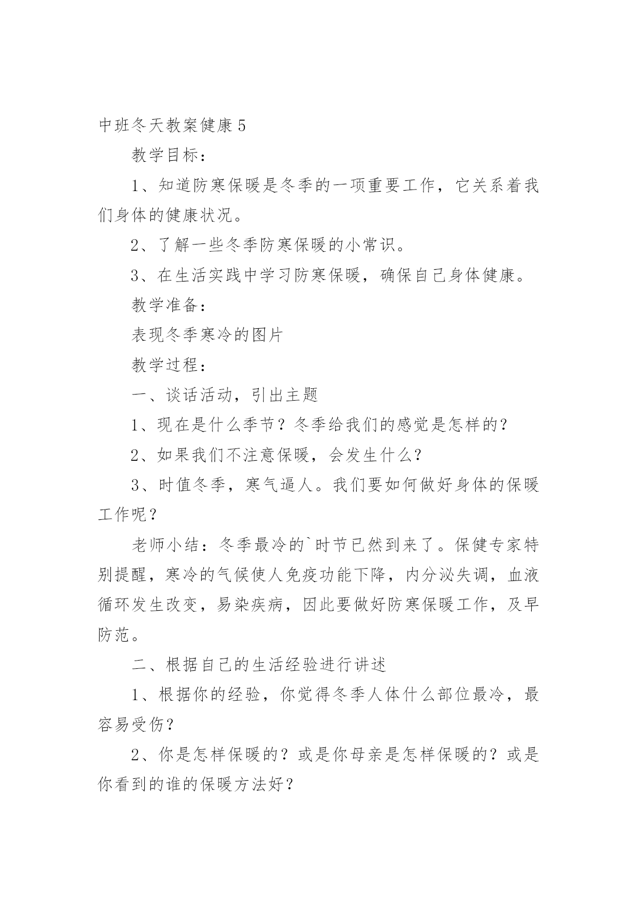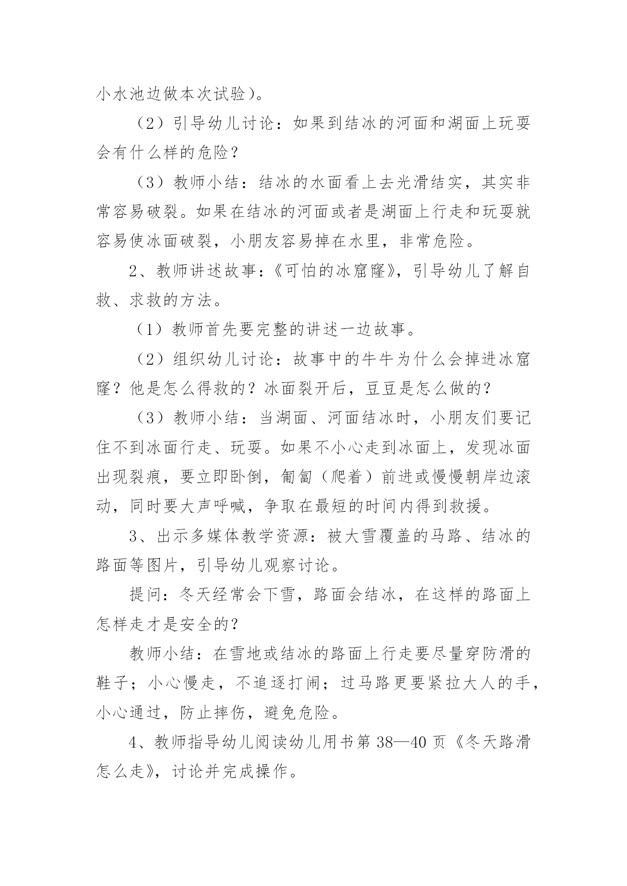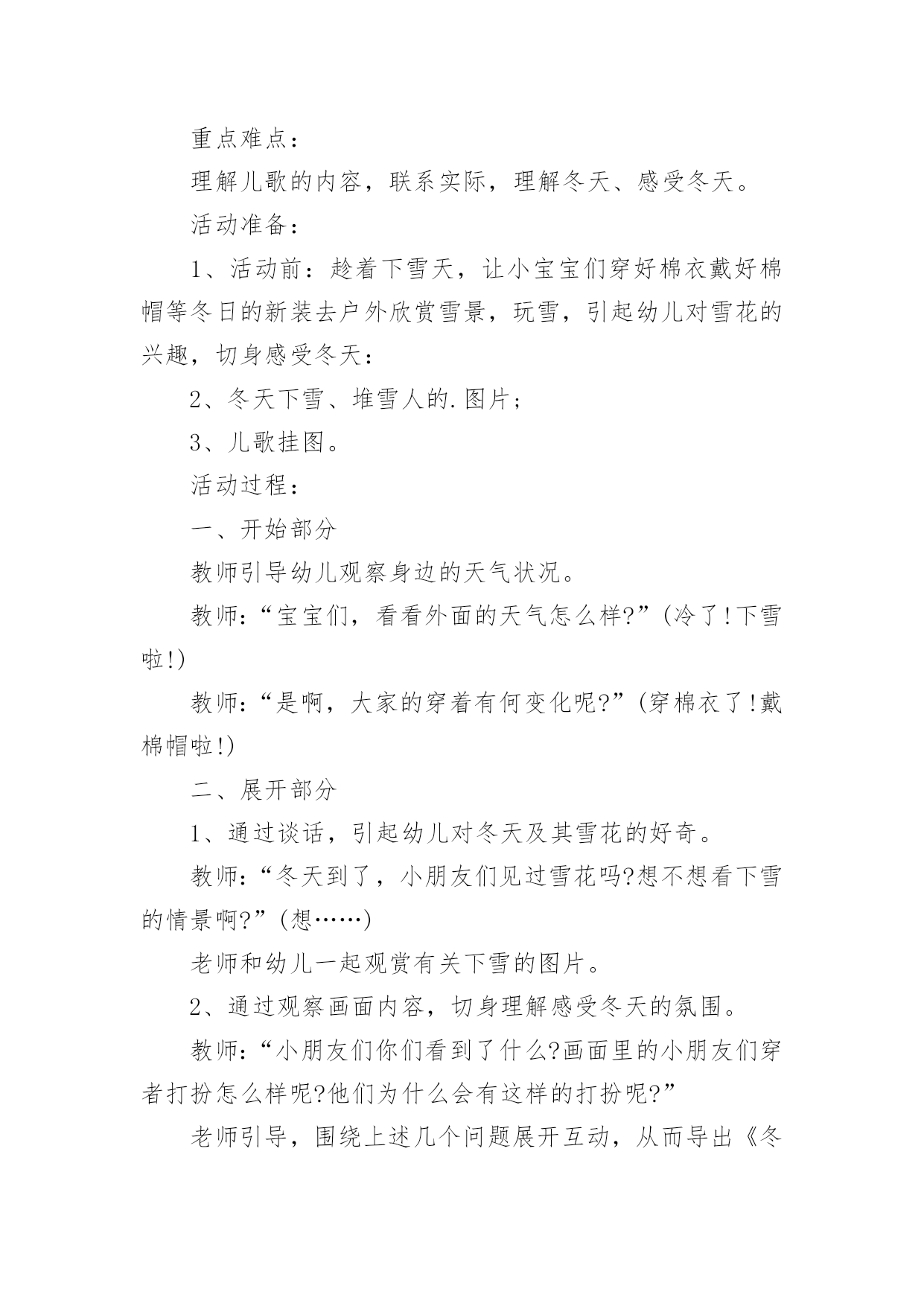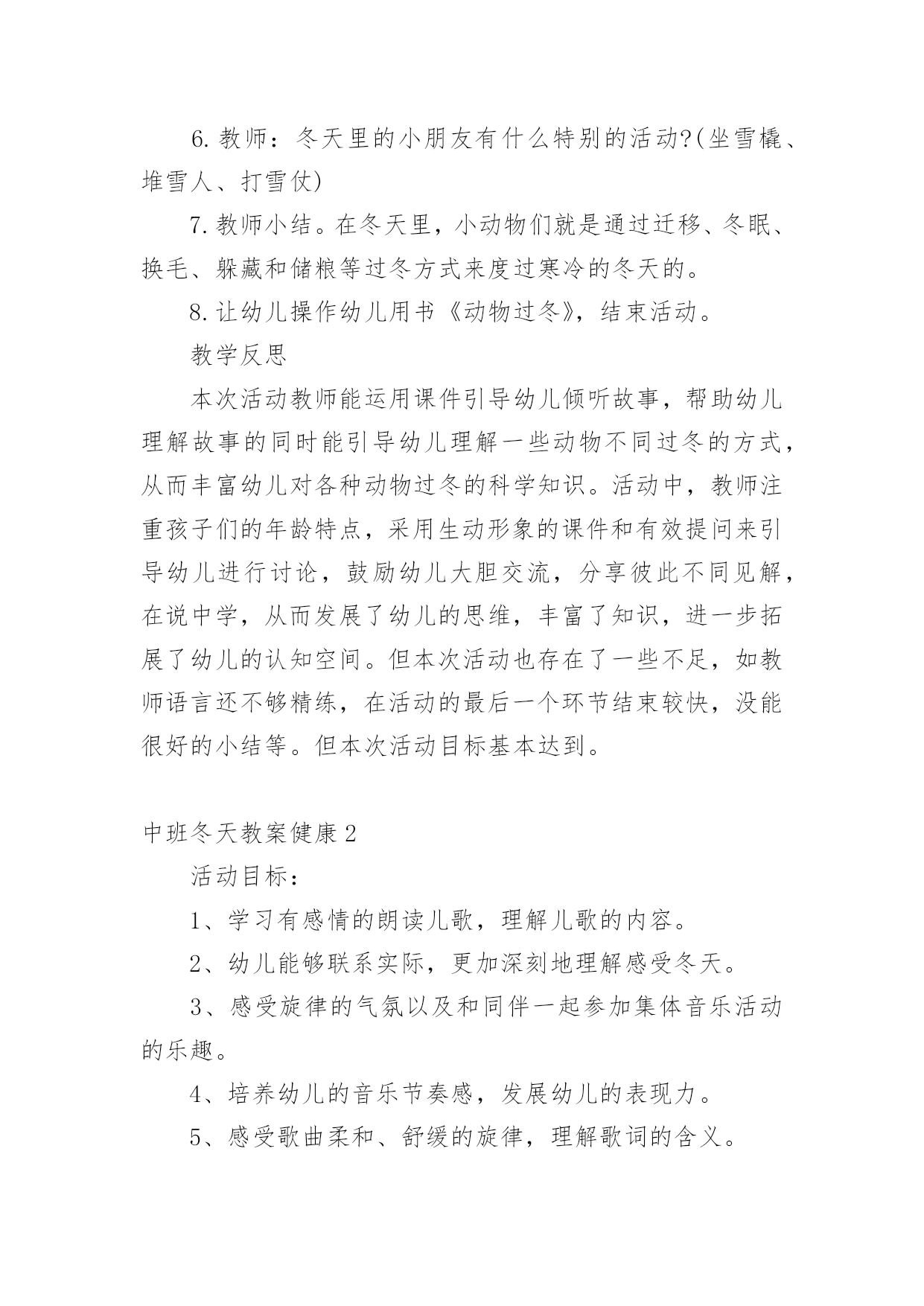 中班冬天教案健康作为一名人民教师,就有可能用到教案,教案有利于教学水平的提高,有助于教研活动的开展。快来参考教案是怎么写的吧!下面是小编帮大家整理的中班冬天教案健康,欢迎阅读,希望大家能够喜欢。中班冬天教案健康1设计背景随着冬天的到来,孩子们发现人们的穿着有所改变的同时也产生许多迷惑:“为什么看不到小蚂蚁出来搬食物?树上的小鸟不见了,它们都到哪去了?”孩子们对动物的生活习性的改变产生了好奇,因此为了顺应幼儿的兴趣需要和发展的需要,我通过活动《冬天是什么》可以让孩子们了解冬天对动物们生活习性产生的影响,以激发幼儿的兴趣和对动物的情感。活动目标1.理解故事《冬天是什么》,感受冬天里的快乐,了解一些动物在冬天里的特别活动。2.理解一些动物不同的过冬方式。3.通过语言表达和动作相结合的形式充分感受故事的'童趣。4.能分析故事情节,培养想象力。5.引导幼儿在故事和游戏中学习,感悟生活。重点难点重点:理解故事,感受冬天的快乐。难点:知道动物过冬的几种不同方式。活动准备幼儿用书《动物过冬》,教学课件《冬天是什么》。活动过程1.教师:冬天里我们用什么方法来取暖呢?吃热的东西,戴围巾、戴手套、穿棉袄、戴棉帽,烤火或用取暖器、做运动等方式取暖。2.教师:原来,在寒冷的冬天里我们有好多方法来取暖!但是,小动物们又是怎样度过寒冷的冬天呢?下面我们来听一听、看一看!一、倾听故事《冬天是什么》教师播放故事课件,讲述故事。二、理解故事,交流讨论1.教师:故事的名字叫什么?故事里都有哪些动物?2.教师:冬天,燕子、杜鹃和大雁有什么特别的活动?(飞到温暖的南方—迁移过冬)3.教师:青蛙、小熊和蛇又有什么特别的活动?(美美地睡觉—冬眠)4.教师:松鼠、兔子和绵羊身上出现什么特别的现象?(长出更多更厚的毛御冷—换毛过冬)5.教师:蚂蚁有什么特别的表现?(躲在窝里,不出门—躲藏过冬和储粮过冬)6.教师:冬天里的小朋友有什么特别的活动?(坐雪橇、堆雪人、打雪仗)7.教师小结。在冬天里,小动物们就是通过迁移、冬眠、换毛、躲藏和储粮等过冬方式来度过寒冷的冬天的。8.让幼儿操作幼儿用书《动物过冬》,结束活动。教学反思本次活动教师能运用课件引导幼儿倾听故事,帮助幼儿理解故事的同时能引导幼儿理解一些动物不同过冬的方式,从而丰富幼儿对各种动物过冬的科学知识。活动中,教师注重孩子们的年龄特点,采用生动形象的课件和有效提问来引导幼儿进行讨论,鼓励幼儿大胆交流,分享彼此不同见解,在说中学,从而发展了幼儿的思维,丰富了知识,进一步拓展了幼儿的认知空间。但本次活动也存在了一些不足,如教师语言还不够精练,在活动的最后一个环节结束较快,没能很好的小结等。但本次活动目标基本达到。中班冬天教案健康2活动目标:1、学习有感情的朗读儿歌,理解儿歌的内容。2、幼儿能够联系实际,更加深刻地理解感受冬天。3、感受旋律的气氛以及和同伴一起参加集体音乐活动的乐趣。4、培养幼儿的音乐节奏感,发展幼儿的表现力。5、感受歌曲柔和、舒缓的旋律,理解歌词的含义。重点难点:理解儿歌的内容,联系实际,理解冬天、感受冬天。活动准备:1、活动前:趁着下雪天,让小宝宝们穿好棉衣戴好棉帽等冬日的新装去户外欣赏雪景,玩雪,引起幼儿对雪花的兴趣,切身感受冬天:2、冬天下雪、堆雪人的.图片;3、儿歌挂图。活动过程:一、开始部分教师引导幼儿观察身边的天气状况。教师:“宝宝们,看看外面的天气怎么样?”(冷了!下雪啦!)教师:“是啊,大家的穿着有何变化呢?”(穿棉衣了!戴棉帽啦!)二、展开部分1、通过谈话,引起幼儿对冬天及其雪花的好奇。教师:“冬天到了,小朋友们见过雪花吗?想不想看下雪的情景啊?”(想……)老师和幼儿一起观赏有关下雪的图片。2、通过观察画面内容,切身理解感受冬天的氛围。教师:“小朋友们你们看到了什么?画面里的小朋友们穿者打扮怎么样呢?他们为什么会有这样的打扮呢?”老师引导,围绕上述几个问题展开互动,从而导出《冬天到》儿歌学习。3、幼儿学念儿歌。(1)教师边做动作,边带领全班幼儿朗诵。(2)请能力强的幼儿带上动作朗读儿歌。(3)实行班级带领式学教儿歌,(即能力强的充当老师带领几个相对滞后生带上动作朗读儿歌。实行小组学习,进行小组讲评。)三、结束部分教师带领幼儿唱读书儿歌《冬天到》,指导儿歌中小朋友在冬天到来的时候注意戴棉帽、穿棉衣等习惯,防止生病感冒。教学反思:本次活动,老师主要抓住幼儿贪玩这一本性,利用幼儿这一特点,进行活动,从活动中发现并强调冬天这一季节时小朋友的着装特点,教会他们基本的生活习惯。中班冬天教案健康3活动目标:1、让幼儿了解寒假中应注意的安全,增强幼儿的自我保护意识。2、通过讨论,教育幼儿愉快、合理地过寒假。3、培养幼儿的表达能力和对事物的判断能力。4、培养幼儿反应的敏捷性和对动作的控制能力。5、探索、发现生
