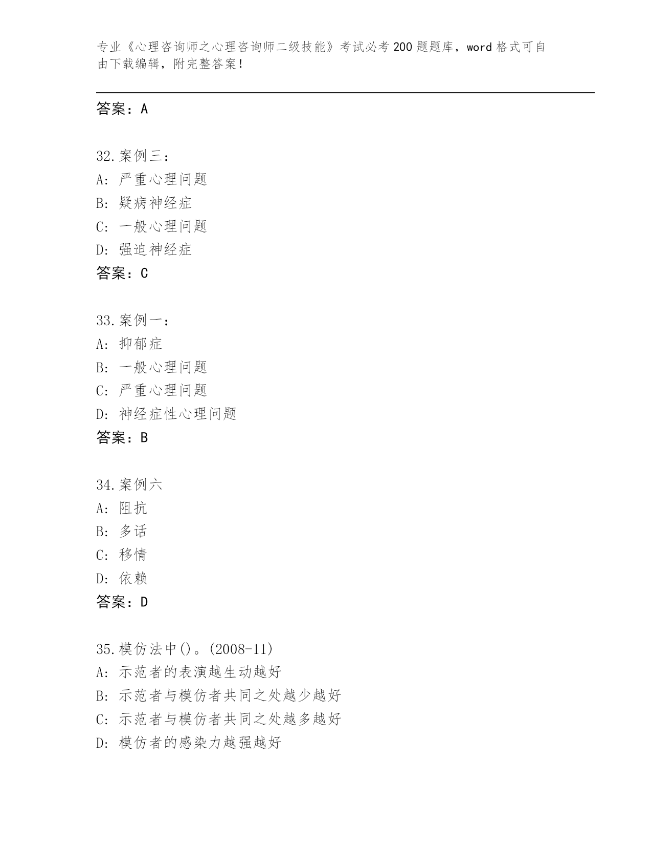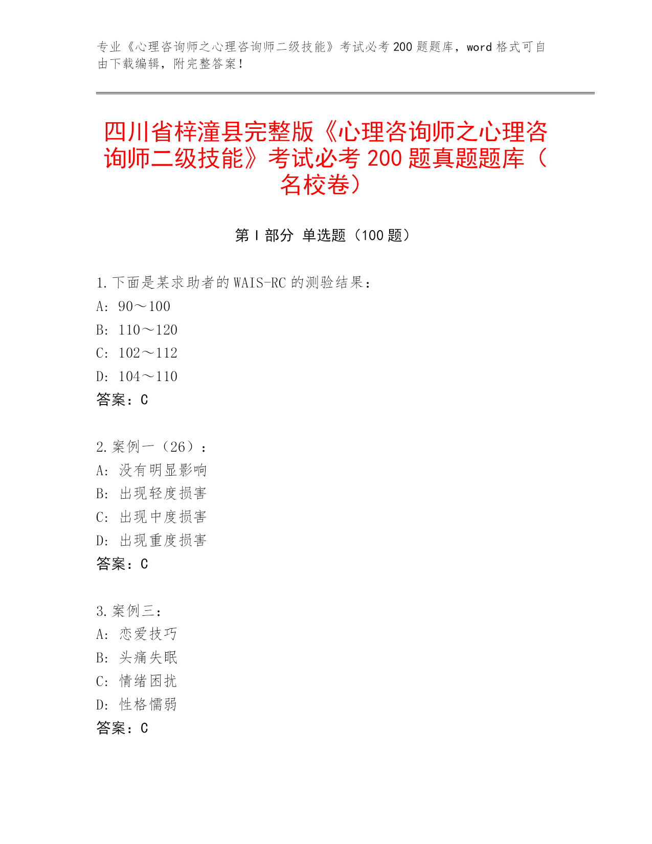 四川省梓潼县完整版《心理咨询师之心理咨询师二级技能》考试必考200题真题题库(名校卷)