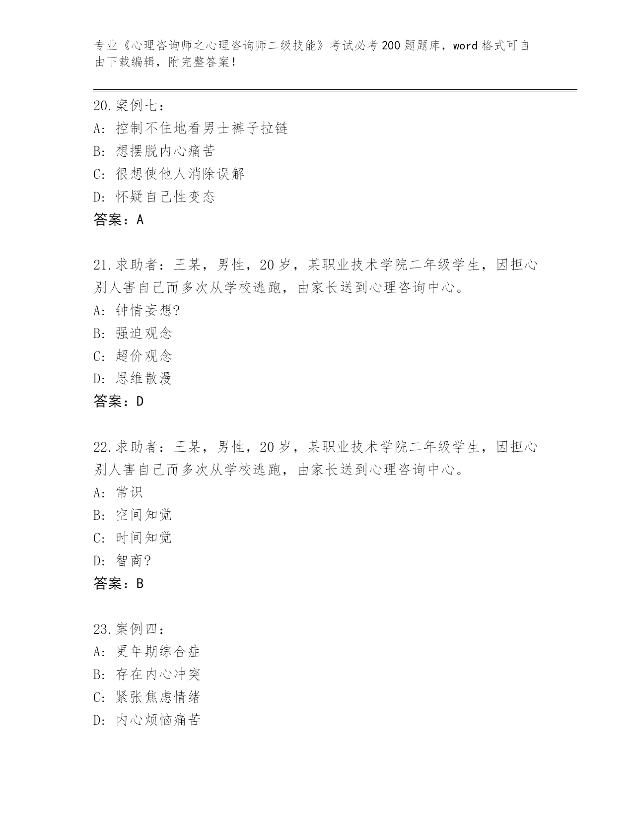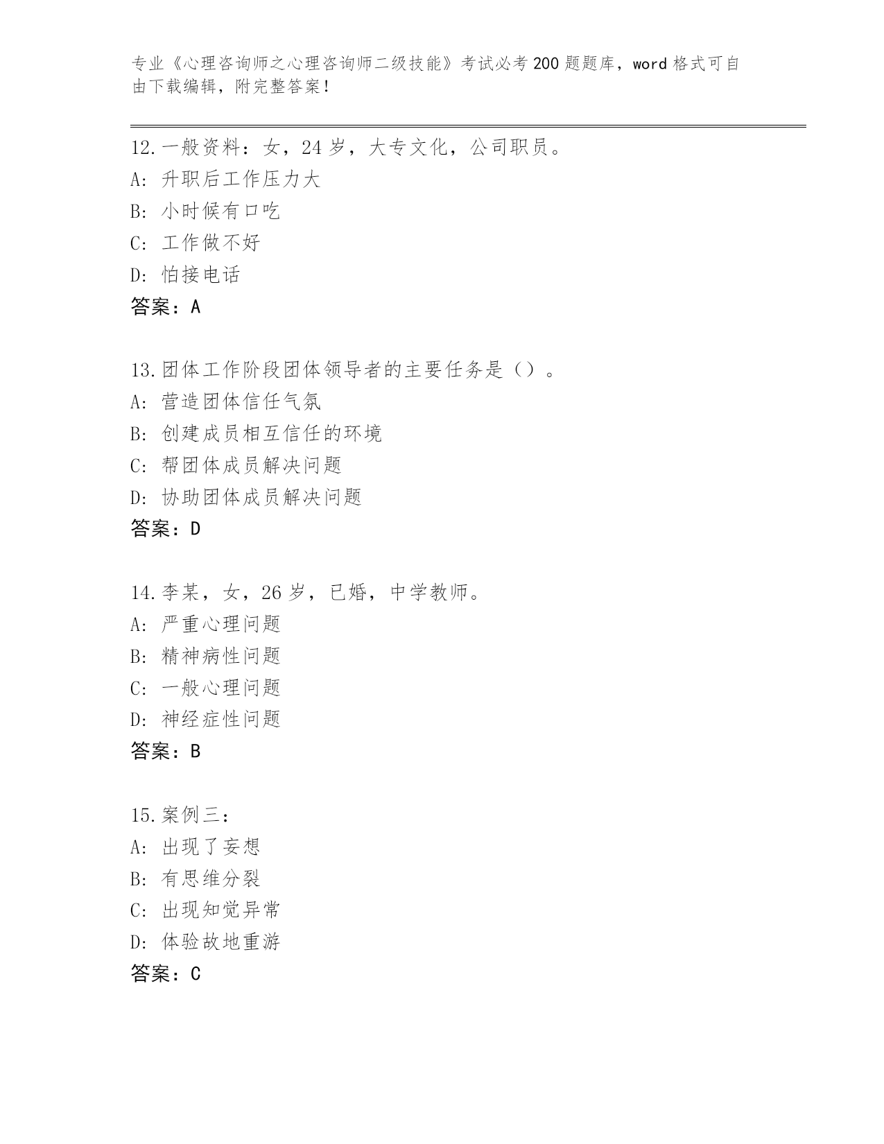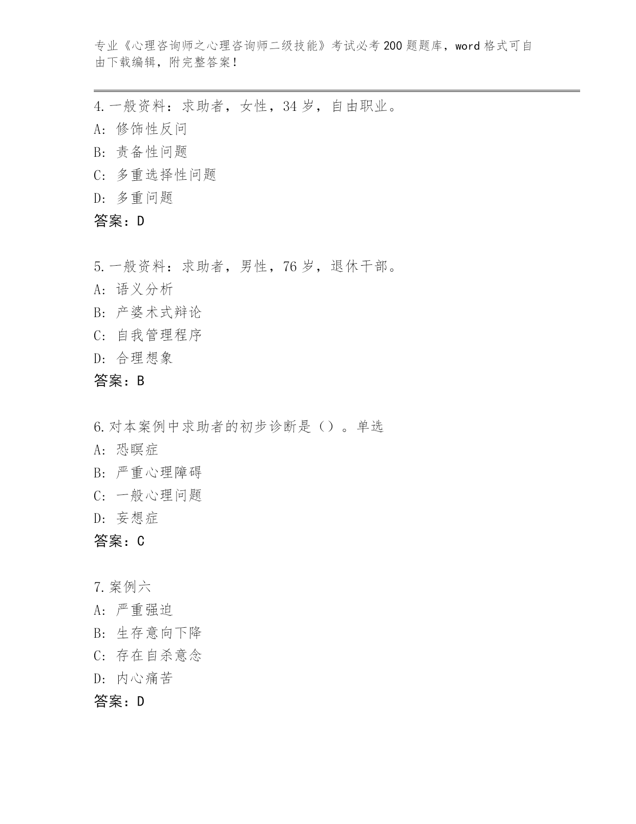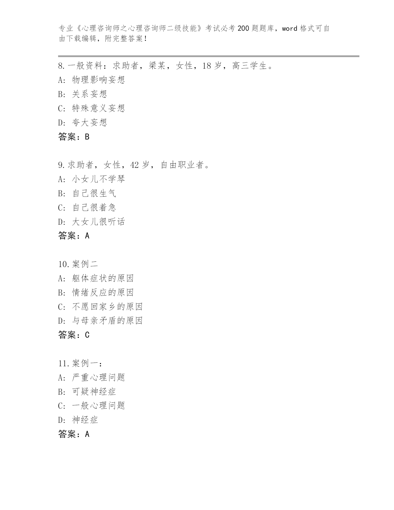 上海市崇明区2024年《心理咨询师之心理咨询师二级技能》考试必考200题真题【名校卷】