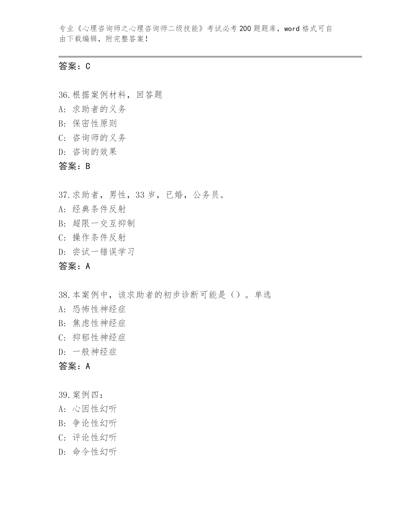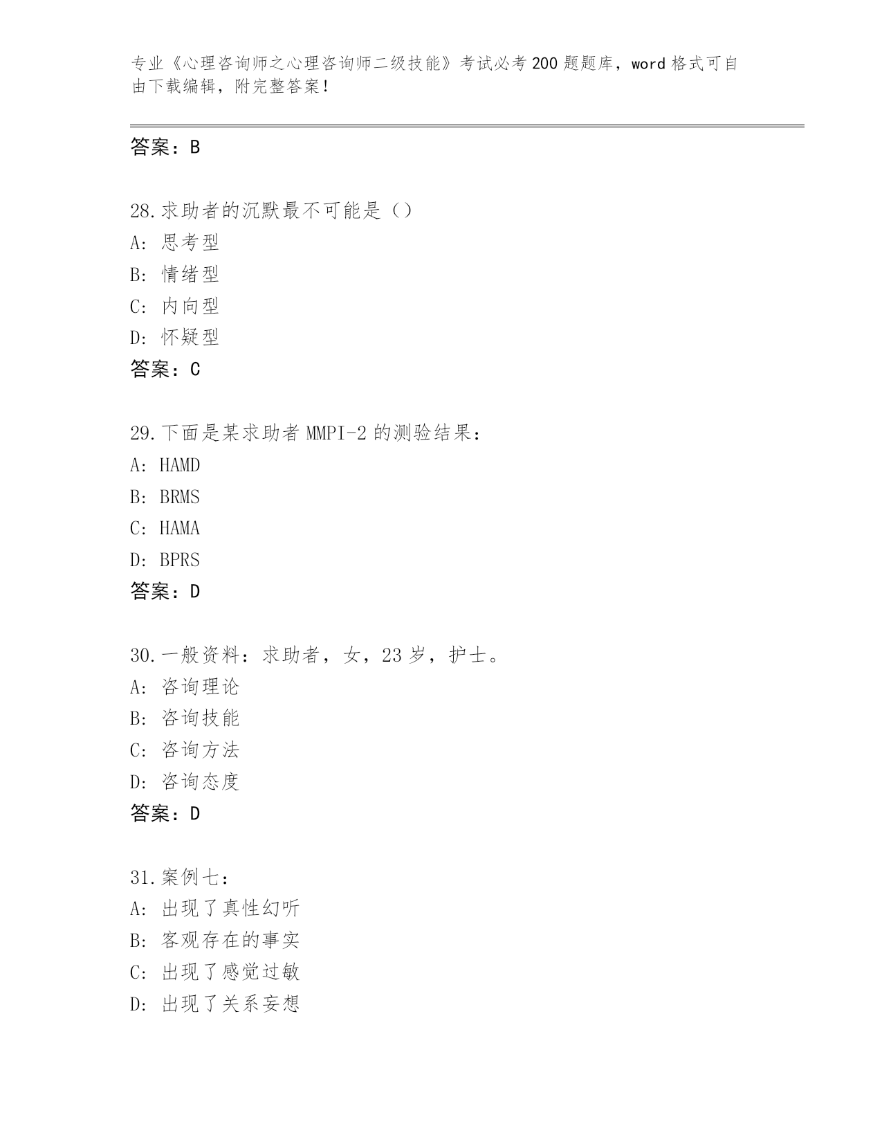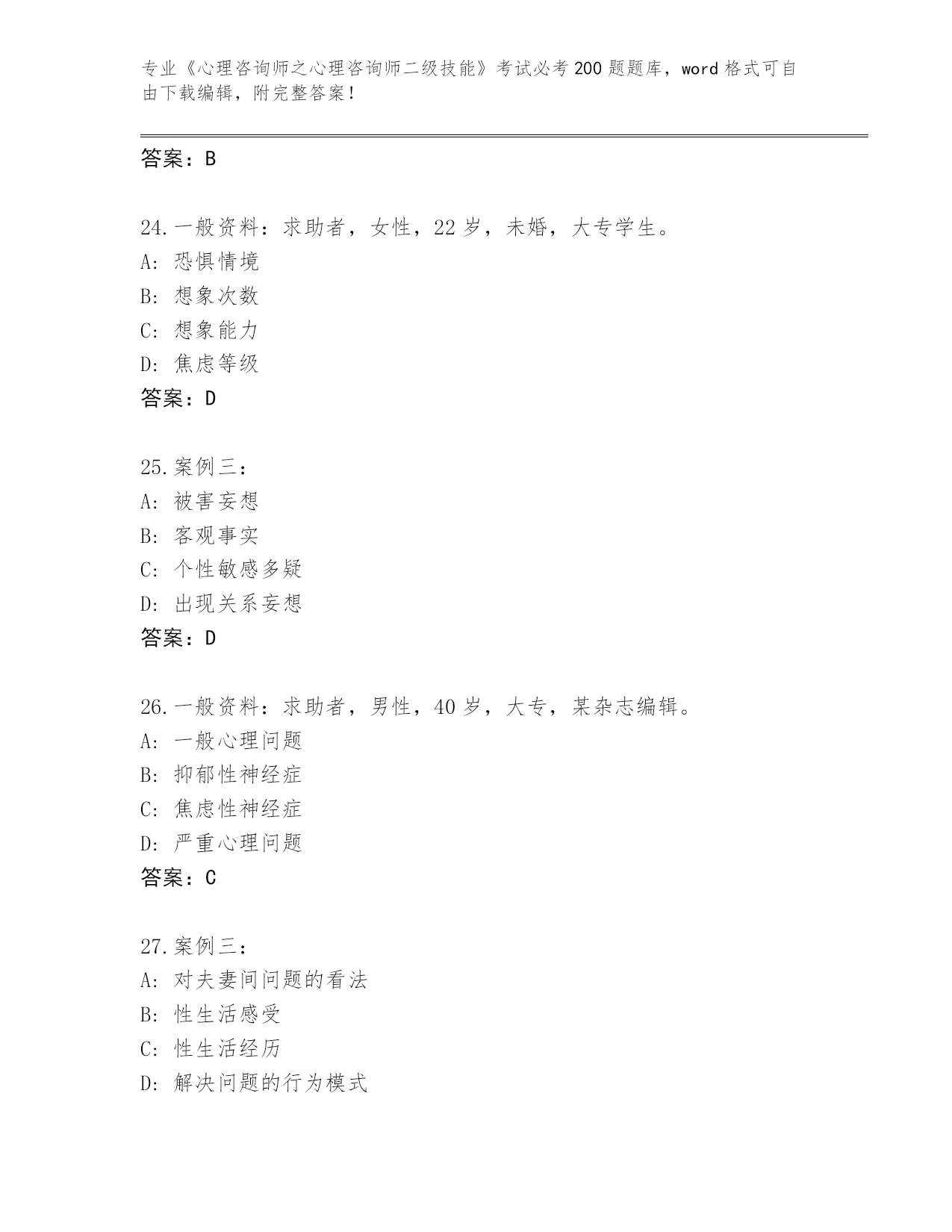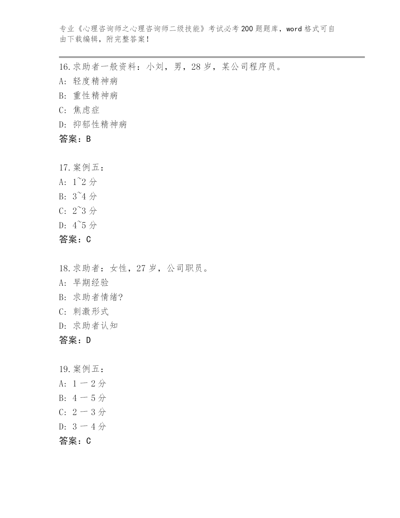 上海市崇明区2024年《心理咨询师之心理咨询师二级技能》考试必考200题真题【名校卷】