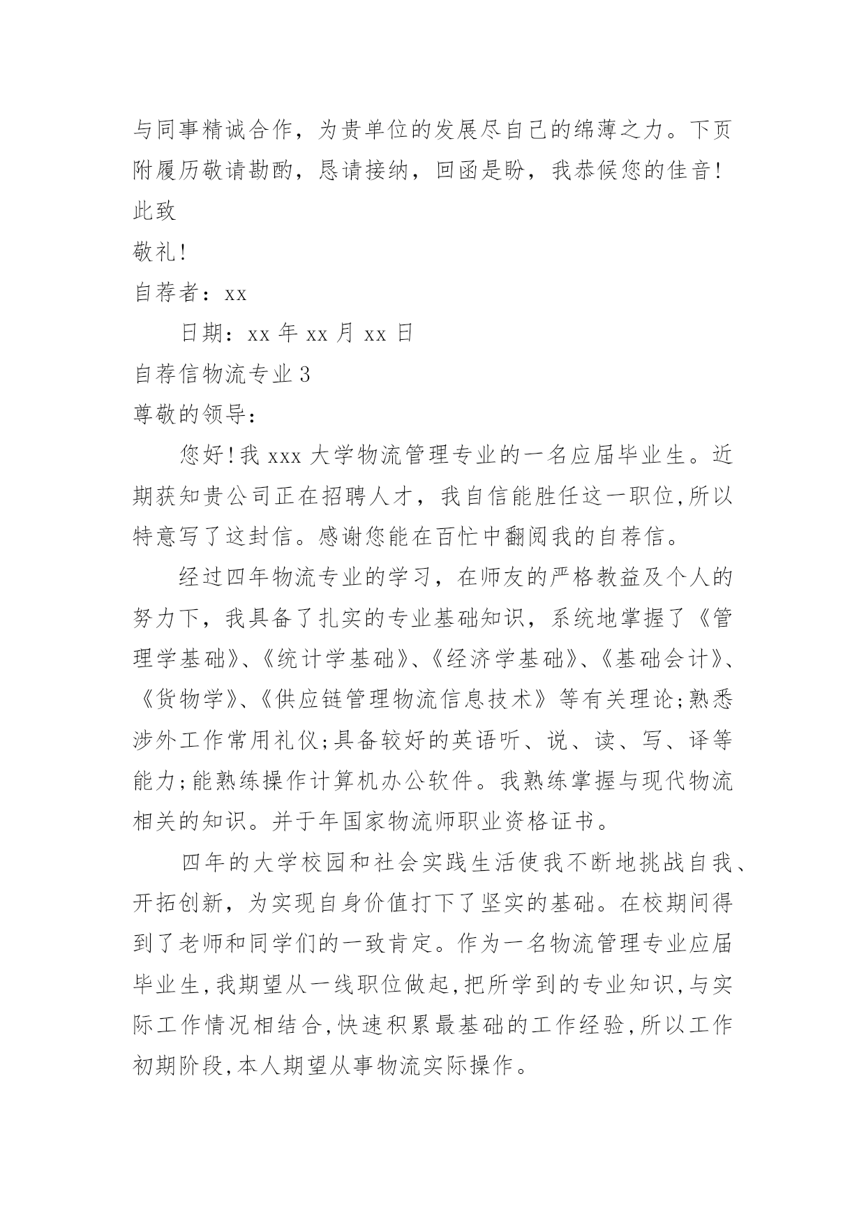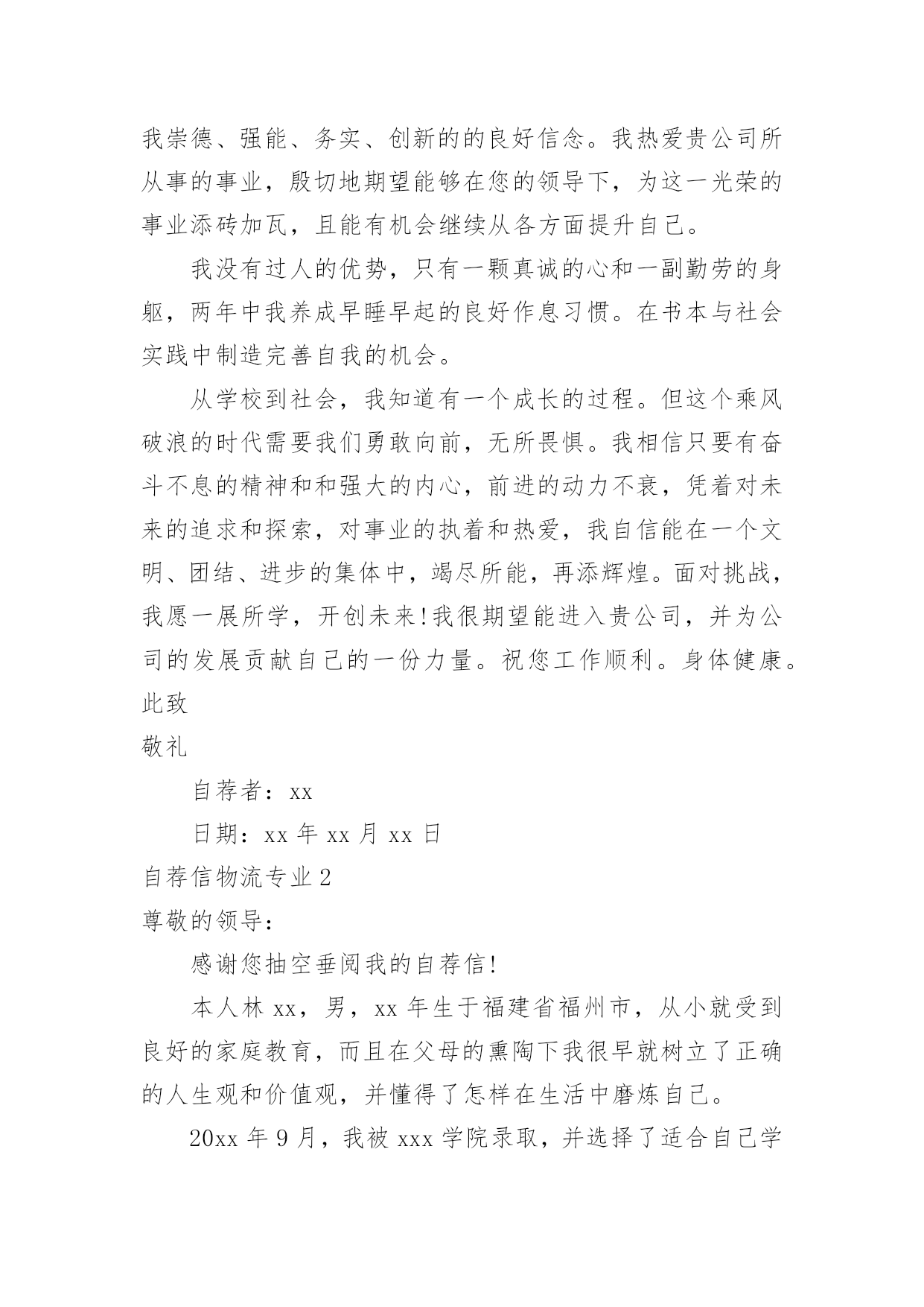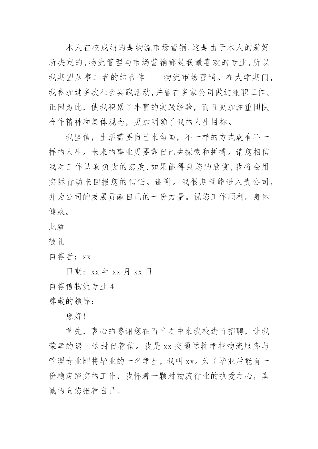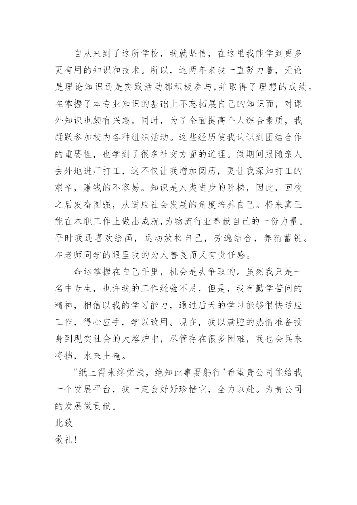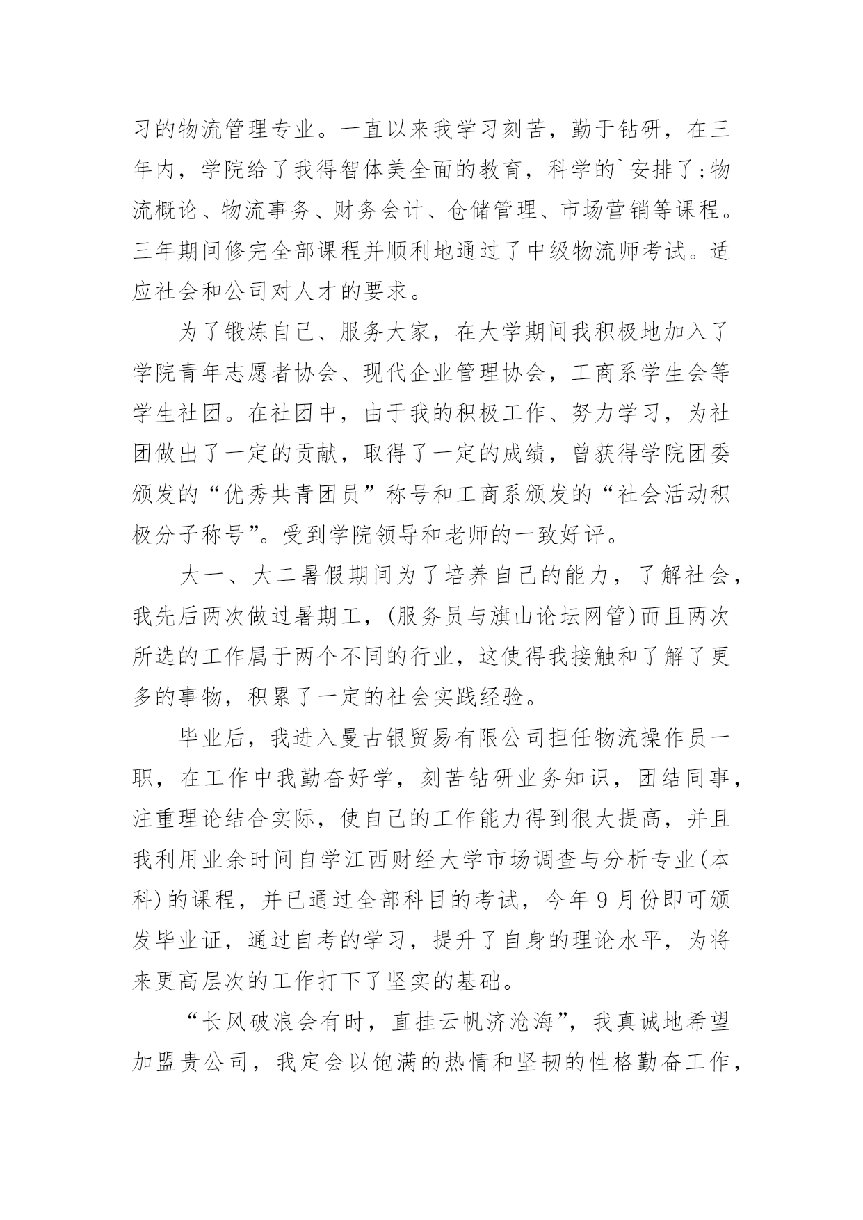 自荐信物流专业自荐信物流专业在如今这个时代,需要使用自荐信的场合越来越多,我们在写自荐信的时候要注意理由要充分、合理。为了让您不再为写自荐信头疼,下面是小编为大家收集的自荐信物流专业,欢迎阅读,希望大家能够喜欢。自荐信物流专业1尊敬的领导:您好!首先感谢您在百忙之中抽出时间来阅读我的自荐材料。新世纪,风云际会,机会与挑战,两相并存。我是一名即将毕业的大二学生,现需要一份工作来完善我的大学生涯。大学两年,在学习上我全身心投入到本专业物流管理的学习中外,还学习了感兴趣的心理知识,课余时间基本都在图书馆阅读喜欢的书籍,从中找寻读书的乐趣。此外,我还积极地参加各种社会活动,加入院学生会学习部、校文学社、校英文广播电台等社团,结交了许多值得相互学习的同学,赢得了人生又一笔宝贵的财富。此外,在服务他人的同时积极培养了自己的社交能力,抓住每一个机会,锻炼自己。大学两年,我深深地感受到,与优秀学生共事,能使我在竞争中获益;向实际困难挑战,让我在挫折中成长。祖辈们教我勤奋、尽责、善良、正直;黄冈职业技术学院培养了我崇德、强能、务实、创新的的良好信念。我热爱贵公司所从事的事业,殷切地期望能够在您的领导下,为这一光荣的事业添砖加瓦,且能有机会继续从各方面提升自己。我没有过人的优势,只有一颗真诚的心和一副勤劳的身躯,两年中我养成早睡早起的良好作息习惯。在书本与社会实践中制造完善自我的机会。从学校到社会,我知道有一个成长的过程。但这个乘风破浪的时代需要我们勇敢向前,无所畏惧。我相信只要有奋斗不息的精神和和强大的内心,前进的动力不衰,凭着对未来的追求和探索,对事业的执着和热爱,我自信能在一个文明、团结、进步的集体中,竭尽所能,再添辉煌。面对挑战,我愿一展所学,开创未来!我很期望能进入贵公司,并为公司的发展贡献自己的一份力量。祝您工作顺利。身体健康。此致敬礼自荐者:xx日期:xx年xx月xx日自荐信物流专业2尊敬的领导:感谢您抽空垂阅我的自荐信!本人林xx,男,xx年生于福建省福州市,从小就受到良好的家庭教育,而且在父母的熏陶下我很早就树立了正确的人生观和价值观,并懂得了怎样在生活中磨炼自己。20xx年9月,我被xxx学院录取,并选择了适合自己学习的物流管理专业。一直以来我学习刻苦,勤于钻研,在三年内,学院给了我得智体美全面的教育,科学的`安排了;物流概论、物流事务、财务会计、仓储管理、市场营销等课程。三年期间修完全部课程并顺利地通过了中级物流师考试。适应社会和公司对人才的要求。为了锻炼自己、服务大家,在大学期间我积极地加入了学院青年志愿者协会、现代企业管理协会,工商系学生会等学生社团。在社团中,由于我的积极工作、努力学习,为社团做出了一定的贡献,取得了一定的成绩,曾获得学院团委颁发的“优秀共青团员”称号和工商系颁发的“社会活动积极分子称号”。受到学院领导和老师的一致好评。大一、大二暑假期间为了培养自己的能力,了解社会,我先后两次做过暑期工,(服务员与旗山论坛网管)而且两次所选的工作属于两个不同的行业,这使得我接触和了解了更多的事物,积累了一定的社会实践经验。毕业后,我进入曼古银贸易有限公司担任物流操作员一职,在工作中我勤奋好学,刻苦钻研业务知识,团结同事,注重理论结合实际,使自己的工作能力得到很大提高,并且我利用业余时间自学江西财经大学市场调查与分析专业(本科)的课程,并已通过全部科目的考试,今年9月份即可颁发毕业证,通过自考的学习,提升了自身的理论水平,为将来更高层次的工作打下了坚实的基础。“长风破浪会有时,直挂云帆济沧海”,我真诚地希望加盟贵公司,我定会以饱满的热情和坚韧的性格勤奋工作,与同事精诚合作,为贵单位的发展尽自己的绵薄之力。下页附履历敬请勘酌,恳请接纳,回函是盼,我恭候您的佳音!此致敬礼!自荐者:xx日期:xx年xx月xx日自荐信物流专业3尊敬的领导:您好!我xxx大学物流管理专业的一名应届毕业生。近期获知贵公司正在招聘人才,我自信能胜任这一职位,所以特意写了这封信。感谢您能在百忙中翻阅我的自荐信。经过四年物流专业的学习,在师友的严格教益及个人的努力下,我具备了扎实的专业基础知识,系统地掌握了《管理学基础》、《统计学基础》、《经济学基础》、《基础会计》、《货物学》、《供应链管理物流信息技术》等有关理论;熟悉涉外工作常用礼仪;具备较好的英语听、说、读、写、译等能力;能熟练操作计算机办公软件。我熟练掌握与现代物流相关的知识。并于年国家物流师职业资格证书。四年的大学校园和社会实践生活使我不断地挑战自我、开拓创新,为实现自身价值打下了坚实的基础。在校期间得到了老师和同学们的一致肯定。作为一名物流管理专业应届毕业生,我期望从一线职位做起,把所学到的专业知识,与实际工作情况相结合,快速积累最基础的工作经验,所以工作初期阶段,本人期望从事物流实际操作