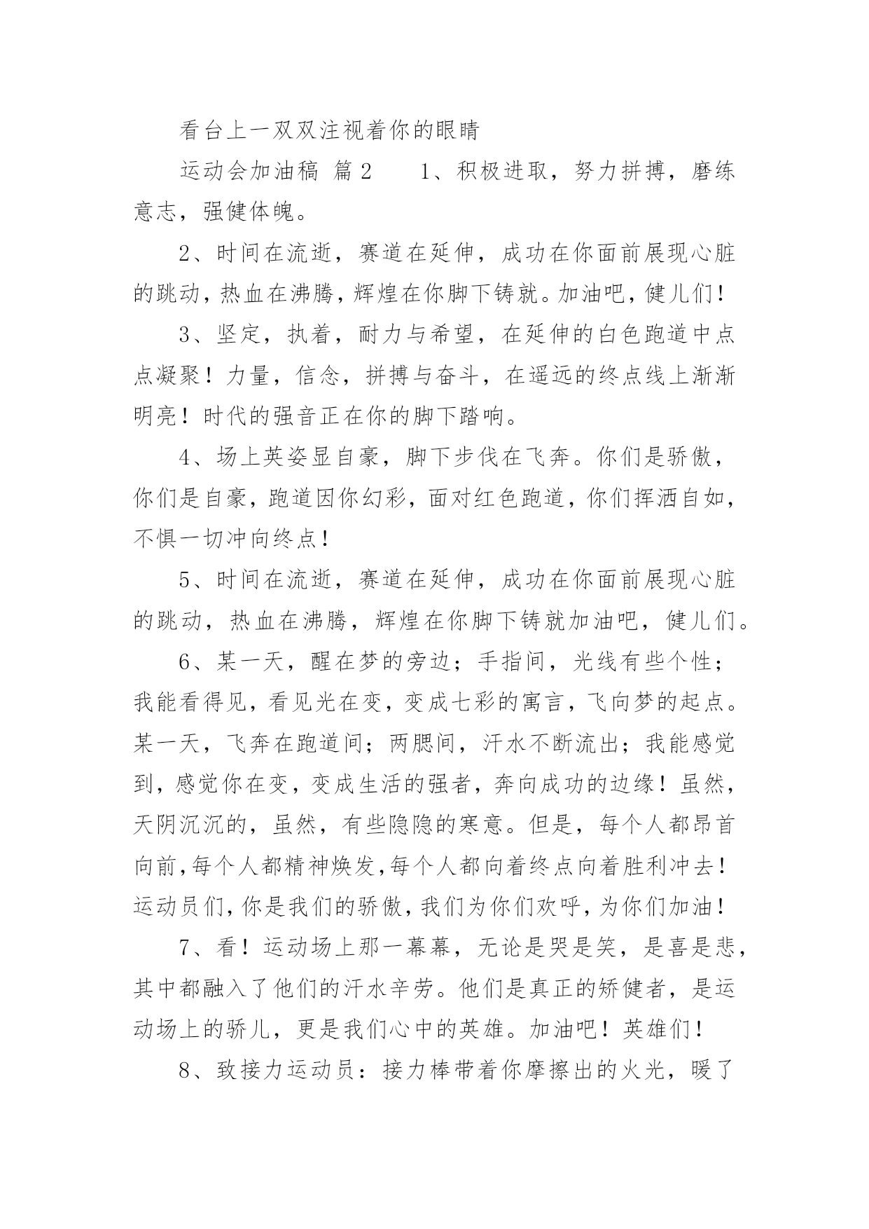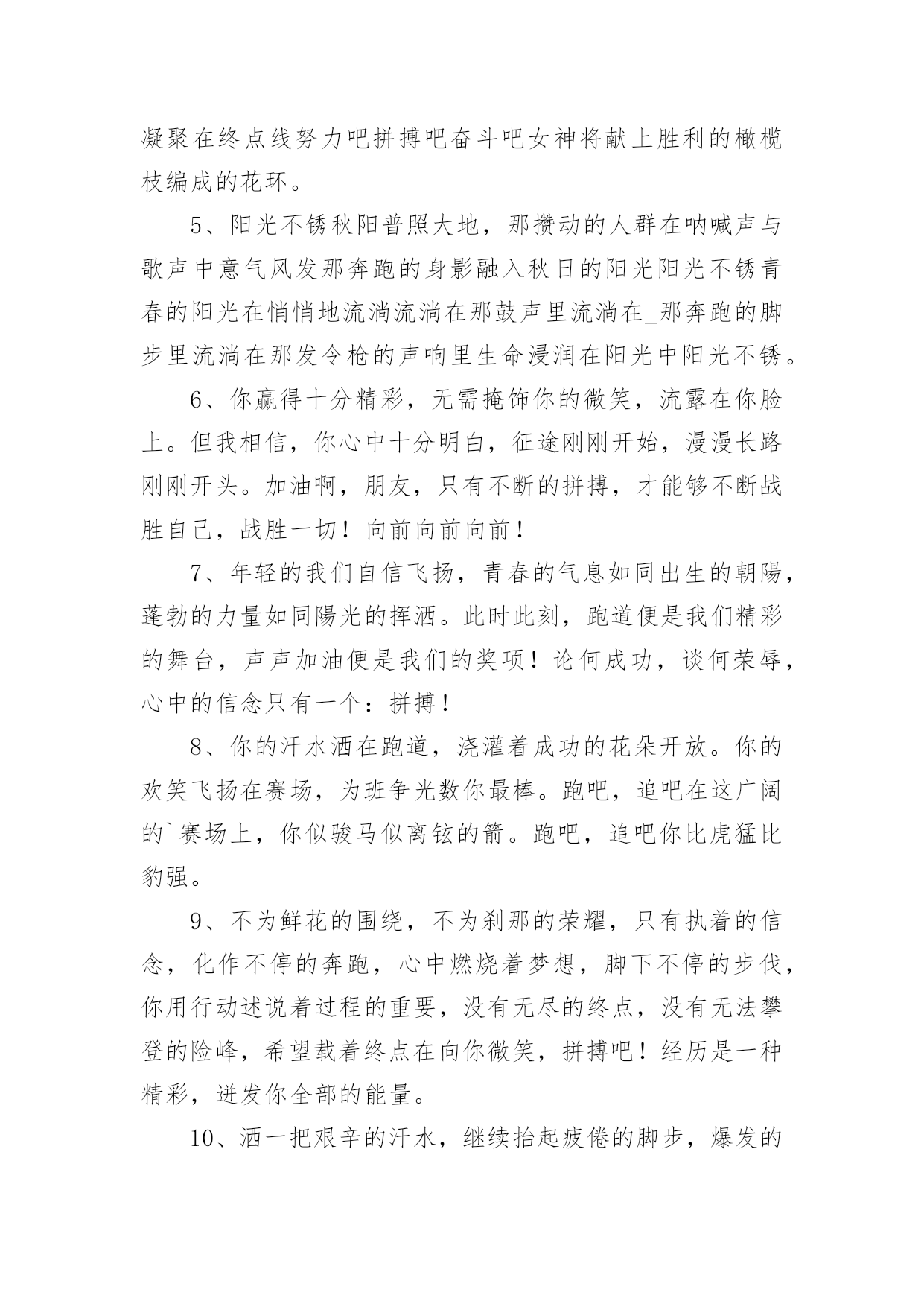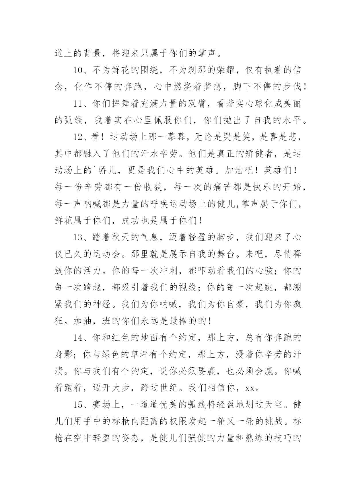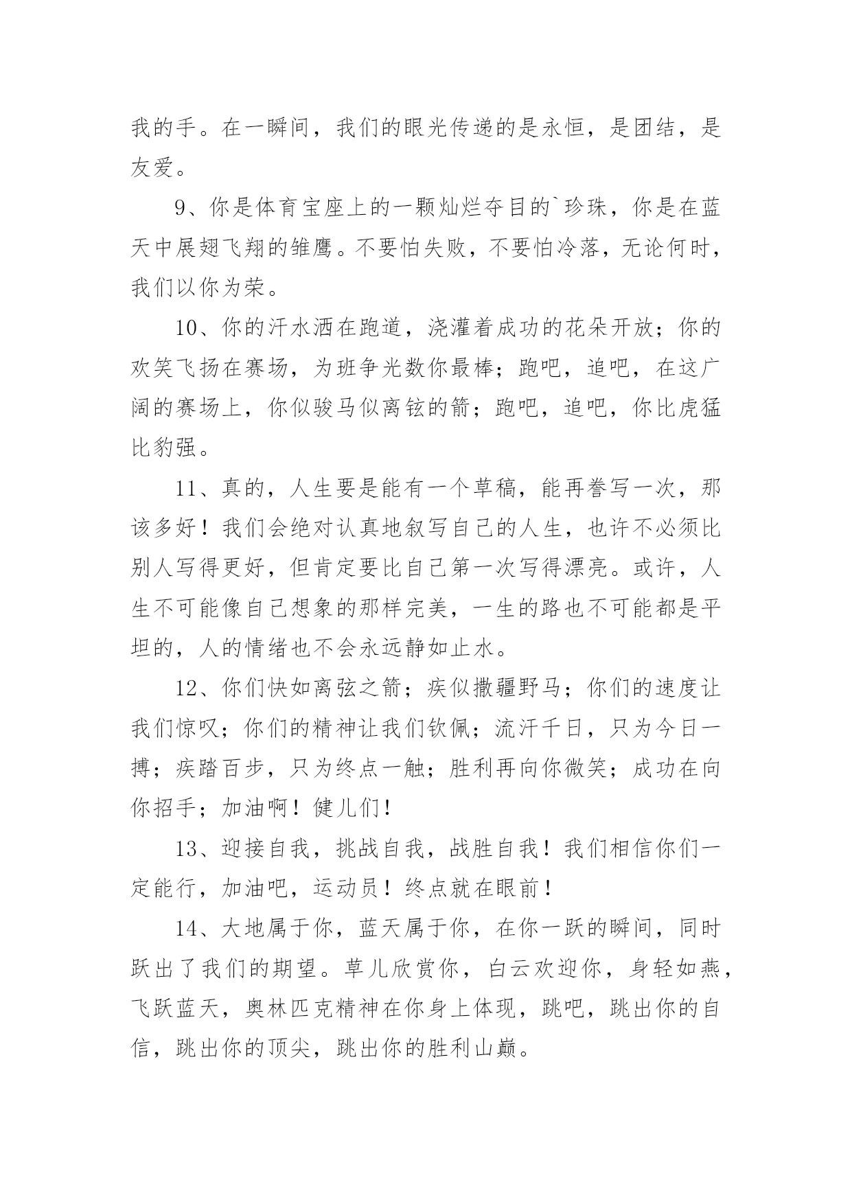 运动会加油稿运动会加油稿14篇在不断进步的时代,我们用到加油稿的地方越来越多,加油稿可以增添对方必胜的勇气和信心。写加油稿的注意事项有许多,你确定会写吗?以下是小编帮大家整理的运动会加油稿,希望对大家有所帮助。运动会加油稿篇1奔跑,追逐,在这片广阔的土地上,你离玄就像一匹马和一支箭。快跑,追,你比老虎和豹子都强。刹那永恒一片片红色,一点点绿色世界因为你而更加美丽风在轻轻地歌唱成功,自由我陪你一起追求额上的'寒珠折射的不仅是阳光还有一种希望它,来自播种你看看台上一双双注视着你的眼睛运动会加油稿篇21、积极进取,努力拼搏,磨练意志,强健体魄。2、时间在流逝,赛道在延伸,成功在你面前展现心脏的跳动,热血在沸腾,辉煌在你脚下铸就。加油吧,健儿们!3、坚定,执着,耐力与希望,在延伸的白色跑道中点点凝聚!力量,信念,拼搏与奋斗,在遥远的终点线上渐渐明亮!时代的强音正在你的脚下踏响。4、场上英姿显自豪,脚下步伐在飞奔。你们是骄傲,你们是自豪,跑道因你幻彩,面对红色跑道,你们挥洒自如,不惧一切冲向终点!5、时间在流逝,赛道在延伸,成功在你面前展现心脏的跳动,热血在沸腾,辉煌在你脚下铸就加油吧,健儿们。6、某一天,醒在梦的旁边;手指间,光线有些个性;我能看得见,看见光在变,变成七彩的寓言,飞向梦的起点。某一天,飞奔在跑道间;两腮间,汗水不断流出;我能感觉到,感觉你在变,变成生活的强者,奔向成功的边缘!虽然,天阴沉沉的,虽然,有些隐隐的寒意。但是,每个人都昂首向前,每个人都精神焕发,每个人都向着终点向着胜利冲去!运动员们,你是我们的骄傲,我们为你们欢呼,为你们加油!7、看!运动场上那一幕幕,无论是哭是笑,是喜是悲,其中都融入了他们的汗水辛劳。他们是真正的矫健者,是运动场上的骄儿,更是我们心中的英雄。加油吧!英雄们!8、致接力运动员:接力棒带着你摩擦出的火光,暖了我的手。在一瞬间,我们的眼光传递的是永恒,是团结,是友爱。9、你是体育宝座上的一颗灿烂夺目的`珍珠,你是在蓝天中展翅飞翔的雏鹰。不要怕失败,不要怕冷落,无论何时,我们以你为荣。10、你的汗水洒在跑道,浇灌着成功的花朵开放;你的欢笑飞扬在赛场,为班争光数你最棒;跑吧,追吧,在这广阔的赛场上,你似骏马似离铉的箭;跑吧,追吧,你比虎猛比豹强。11、真的,人生要是能有一个草稿,能再誊写一次,那该多好!我们会绝对认真地叙写自己的人生,也许不必须比别人写得更好,但肯定要比自己第一次写得漂亮。或许,人生不可能像自己想象的那样完美,一生的路也不可能都是平坦的,人的情绪也不会永远静如止水。12、你们快如离弦之箭;疾似撒疆野马;你们的速度让我们惊叹;你们的精神让我们钦佩;流汗千日,只为今日一搏;疾踏百步,只为终点一触;胜利再向你微笑;成功在向你招手;加油啊!健儿们!13、迎接自我,挑战自我,战胜自我!我们相信你们一定能行,加油吧,运动员!终点就在眼前!14、大地属于你,蓝天属于你,在你一跃的瞬间,同时跃出了我们的期望。草儿欣赏你,白云欢迎你,身轻如燕,飞跃蓝天,奥林匹克精神在你身上体现,跳吧,跳出你的自信,跳出你的顶尖,跳出你的胜利山巅。15、青春的脚步,青春的速度,青春的活力,青春的激情,将会在你们的身上尽情体现。迎接自我,挑战自我,战胜自我!我们相信你们必须能行,加油吧,运动员!终点就在眼前!运动会加油稿篇31、风一样的步伐在烈日下微笑奔跑,没有啦啦队,甚至听不到呐喊,你依旧那么欢悦。骄阳似火,你的激情却胜似火,整个操场你是最亮的一点。加油!2、每一份辛劳都有一份收获,每一次的痛苦都是快乐的开始,没一声呐喊都是力量的呼唤。我们有着大浪拍岸的豪迈,所以你不必在乎小荷初露的恬静,我们有着春日的阳光明媚,所以不用去羡慕冬日乱玉碎琼,我们是雨天的一把伞,是寒冷冬日里的一盆碳火,温暖的不只是你我,而是大家的心。运动场上的健儿,掌声属于你们,鲜花属于你们,成功也是属于你们!3、在今日的赛场上,我只是个场边的看客。我用眼睛见证了赛场上的是非成败,用心灵感受了运动员的喜怒哀乐。他坚持跑完全程,我学到了坚持的可贵,他摔倒了再站起来,我学会了不怕失败的勇气。场上每一个点滴,都如此的震撼我的心灵。在今日的赛场上,我只是个场边的看客,但我学到了很多。4、胜利的橄榄枝黎明前黑暗的苍穹繁星点点普罗米修斯将体育的圣火点燃随着一道霞光运动的火焰升腾在奥林匹亚山今日的健儿们英姿勃发志存高远精神饱满的将目光凝聚在终点线努力吧拼搏吧奋斗吧女神将献上胜利的橄榄枝编成的花环。5、阳光不锈秋阳普照大地,那攒动的人群在呐喊声与歌声中意气风发那奔跑的身影融入秋日的阳光阳光不锈青春的阳光在悄悄地流淌流淌在那鼓声里流淌在_那奔跑的脚步里流淌在那发令枪的声响里生命浸润在阳光中阳光不锈。6、你赢得十分精彩,无需掩饰你的微笑,流露在你脸上。但我相信,你心中十