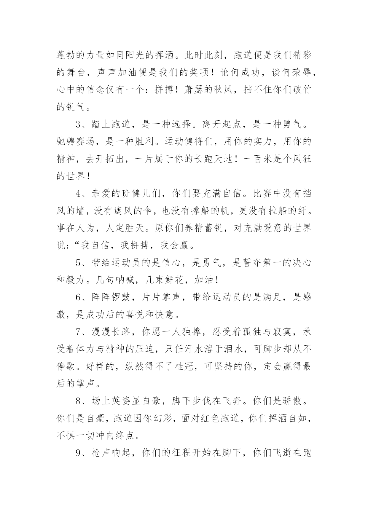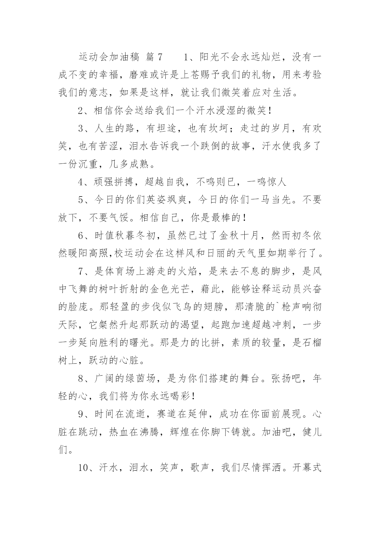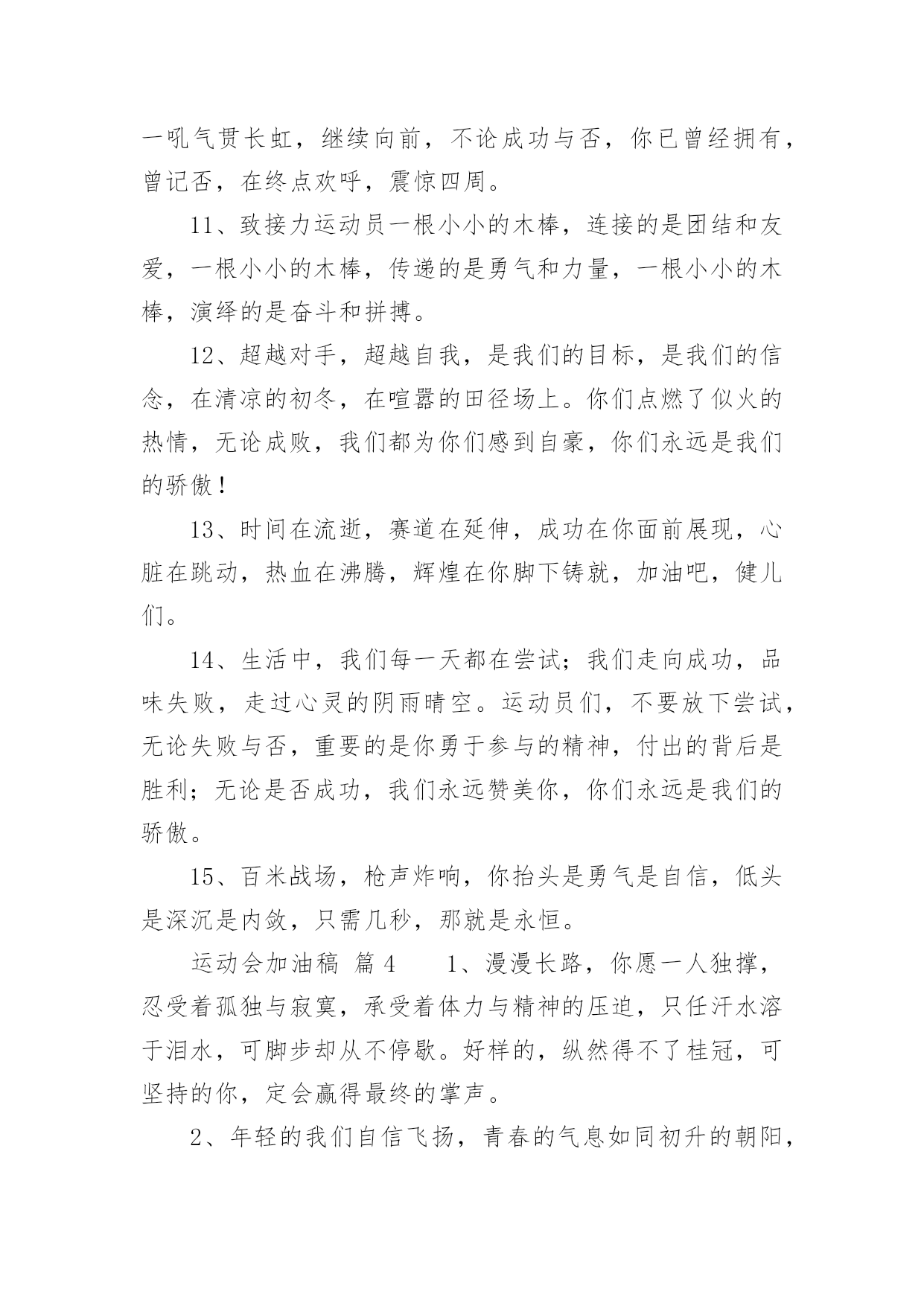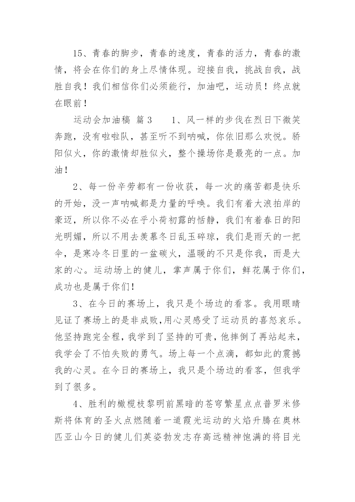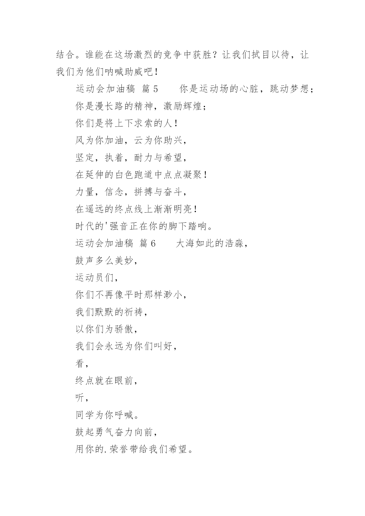 运动会加油稿运动会加油稿14篇在不断进步的时代,我们用到加油稿的地方越来越多,加油稿可以增添对方必胜的勇气和信心。写加油稿的注意事项有许多,你确定会写吗?以下是小编帮大家整理的运动会加油稿,希望对大家有所帮助。运动会加油稿篇1奔跑,追逐,在这片广阔的土地上,你离玄就像一匹马和一支箭。快跑,追,你比老虎和豹子都强。刹那永恒一片片红色,一点点绿色世界因为你而更加美丽风在轻轻地歌唱成功,自由我陪你一起追求额上的'寒珠折射的不仅是阳光还有一种希望它,来自播种你看看台上一双双注视着你的眼睛运动会加油稿篇21、积极进取,努力拼搏,磨练意志,强健体魄。2、时间在流逝,赛道在延伸,成功在你面前展现心脏的跳动,热血在沸腾,辉煌在你脚下铸就。加油吧,健儿们!3、坚定,执着,耐力与希望,在延伸的白色跑道中点点凝聚!力量,信念,拼搏与奋斗,在遥远的终点线上渐渐明亮!时代的强音正在你的脚下踏响。4、场上英姿显自豪,脚下步伐在飞奔。你们是骄傲,你们是自豪,跑道因你幻彩,面对红色跑道,你们挥洒自如,不惧一切冲向终点!5、时间在流逝,赛道在延伸,成功在你面前展现心脏的跳动,热血在沸腾,辉煌在你脚下铸就加油吧,健儿们。6、某一天,醒在梦的旁边;手指间,光线有些个性;我能看得见,看见光在变,变成七彩的寓言,飞向梦的起点。某一天,飞奔在跑道间;两腮间,汗水不断流出;我能感觉到,感觉你在变,变成生活的强者,奔向成功的边缘!虽然,天阴沉沉的,虽然,有些隐隐的寒意。但是,每个人都昂首向前,每个人都精神焕发,每个人都向着终点向着胜利冲去!运动员们,你是我们的骄傲,我们为你们欢呼,为你们加油!7、看!运动场上那一幕幕,无论是哭是笑,是喜是悲,其中都融入了他们的汗水辛劳。他们是真正的矫健者,是运动场上的骄儿,更是我们心中的英雄。加油吧!英雄们!8、致接力运动员:接力棒带着你摩擦出的火光,暖了我的手。在一瞬间,我们的眼光传递的是永恒,是团结,是友爱。9、你是体育宝座上的一颗灿烂夺目的`珍珠,你是在蓝天中展翅飞翔的雏鹰。不要怕失败,不要怕冷落,无论何时,我们以你为荣。10、你的汗水洒在跑道,浇灌着成功的花朵开放;你的欢笑飞扬在赛场,为班争光数你最棒;跑吧,追吧,在这广阔的赛场上,你似骏马似离铉的箭;跑吧,追吧,你比虎猛比豹强。11、真的,人生要是能有一个草稿,能再誊写一次,那该多好!我们会绝对认真地叙写自己的人生,也许不必须比别人写得更好,但肯定要比自己第一次写得漂亮。或许,人生不可能像自己想象的那样完美,一生的路也不可能都是平坦的,人的情绪也不会永远静如止水。12、你们快如离弦之箭;疾似撒疆野马;你们的速度让我们惊叹;你们的精神让我们钦佩;流汗千日,只为今日一搏;疾踏百步,只为终点一触;胜利再向你微笑;成功在向你招手;加油啊!健儿们!13、迎接自我,挑战自我,战胜自我!我们相信你们一定能行,加油吧,运动员!终点就在眼前!14、大地属于你,蓝天属于你,在你一跃的瞬间,同时跃出了我们的期望。草儿欣赏你,白云欢迎你,身轻如燕,飞跃蓝天,奥林匹克精神在你身上体现,跳吧,跳出你的自信,跳出你的顶尖,跳出你的胜利山巅。15、青春的脚步,青春的速度,青春的活力,青春的激情,将会在你们的身上尽情体现。迎接自我,挑战自我,战胜自我!我们相信你们必须能行,加油吧,运动员!终点就在眼前!运动会加油稿篇31、风一样的步伐在烈日下微笑奔跑,没有啦啦队,甚至听不到呐喊,你依旧那么欢悦。骄阳似火,你的激情却胜似火,整个操场你是最亮的一点。加油!2、每一份辛劳都有一份收获,每一次的痛苦都是快乐的开始,没一声呐喊都是力量的呼唤。我们有着大浪拍岸的豪迈,所以你不必在乎小荷初露的恬静,我们有着春日的阳光明媚,所以不用去羡慕冬日乱玉碎琼,我们是雨天的一把伞,是寒冷冬日里的一盆碳火,温暖的不只是你我,而是大家的心。运动场上的健儿,掌声属于你们,鲜花属于你们,成功也是属于你们!3、在今日的赛场上,我只是个场边的看客。我用眼睛见证了赛场上的是非成败,用心灵感受了运动员的喜怒哀乐。他坚持跑完全程,我学到了坚持的可贵,他摔倒了再站起来,我学会了不怕失败的勇气。场上每一个点滴,都如此的震撼我的心灵。在今日的赛场上,我只是个场边的看客,但我学到了很多。4、胜利的橄榄枝黎明前黑暗的苍穹繁星点点普罗米修斯将体育的圣火点燃随着一道霞光运动的火焰升腾在奥林匹亚山今日的健儿们英姿勃发志存高远精神饱满的将目光凝聚在终点线努力吧拼搏吧奋斗吧女神将献上胜利的橄榄枝编成的花环。5、阳光不锈秋阳普照大地,那攒动的人群在呐喊声与歌声中意气风发那奔跑的身影融入秋日的阳光阳光不锈青春的阳光在悄悄地流淌流淌在那鼓声里流淌在_那奔跑的脚步里流淌在那发令枪的声响里生命浸润在阳光中阳光不锈。6、你赢得十分精彩,无需掩饰你的微笑,流露在你脸上。但我相信,你心中十