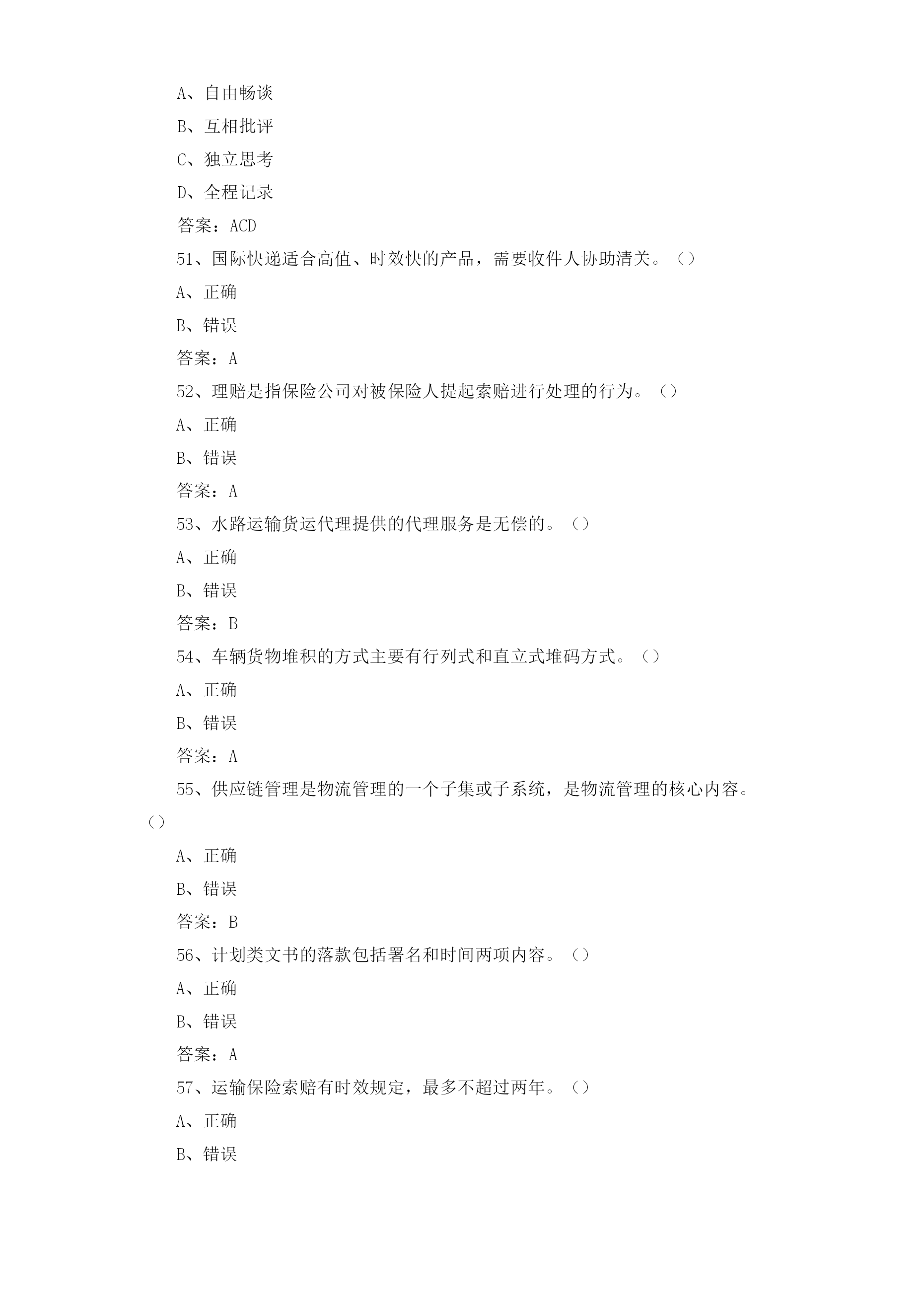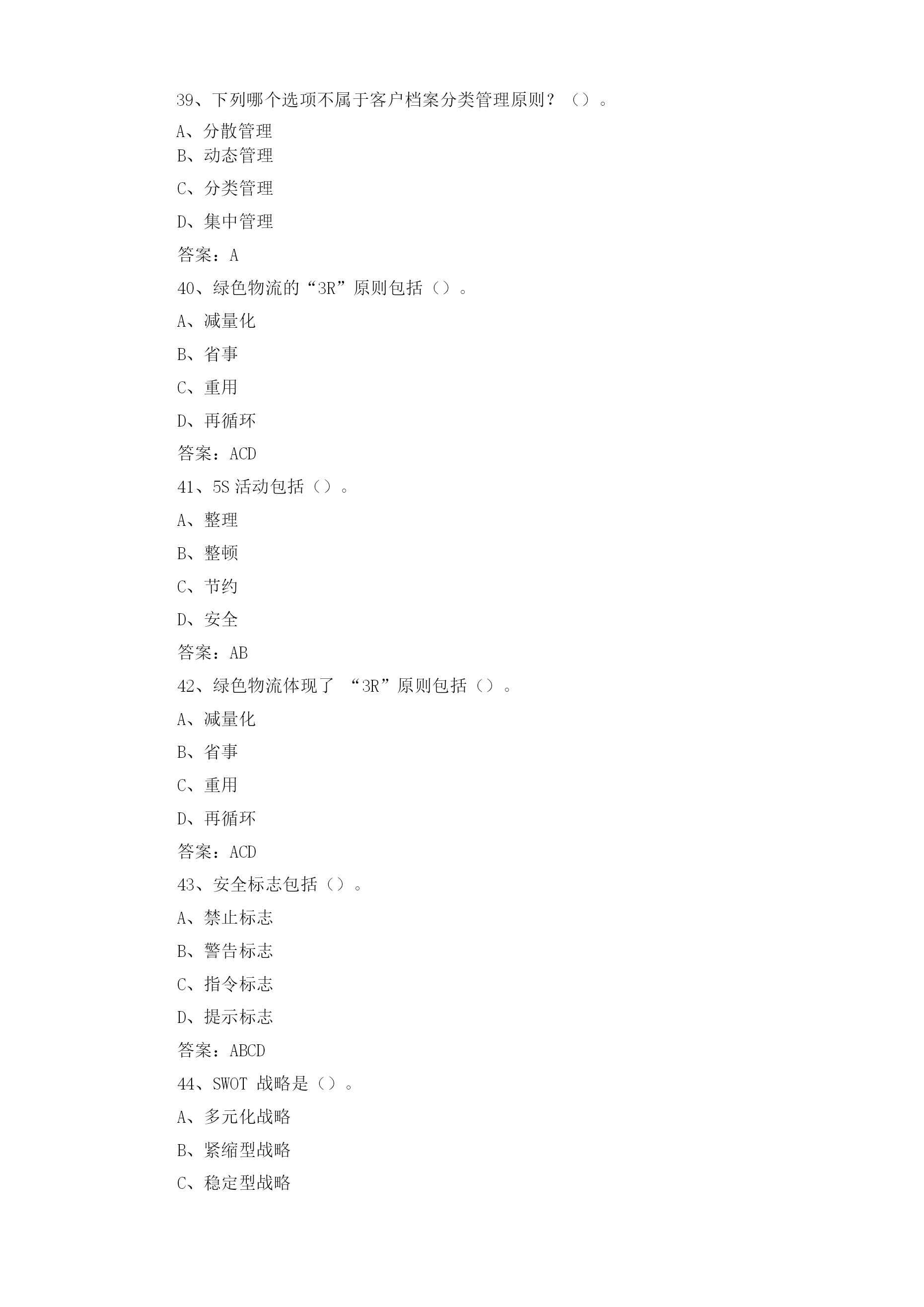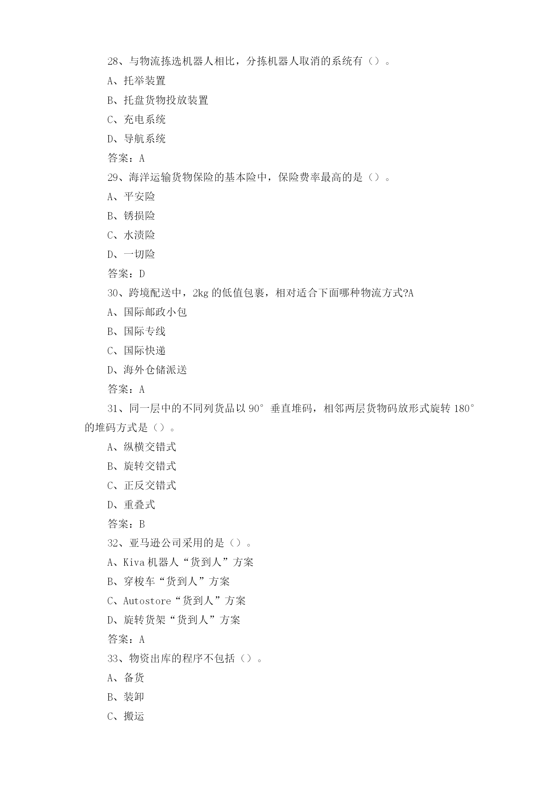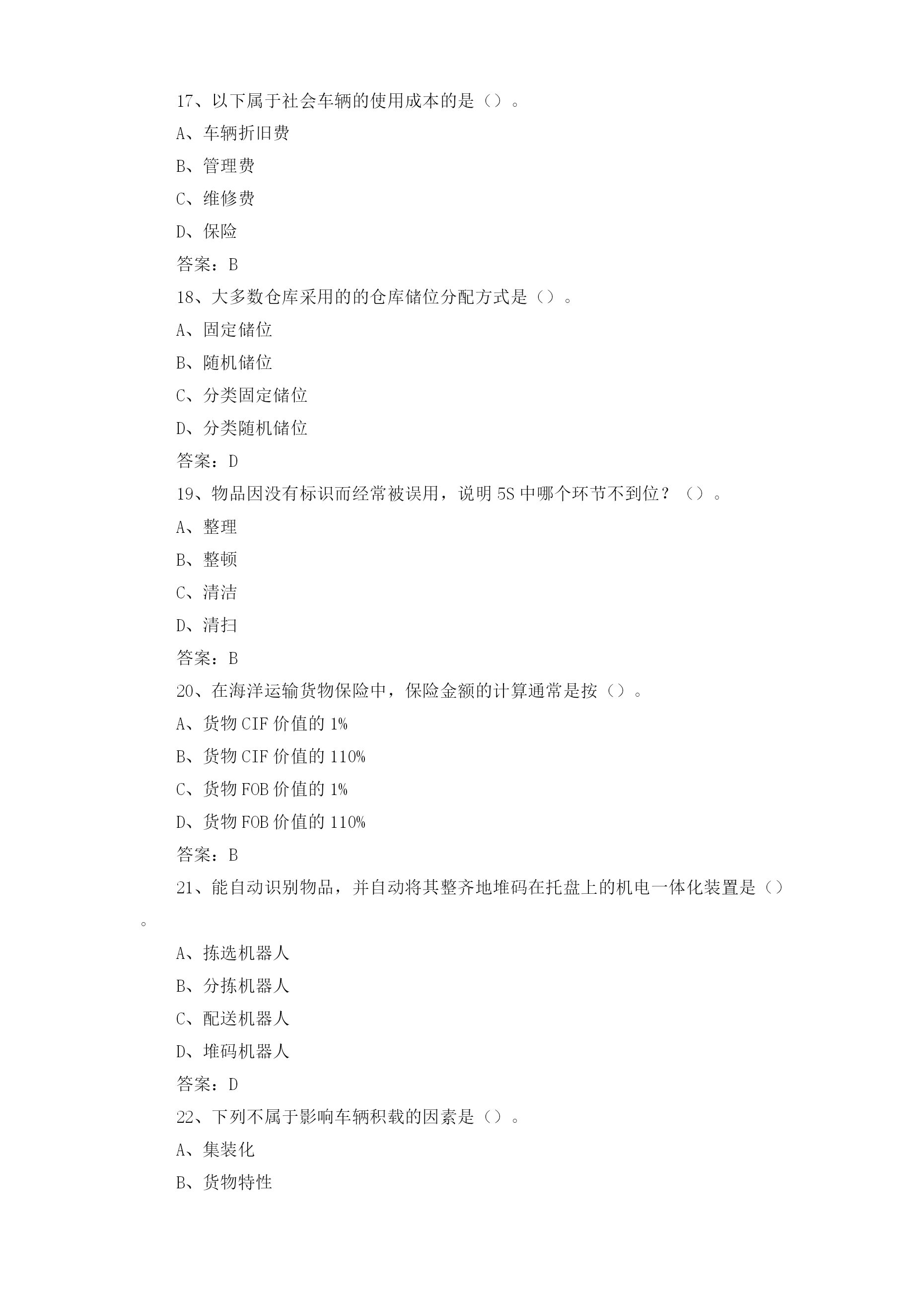 1+X物流管理考试题含答案1、企业产成品在出售过程中所发生的物流活动是()。A、供应物流B、生产物流C、销售物流D、回收物流答案:C2、装卸搬运车辆中应用最广泛的设备是()。A、手动搬运车B、输送机C、堆垛起重机D、叉车答案:D3、根据国家标准GB2894-28《安全标志及其使用导则》,安全色标中表示警告和注意的颜色是()。A、红色B、绿色C、黄色D、蓝色答案:C4、航空运输计费重量确定时,重货的计费重量依据是()。A、实际净重B、实际体积C、实际毛重D、标准数值答案:D5、智慧物流创新模式中,基于互联网平台的开放式配送模式为()。A、云物流B、云仓资源共享C、物流众包D、互联网+物流答案:C6、使用95306网站进行铁路运输货物追踪服务,查询需填写的信息是()。A、车号和运单号B、运输合同编号C、出发地点和时间D、货物品名答案:A7、招标单位为了达到招标目的,对外公布的有明确招标内容和具体要求的说明性文书是()。A、招标书B、投标书C、投标函D、询价函答案:A8、适用于扑救石油及石油制品、可燃气体、易燃液体、电器设备等初起火灾的灭火器是()。A、化学泡沫灭火器B、二氧化碳灭火器C、干粉灭火器D、1211灭火器答案:C9、因为质量问题,产品被厂家召回,因此产生的物流活动属于()。A、供应物流B、生产物流C、销售物流D、回收物流答案:D10、下列选项不属于客户档案分类管理原则的是()。A、分散管理B、动态管理C、分类管理D、集中管理答案:A11、装车配载时,应遵循的基本前提是()。A、重不压轻B、小不压大C、分布均匀D、后送先装答案:D12、在公路货物运输作业中,“填写托运单”应该在哪项作业中完成?()。A、受理托运作业B、过磅量方作业C、开票收费作业D、验收入库作业答案:A13、长途运输需要饲养的动物时,应由哪方派人押运,负责途中货物照料?()。A、物流企业B、收货方C、承运人D、托运方答案:D14、下列企业类型中,能够承担有限责任的企业类型是()。A、独资企业B、合伙企业C、公司D、事务所答案:C15、“严守标准、团队精神”体现的是5S现场管理法中的()。A、整理B、整顿C、清扫D、素养答案:D16、根据国家标准GB2894-28《安全标志及其使用导则》,安全色标中提示安全状态和通行的颜色是()。入、红色8、绿色"黄色。、蓝色答案:B17、以下属于社会车辆的使用成本的是()。A、车辆折旧费B、管理费C、维修费D、保险答案:B18、大多数仓库采用的的仓库储位分配方式是()。A、固定储位B、随机储位C、分类固定储位D、分类随机储位答案:D19、物品因没有标识而经常被误用,说明5S中哪个环节不到位?()。A、整理B、整顿C、清洁D、清扫答案:B20、在海洋运输货物保险中,保险金额的计算通常是按()。A、货物CIF价值的1%B、货物CIF价值的110%C、货物FOB价值的1%D、货物FOB价值的110%答案:B21、能自动识别物品,并自动将其整齐地堆码在托盘上的机电一体化装置是()。A、拣选机器人B、分拣机器人C、配送机器人D、堆码机器人答案:D22、下列不属于影响车辆积载的因素是()。A、集装化B、货物特性C、货物包装情况D、装载技术原因答案:A23、物流的功能要素不包括()。A、运输B、包装C、装卸D、送达答案:D24、客户有铁路运输需求提报或查询货物运输信息需要时,可拨打电话()。TOC\o"1-5"\h\zA、12305B、12333C、95306D、95333答案:C25、下列承担有限责任的企业类型是()。A、独资企业B、合伙企业C、公司D、事务所答案:C26、从接收客户订单开始到将货品送到客户手中所发生的所有物流活动称为()。A、客户服务B、物流服务C、物流管理D、订单管理答案:B27、采用班轮运输小汽车时,运价计算应按照()。A、货物件数计收B、货物毛重计收C、货物价格计收D、货物体积计收答案:A28、与物流拣选机器人相比,分拣机器人取消的系统有()。A、托举装置B、托盘货物投放装置C、充电系统D、导航系统答案:A29、海洋运输货物保险的基本险中,保险费率最高的是()。A、平安险B、锈损险C、水渍险D、一切险答案:D30、跨境配送中,2kg的低值包裹,相对适合下面哪种物流方式?AA、国际邮政小包B、国际专线C、国际快递D、海外仓储派送答案:A31、同一层中