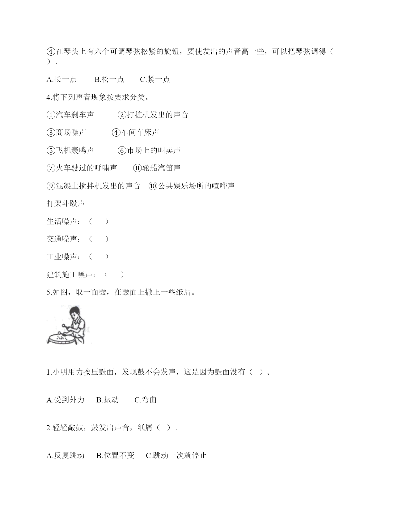 小学科学《声音》练习题一.选择题(共10题,共20分)1.假如两个人在月球上,必须要()才能顺利聊天。A.大声说话B.使用无线电C.小声说话2.下列保护我们听力的方法中错误的是()。A.远离噪声B.控制物体发声C.耳机音量开到最大3.用刚击打过的音叉轻触水面,水面会产生波纹,这是因为()。A.音叉放入水中,自然会产生波纹B.音叉的振动导致水面产生波纹C.击打音叉的同时碰到了水面4.鼓膜受外耳道传递的声波而产生()。A.声音B.振动C.音质5.黄莺的叫声婉转动听,它的叫声是用()发出的。A.声带B.翅膀C.唇舌D.鸣管6.下列物体中,声音在()中传播的速度最快。A.钢铁B.水C.空气7.歌手唱到高音时,声带振动的速度()。A.慢B.快C.不快也不慢8.人的耳郭有()的作用。A.收集声音B.产生振动C.传播声音9.在探索尺子音高变化的实验中,把钢尺伸出桌面不同的长度,用相同的力拨动时可以听到不同音高的声音。通过观察发现,下列因素会影响尺子音高变化的是()。A.振动幅度B.振动快慢C.两者都不是10.如图所示,外界声音传到大脑的路径正确的是()。A.外耳道—听小骨—耳蜗—鼓膜—大脑—听觉神经B.外耳道—鼓膜—听小骨—耳蜗—听觉神经—大脑C.外耳道—耳蜗—听小骨—鼓膜—大脑—听觉神经D.外耳道—鼓膜—耳蜗—听小骨—听觉神经—大脑二.填空题(共10题,共38分)1.敲击音叉,然后轻轻按住,感觉音叉在()。2.各种物体只要(),就会发出声音,我想让声音停止必须设法让物体()。3.声音的高低可以用()来描述,物体振动的越快,发生的声音就越();物体振动的越慢,发出的声音就越()。4.在月球上,由于没有空气,两个人即使相隔不远,也不能互相通话,必须要使用()。5.声音的()可以用()描述。6.()的弦,()的弦,振动频率(),音高()。7.同一把小提琴上粗细不同的两根琴弦,()的琴弦发出的声音高,()的琴弦发出的声音低。8.玻璃罩中的空气被抽掉了,形成()后,我们就只能看见闹钟的铃在动,却听不到它的声音。9.尺子振动的()受尺子伸出桌面的那部分长度的影响。10.耳由外耳、()、()三部分组成。三.判断题(共10题,共20分)1.轻轻击打小音叉发出的声音比重重击打小音叉发出的声音强。()2.有些物体发声时,我们看不到它在振动,这说明有些物体可以不振动发出声音。()3.空气、液体能传播声音,而固体不能。()4.用击打过的音叉轻轻触及水面,水面会产生水花。()5.让正在振动发声的物体停止振动,声音马上就停止了。()6.做“土电话”实验时,线不拉直,也能听到对方的声音。()7.成年男性的声带比成年女性的声带短,所以成年男性的声音通常比成年女性低。()8.耳廓有收集声音并把声音导入外耳道的作用。()9.耳廓可以放大声音。()10.用不同的力量敲击鼓面,鼓发出声音的强弱都一样。()四.连线题(共1题,共6分)1.请将耳朵的结构与功能用线连起来外耳道将声波转化为振动鼓膜传递振动到内耳听小骨传递声波到中耳耳蜗将听觉信号传递到大脑听觉神经将振动转化为听觉信号耳郭能帮助我们收集声音五.填表题(共2题,共18分)1.猜想:声音强弱与物体振动幅度有关,振幅越大,声音越();物体振幅越小,声音越()。实验器材:钢尺,桌子改变的条件:()不改变的条件:()填写表格。实验结论是什么?2.想一想,坐在教室里你能听到哪些声音?六.简答题(共5题,共25分)1.同根弦发出的声音高低变化的规律是什么?2.自制小乐器分为几个步骤?依次是什么?3.在相同力量下,能影响弦发出高低不同声音的因素有哪些?4.编钟上悬挂的是铜器。用木槌击打铜器。请你判断铜器发出的声音有什么不同?5.为什么说“一个巴掌拍不响”?七.材料题(共3题,共21分)1.写出下图各部分的名称。2.在下图中选出制作土电话的材料。(在选中的材料序号上画“√”)思考:在玩土电话游戏时,对方讲话的声音是通过什么物体传到听话人的耳朵里的?用什么方法能够使土电话中的声音更大一些?3.唐朝著名诗人白居易在《琵琶行》中有“大弦嘈嘈如急雨,小弦切切如私语”的诗句。意思是粗弦嘈嘈,好像是疾风骤雨,细弦切切,好像是儿女私语。根据所学的知识,说一说弦的粗细对音高有什么影响?还有哪些因素能影响音高?八.综合题(共5题,共50分)1.鼓面上面放上一些豆子,敲打鼓面时鼓面发出声音的同时可以看到豆子在跳动,1.这个现象说明,发声物体在()。2.轻轻敲打鼓面,豆子跳动的幅度小、说明此时鼓面振动的幅度(),发出的声音()。用力敲打鼓面,豆子跳动的幅度大,说明此时鼓面振动的