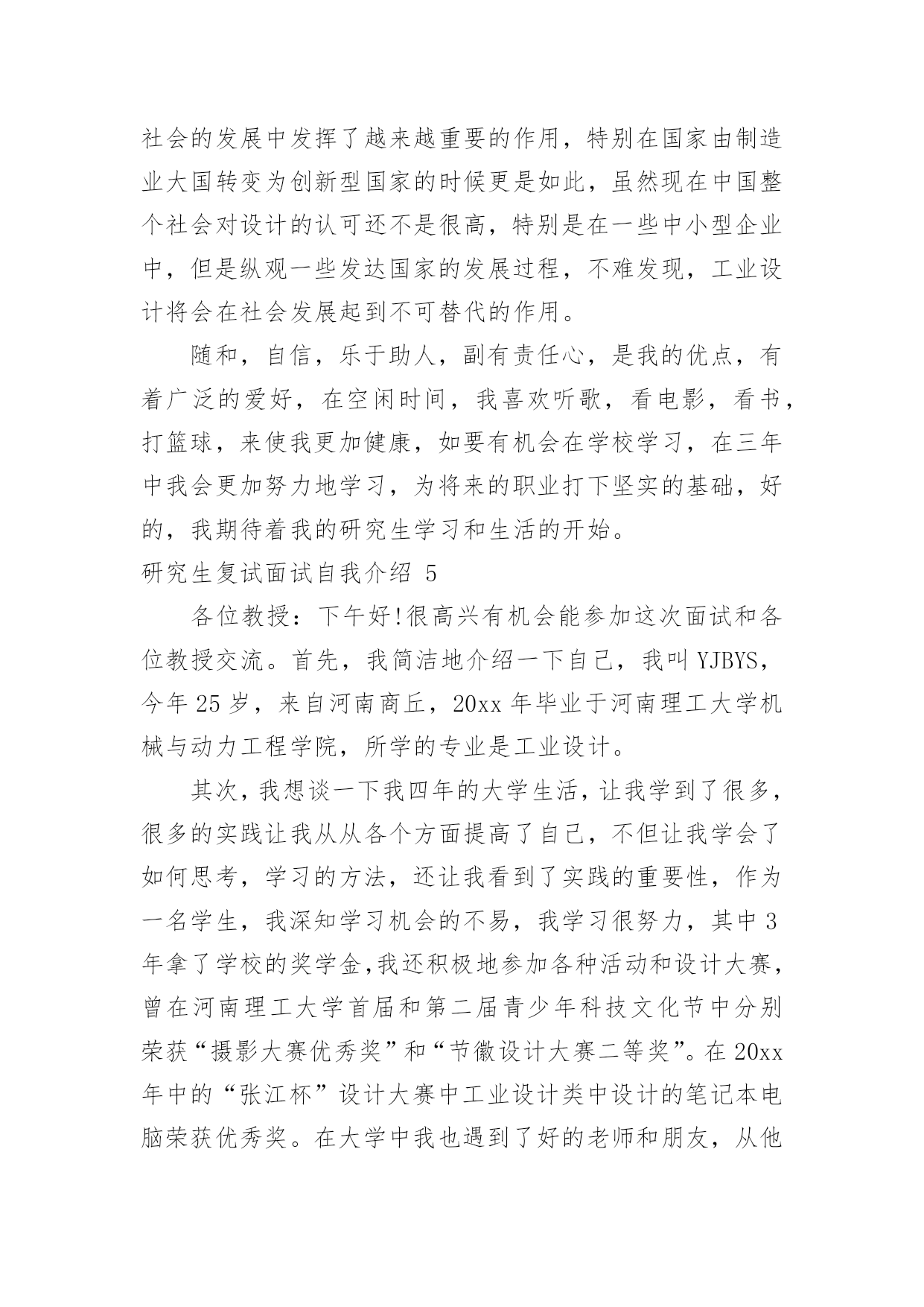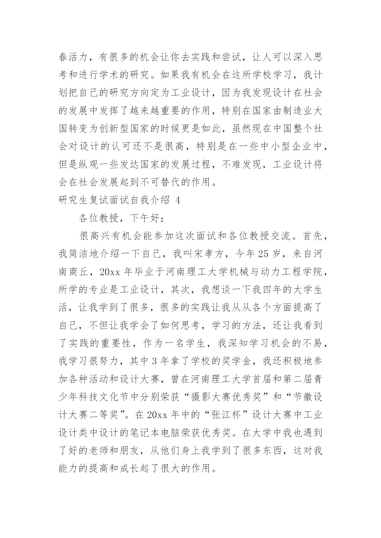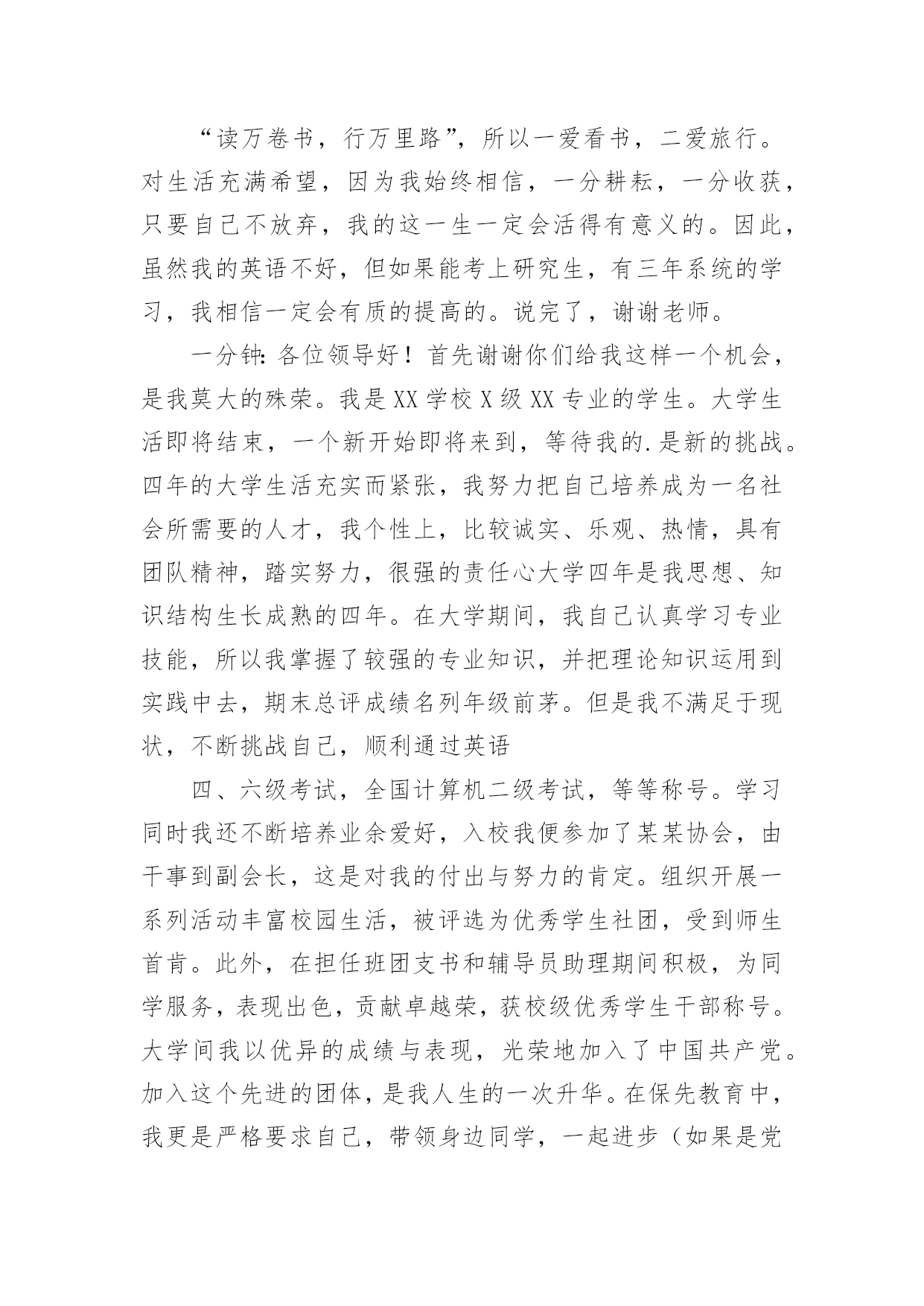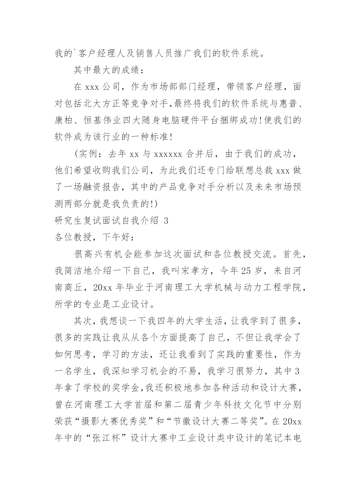 研究生复试面试自我介绍研究生复试面试自我介绍当碰到不熟悉的人时,通常需要用到自我介绍,通过自我介绍可以得到他人的认可。但是自我介绍有什么要求呢?下面是小编帮大家整理的研究生复试面试自我介绍,欢迎阅读与收藏。研究生复试面试自我介绍1老师下午好,能来华南师范大学参加复试我感到非常荣幸首先让我介绍一下自己,我叫XX,今年25岁,来自重庆市——一座充满活力的西部重镇,我是西南政法大学自学考试法学本科毕业,之所以跨专业报考历史学研究生,主要是因为学习历史学是我中学时期的一个梦想,那是一种最纯粹的喜爱,但由于高考的遗憾未能如愿,前不久看了《老男孩》后,有一句话让我印象深刻:梦想这东西和经典一样,永远不会因为时间而褪色,反而更显珍贵。是啊,梦想就是如此的不可思议,于是我准备了两年的时间来报考历史学研究生,于是我现在坐在了老师的面前,只为了一个梦想,一个机会。我是个从小富有想像力的人,对什么都很好奇,求知欲较强,尤其喜欢历史、文学、人文地理等学科,而且深深迷恋古人所说的“读万卷书,行万里路”,所以一爱看书,二爱旅行。对生活充满希望,因为我始终相信,一分耕耘,一分收获,只要自己不放弃,我的这一生一定会活得有意义的。因此,虽然我的英语不好,但如果能考上研究生,有三年系统的学习,我相信一定会有质的提高的。说完了,谢谢老师。一分钟:各位领导好!首先谢谢你们给我这样一个机会,是我莫大的殊荣。我是XX学校X级XX专业的学生。大学生活即将结束,一个新开始即将来到,等待我的.是新的挑战。四年的大学生活充实而紧张,我努力把自己培养成为一名社会所需要的人才,我个性上,比较诚实、乐观、热情,具有团队精神,踏实努力,很强的责任心大学四年是我思想、知识结构生长成熟的四年。在大学期间,我自己认真学习专业技能,所以我掌握了较强的专业知识,并把理论知识运用到实践中去,期末总评成绩名列年级前茅。但是我不满足于现状,不断挑战自己,顺利通过英语四、六级考试,全国计算机二级考试,等等称号。学习同时我还不断培养业余爱好,入校我便参加了某某协会,由干事到副会长,这是对我的付出与努力的肯定。组织开展一系列活动丰富校园生活,被评选为优秀学生社团,受到师生首肯。此外,在担任班团支书和辅导员助理期间积极,为同学服务,表现出色,贡献卓越荣,获校级优秀学生干部称号。大学间我以优异的成绩与表现,光荣地加入了中国共产党。加入这个先进的团体,是我人生的一次升华。在保先教育中,我更是严格要求自己,带领身边同学,一起进步(如果是党员的加入)。社会实践方面:在XXXX年暑假,我在XXXX实习,通过做XXX的工作使我更加深刻认识到,一定要投入到社会这所大学校自己才会真正地长大:存在一颗好学的心才会不断的完善自我;用感恩的心来面对周围的世界,生活才会美好!回顾过去,自己仍然有不少缺点,如创新能力还不够强,有时候不懂得坚持,但我会尽可能地在以后的学习和生活中着重提高这些方面的能力,争取做到各方面都具有新素质的人才。谢谢大概就是这些东西。但是一定根据自己的情况,自己的优点,有所侧重,时间根据情况而定一分钟的就删去某些部分,重点突出自己的特长。提前做好准备,注重着装,调整好自己的心态,一定要有自信,祝你成功。研究生复试面试自我介绍2各位老师好,我叫xxx,1998年毕业于哈尔滨工业大学,同年分配到北京工作,现在就职一家外企xxx公司市场部部门经理。下面我想从两个方面介绍一下我自己。工作业绩:1:xxx年7月分配到北京*****公司重点实验室;xxx年4月作为首席代表组建并运作上海办事处,一年就为公司实现了***万销售业绩。2:xxx年5月加入******公司,在市场部任商务经理,带领sales人员,推动中小企业的网站建设。3:xxxx年元月份,加盟美资企业亿书堂科技发展有限公司,任职市场部部门经理,主要负责培养销售团队,带领我的`客户经理人及销售人员推广我们的软件系统。其中最大的成绩:在xxx公司,作为市场部部门经理,带领客户经理,面对包括北大方正等竞争对手,最终将我们的软件系统与惠普、康柏、恒基伟业四大随身电脑硬件平台捆绑成功!使我们的软件成为该行业的一种标准!(实例:去年xx与xxxxxx合并后,由于我们的成功,他们希望收购我们公司,为此我们还专门给联想总裁xxx做了一场融资报告,其中的产品竞争对手分析以及未来市场预测两部分就是我负责的!)研究生复试面试自我介绍3各位教授,下午好:很高兴有机会能参加这次面试和各位教授交流。首先,我简洁地介绍一下自己,我叫宋孝方,今年25岁,来自河南商丘,20xx年毕业于河南理工大学机械与动力工程学院,所学的专业是工业设计。其次,我想谈一下我四年的大学生活,让我学到了很多,很多的实践让我从从各个方面提高了自己,不但让我学会了如何思考,学习的方法,还让我看到了实践的重要性,作为一名