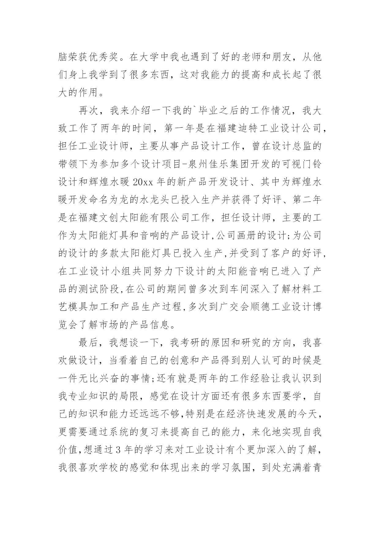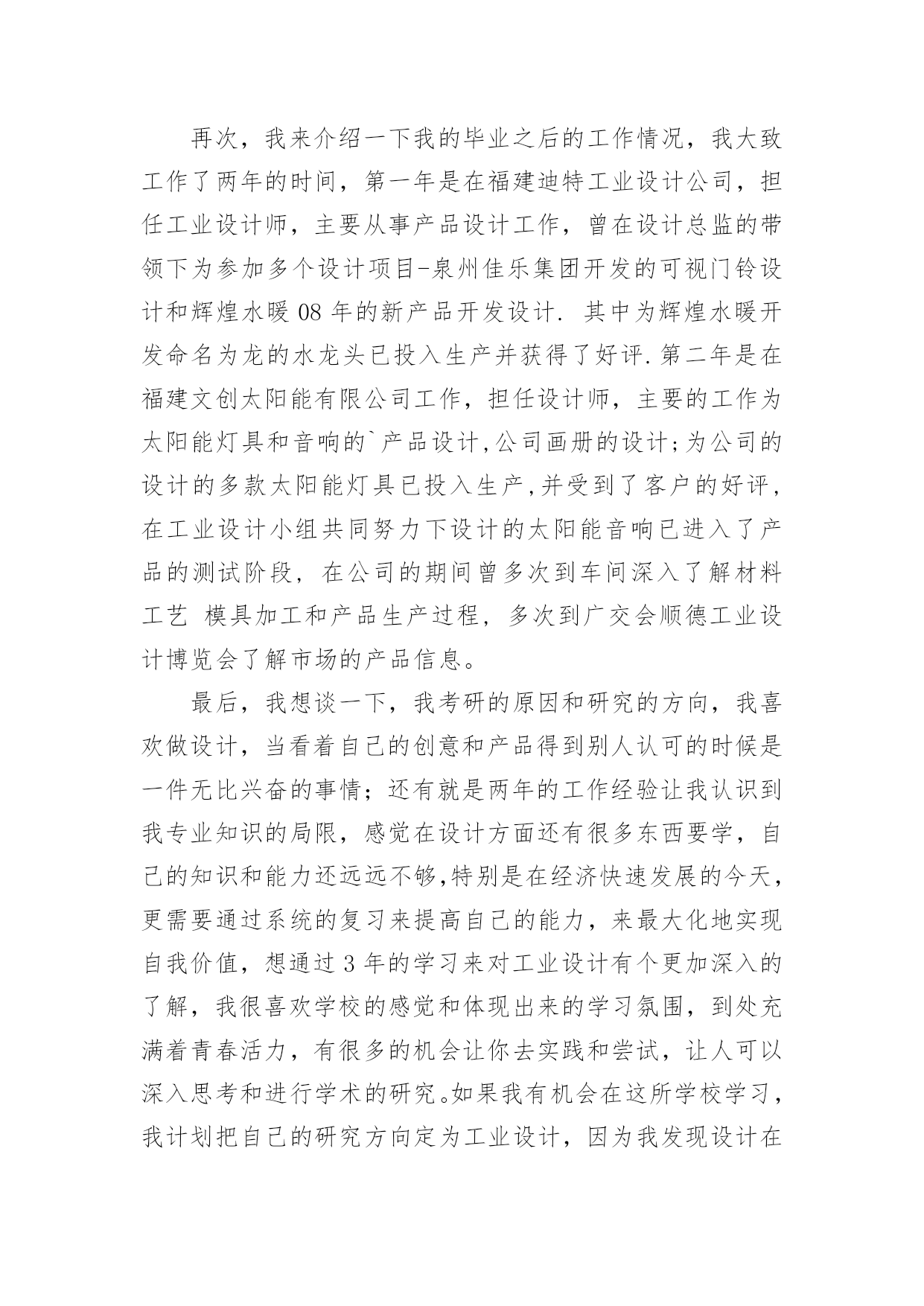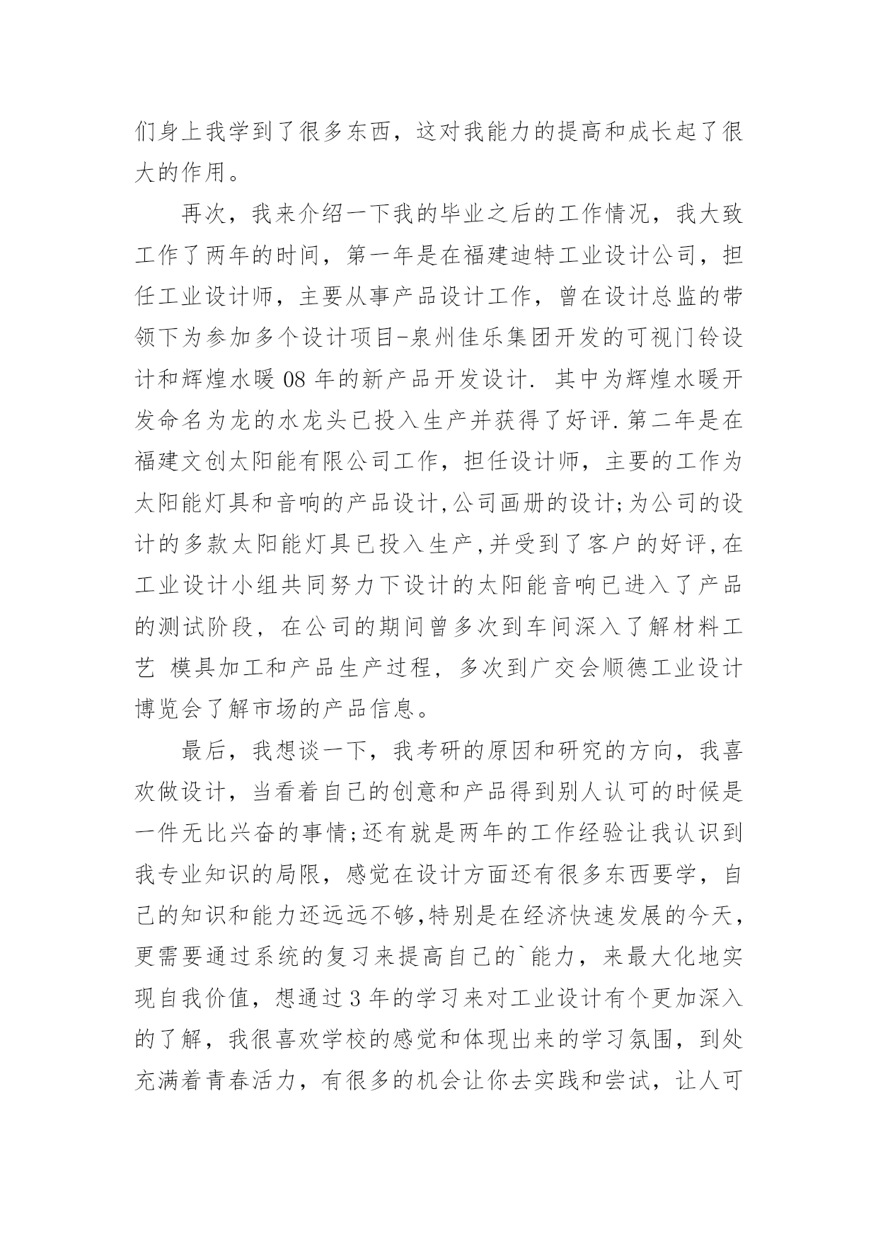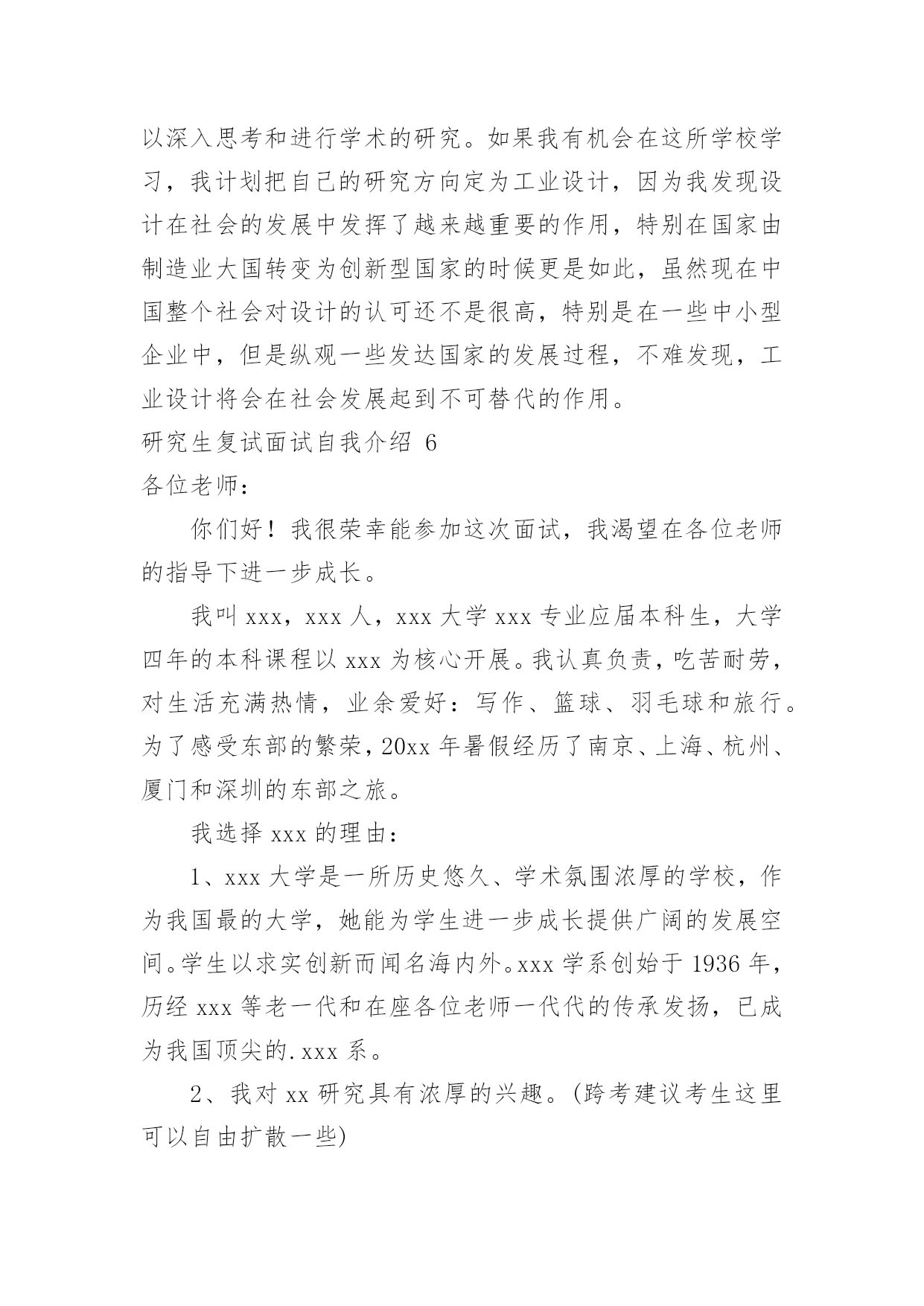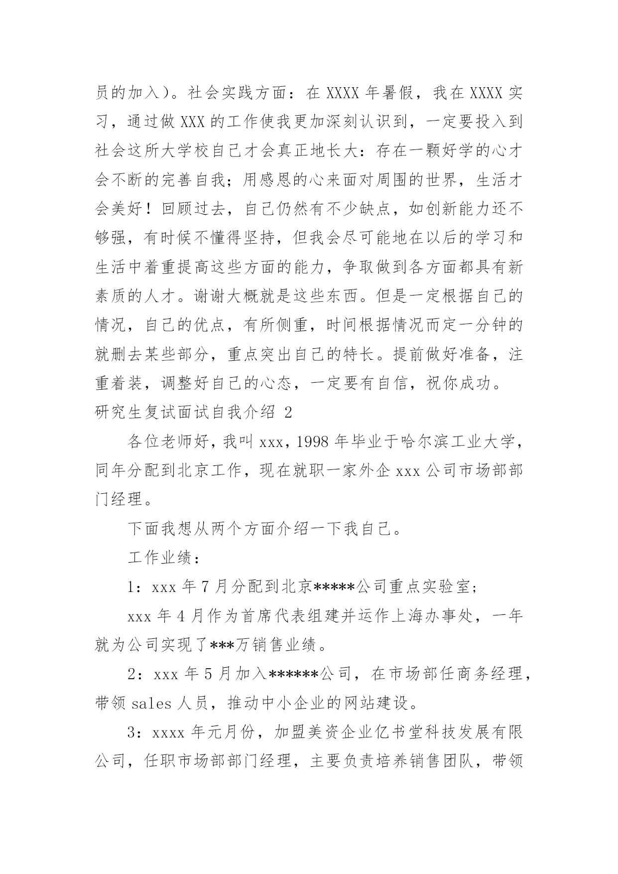 研究生复试面试自我介绍研究生复试面试自我介绍当碰到不熟悉的人时,通常需要用到自我介绍,通过自我介绍可以得到他人的认可。但是自我介绍有什么要求呢?下面是小编帮大家整理的研究生复试面试自我介绍,欢迎阅读与收藏。研究生复试面试自我介绍1老师下午好,能来华南师范大学参加复试我感到非常荣幸首先让我介绍一下自己,我叫XX,今年25岁,来自重庆市——一座充满活力的西部重镇,我是西南政法大学自学考试法学本科毕业,之所以跨专业报考历史学研究生,主要是因为学习历史学是我中学时期的一个梦想,那是一种最纯粹的喜爱,但由于高考的遗憾未能如愿,前不久看了《老男孩》后,有一句话让我印象深刻:梦想这东西和经典一样,永远不会因为时间而褪色,反而更显珍贵。是啊,梦想就是如此的不可思议,于是我准备了两年的时间来报考历史学研究生,于是我现在坐在了老师的面前,只为了一个梦想,一个机会。我是个从小富有想像力的人,对什么都很好奇,求知欲较强,尤其喜欢历史、文学、人文地理等学科,而且深深迷恋古人所说的“读万卷书,行万里路”,所以一爱看书,二爱旅行。对生活充满希望,因为我始终相信,一分耕耘,一分收获,只要自己不放弃,我的这一生一定会活得有意义的。因此,虽然我的英语不好,但如果能考上研究生,有三年系统的学习,我相信一定会有质的提高的。说完了,谢谢老师。一分钟:各位领导好!首先谢谢你们给我这样一个机会,是我莫大的殊荣。我是XX学校X级XX专业的学生。大学生活即将结束,一个新开始即将来到,等待我的.是新的挑战。四年的大学生活充实而紧张,我努力把自己培养成为一名社会所需要的人才,我个性上,比较诚实、乐观、热情,具有团队精神,踏实努力,很强的责任心大学四年是我思想、知识结构生长成熟的四年。在大学期间,我自己认真学习专业技能,所以我掌握了较强的专业知识,并把理论知识运用到实践中去,期末总评成绩名列年级前茅。但是我不满足于现状,不断挑战自己,顺利通过英语四、六级考试,全国计算机二级考试,等等称号。学习同时我还不断培养业余爱好,入校我便参加了某某协会,由干事到副会长,这是对我的付出与努力的肯定。组织开展一系列活动丰富校园生活,被评选为优秀学生社团,受到师生首肯。此外,在担任班团支书和辅导员助理期间积极,为同学服务,表现出色,贡献卓越荣,获校级优秀学生干部称号。大学间我以优异的成绩与表现,光荣地加入了中国共产党。加入这个先进的团体,是我人生的一次升华。在保先教育中,我更是严格要求自己,带领身边同学,一起进步(如果是党员的加入)。社会实践方面:在XXXX年暑假,我在XXXX实习,通过做XXX的工作使我更加深刻认识到,一定要投入到社会这所大学校自己才会真正地长大:存在一颗好学的心才会不断的完善自我;用感恩的心来面对周围的世界,生活才会美好!回顾过去,自己仍然有不少缺点,如创新能力还不够强,有时候不懂得坚持,但我会尽可能地在以后的学习和生活中着重提高这些方面的能力,争取做到各方面都具有新素质的人才。谢谢大概就是这些东西。但是一定根据自己的情况,自己的优点,有所侧重,时间根据情况而定一分钟的就删去某些部分,重点突出自己的特长。提前做好准备,注重着装,调整好自己的心态,一定要有自信,祝你成功。研究生复试面试自我介绍2各位老师好,我叫xxx,1998年毕业于哈尔滨工业大学,同年分配到北京工作,现在就职一家外企xxx公司市场部部门经理。下面我想从两个方面介绍一下我自己。工作业绩:1:xxx年7月分配到北京*****公司重点实验室;xxx年4月作为首席代表组建并运作上海办事处,一年就为公司实现了***万销售业绩。2:xxx年5月加入******公司,在市场部任商务经理,带领sales人员,推动中小企业的网站建设。3:xxxx年元月份,加盟美资企业亿书堂科技发展有限公司,任职市场部部门经理,主要负责培养销售团队,带领我的`客户经理人及销售人员推广我们的软件系统。其中最大的成绩:在xxx公司,作为市场部部门经理,带领客户经理,面对包括北大方正等竞争对手,最终将我们的软件系统与惠普、康柏、恒基伟业四大随身电脑硬件平台捆绑成功!使我们的软件成为该行业的一种标准!(实例:去年xx与xxxxxx合并后,由于我们的成功,他们希望收购我们公司,为此我们还专门给联想总裁xxx做了一场融资报告,其中的产品竞争对手分析以及未来市场预测两部分就是我负责的!)研究生复试面试自我介绍3各位教授,下午好:很高兴有机会能参加这次面试和各位教授交流。首先,我简洁地介绍一下自己,我叫宋孝方,今年25岁,来自河南商丘,20xx年毕业于河南理工大学机械与动力工程学院,所学的专业是工业设计。其次,我想谈一下我四年的大学生活,让我学到了很多,很多的实践让我从从各个方面提高了自己,不但让我学会了如何思考,学习的方法,还让我看到了实践的重要性,作为一名