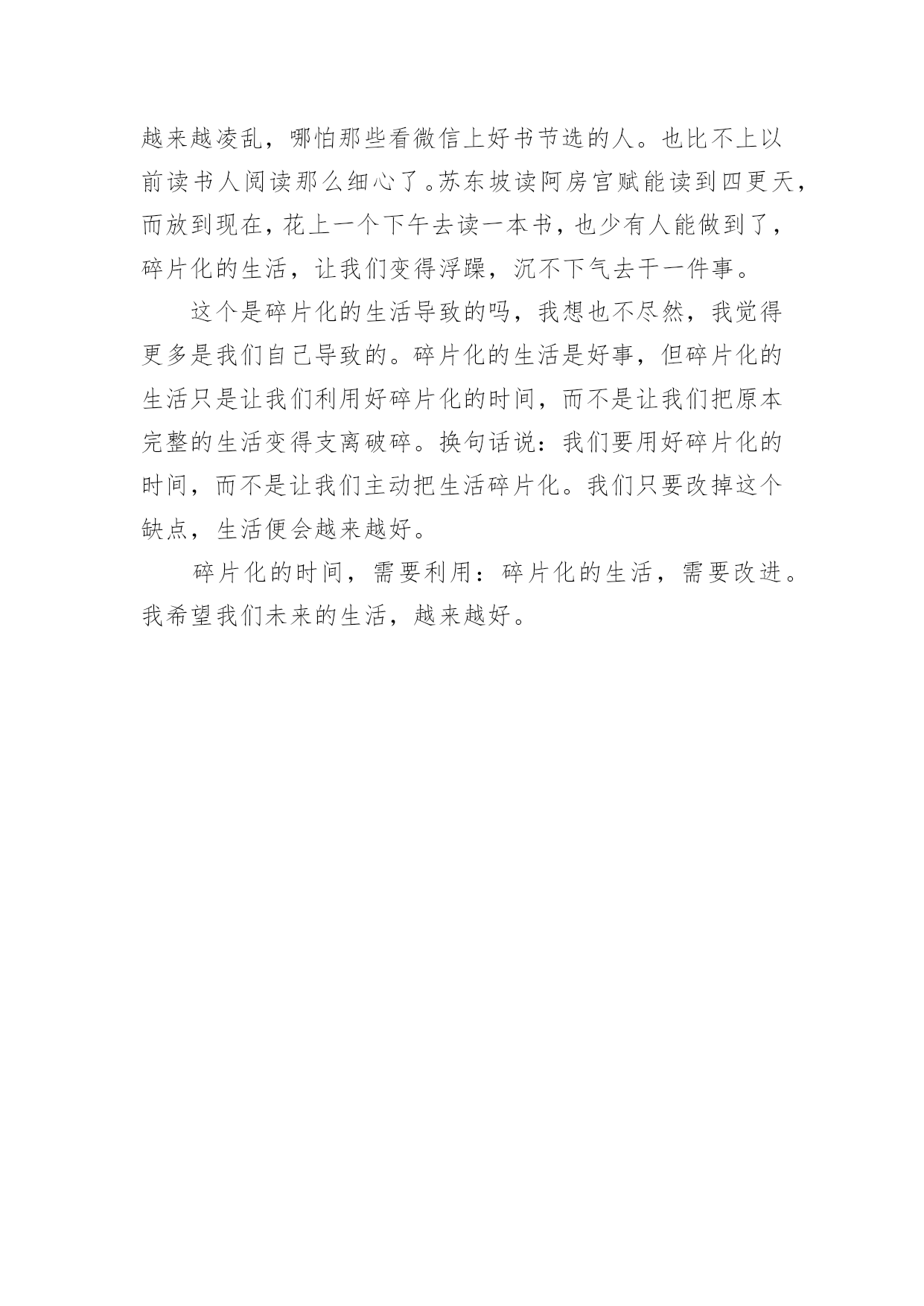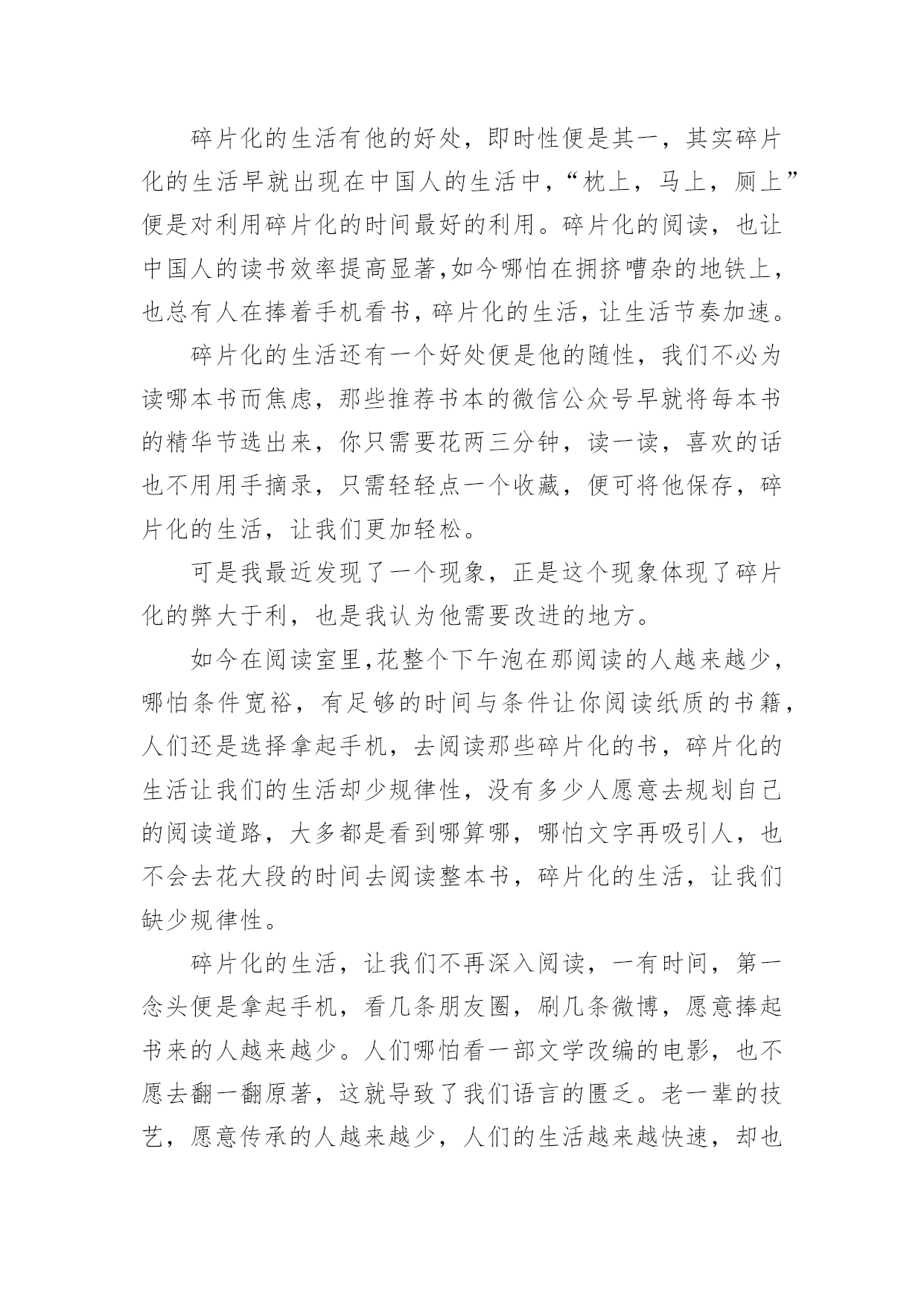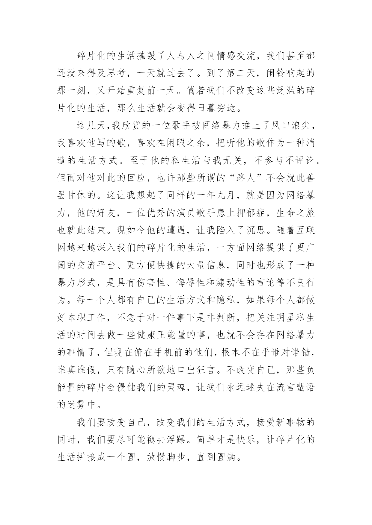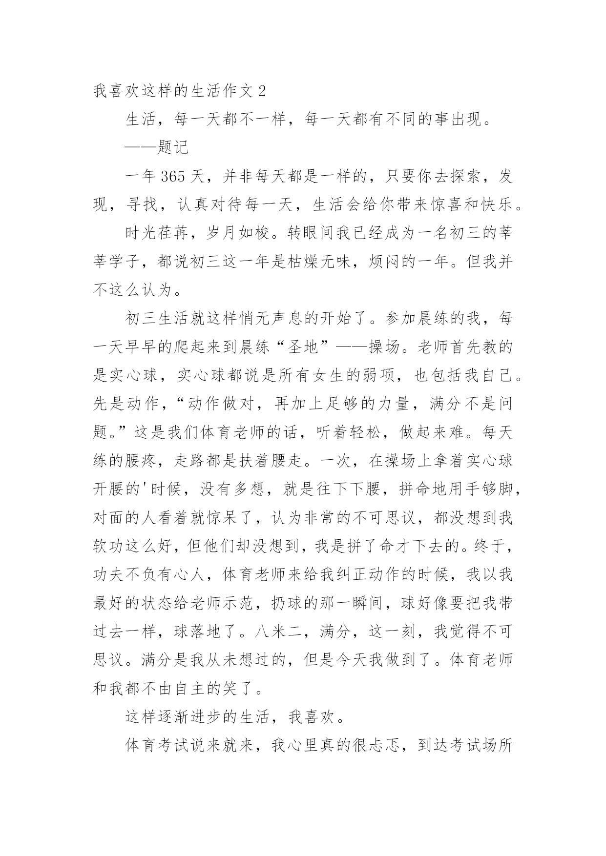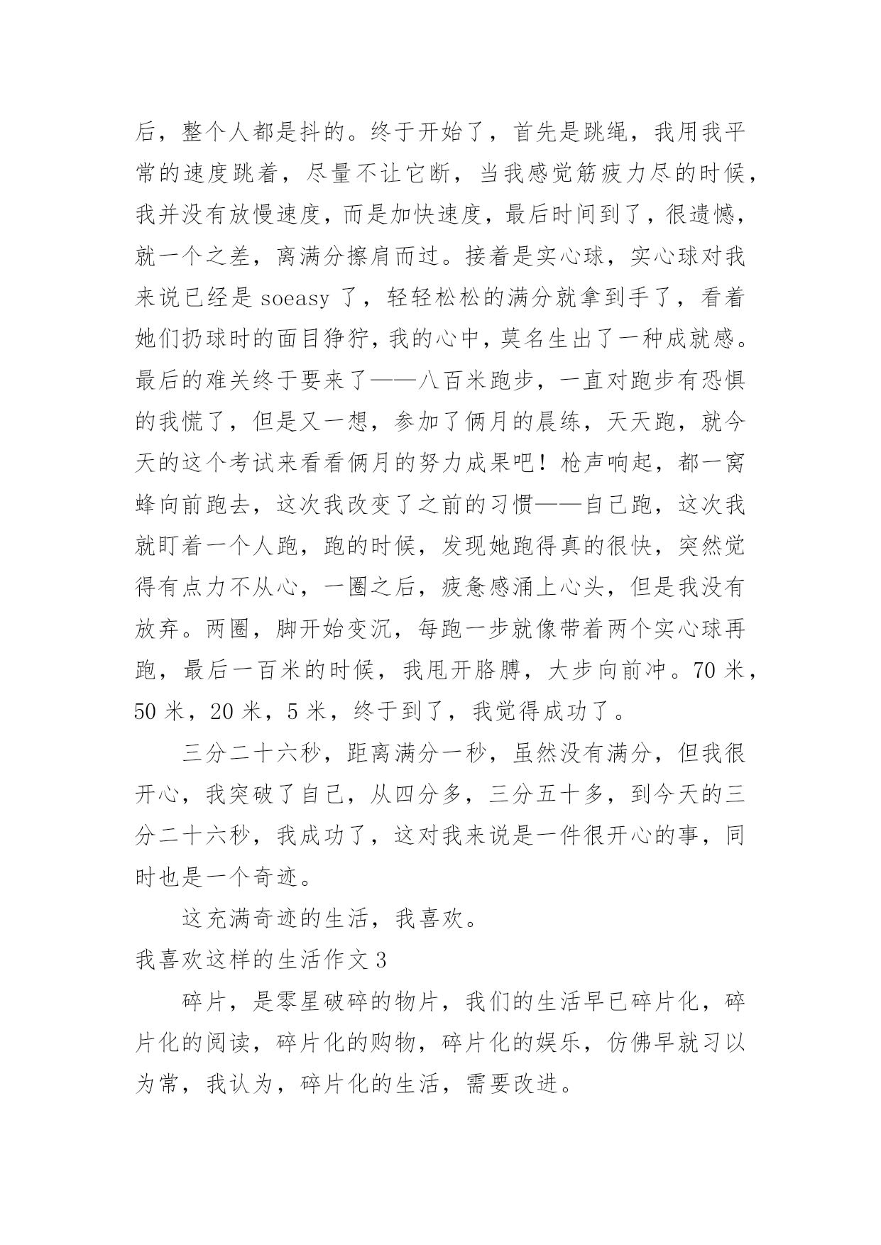 我喜欢这样的生活作文我喜欢这样的生活作文在日常的学习、工作、生活中,大家都跟作文打过交道吧,作文一定要做到主题集中,围绕同一主题作深入阐述,切忌东拉西扯,主题涣散甚至无主题。写起作文来就毫无头绪?以下是小编为大家收集的我喜欢这样的生活作文,欢迎大家借鉴与参考,希望对大家有所帮助。我喜欢这样的生活作文1随着移动互联网的不断发展进步,我们的生活有了本质的改变,却被碎片化了。微信、打车软件、网上购物、电子书籍等各种新技术,甚至动动手指就能支付各项消费,给我们的生活带来很大的改变,同时在无形中也碎片化了我们的生活。为何我们的生活会碎片化呢?我们的生活需要简化、迅速,节省更多时间去做其他的事情,把原本一天只能做一两件事情变成可以完成四五件或者更多,效率是提高了,但总觉得少了些什么,少了些与人交流的时刻,少了些用心思考的时间。时代在进步,科技在发展,更新的是生活,消磨的却是我们的灵魂。慢慢地,在碎片化的信息时代里,电子邮件取代了传统的用纸笔书信;电子书籍取代了纸质书籍;各种社交软件取代了面对面交流,而这些被取代了的传统是多么的弥足珍贵啊!碎片化的生活摧毁了人与人之间情感交流,我们甚至都还没来得及思考,一天就过去了。到了第二天,闹铃响起的那一刻,又开始重复前一天。倘若我们不改变这些泛滥的碎片化的生活,那么生活就会变得日暮穷途。这几天,我欣赏的一位歌手被网络暴力推上了风口浪尖,我喜欢他写的歌,喜欢在闲暇之余,把听他的歌作为一种消遣的生活方式。至于他的私生活与我无关,不参与不评论。但面对他对此的回应,也许那些所谓的“路人”不会就此善罢甘休的。这让我想起了同样的一年九月,就是因为网络暴力,他的好友,一位优秀的演员歌手患上抑郁症,生命之旅也就此结束。现如今他的遭遇,让我陷入了沉思。随着互联网越来越深入我们的碎片化的生活,一方面网络提供了更广阔的交流平台、更方便快捷的大量信息,同时也形成了一种暴力形式,是具有伤害性、侮辱性和煽动性的言论等不良行为。每一个人都有自己的生活方式和隐私,如果每个人都做好本职工作,不急于对一件事下是非判断,把关注明星私生活的时间去做一些健康正能量的事,也就不会存在网络暴力的事情了,但现在俯在手机前的他们,根本不在乎谁对谁错,谁真谁假,只有随心所欲地口出狂言。不改变自己,那些负能量的碎片会侵蚀我们的灵魂,让我们永远迷失在流言蜚语的迷雾中。我们要改变自己,改变我们的生活方式,接受新事物的同时,我们要尽可能褪去浮躁。简单才是快乐,让碎片化的生活拼接成一个圆,放慢脚步,直到圆满。我喜欢这样的生活作文2生活,每一天都不一样,每一天都有不同的事出现。——题记一年365天,并非每天都是一样的,只要你去探索,发现,寻找,认真对待每一天,生活会给你带来惊喜和快乐。时光荏苒,岁月如梭。转眼间我已经成为一名初三的莘莘学子,都说初三这一年是枯燥无味,烦闷的一年。但我并不这么认为。初三生活就这样悄无声息的开始了。参加晨练的我,每一天早早的爬起来到晨练“圣地”——操场。老师首先教的是实心球,实心球都说是所有女生的弱项,也包括我自己。先是动作,“动作做对,再加上足够的力量,满分不是问题。”这是我们体育老师的话,听着轻松,做起来难。每天练的腰疼,走路都是扶着腰走。一次,在操场上拿着实心球开腰的'时候,没有多想,就是往下下腰,拼命地用手够脚,对面的人看着就惊呆了,认为非常的不可思议,都没想到我软功这么好,但他们却没想到,我是拼了命才下去的。终于,功夫不负有心人,体育老师来给我纠正动作的时候,我以我最好的状态给老师示范,扔球的那一瞬间,球好像要把我带过去一样,球落地了。八米二,满分,这一刻,我觉得不可思议。满分是我从未想过的,但是今天我做到了。体育老师和我都不由自主的笑了。这样逐渐进步的生活,我喜欢。体育考试说来就来,我心里真的很忐忑,到达考试场所后,整个人都是抖的。终于开始了,首先是跳绳,我用我平常的速度跳着,尽量不让它断,当我感觉筋疲力尽的时候,我并没有放慢速度,而是加快速度,最后时间到了,很遗憾,就一个之差,离满分擦肩而过。接着是实心球,实心球对我来说已经是soeasy了,轻轻松松的满分就拿到手了,看着她们扔球时的面目狰狞,我的心中,莫名生出了一种成就感。最后的难关终于要来了——八百米跑步,一直对跑步有恐惧的我慌了,但是又一想,参加了俩月的晨练,天天跑,就今天的这个考试来看看俩月的努力成果吧!枪声响起,都一窝蜂向前跑去,这次我改变了之前的习惯——自己跑,这次我就盯着一个人跑,跑的时候,发现她跑得真的很快,突然觉得有点力不从心,一圈之后,疲惫感涌上心头,但是我没有放弃。两圈,脚开始变沉,每跑一步就像带着两个实心球再跑,最后一百米的时候,我甩开胳膊,大步向前冲。70米,50米,20米,5米,终于到了,我觉得成功了。三分二十六秒,距离满分一秒,虽然没有满分